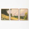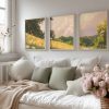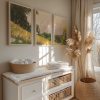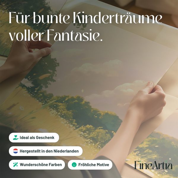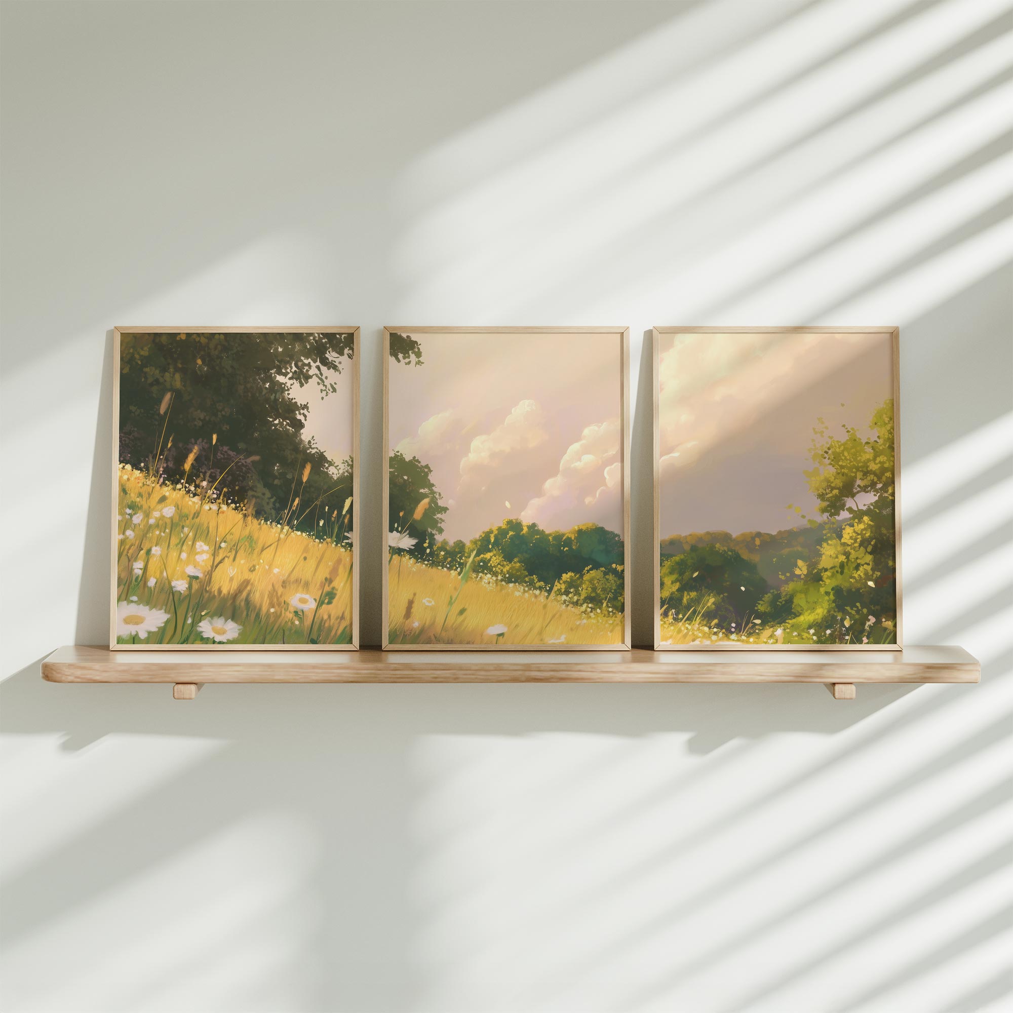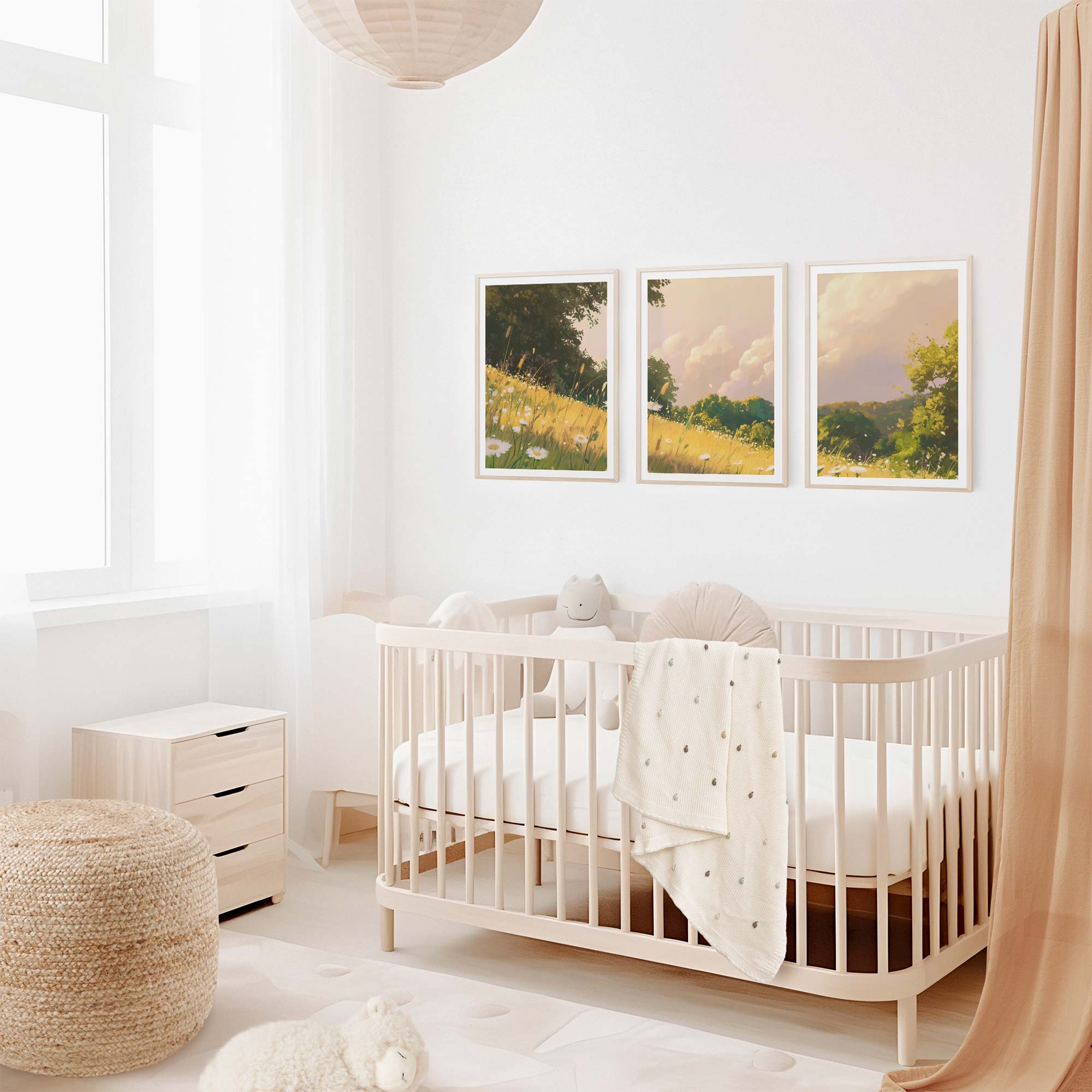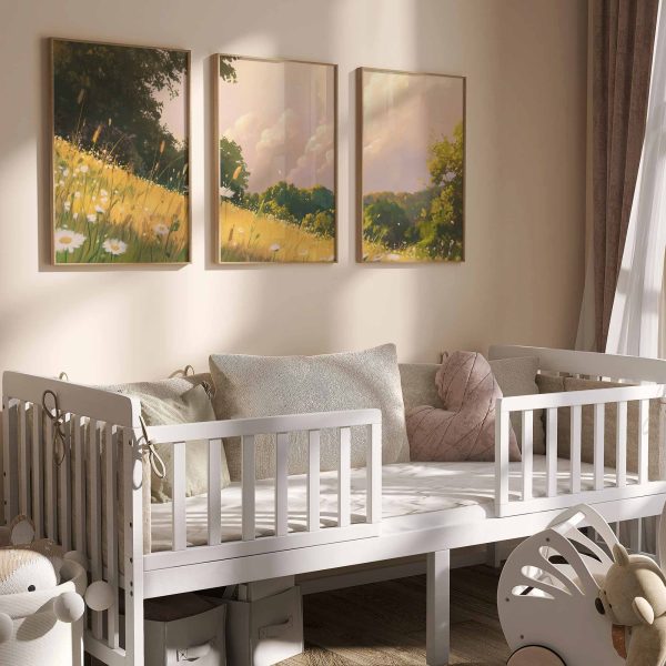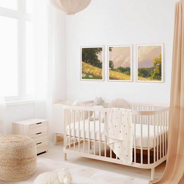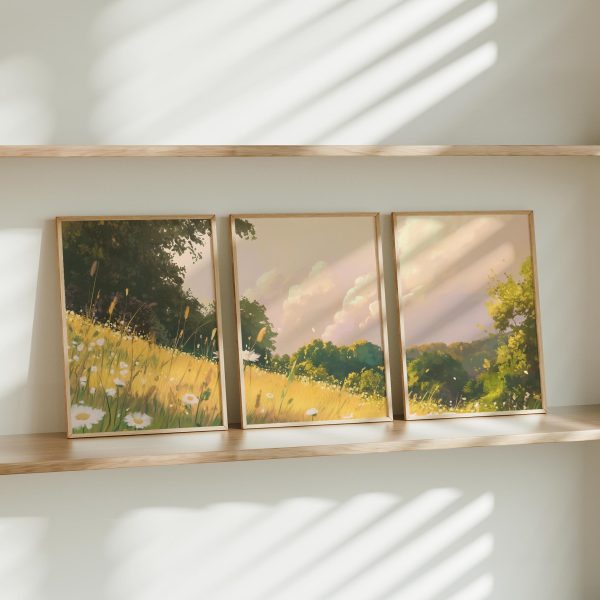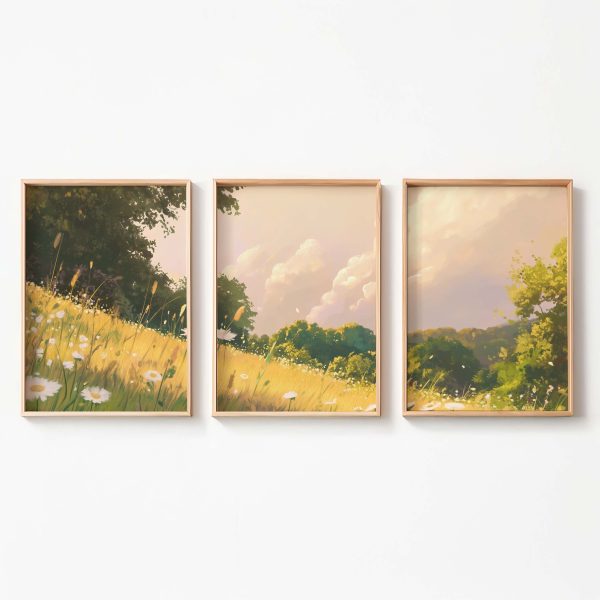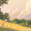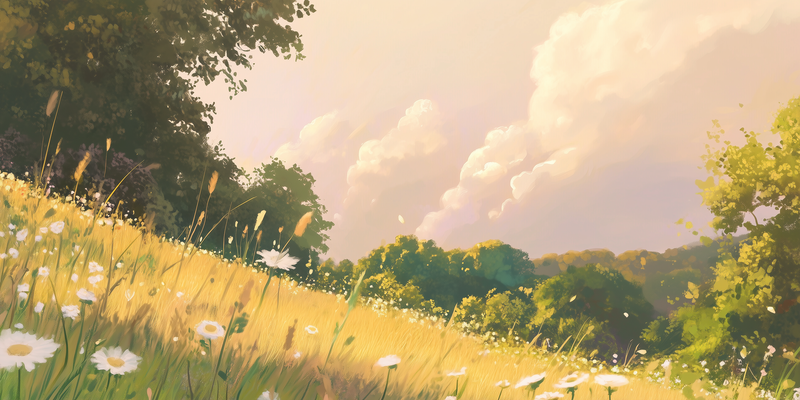 Zacht Groen Landschap met Witte Bloemen en Wolken