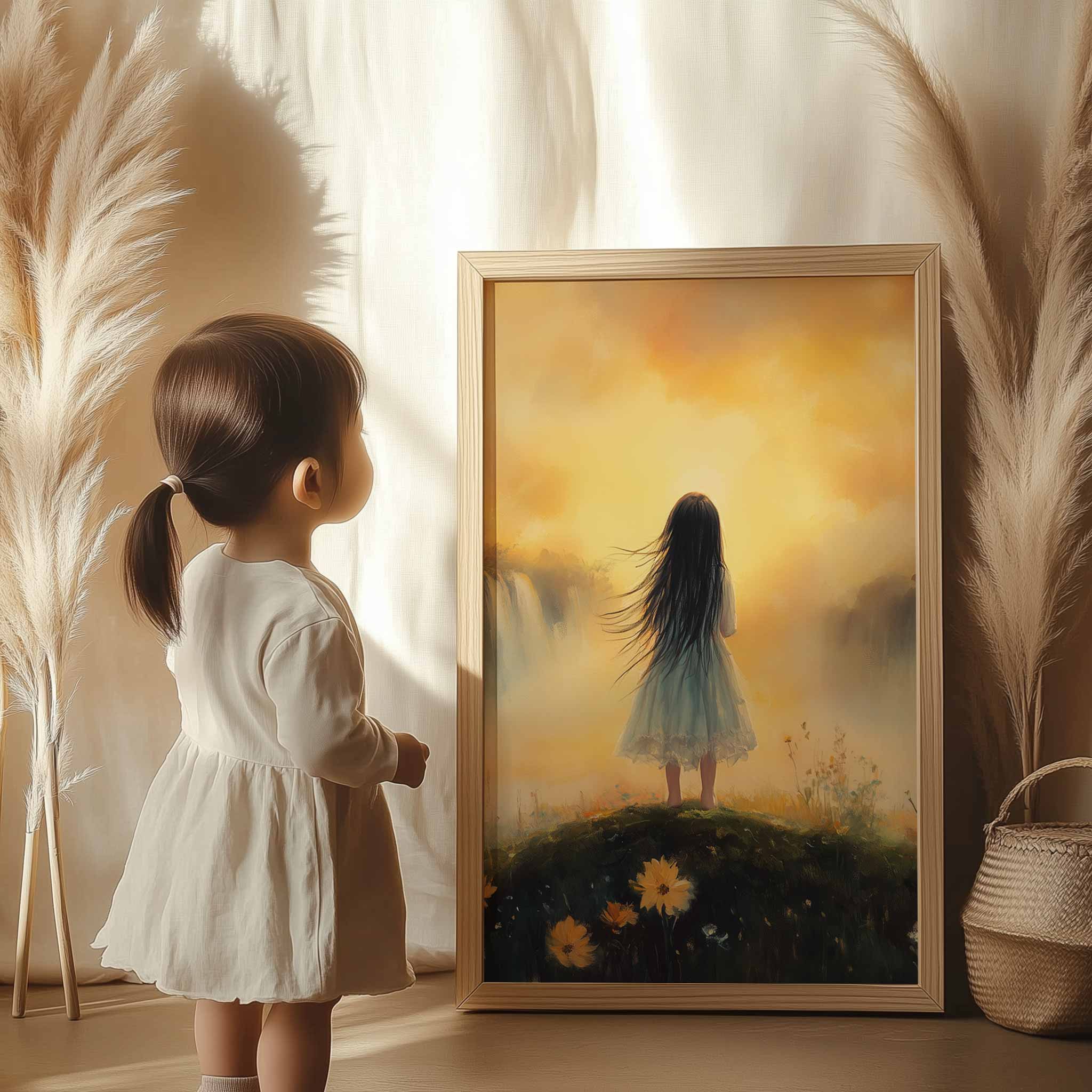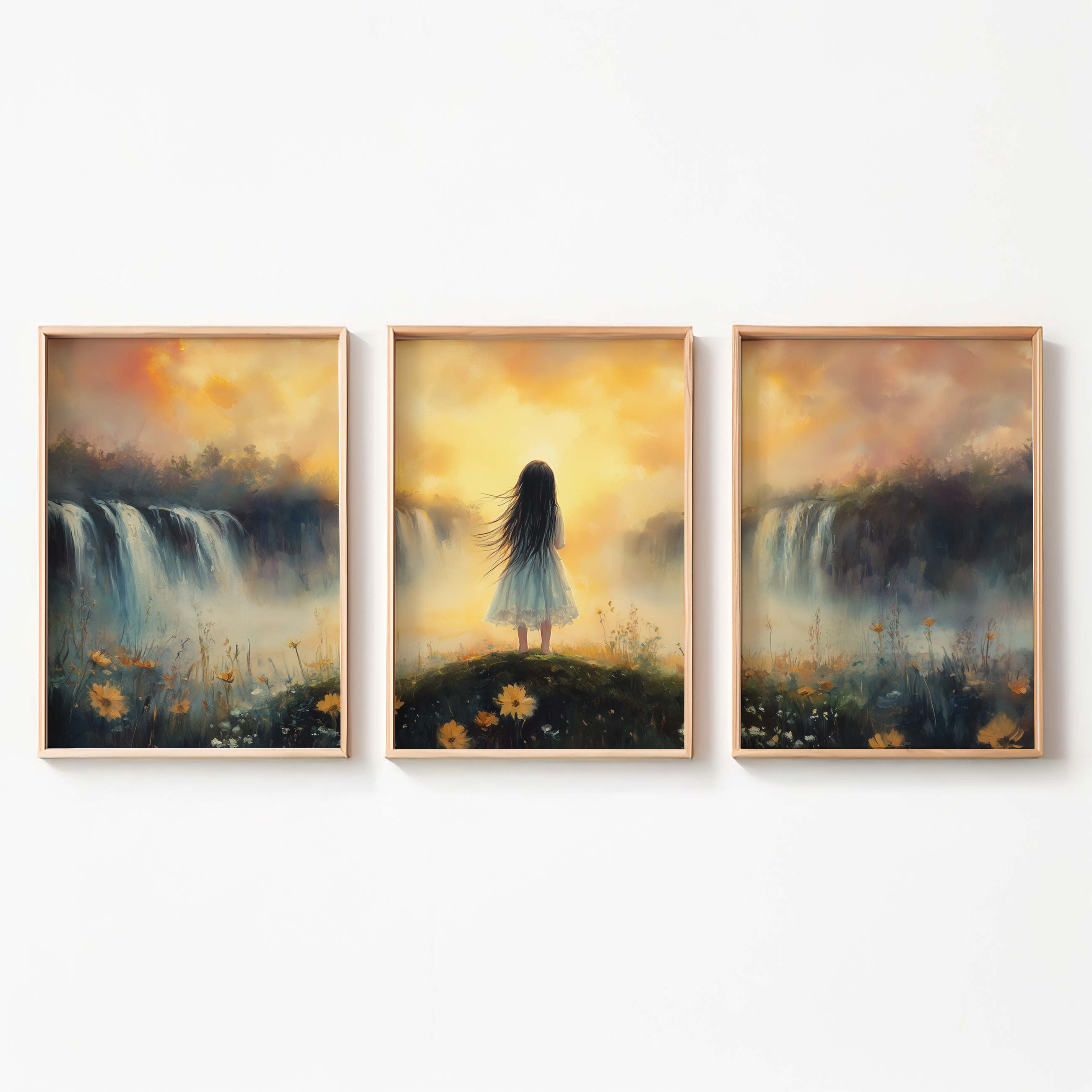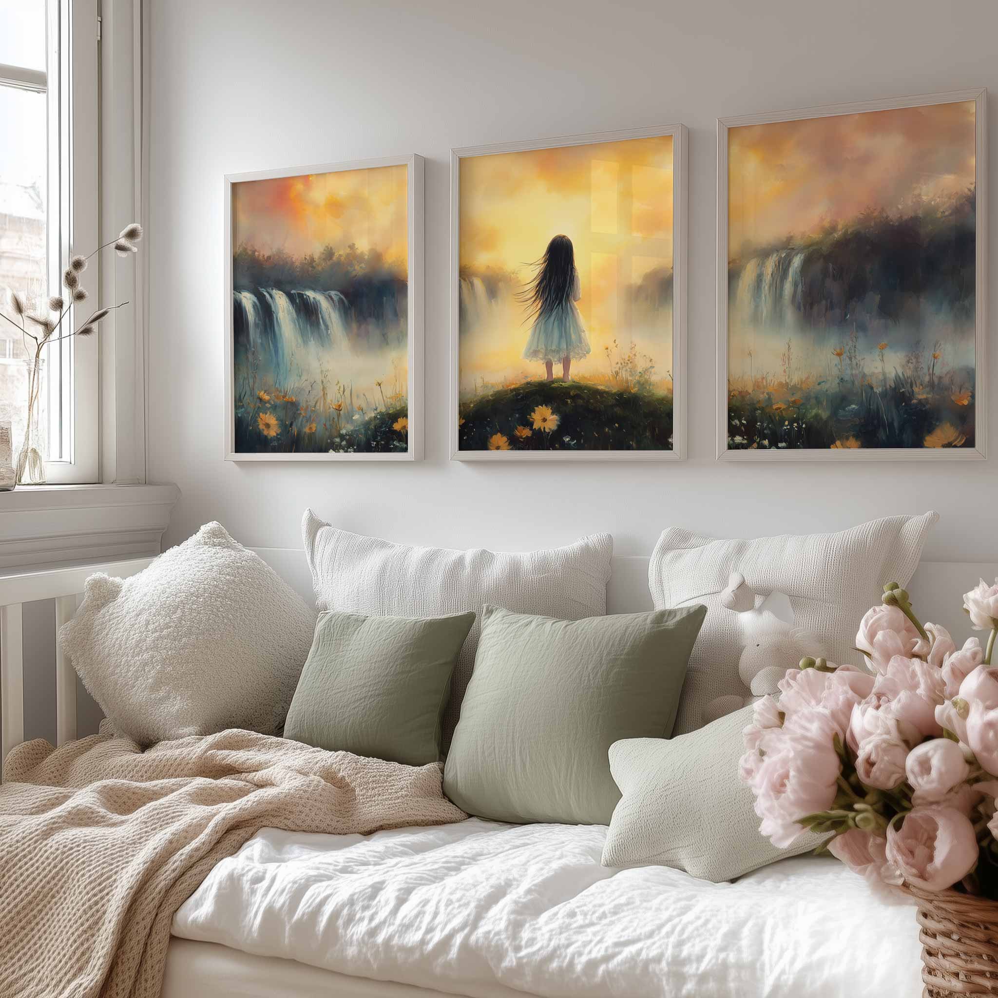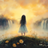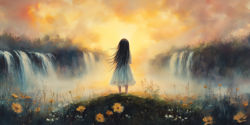 Zacht Pastel Meisje bij Waterval – Dromerig Landschap
