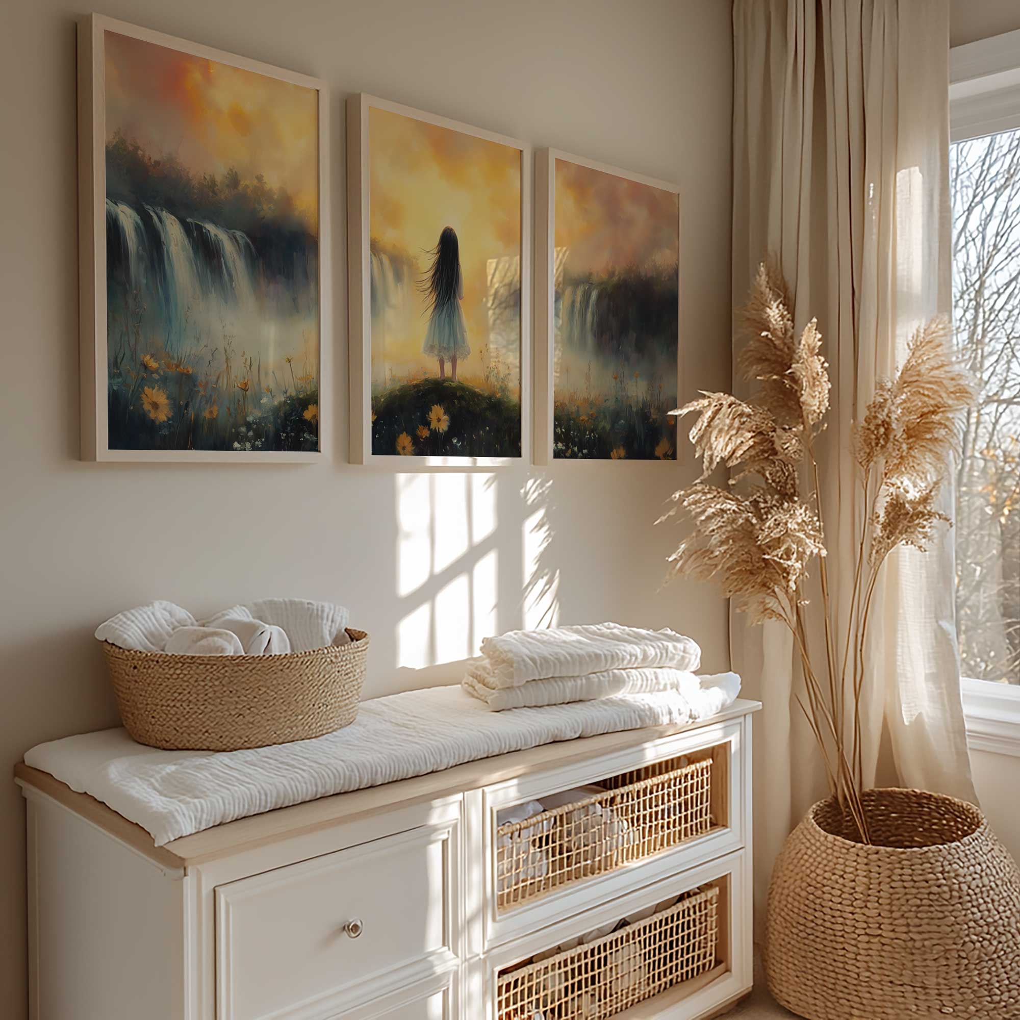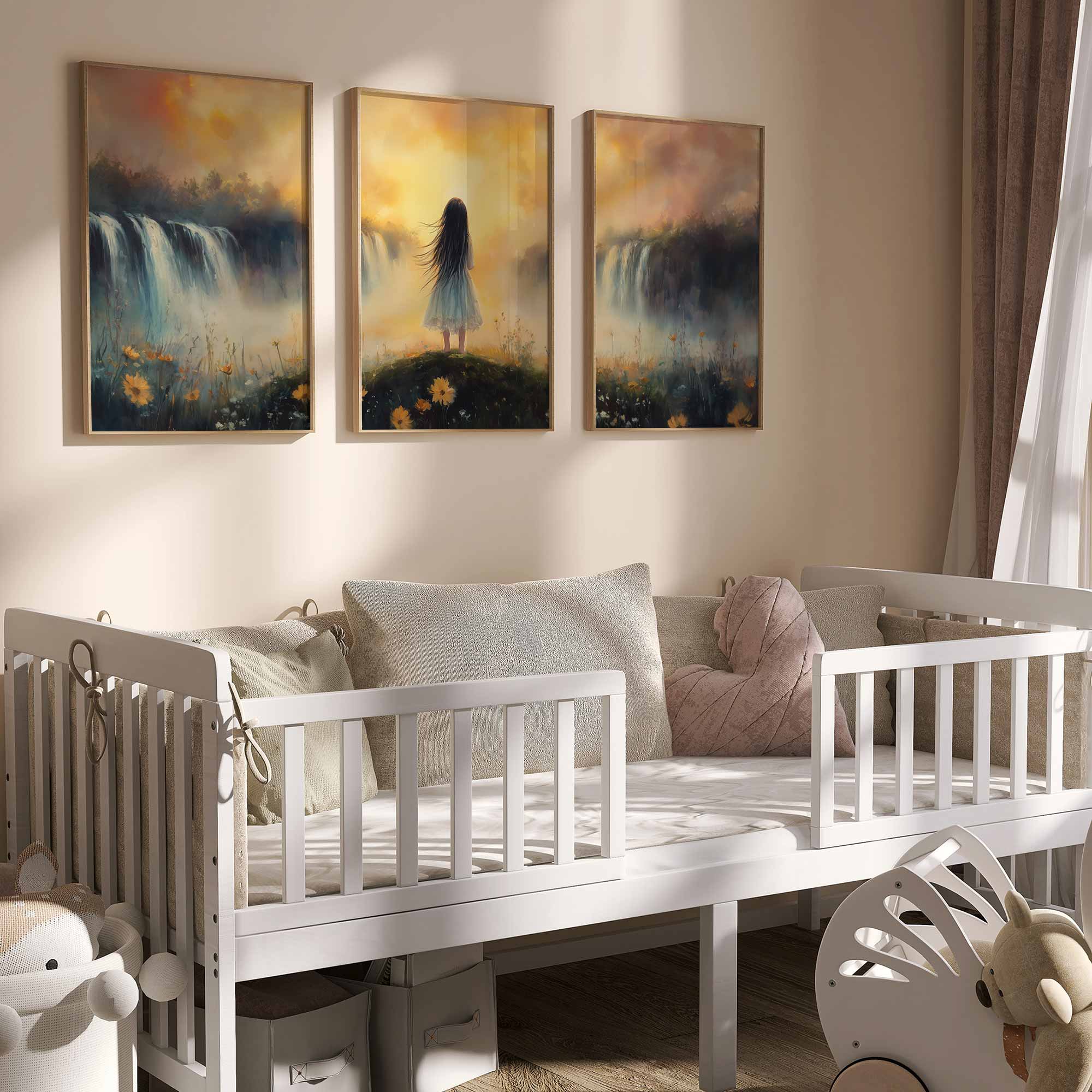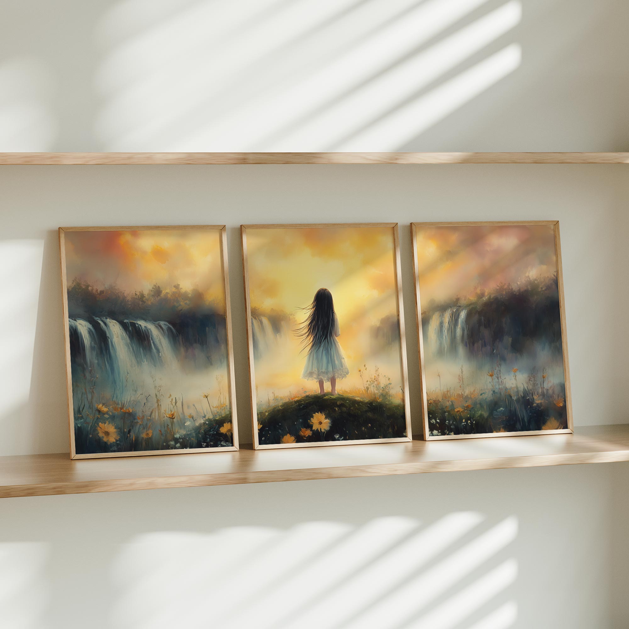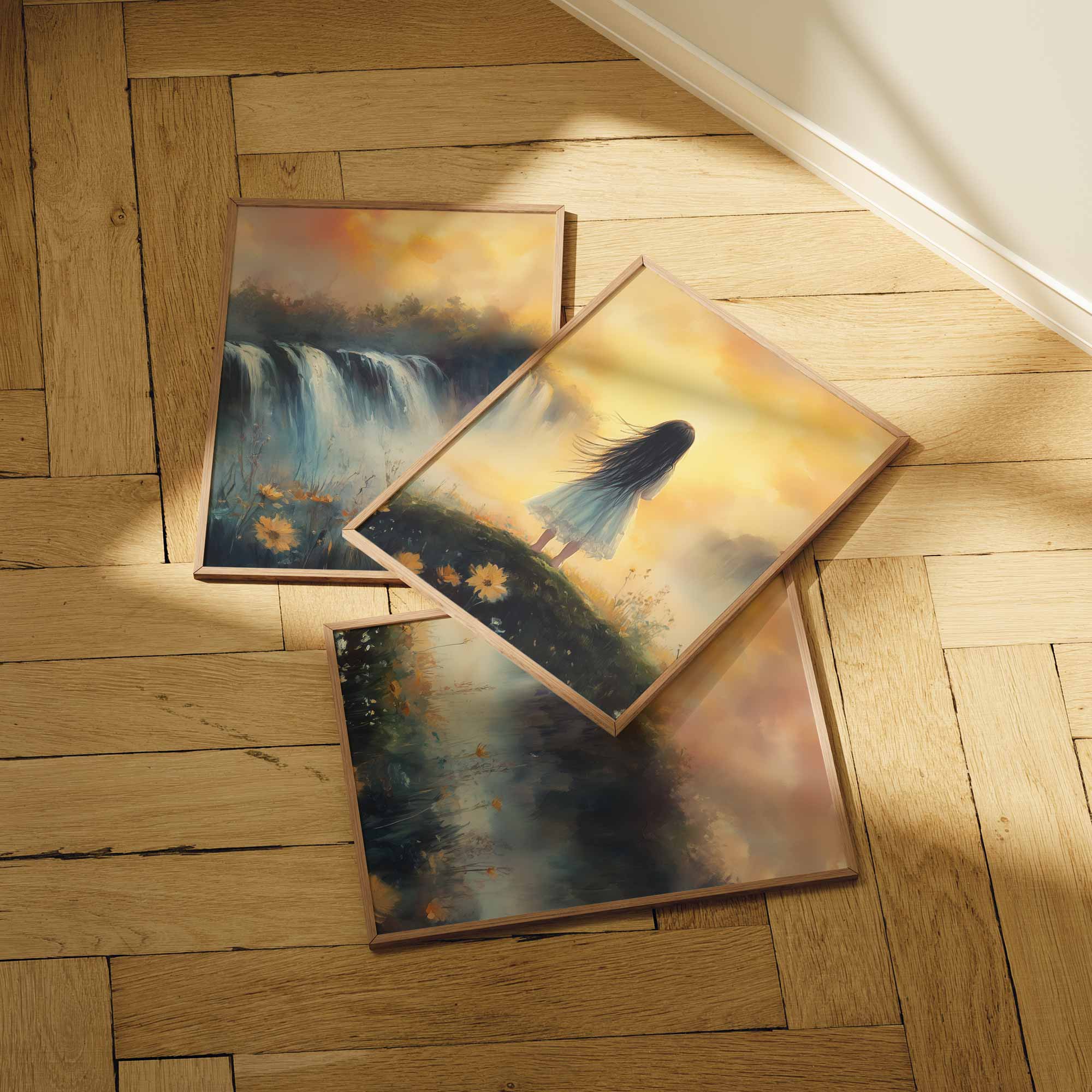 Zacht Pastel Meisje bij Waterval – Dromerig Landschap