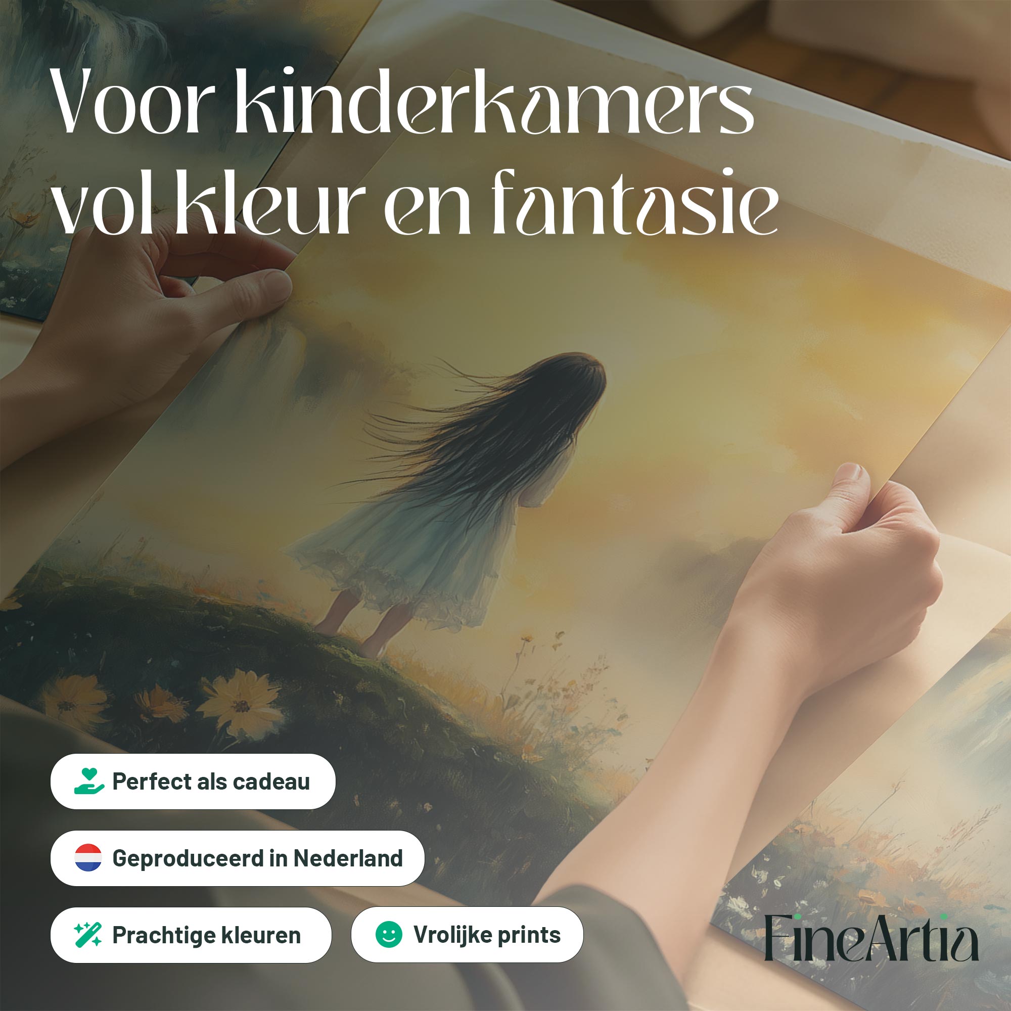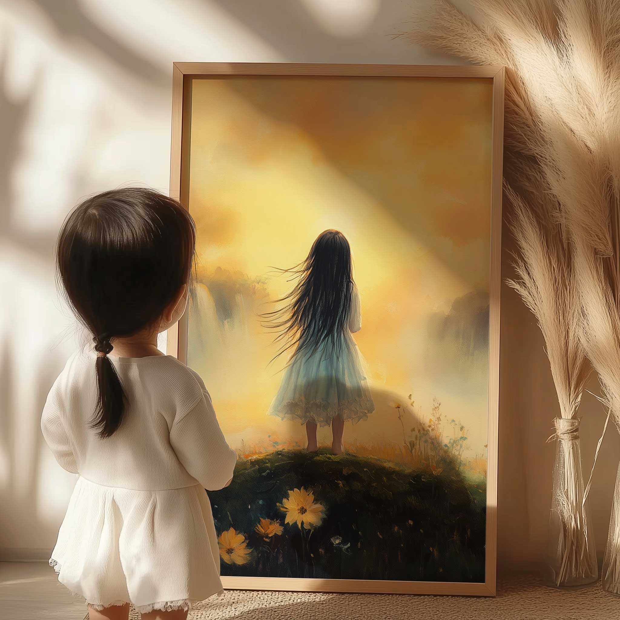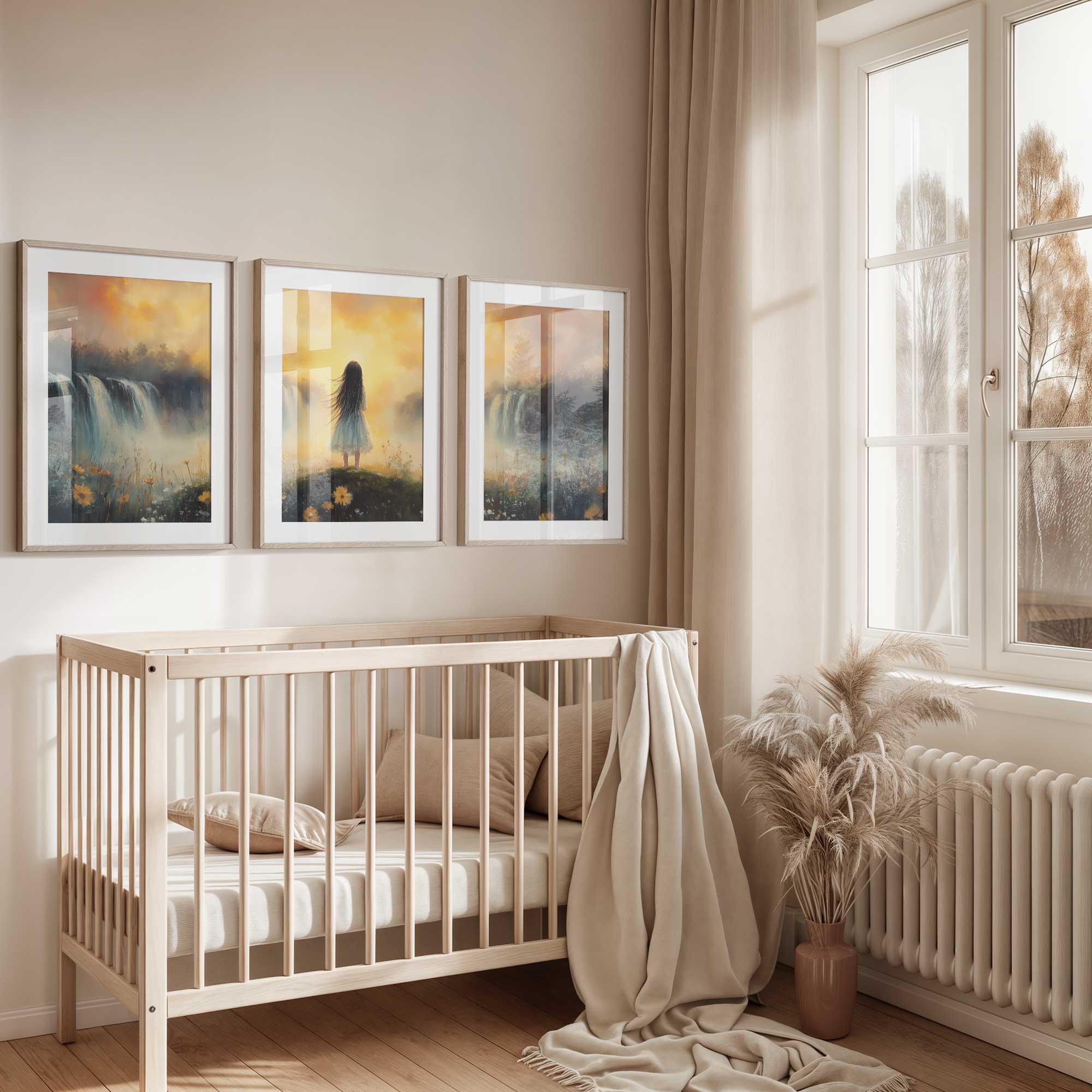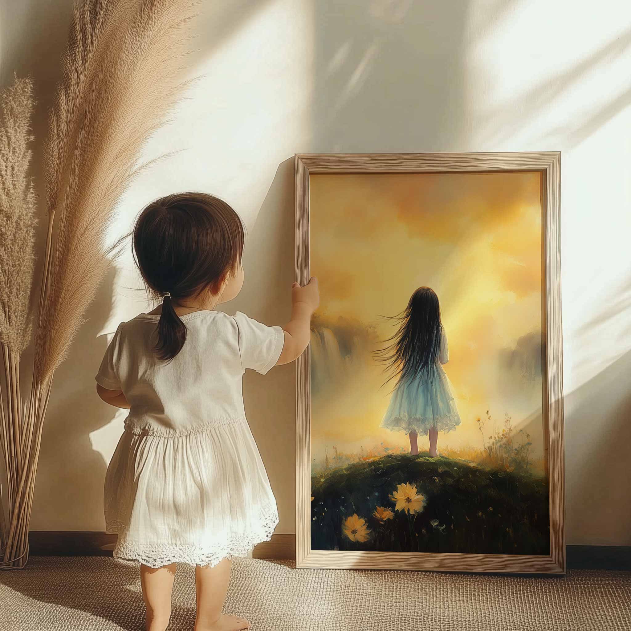 Zacht Pastel Meisje bij Waterval – Dromerig Landschap