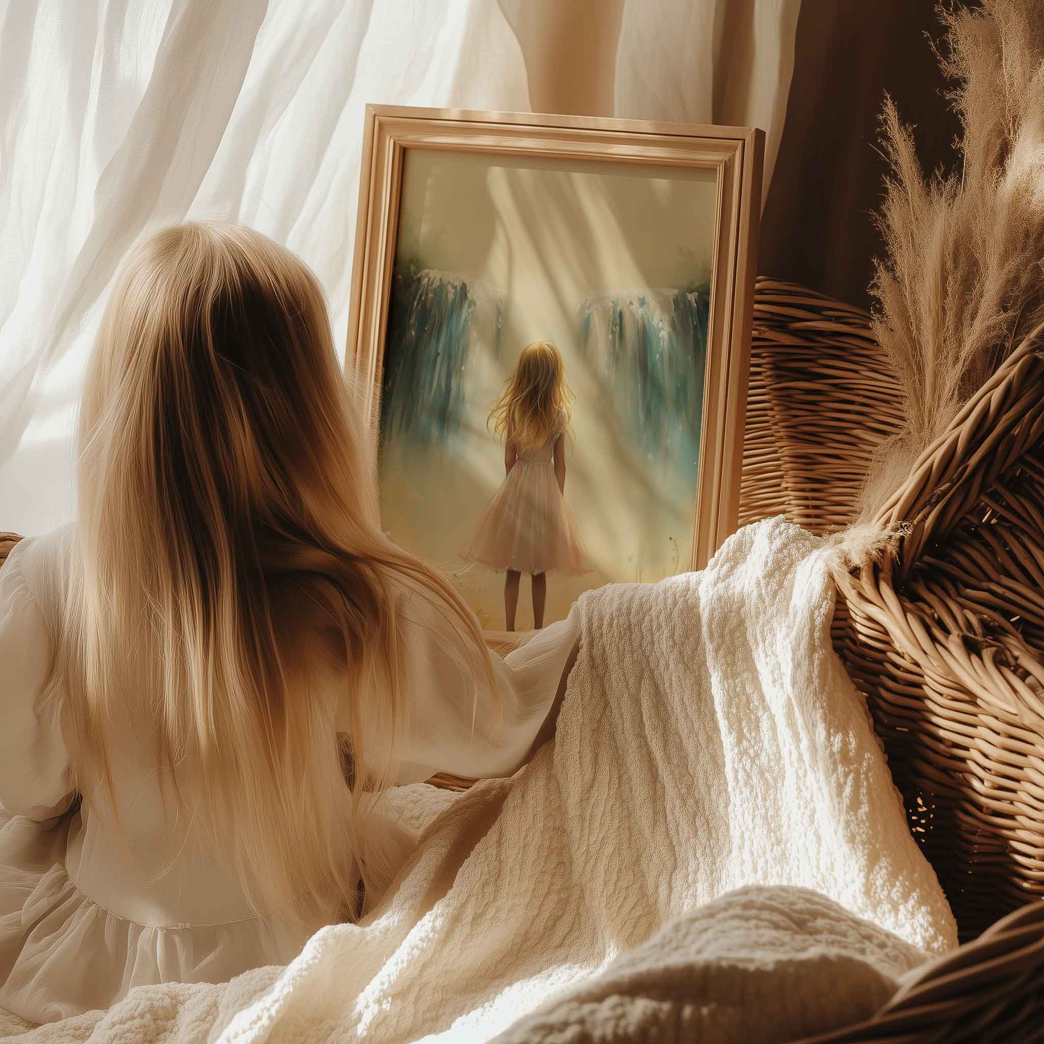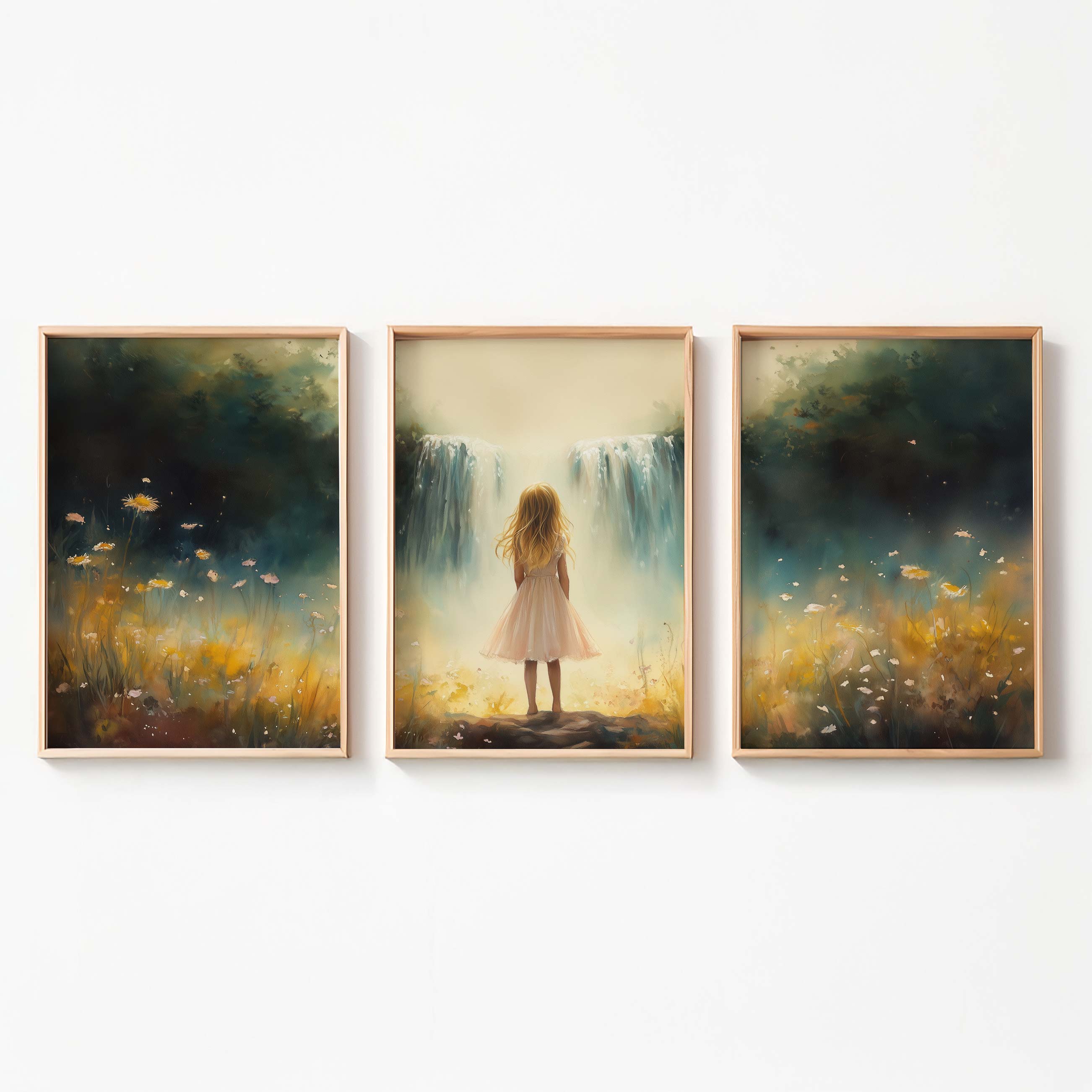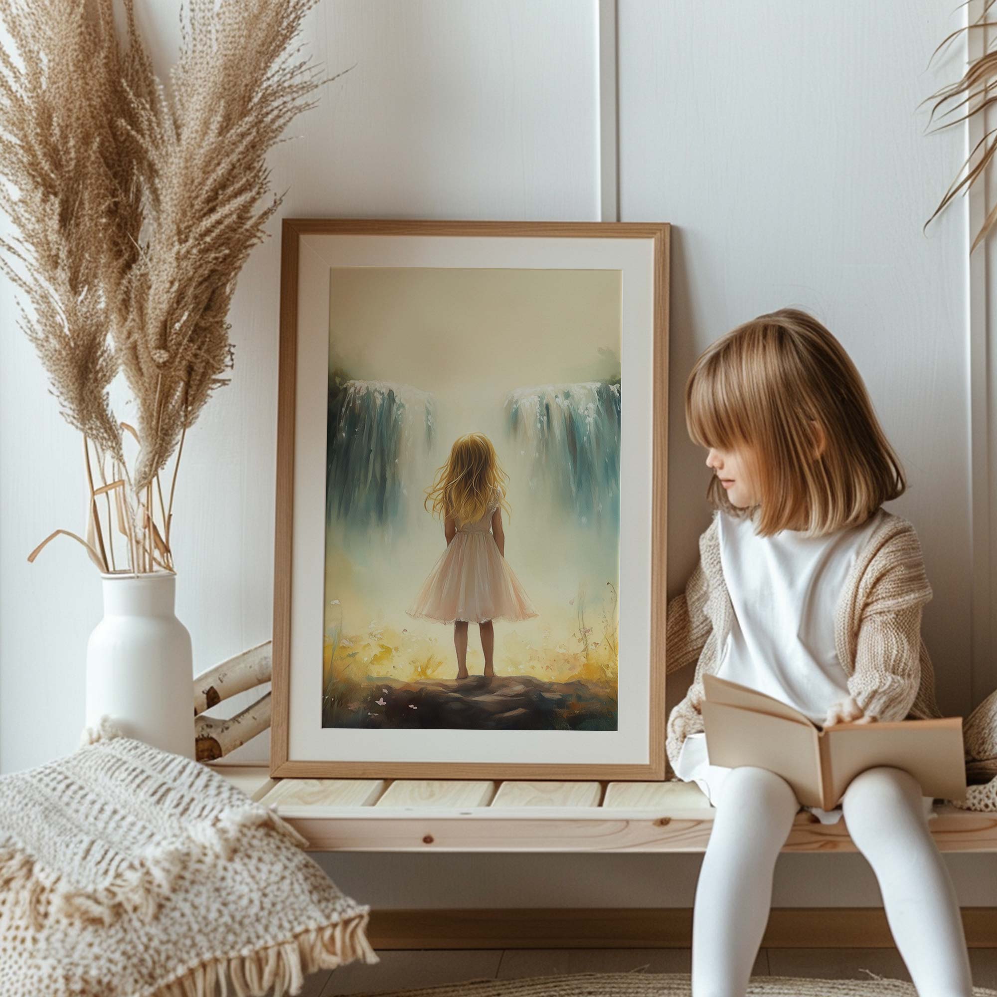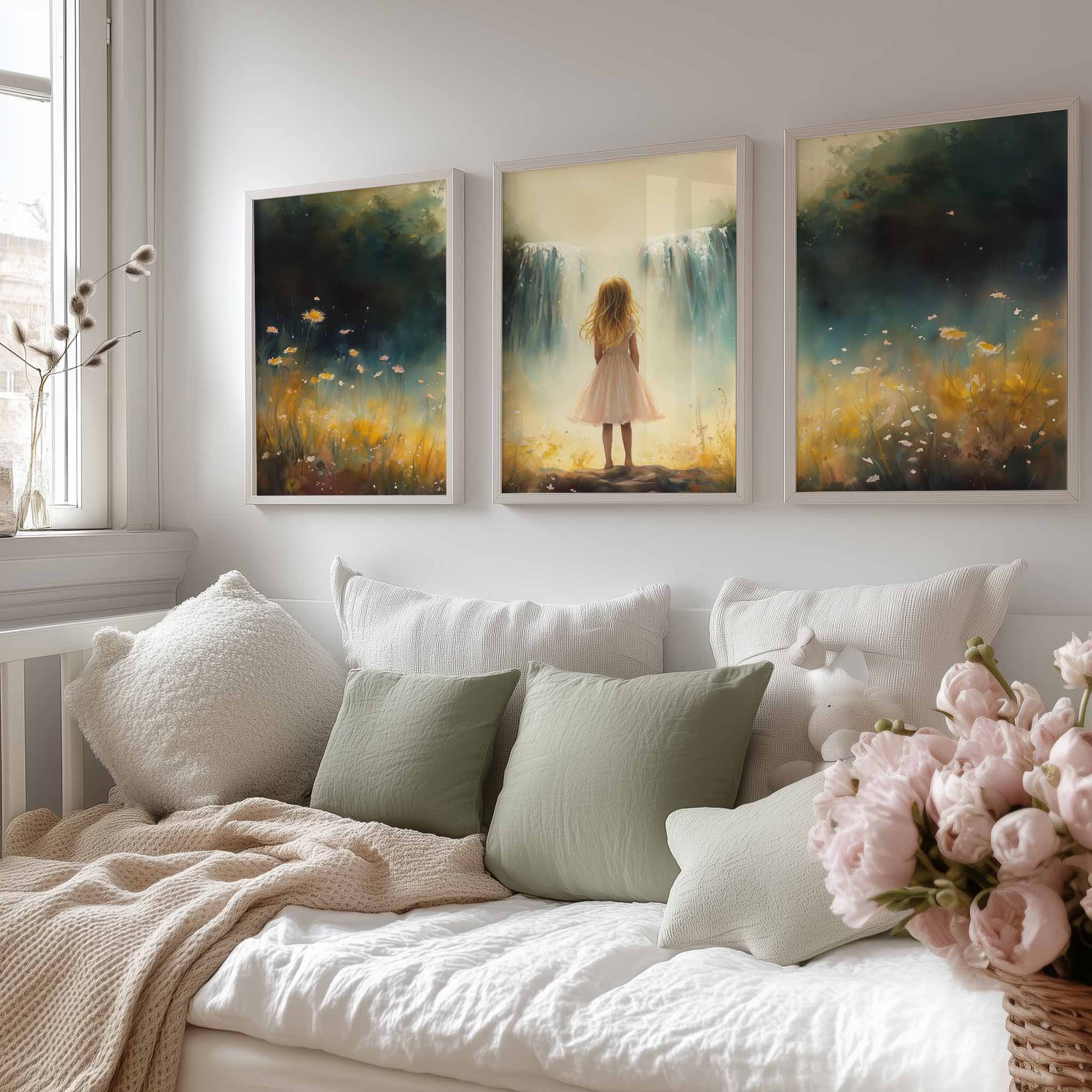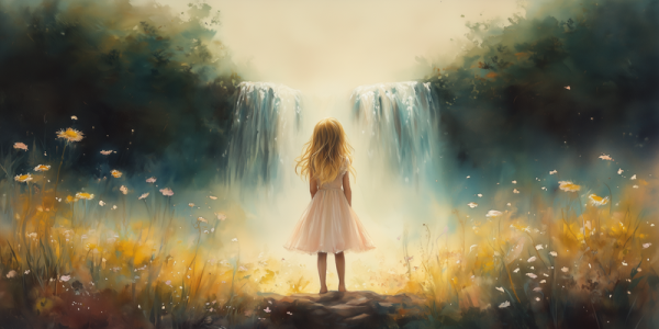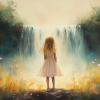 Zacht Pastel Meisje bij Waterval en Bloemen
