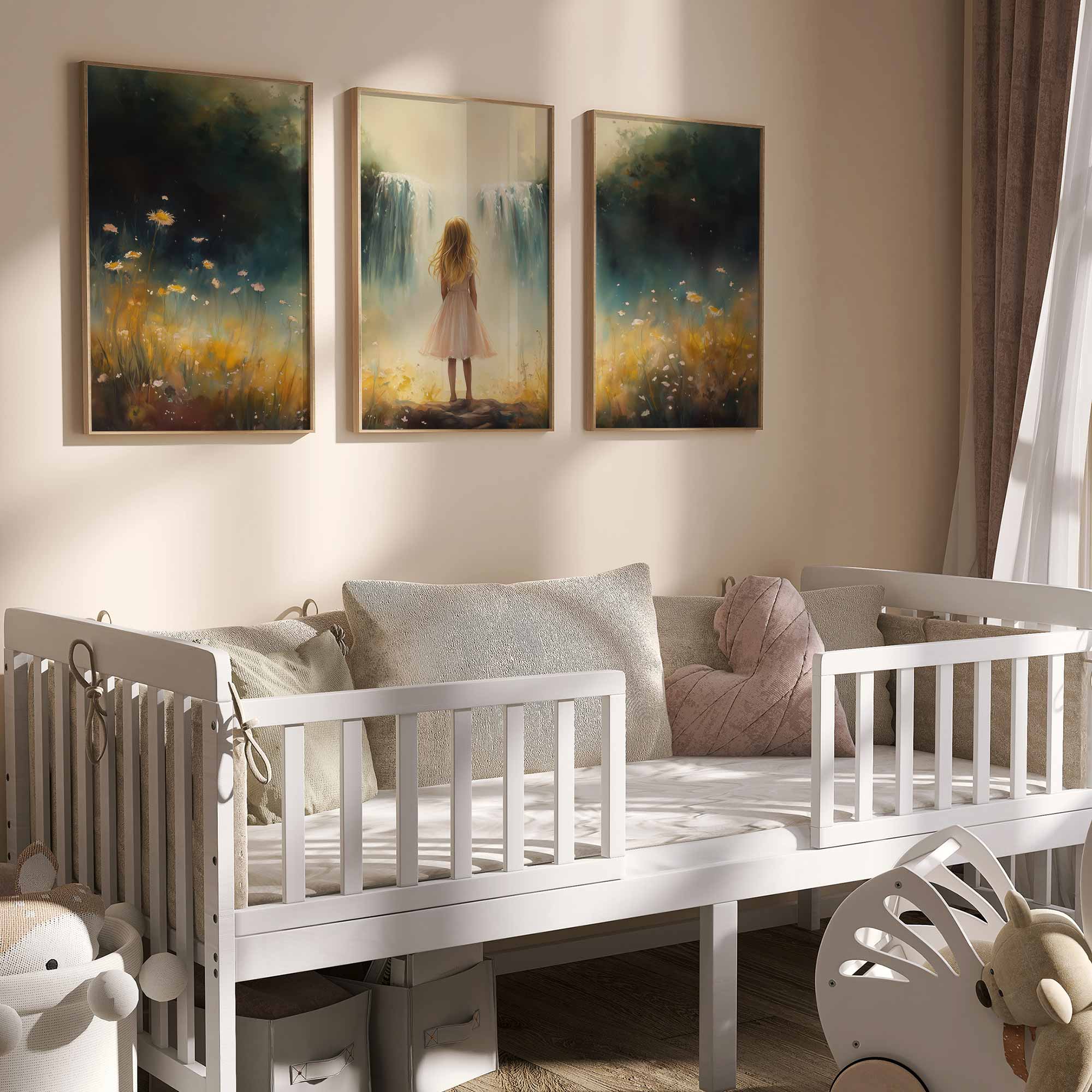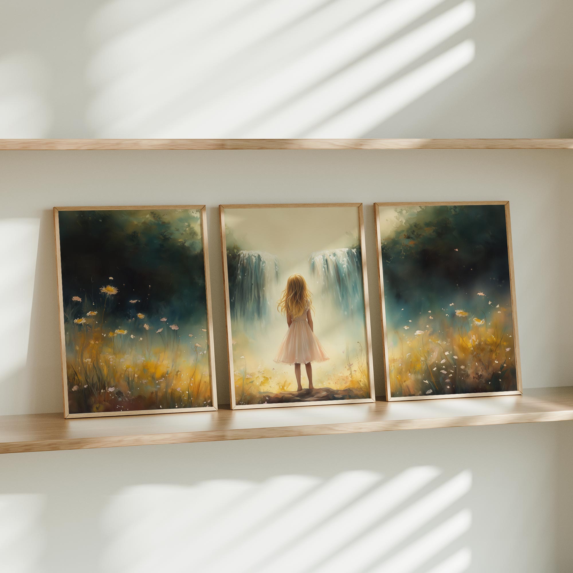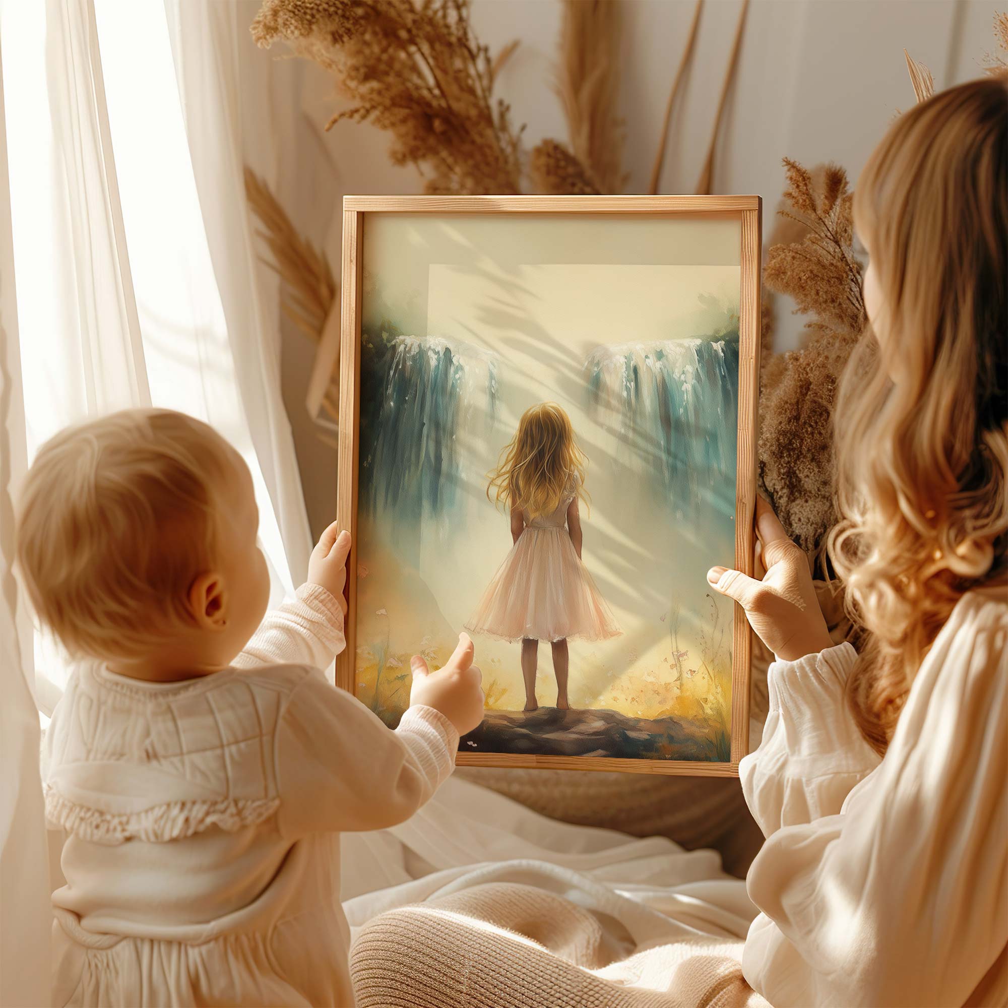 Zacht Pastel Meisje bij Waterval en Bloemen