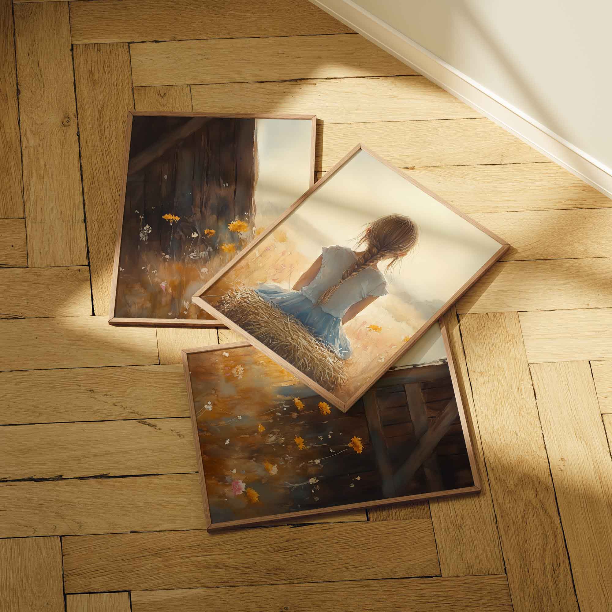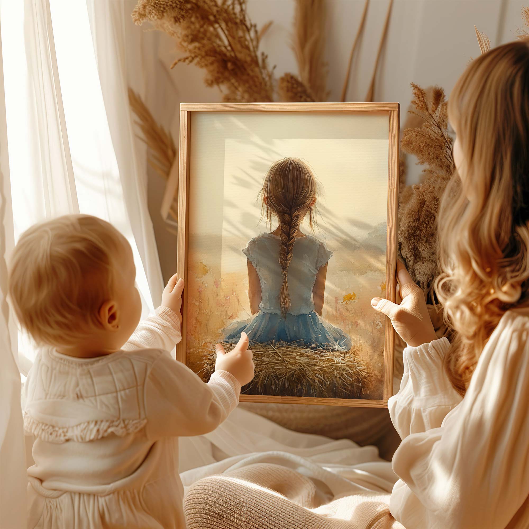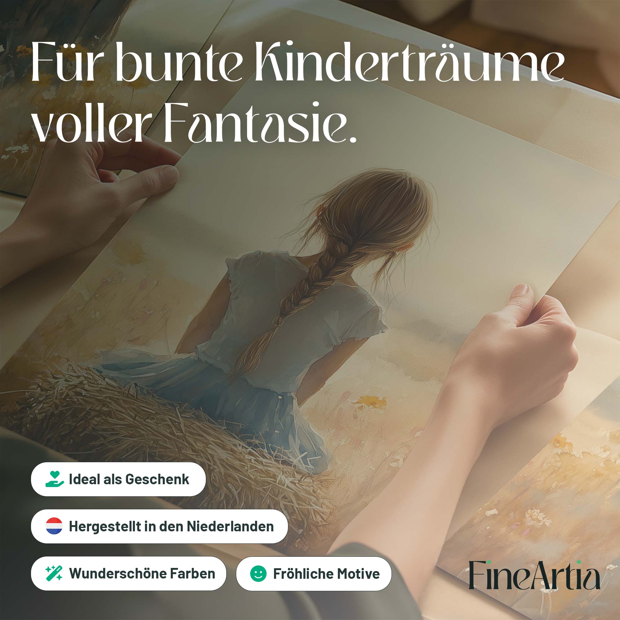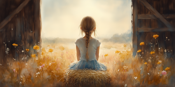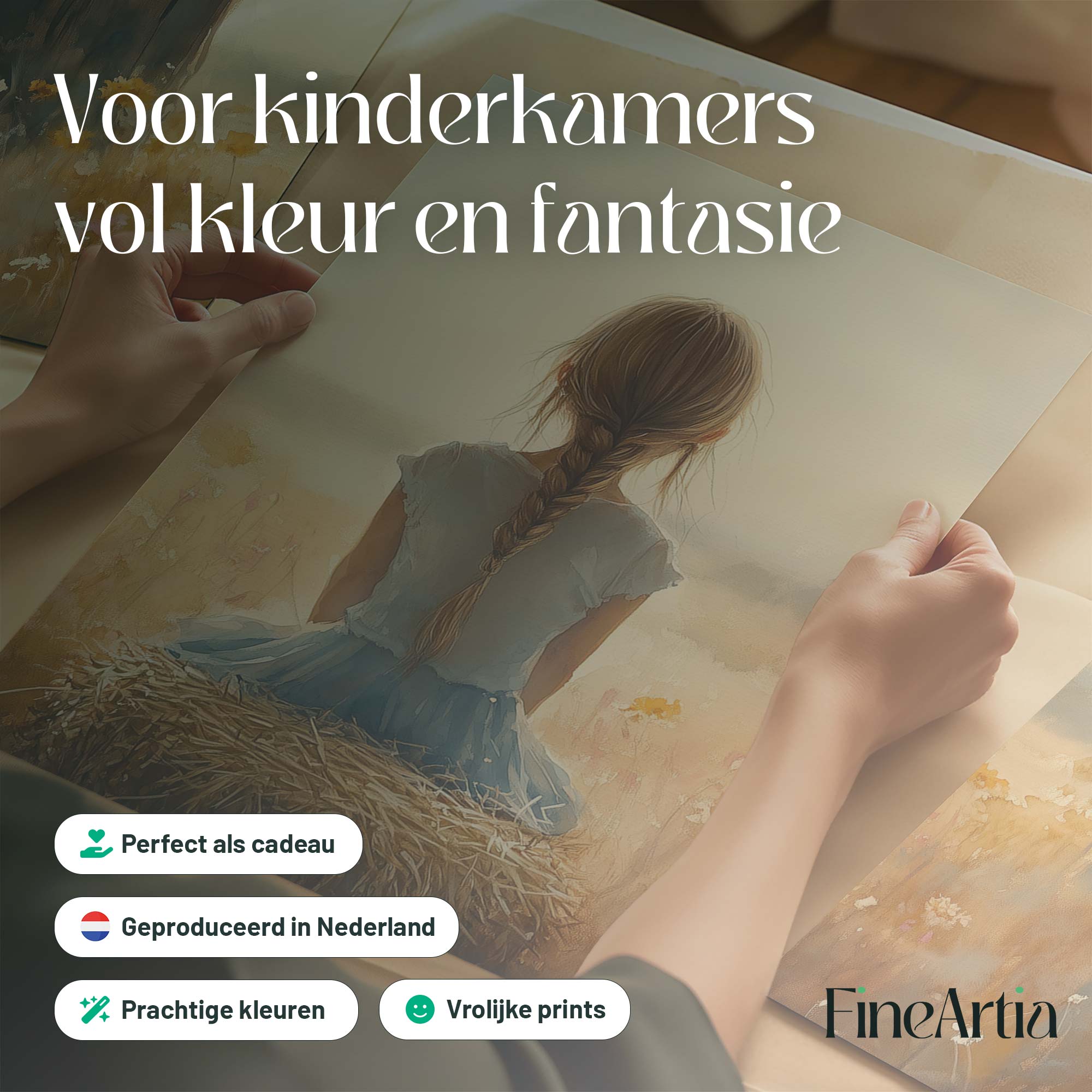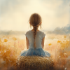 Zacht Pastel Meisje in Blauw tussen Bloemenveld