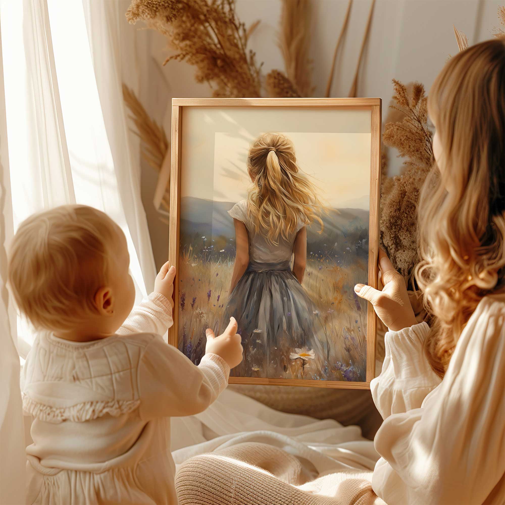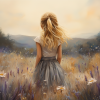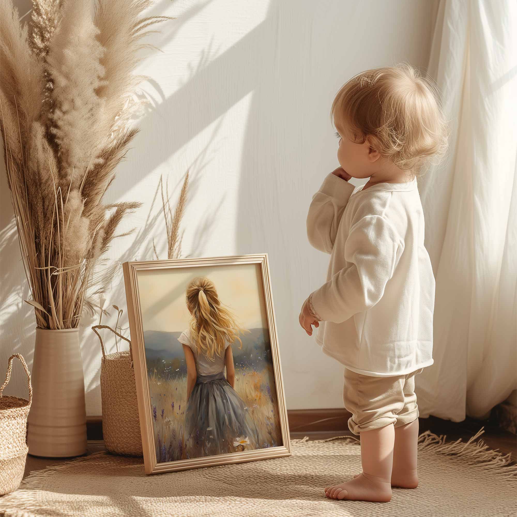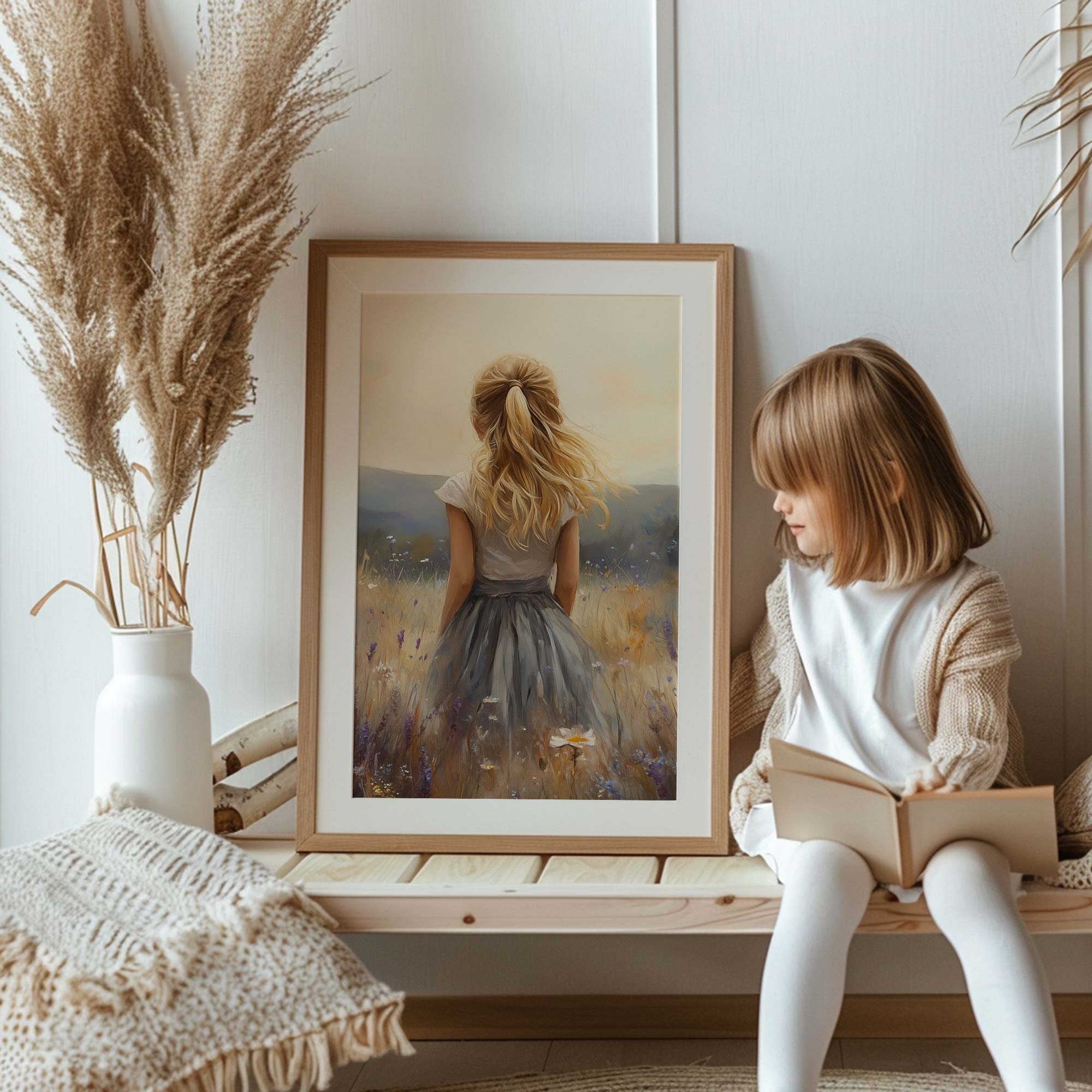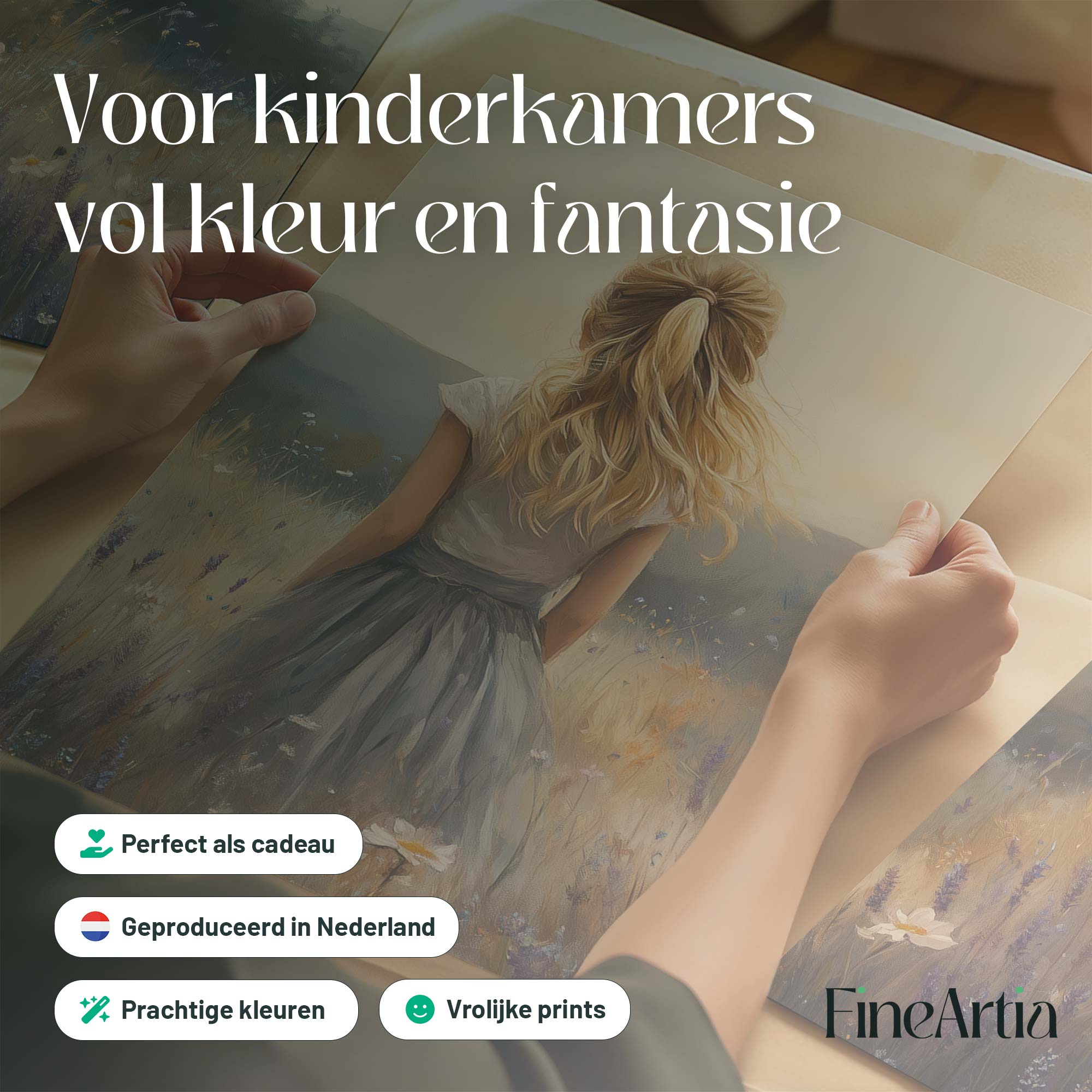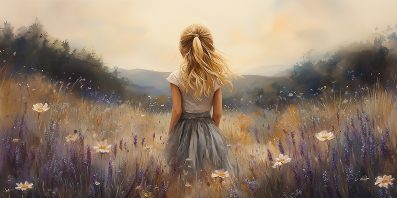 Zacht Pastel Meisje in Bloemenveld – Dromerig Landschap