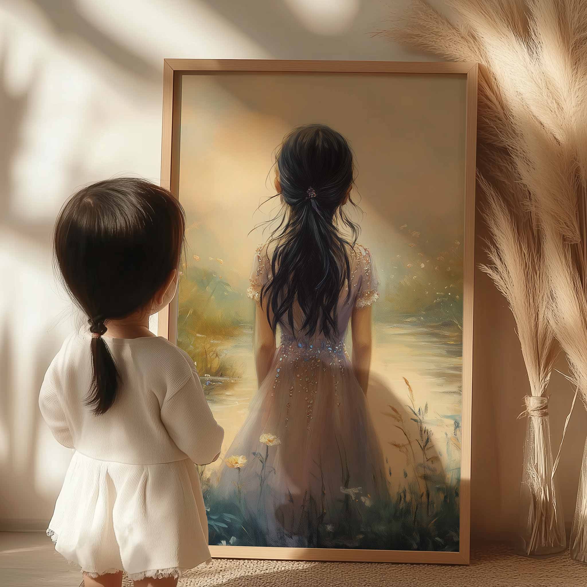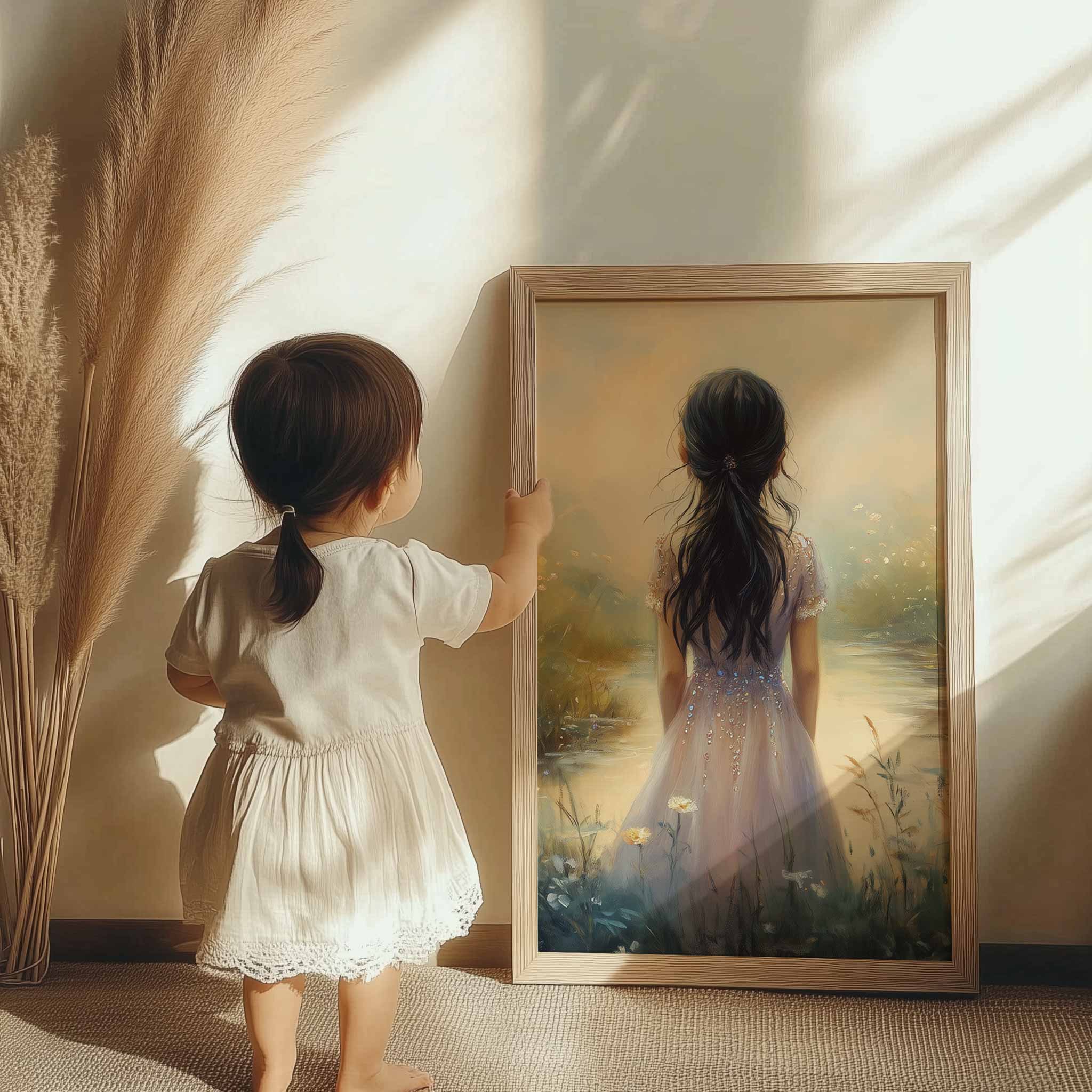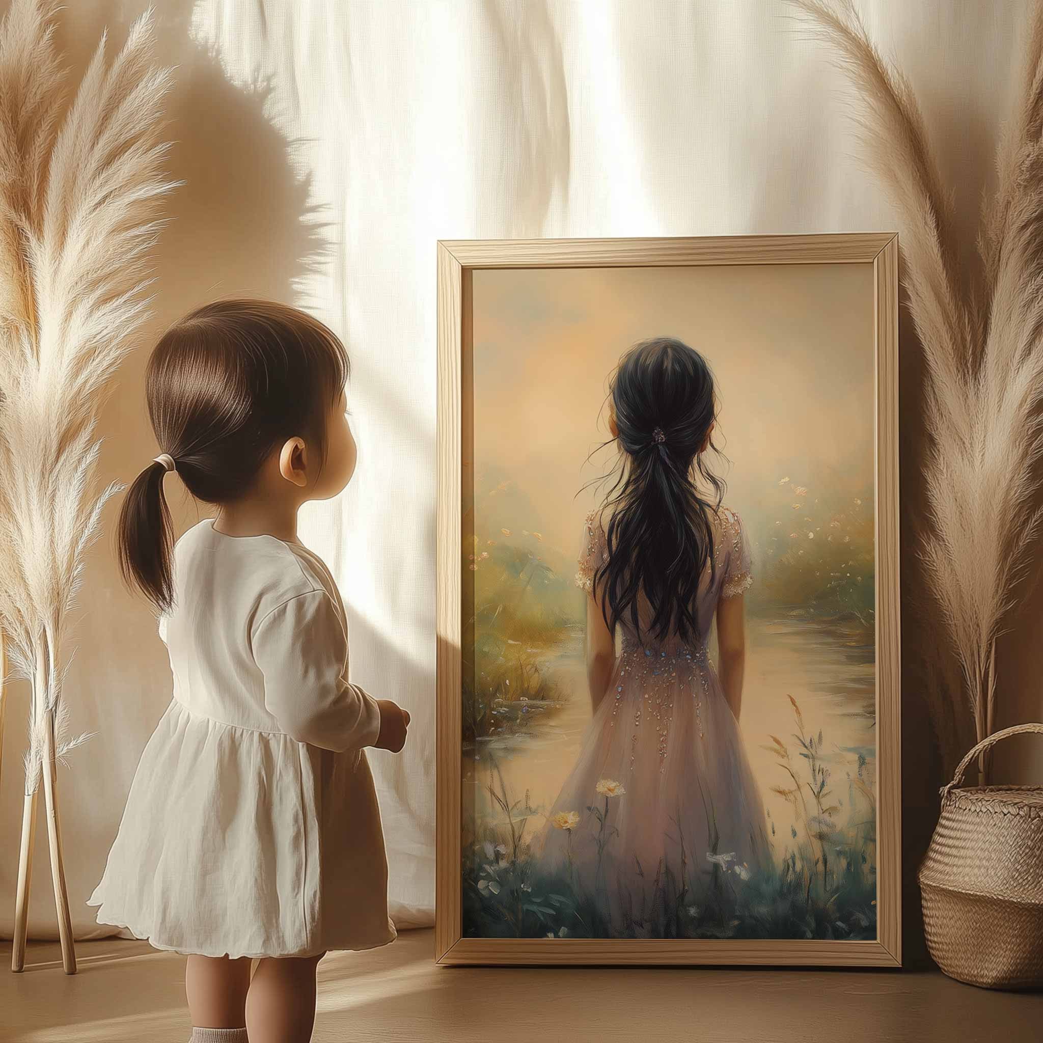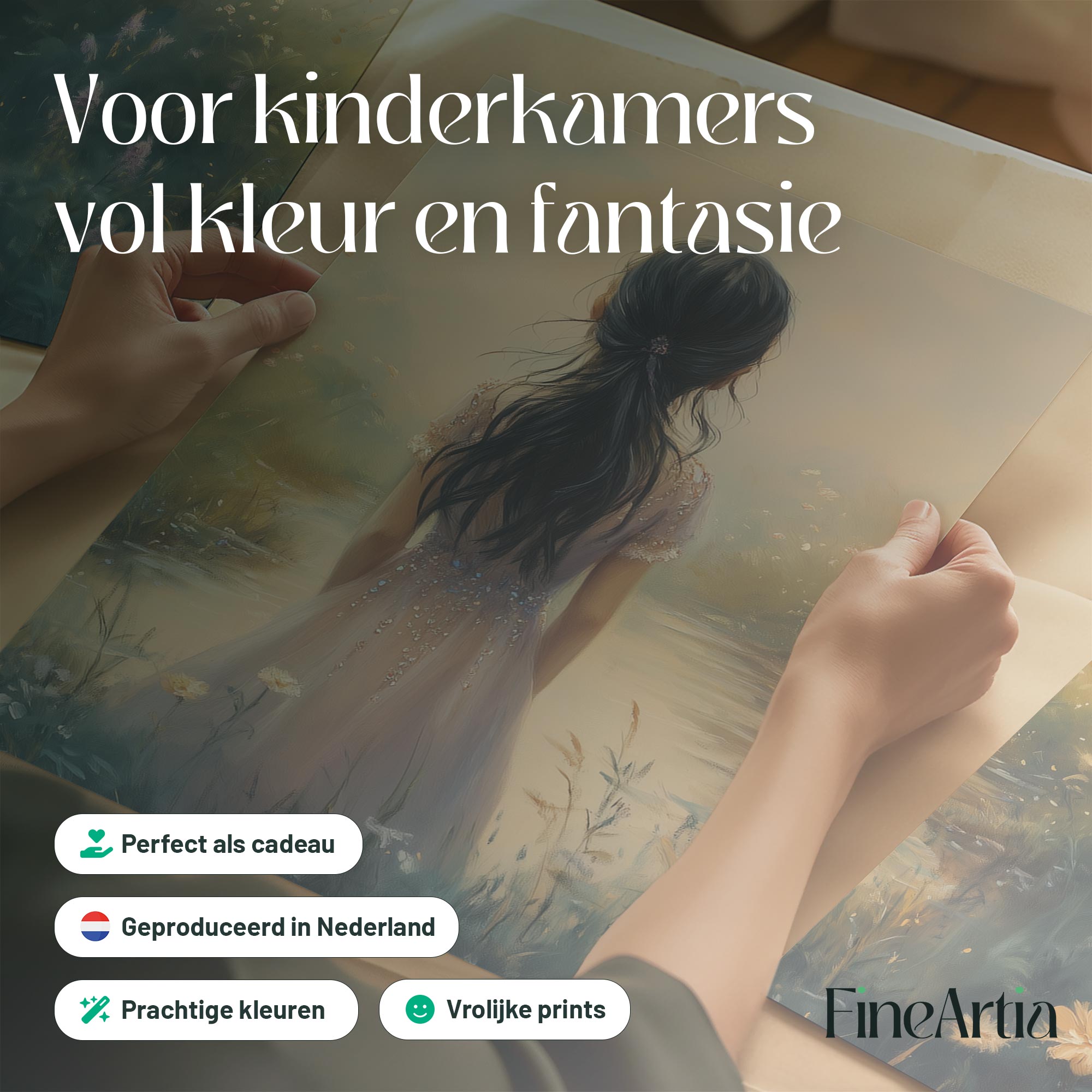 Terug naar collectie Posters Zacht Pastel Meisje in Bloemenveld – Dromerige Sfeer