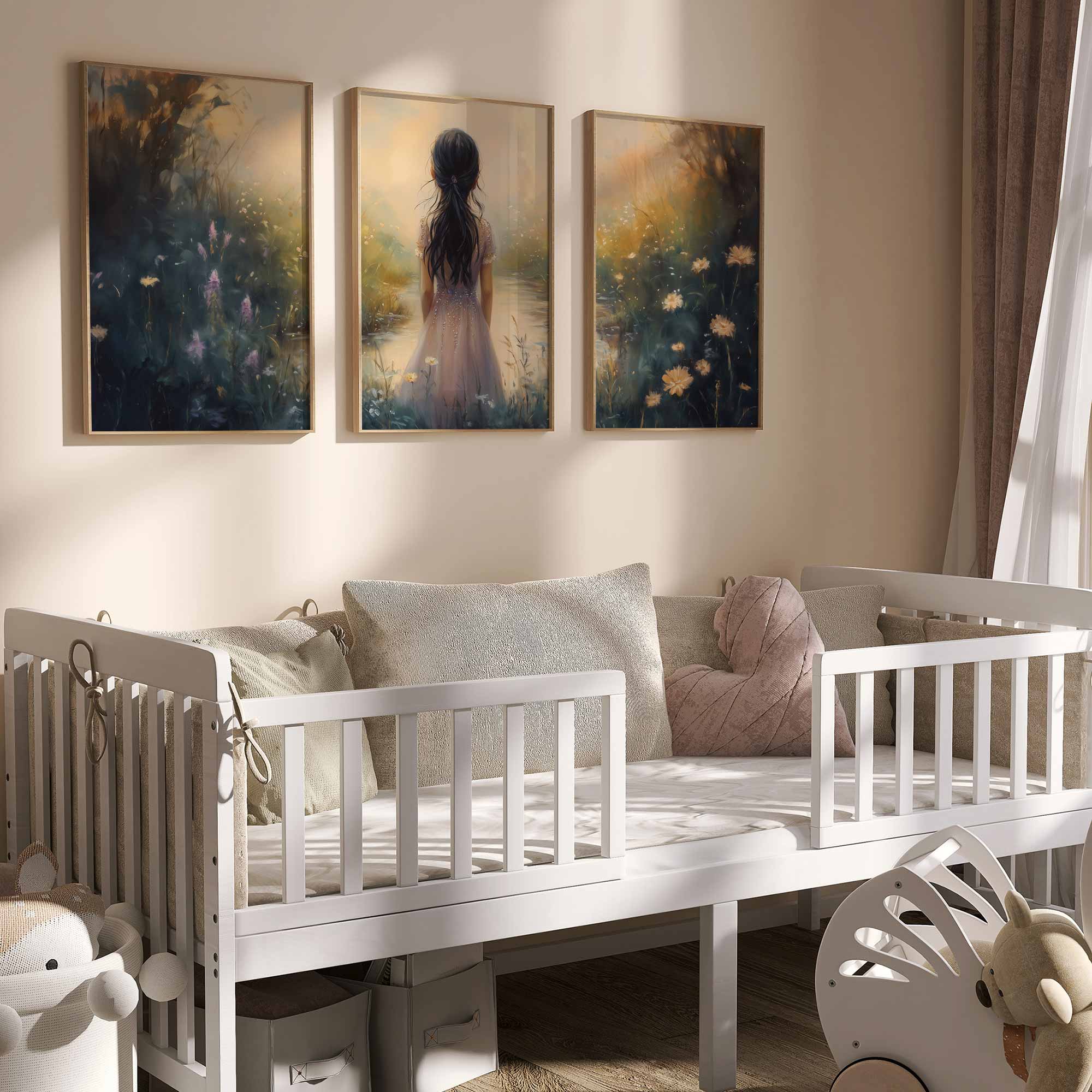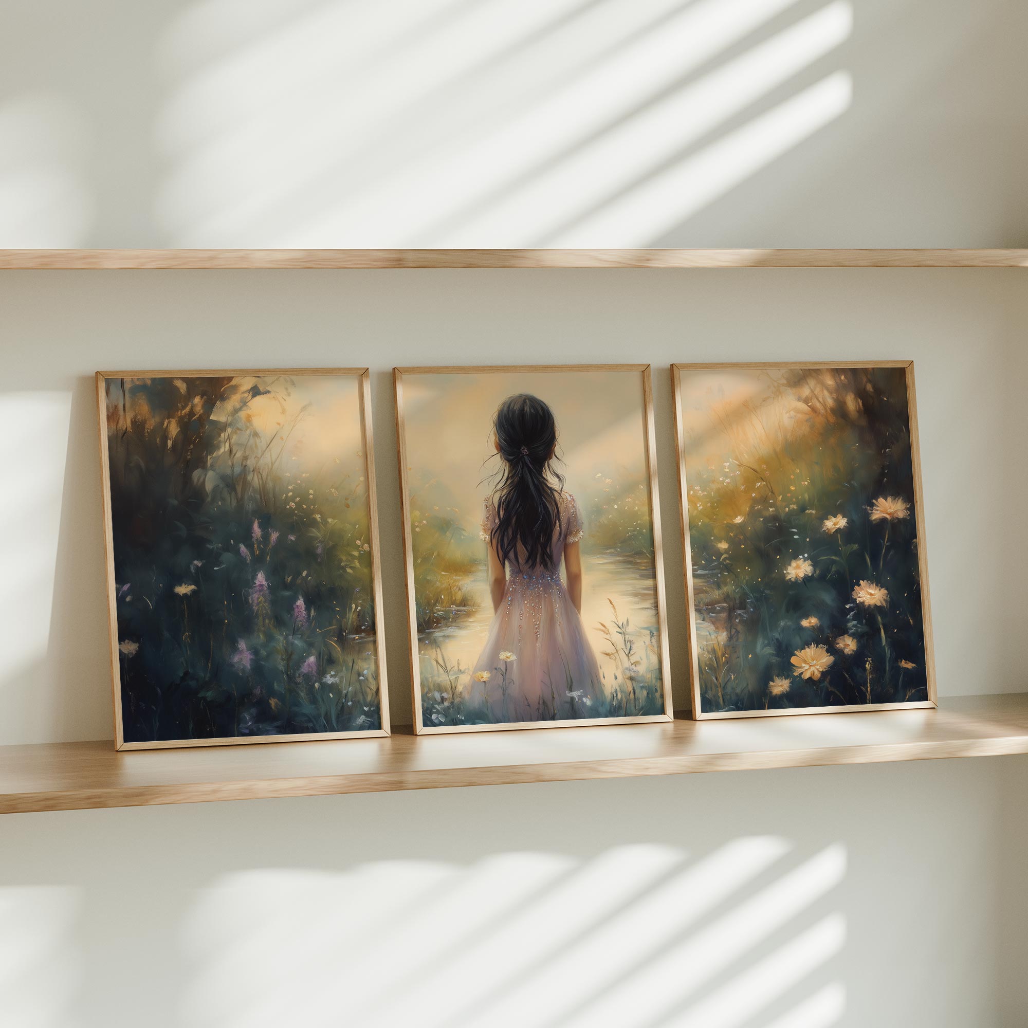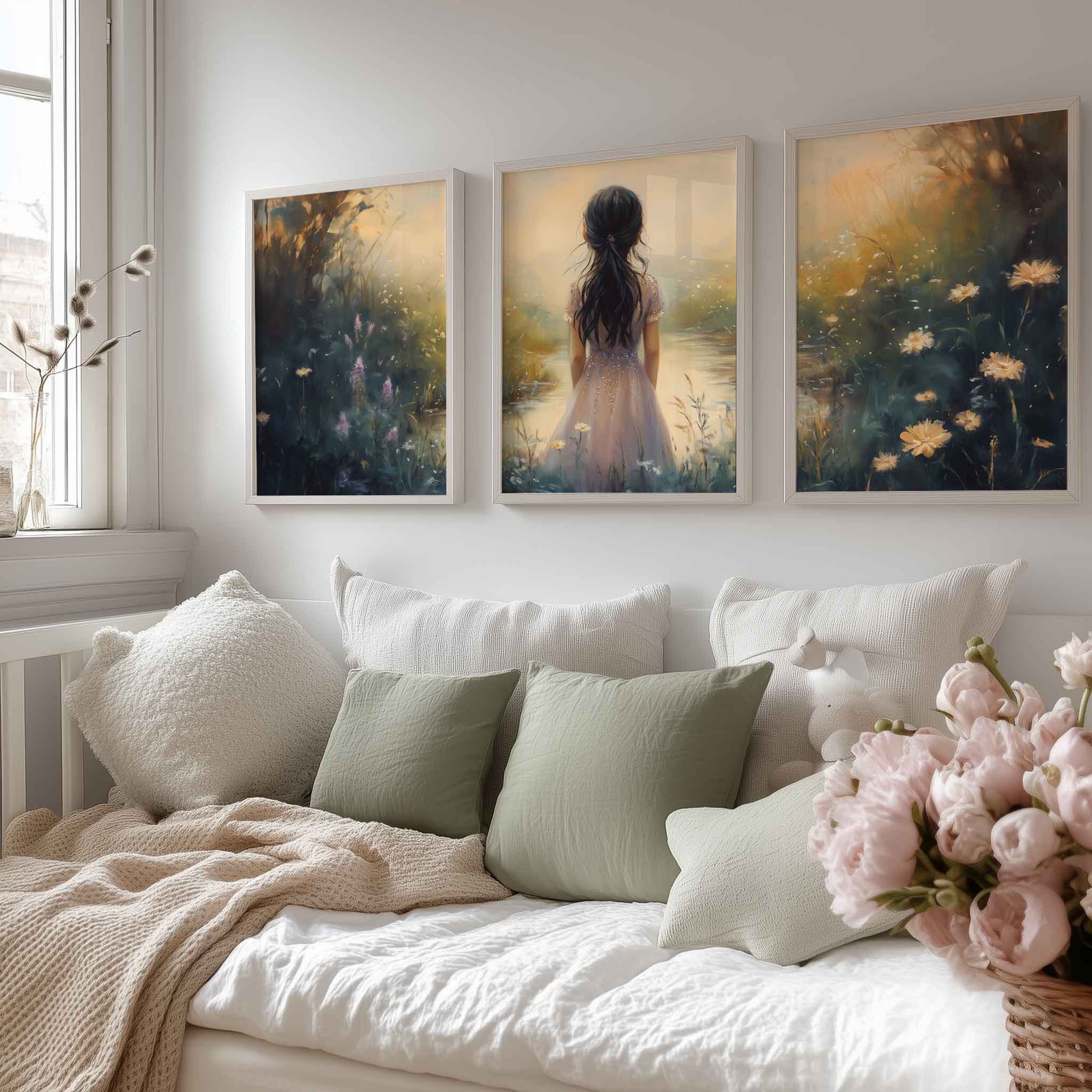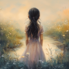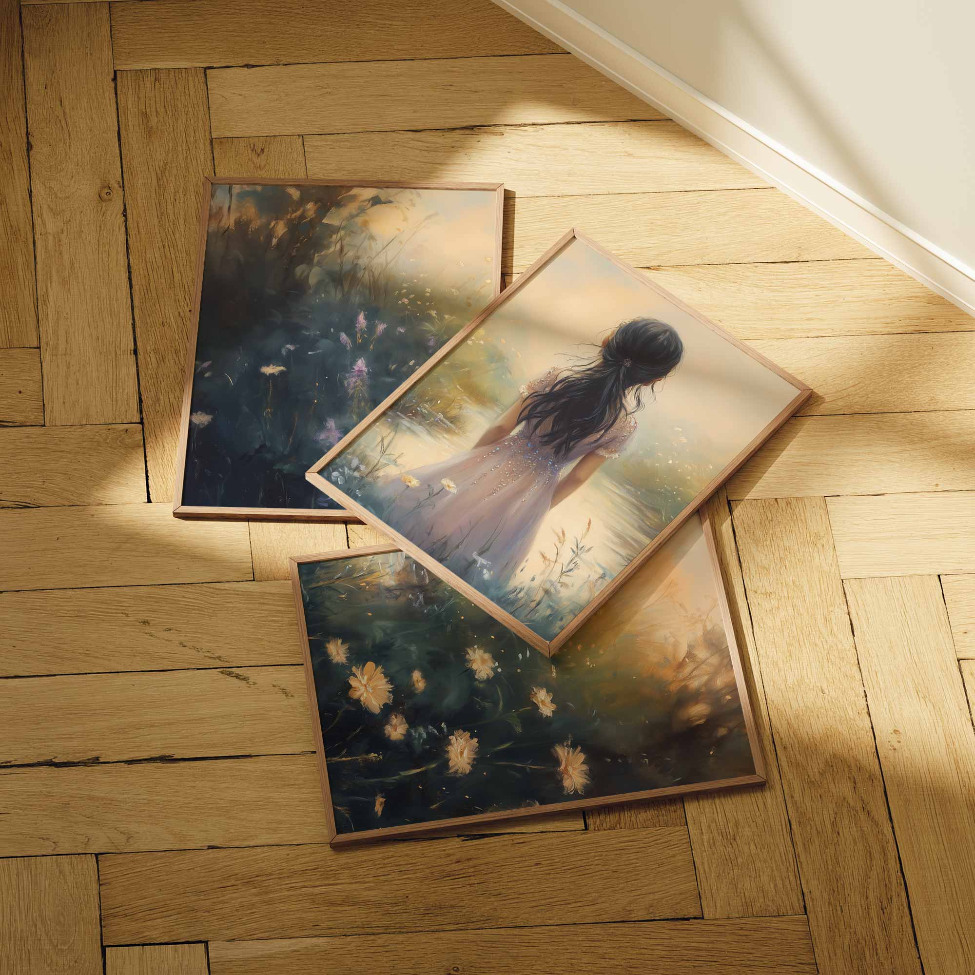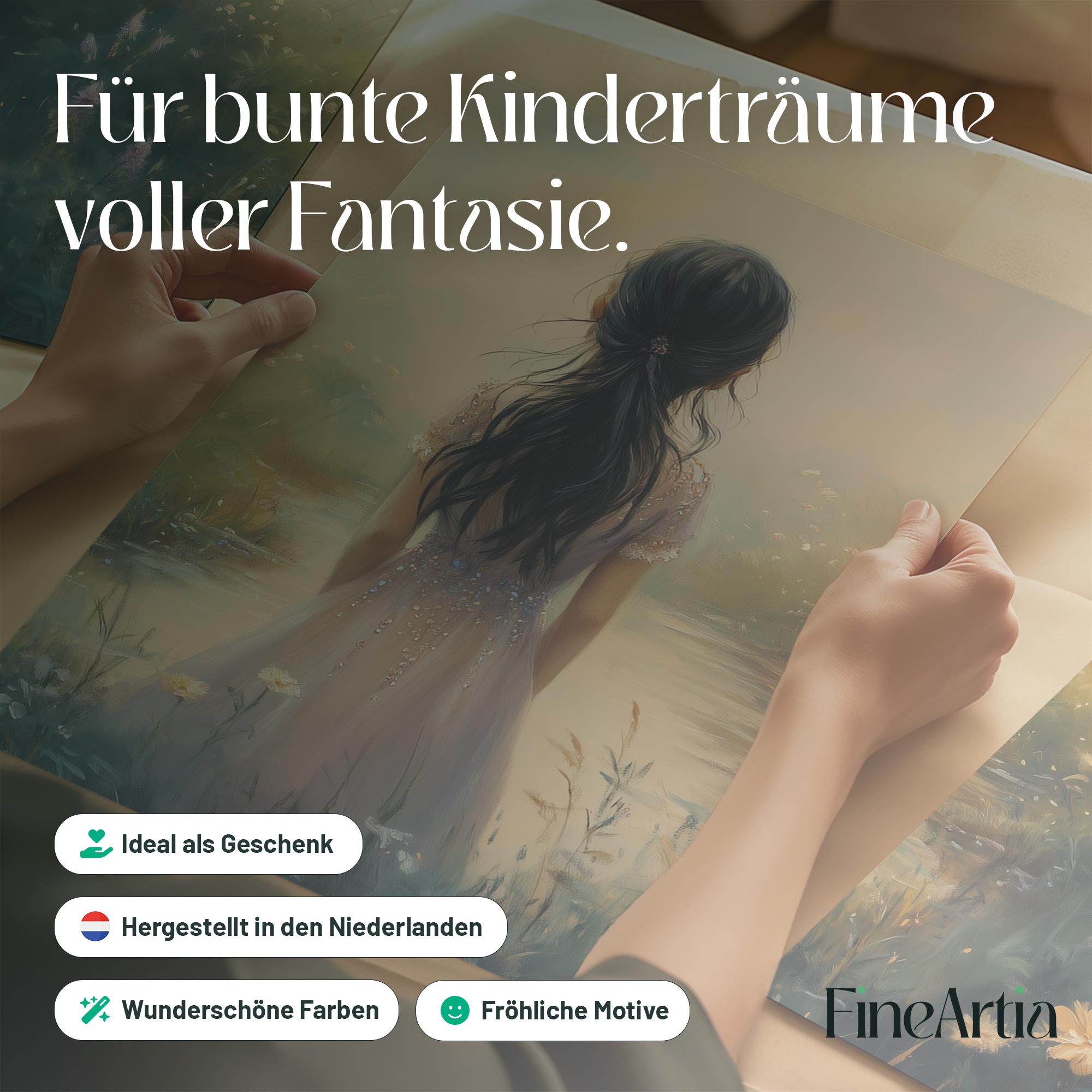 Terug naar collectie Posters Zacht Pastel Meisje in Bloemenveld – Dromerige Sfeer