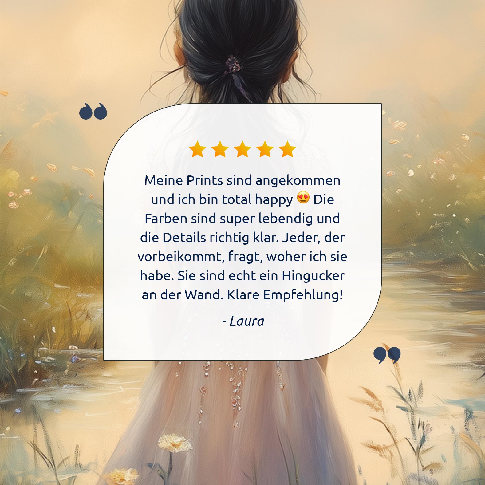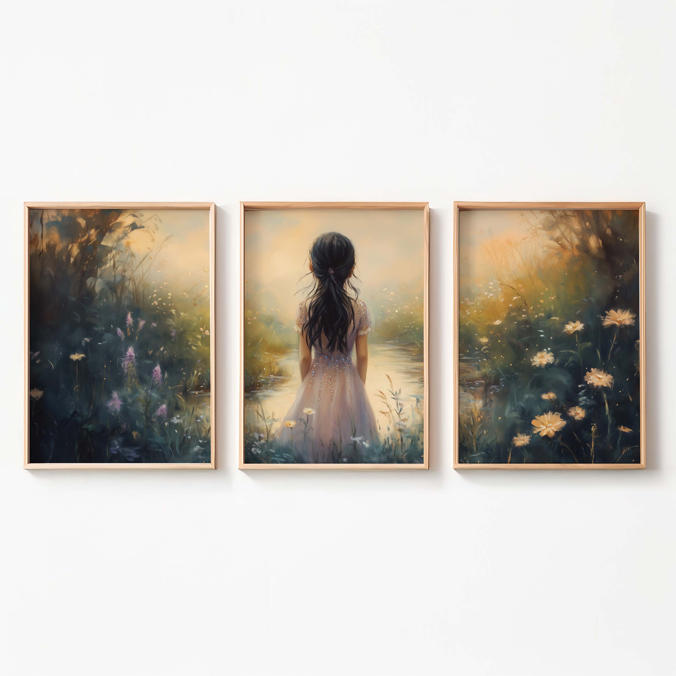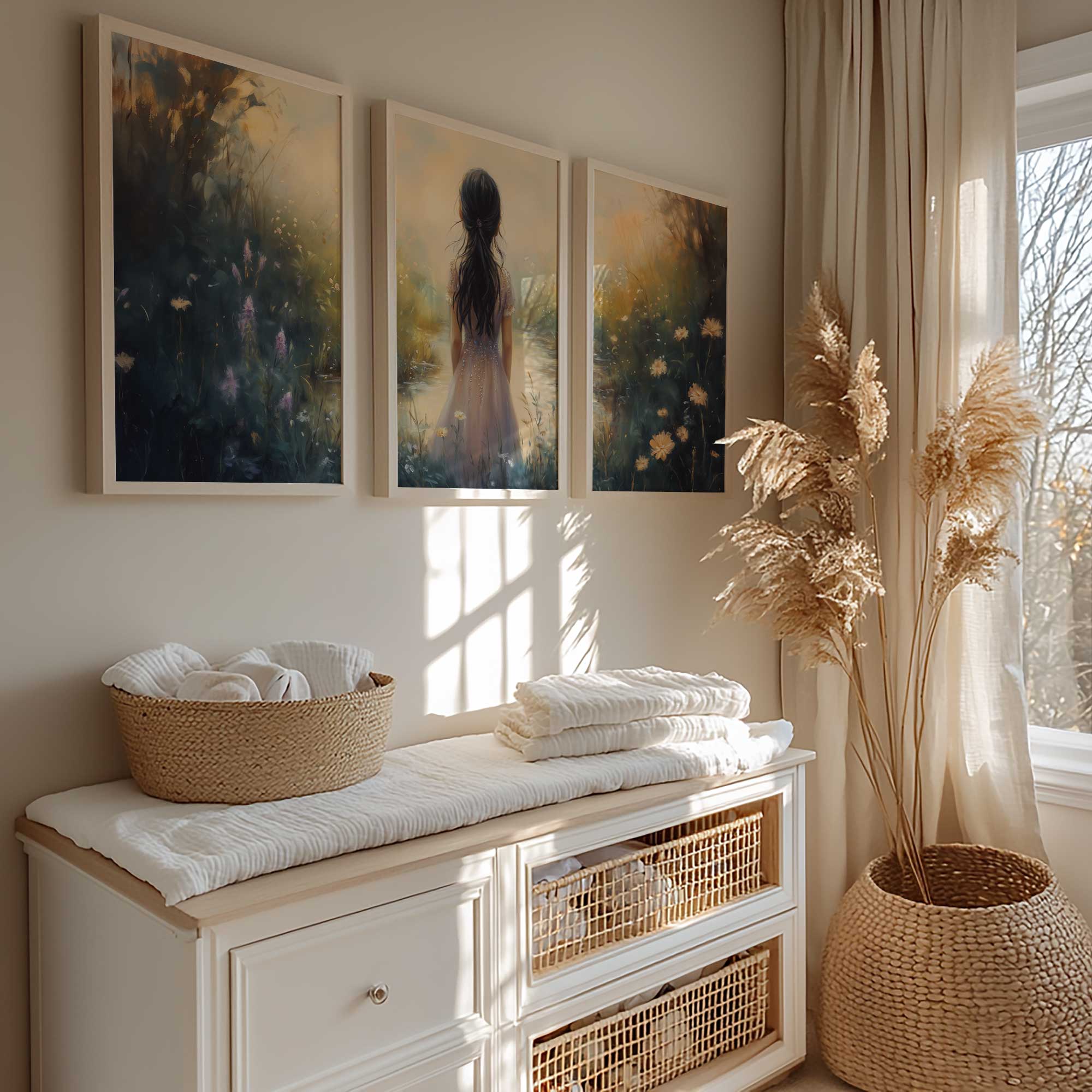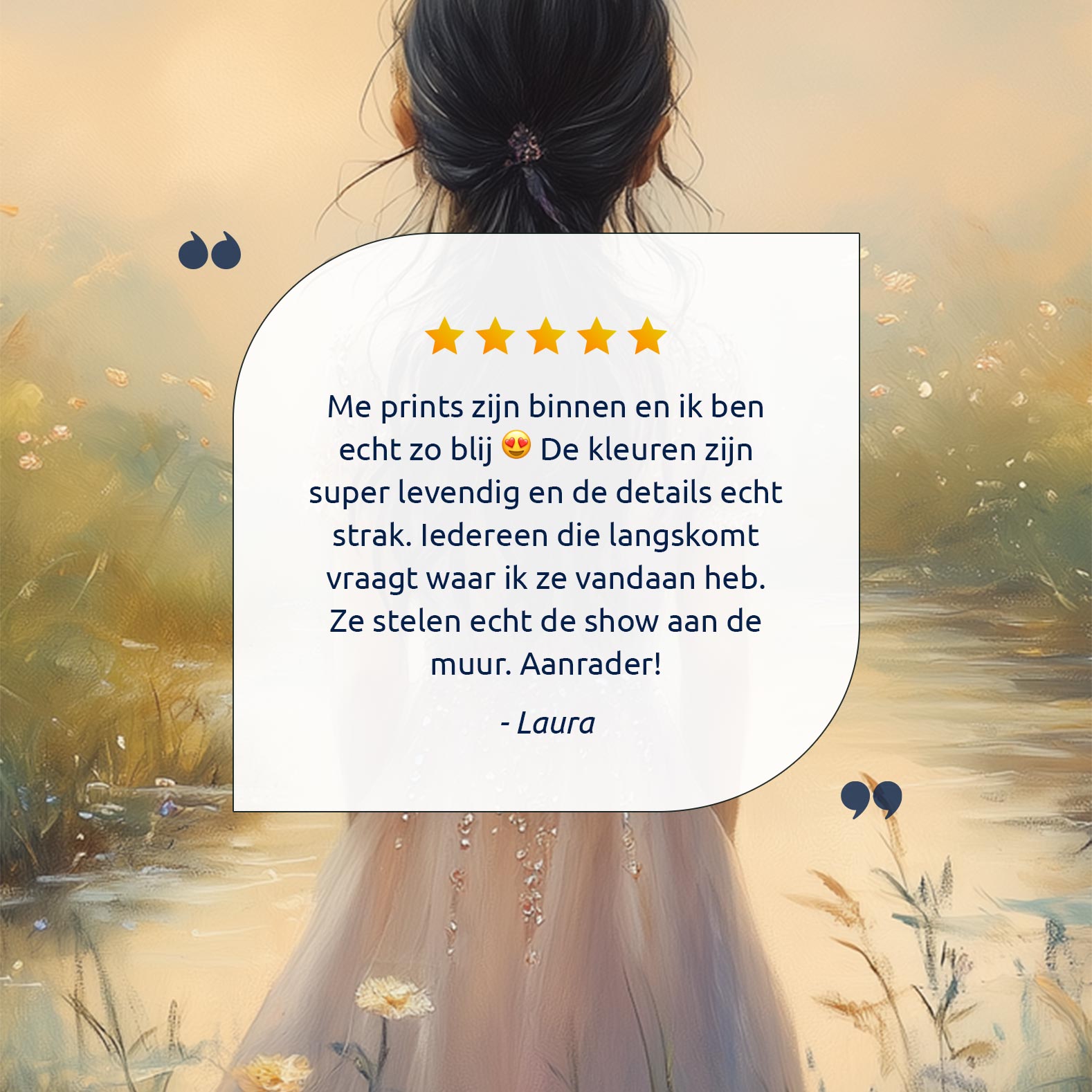 Terug naar collectie Posters Zacht Pastel Meisje in Bloemenveld – Dromerige Sfeer
