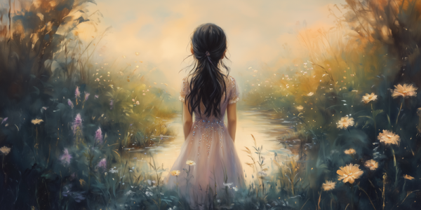 Zacht Pastel Meisje in Bloemenveld – Dromerige Sfeer