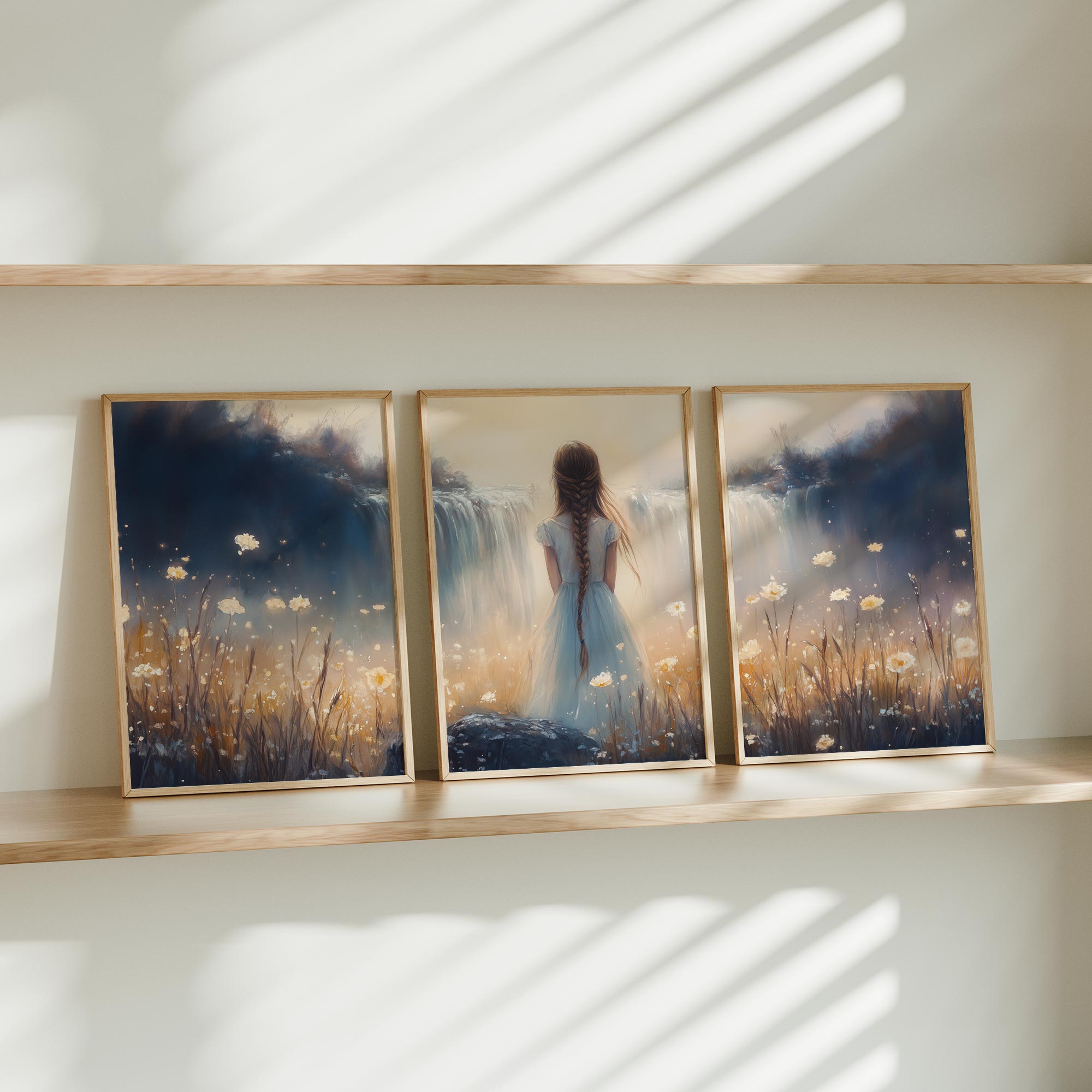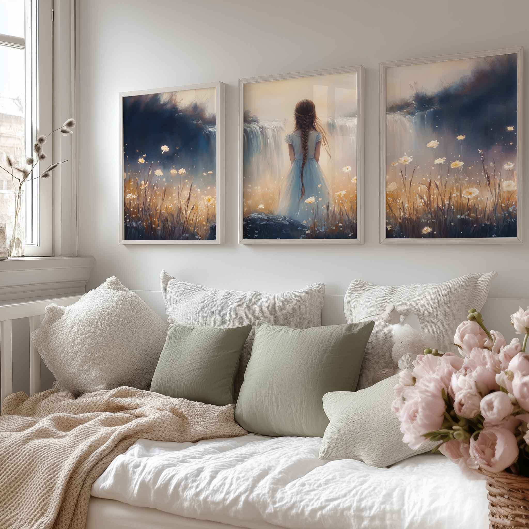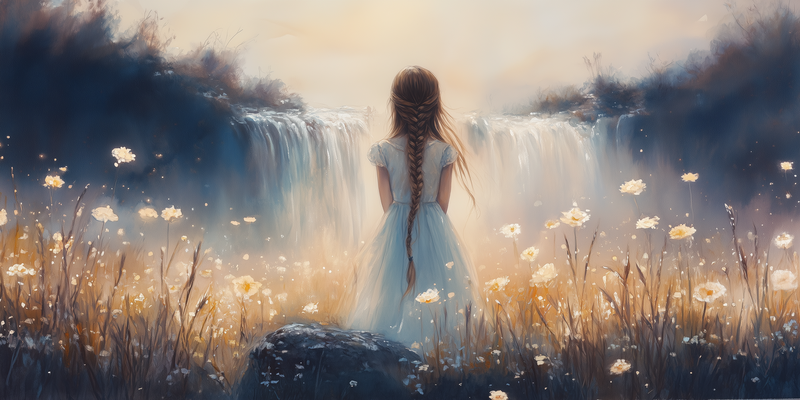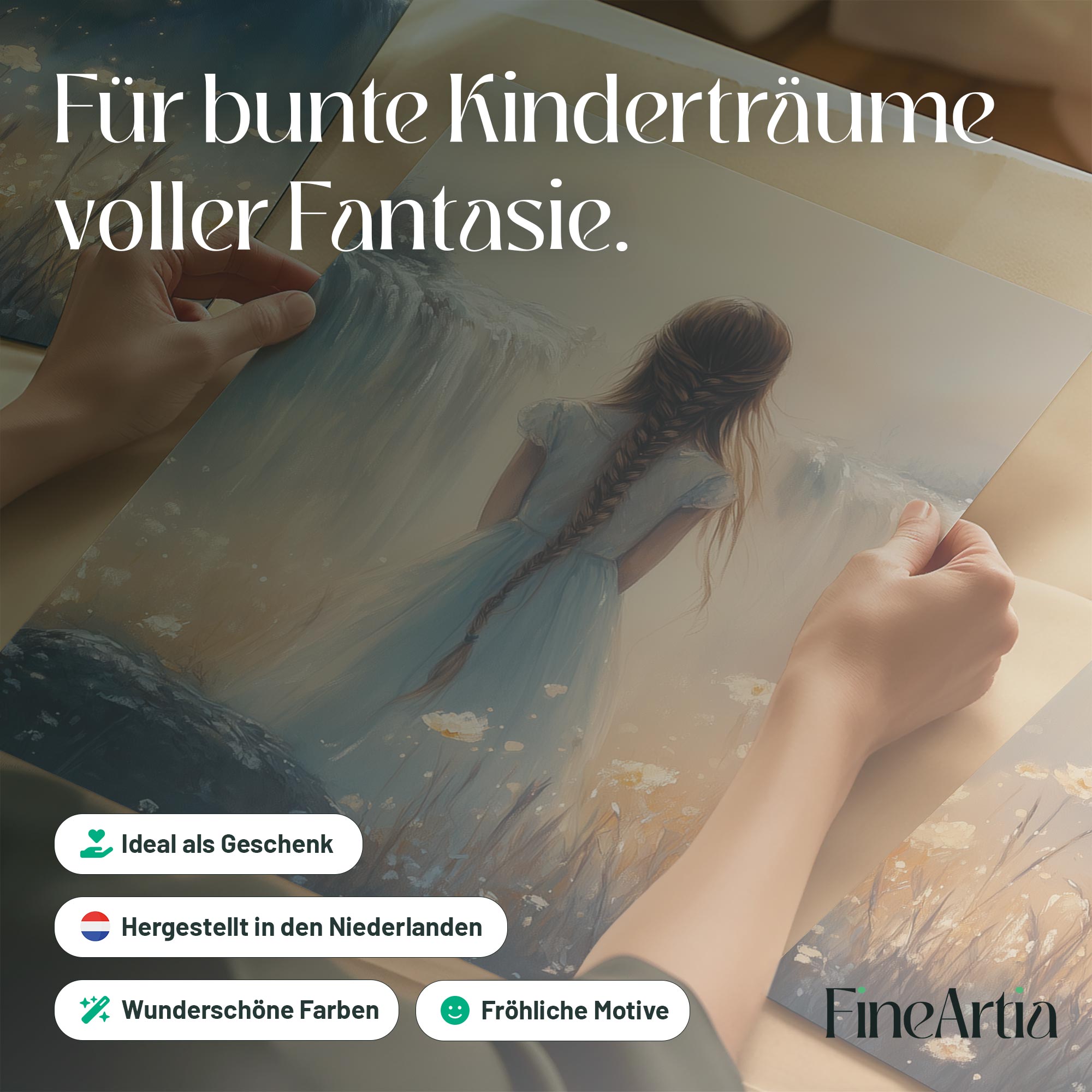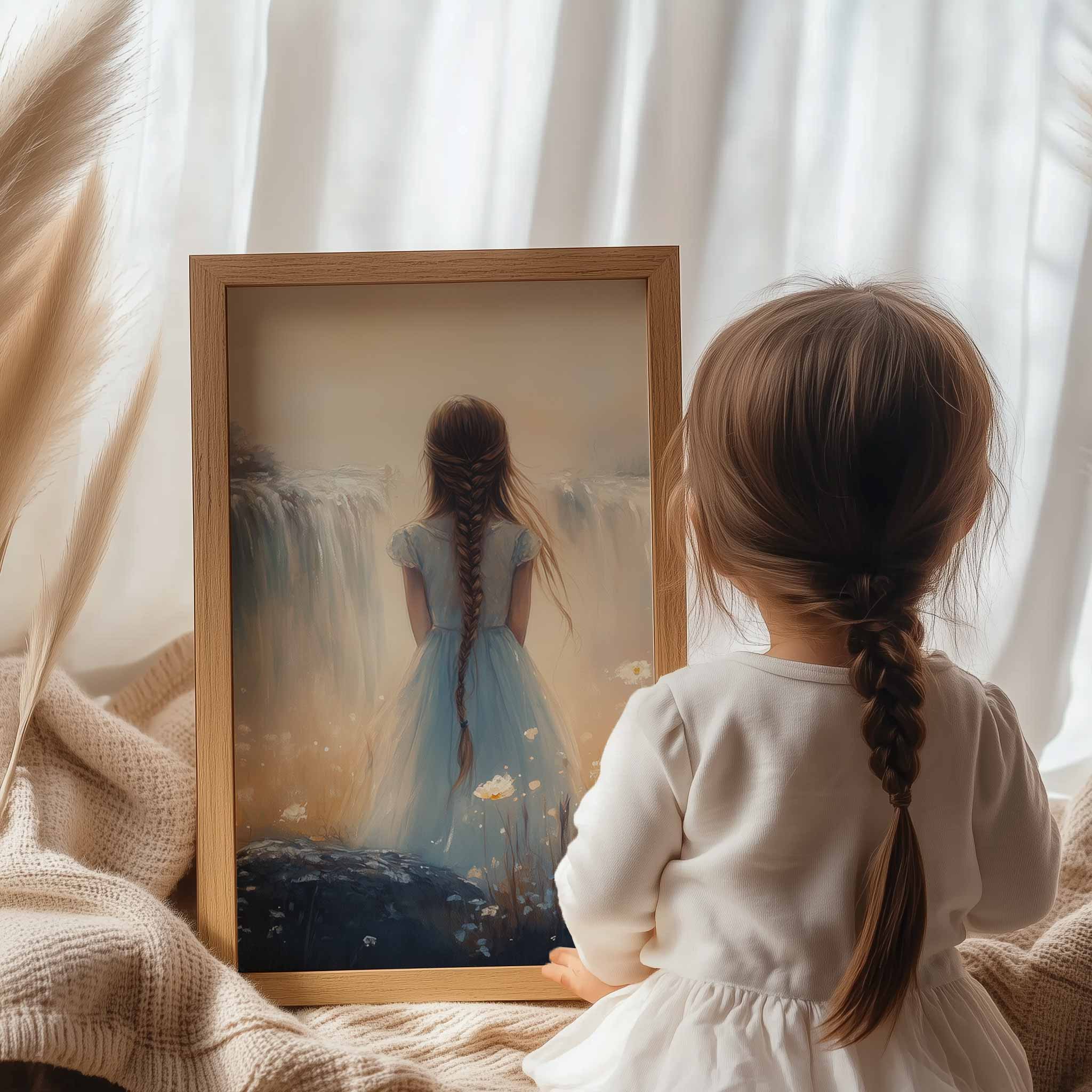 Terug naar collectie Posters Zacht Pastel Meisje in Bloemenveld met Waterval