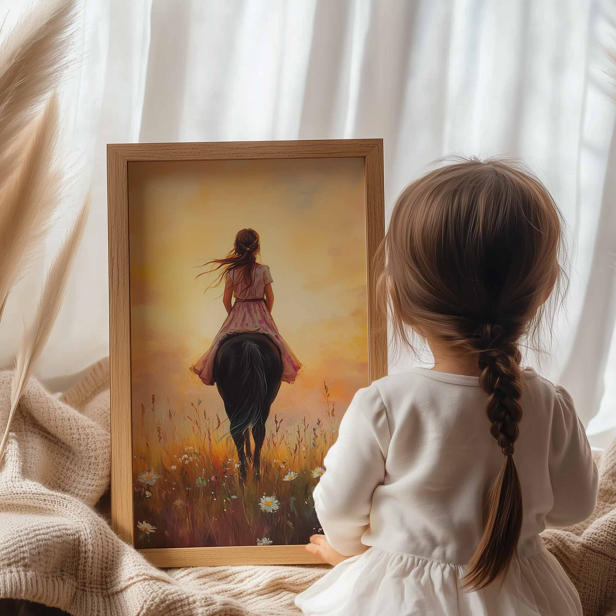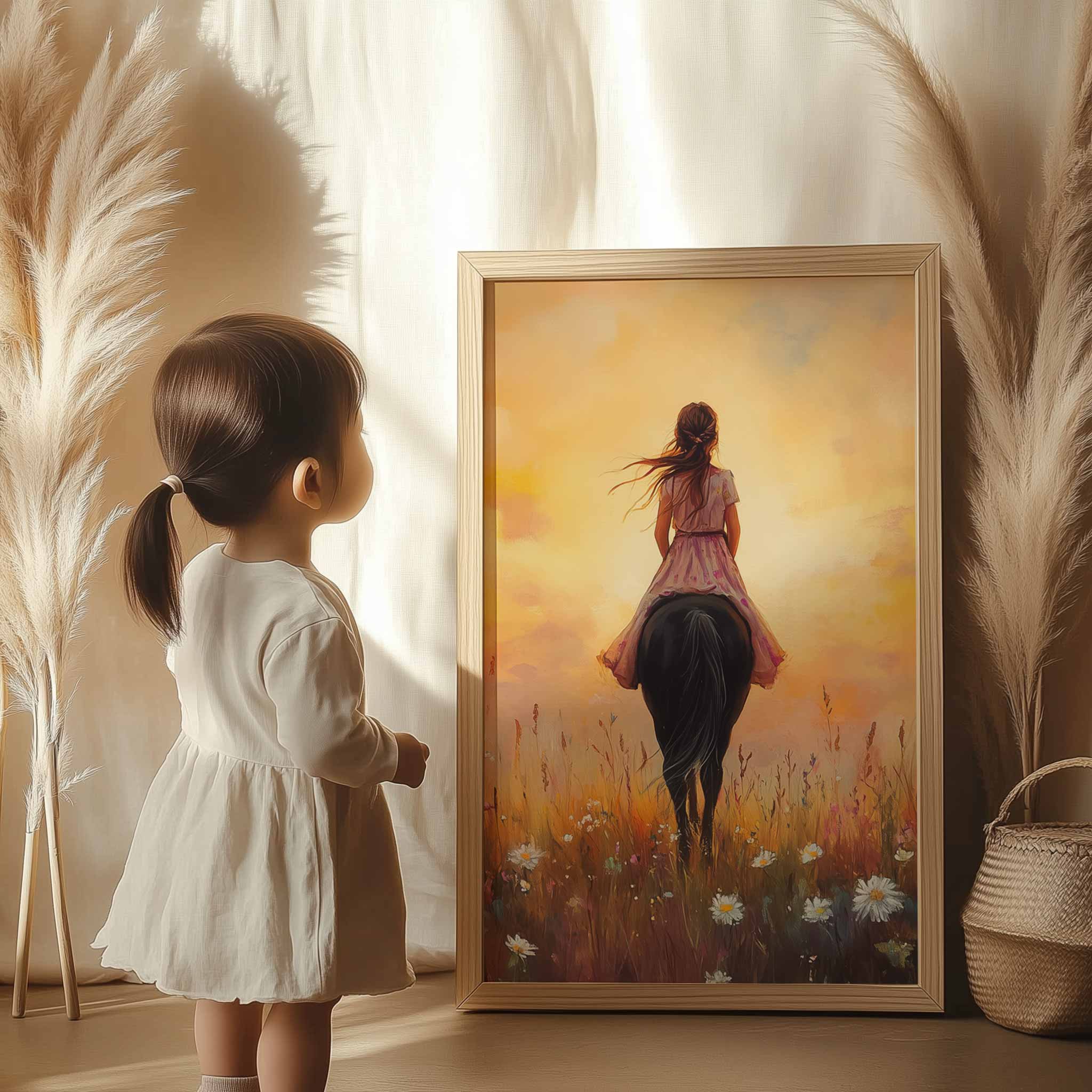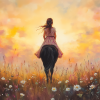 Terug naar collectie Posters Zacht Roze Droom: Vrouw te Paard in Bloemenveld