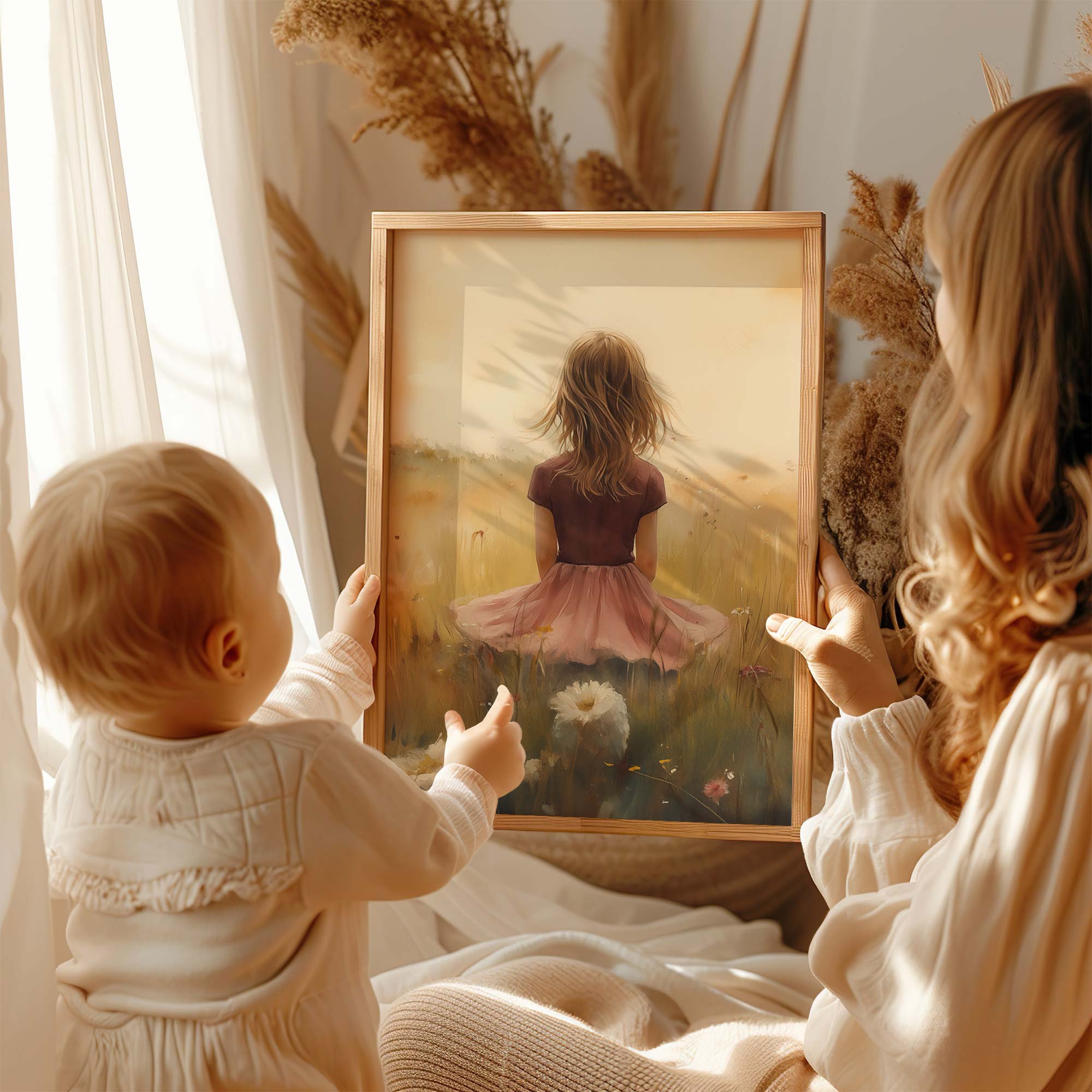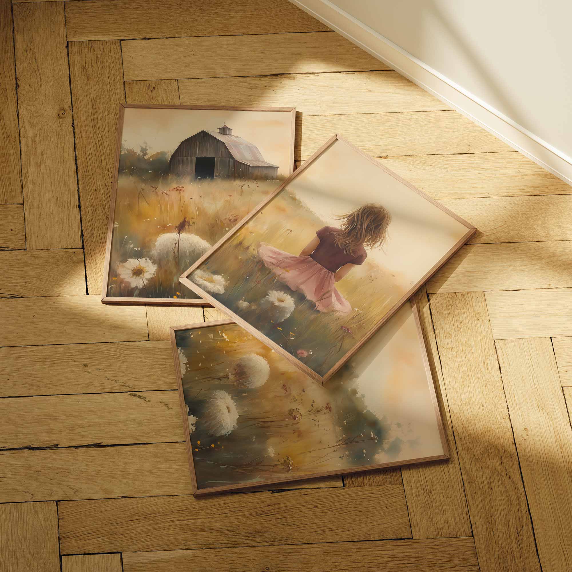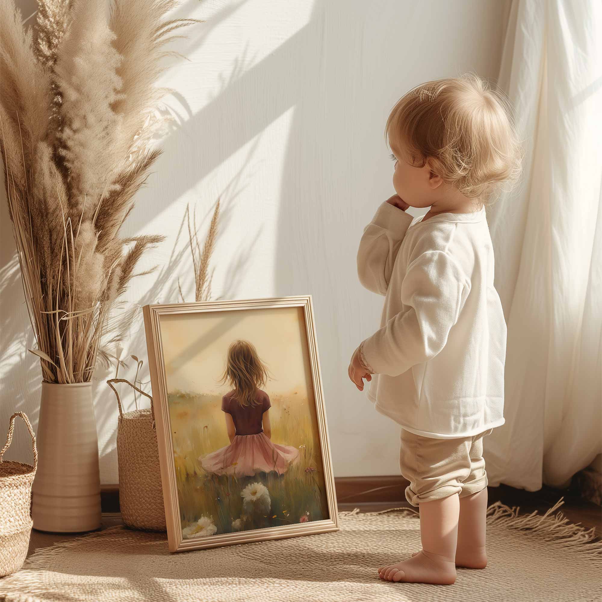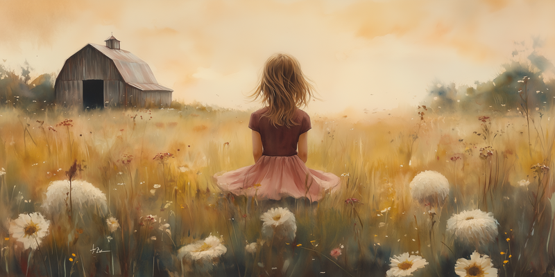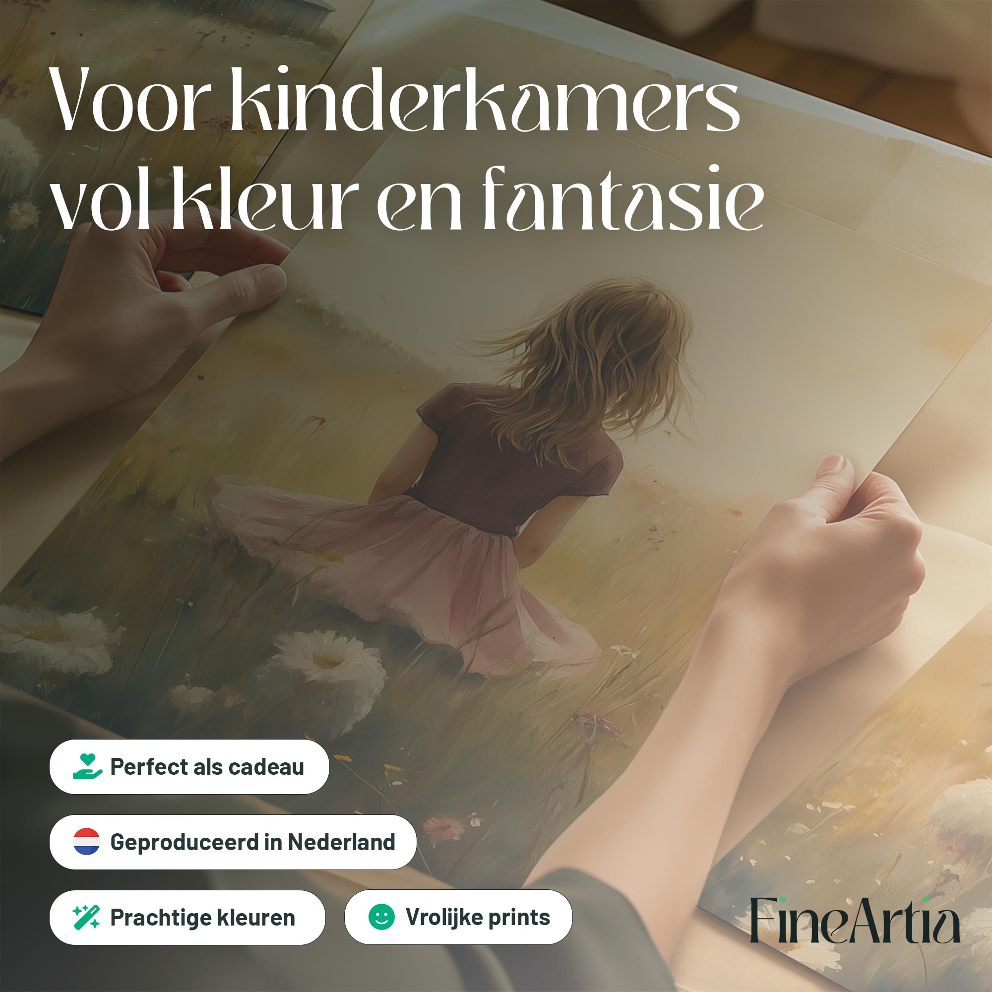 Terug naar collectie Posters Zacht Roze Meisje in Bloemenveld bij de Schuur