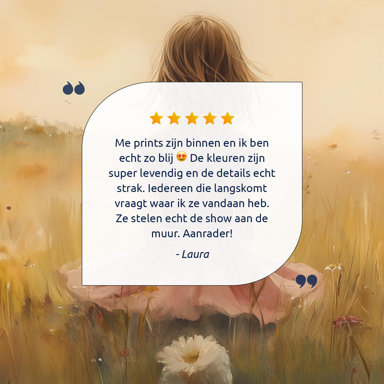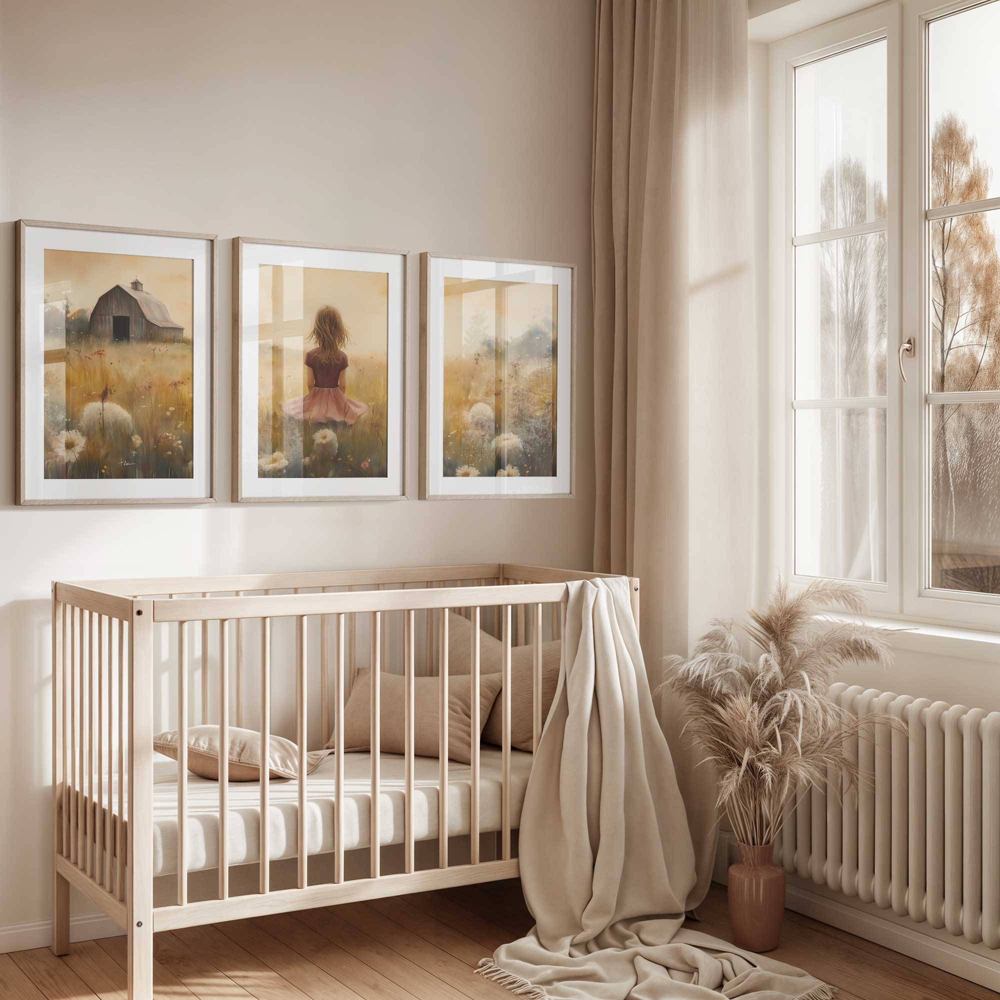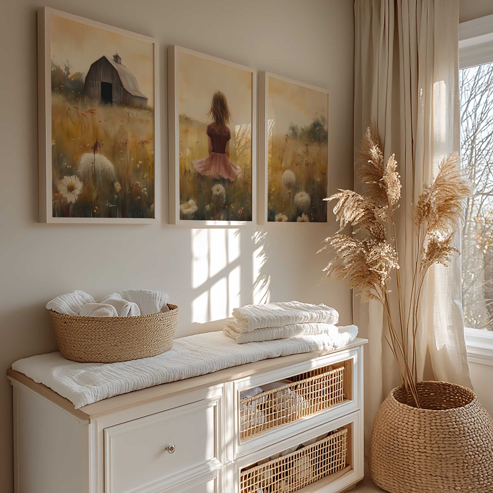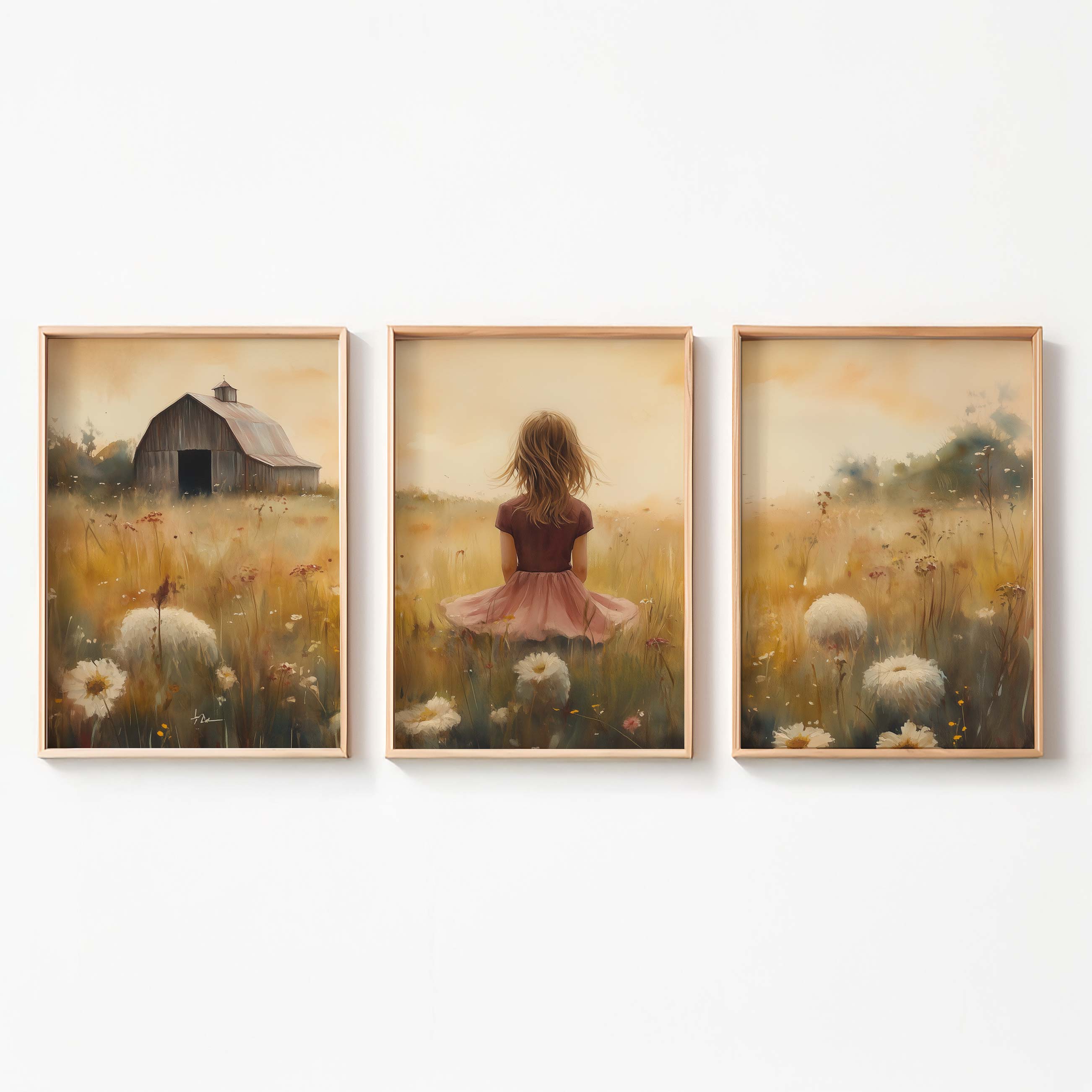 Terug naar collectie Posters Zacht Roze Meisje in Bloemenveld bij de Schuur