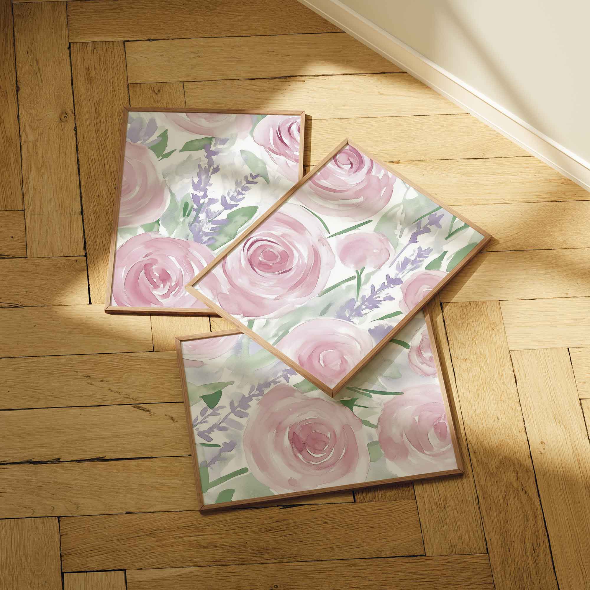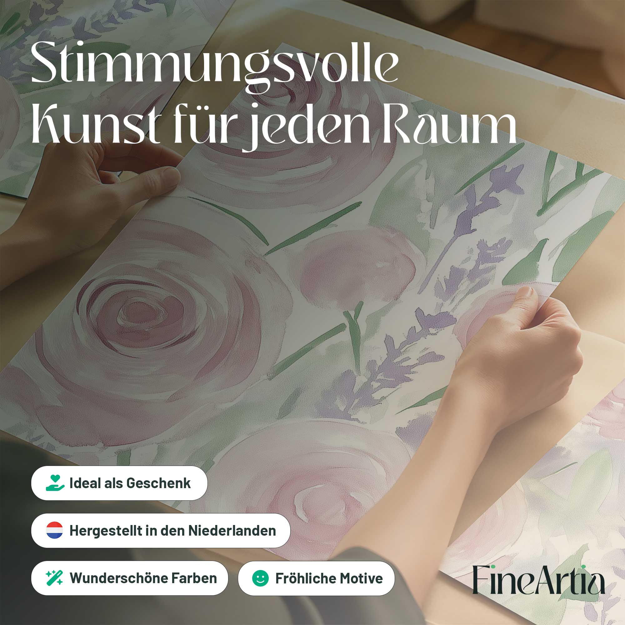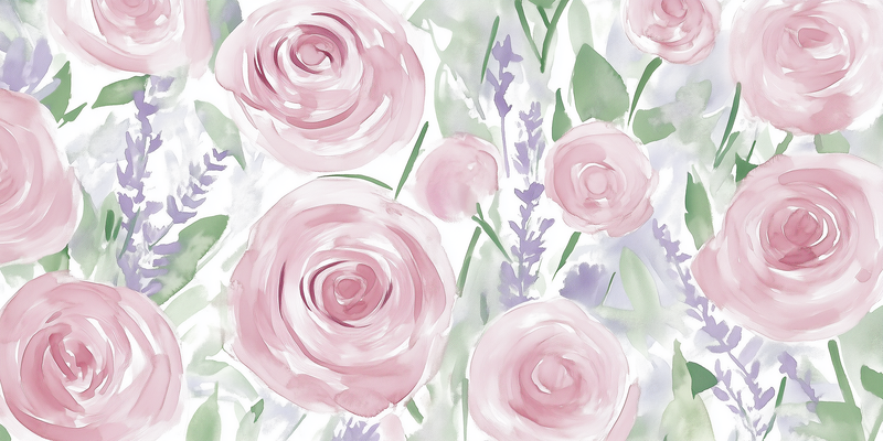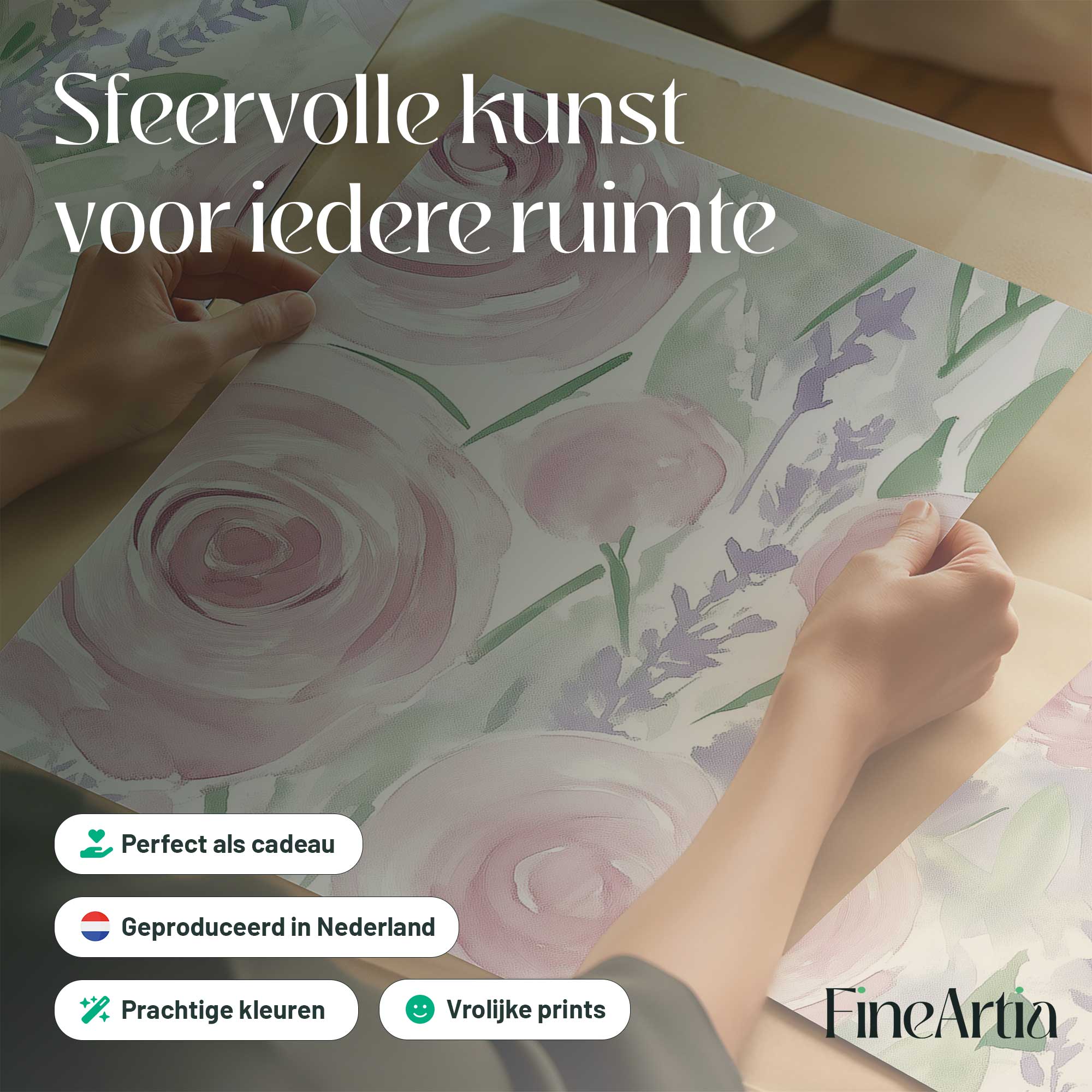 Zacht Roze Rozen en Lavendel – Speelse Waterverf Wanddecoratie
