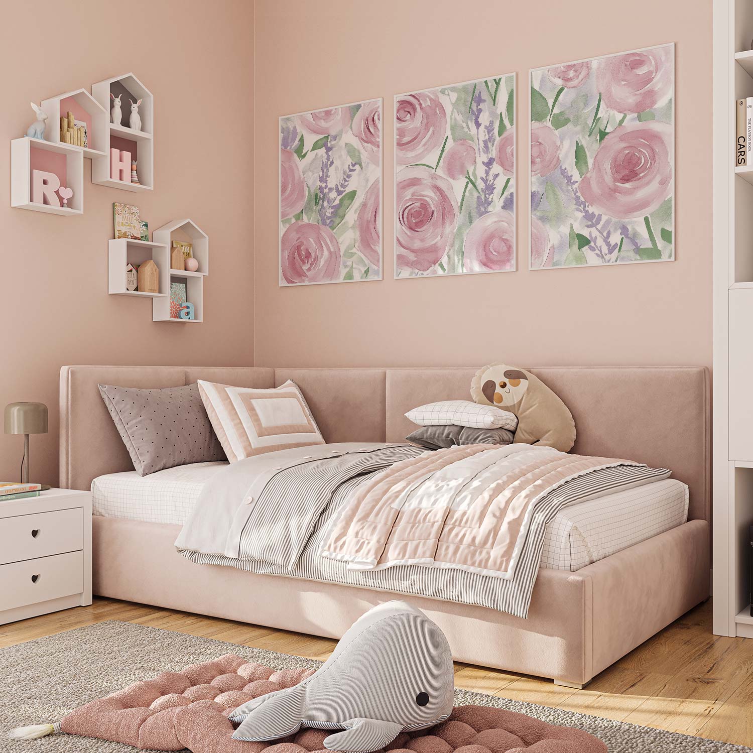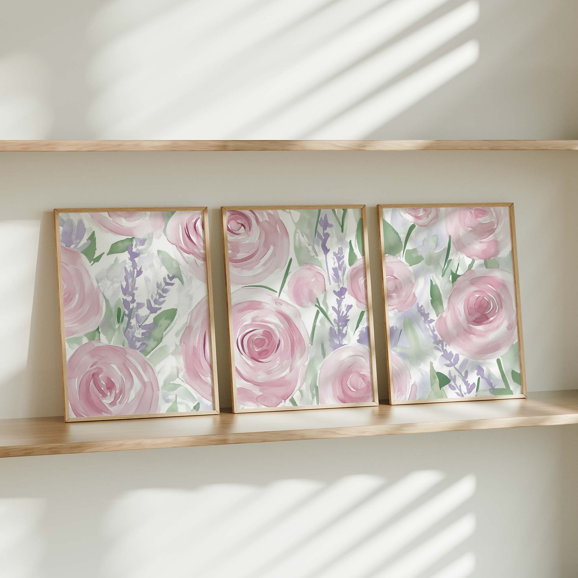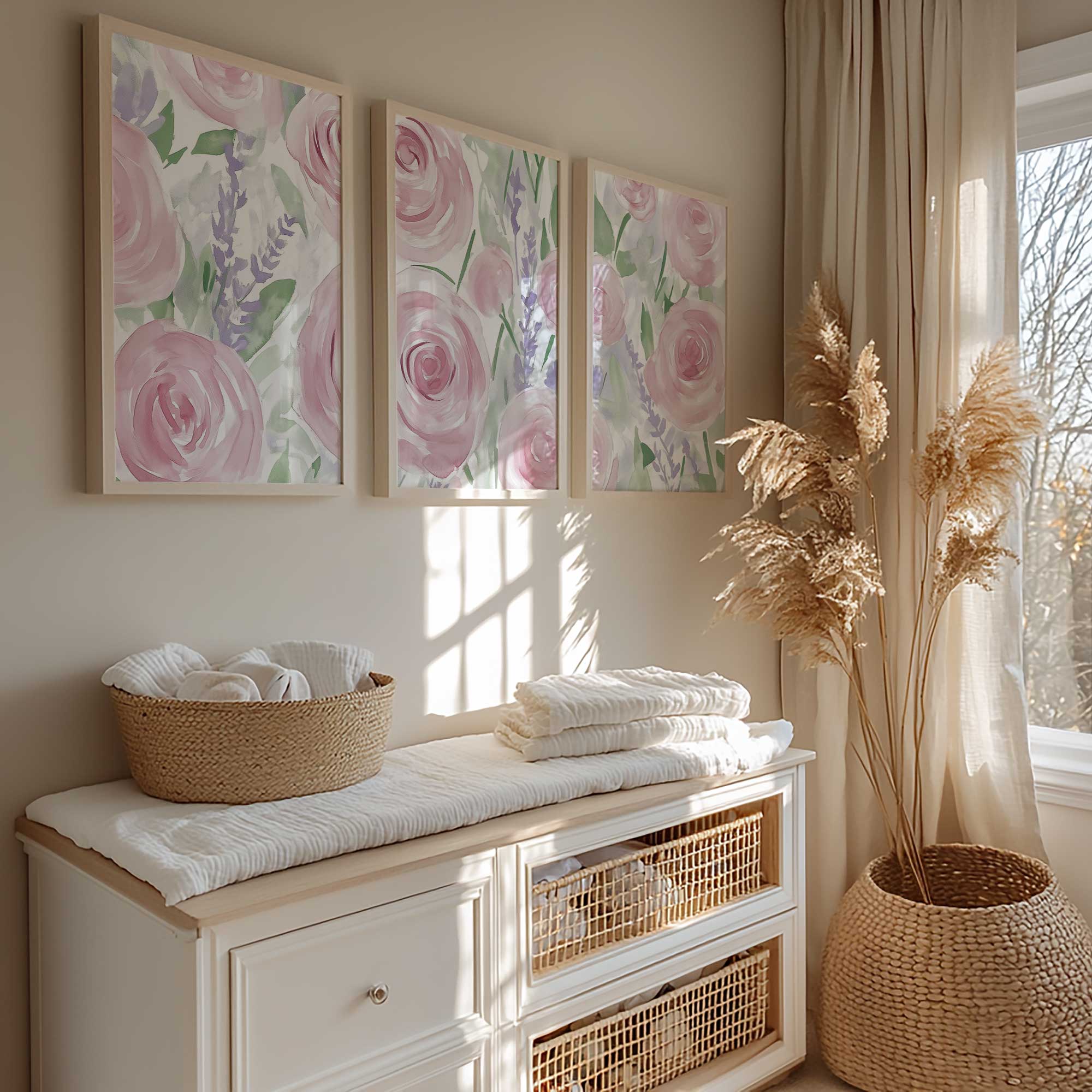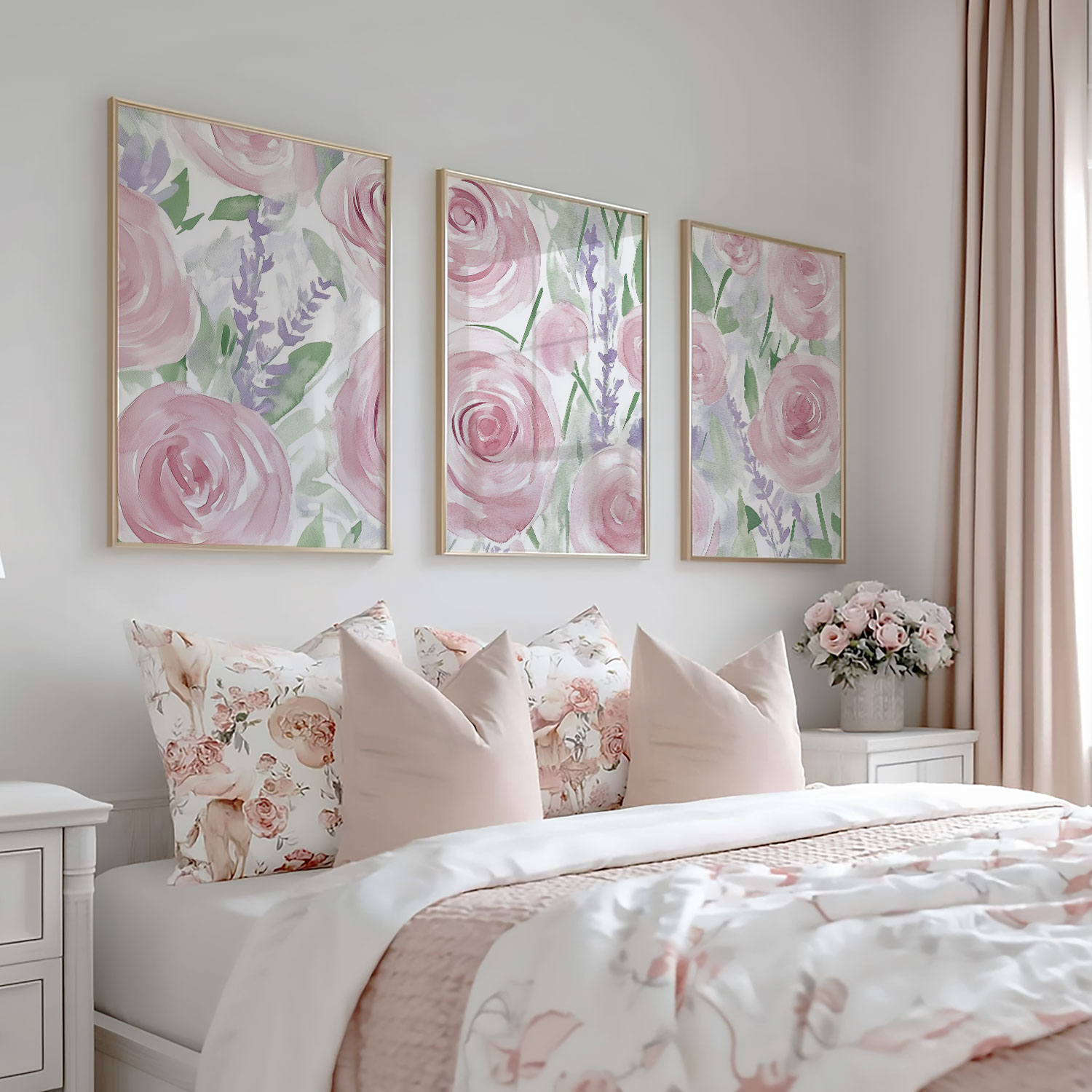 Zacht Roze Rozen en Lavendel – Speelse Waterverf Wanddecoratie