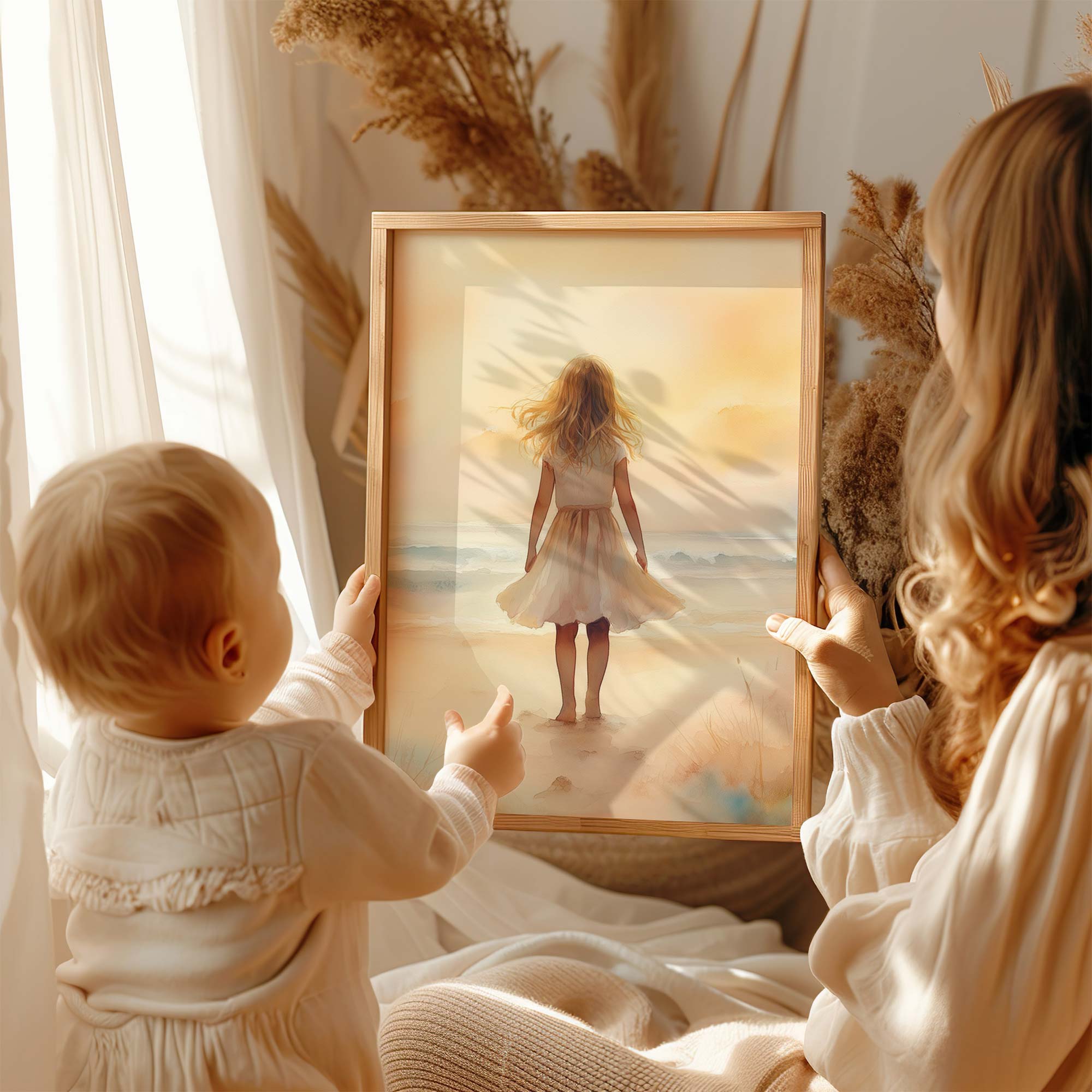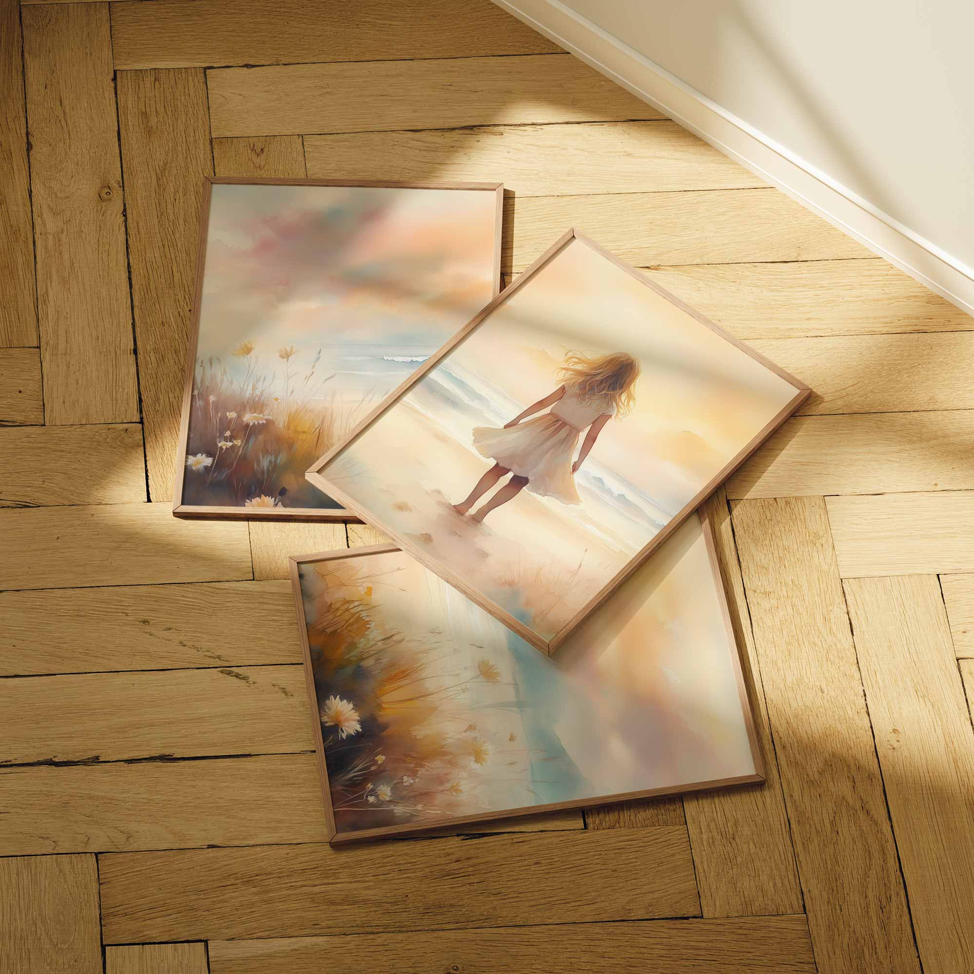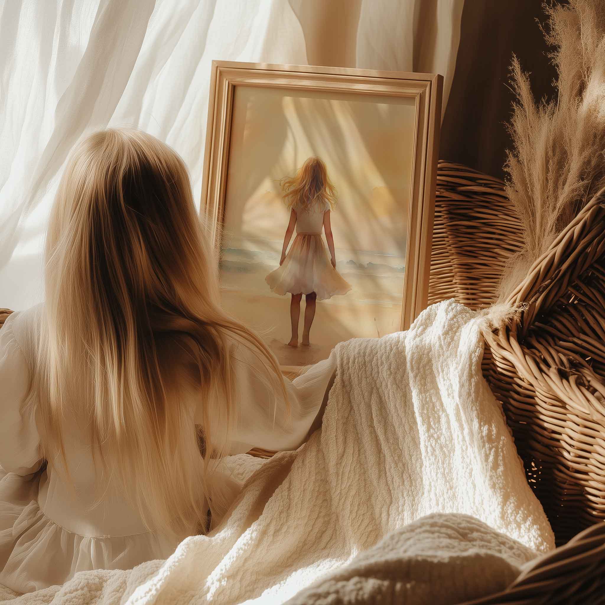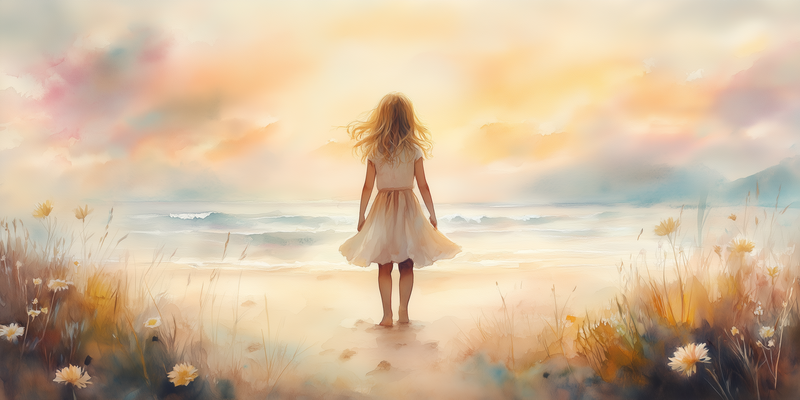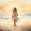 Zacht Zeegezicht: Meisje in Witte Jurk bij Zonsondergang