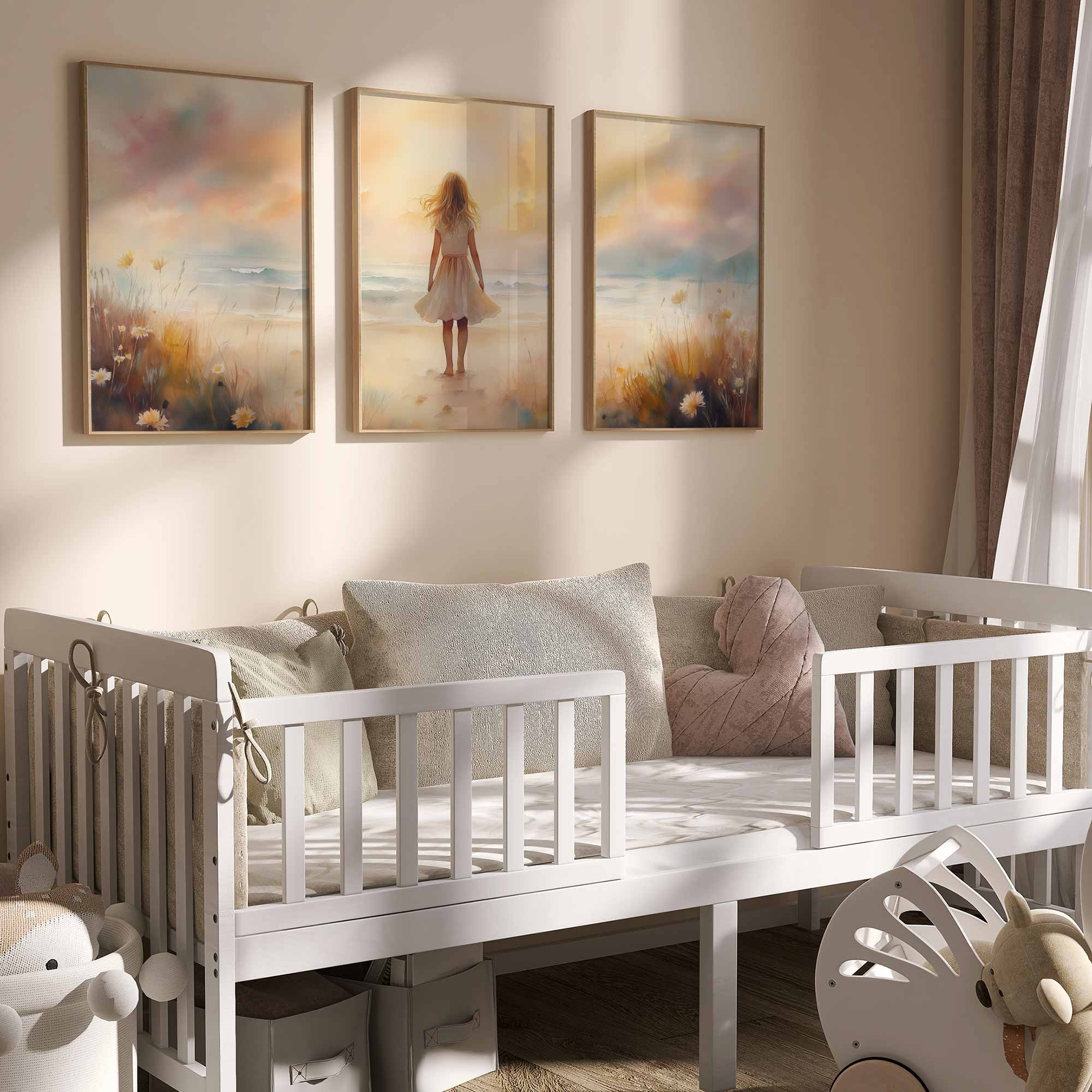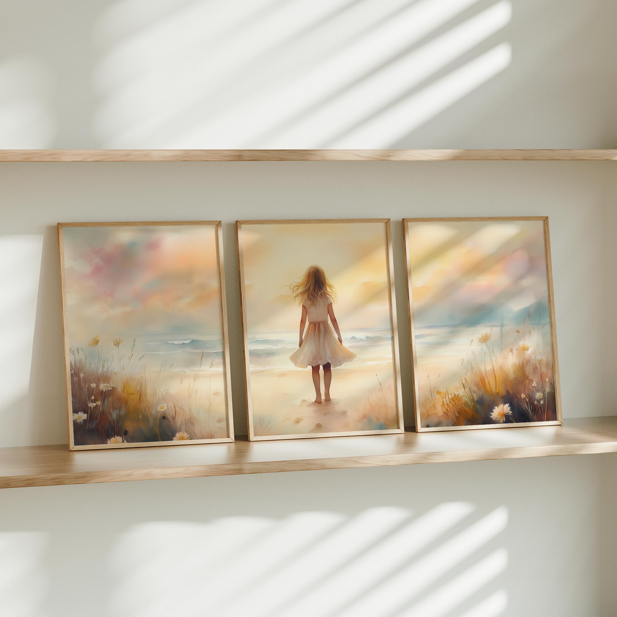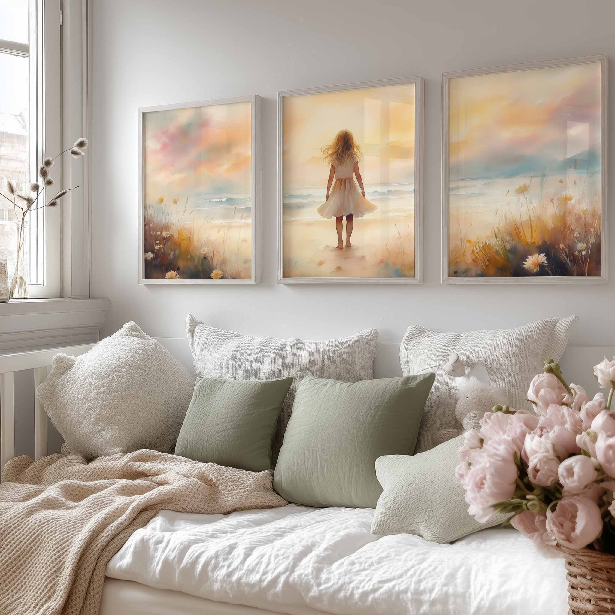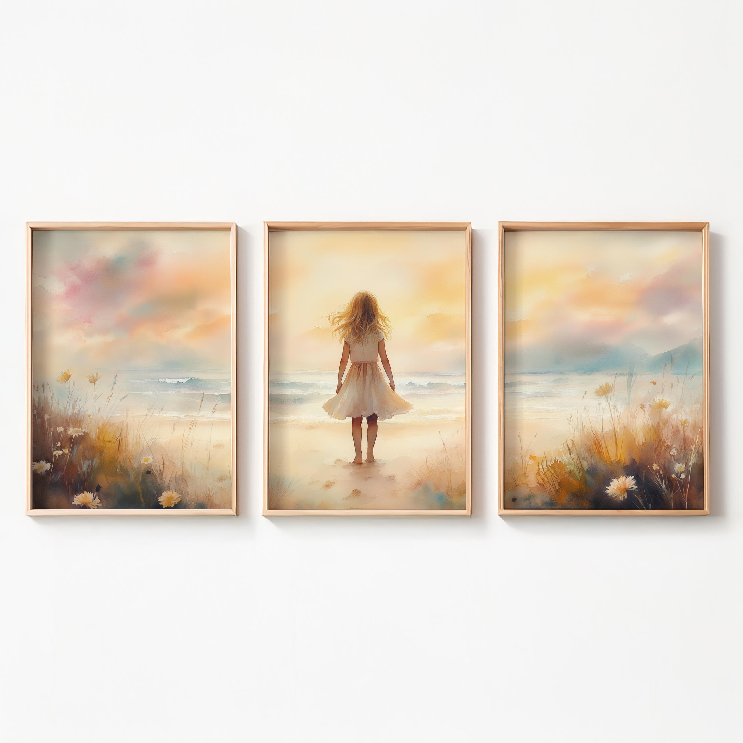 Zacht Zeegezicht: Meisje in Witte Jurk bij Zonsondergang