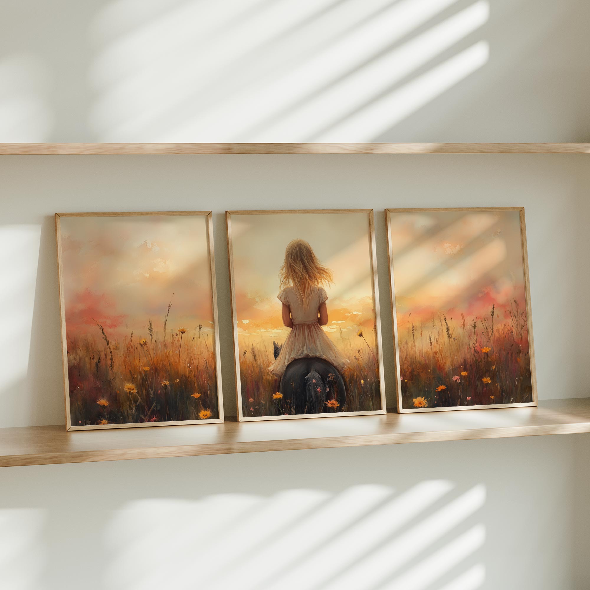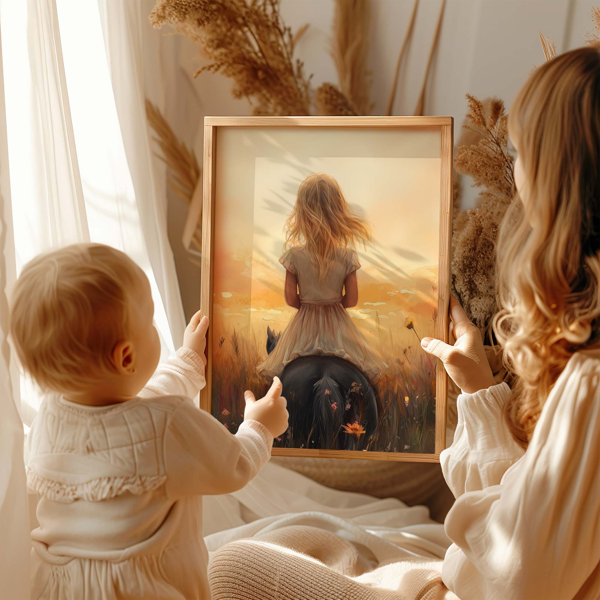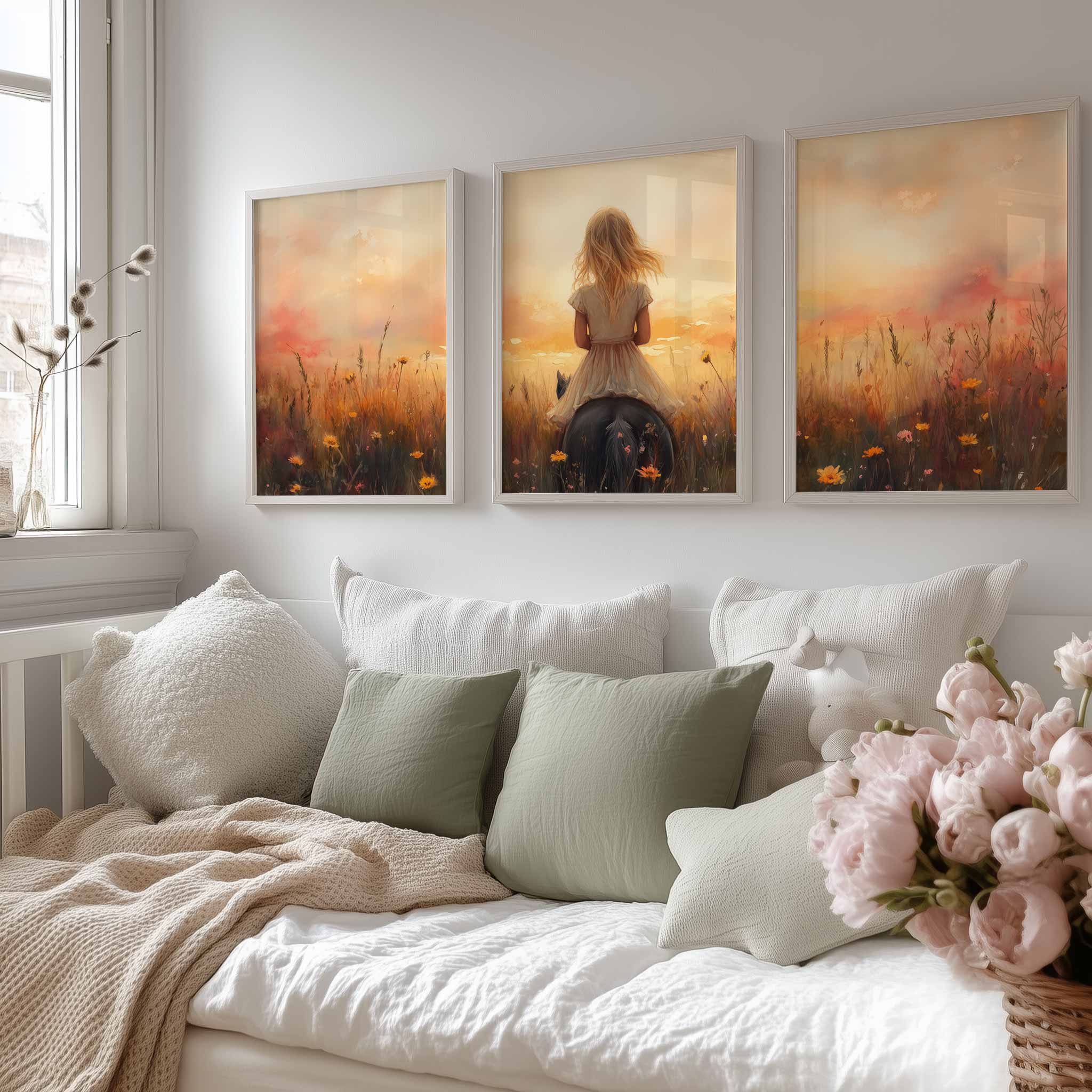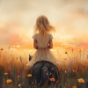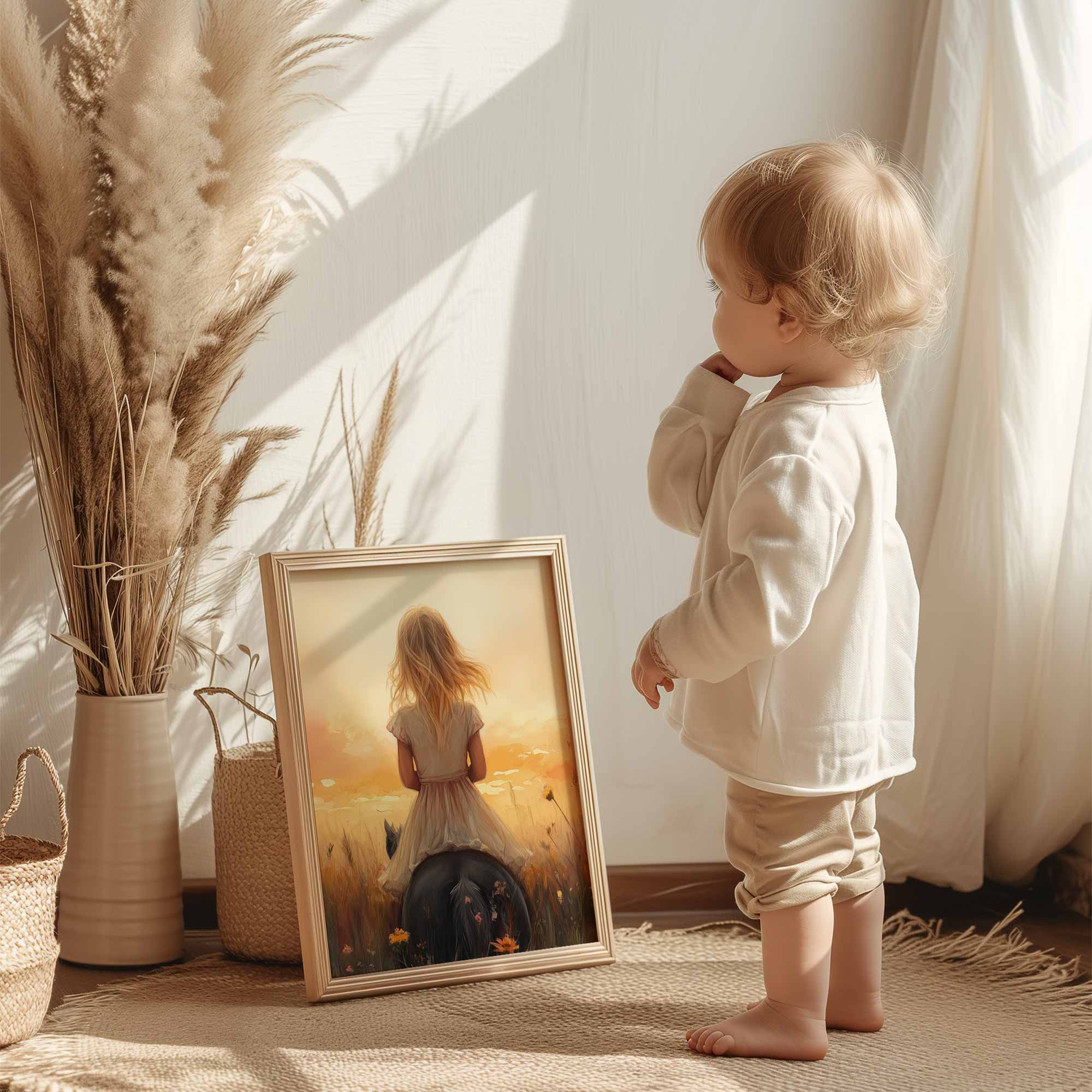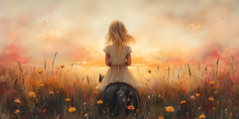 Zacht Zonlicht: Meisje te Paard tussen Bloemen