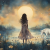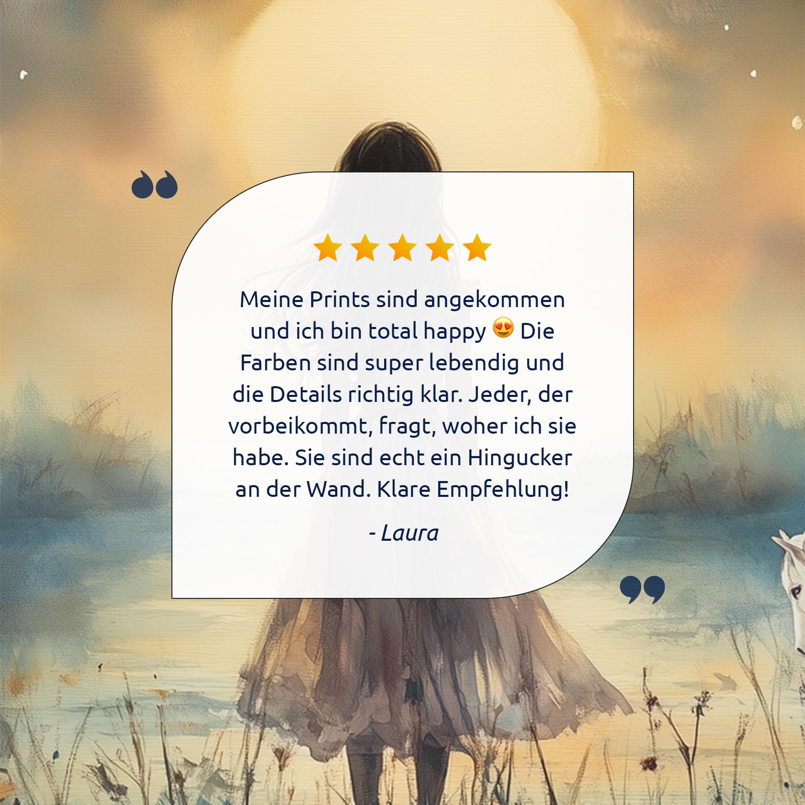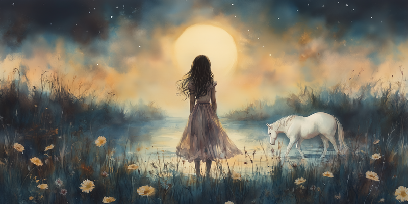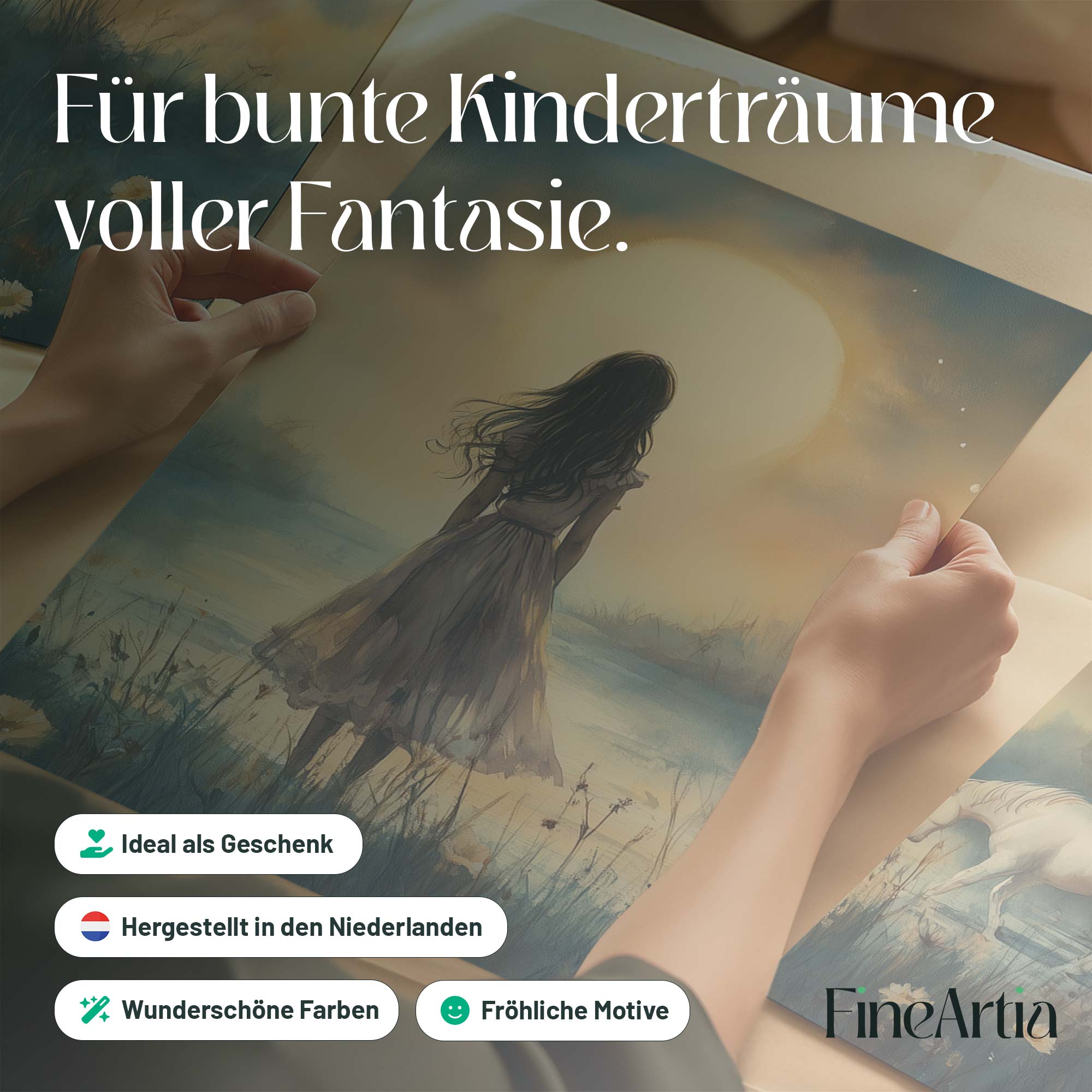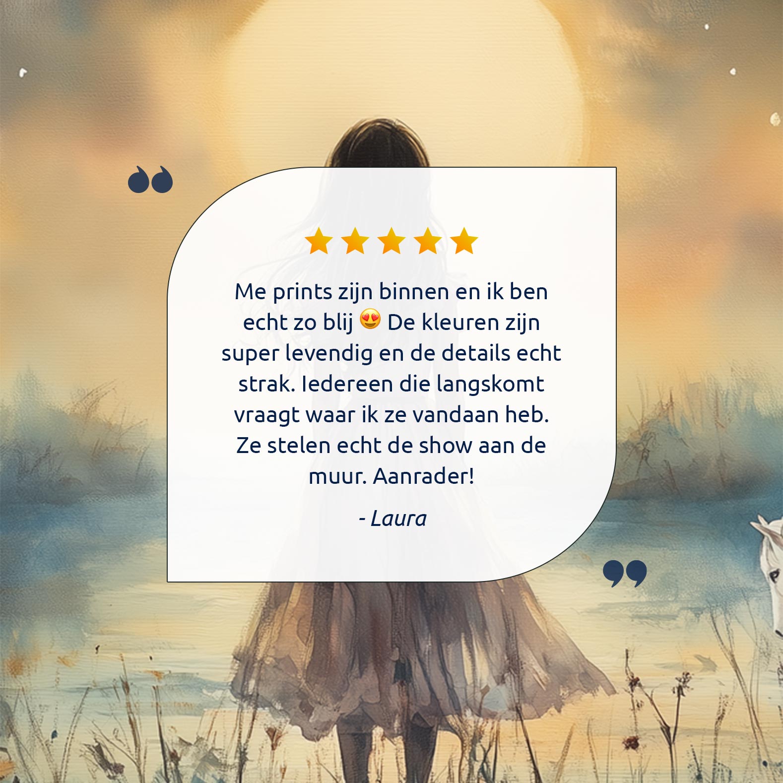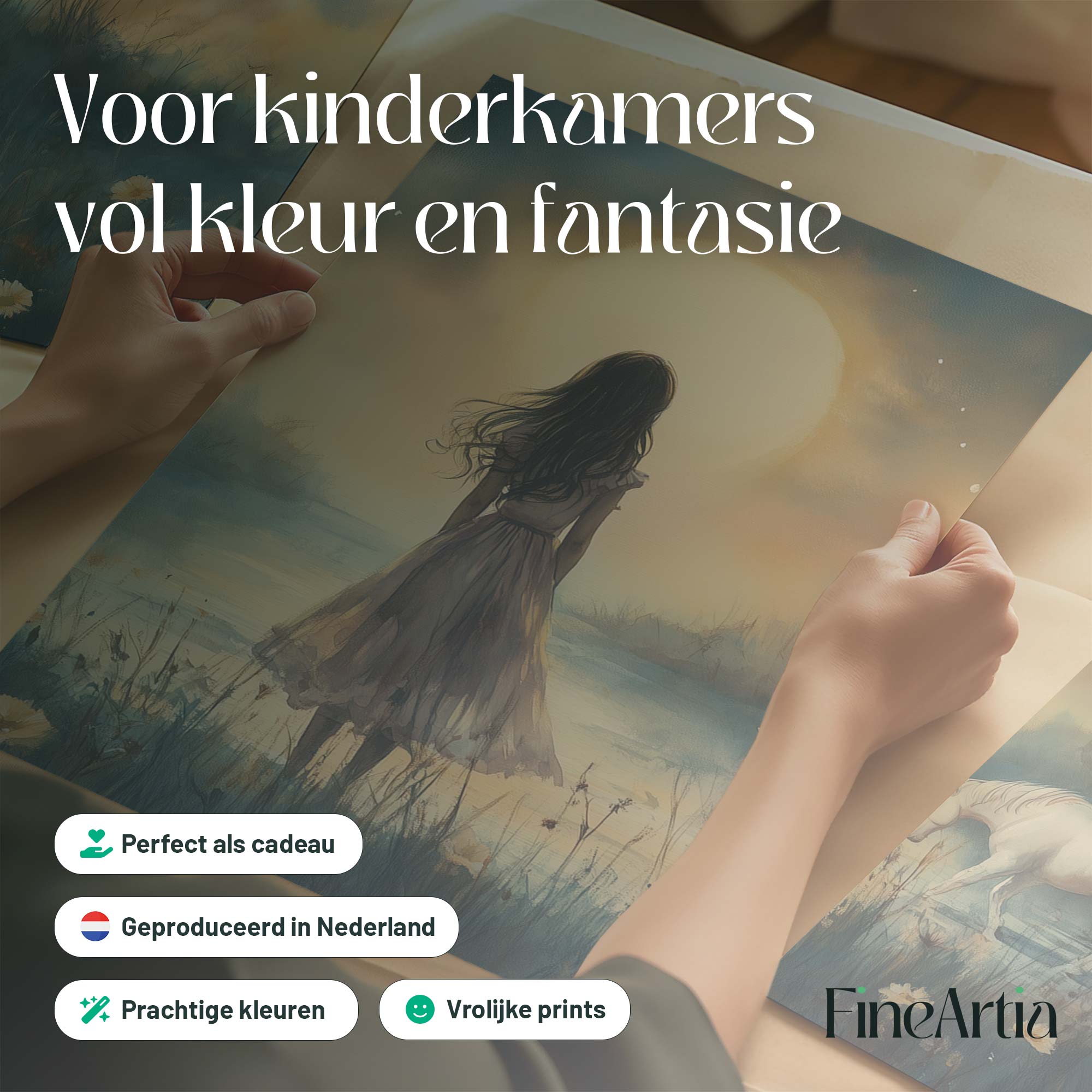 Terug naar collectie Posters Zacht Zonsondergang met Dame en Witte Paard