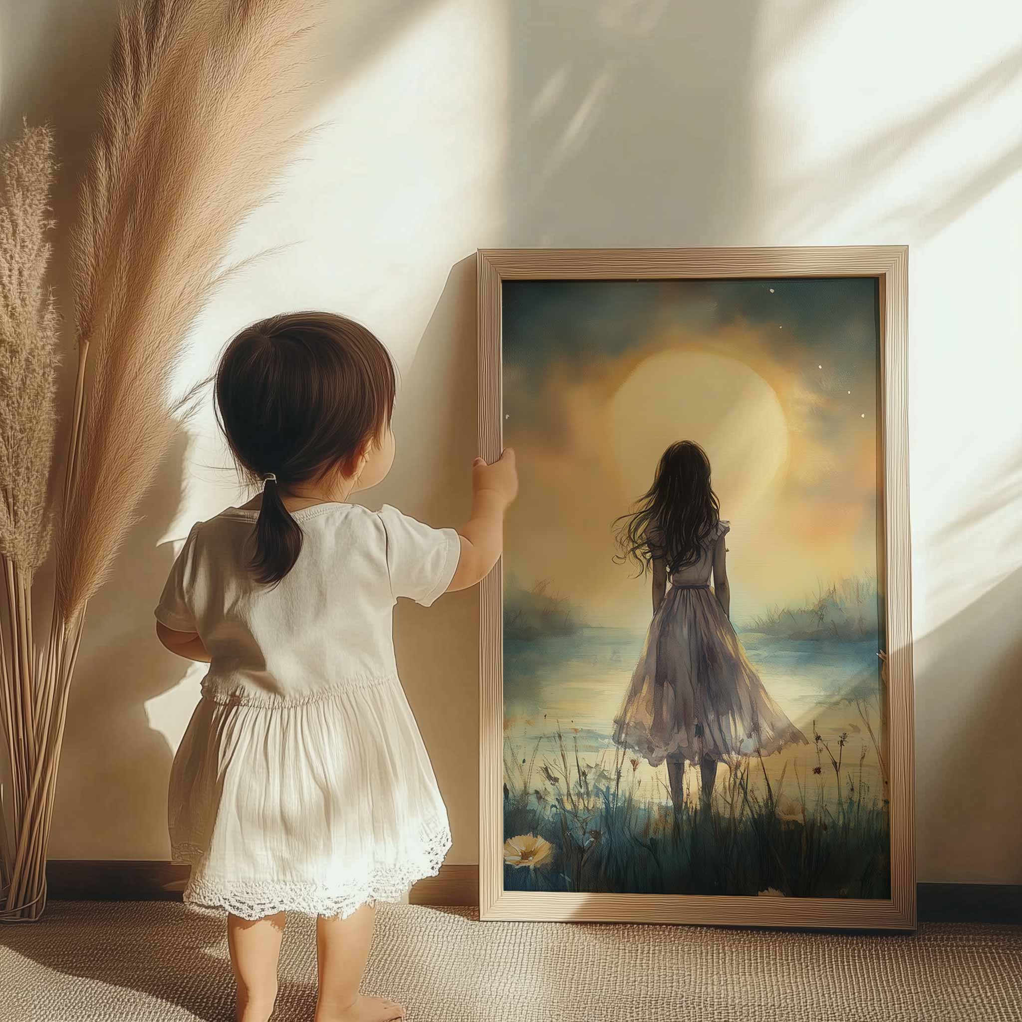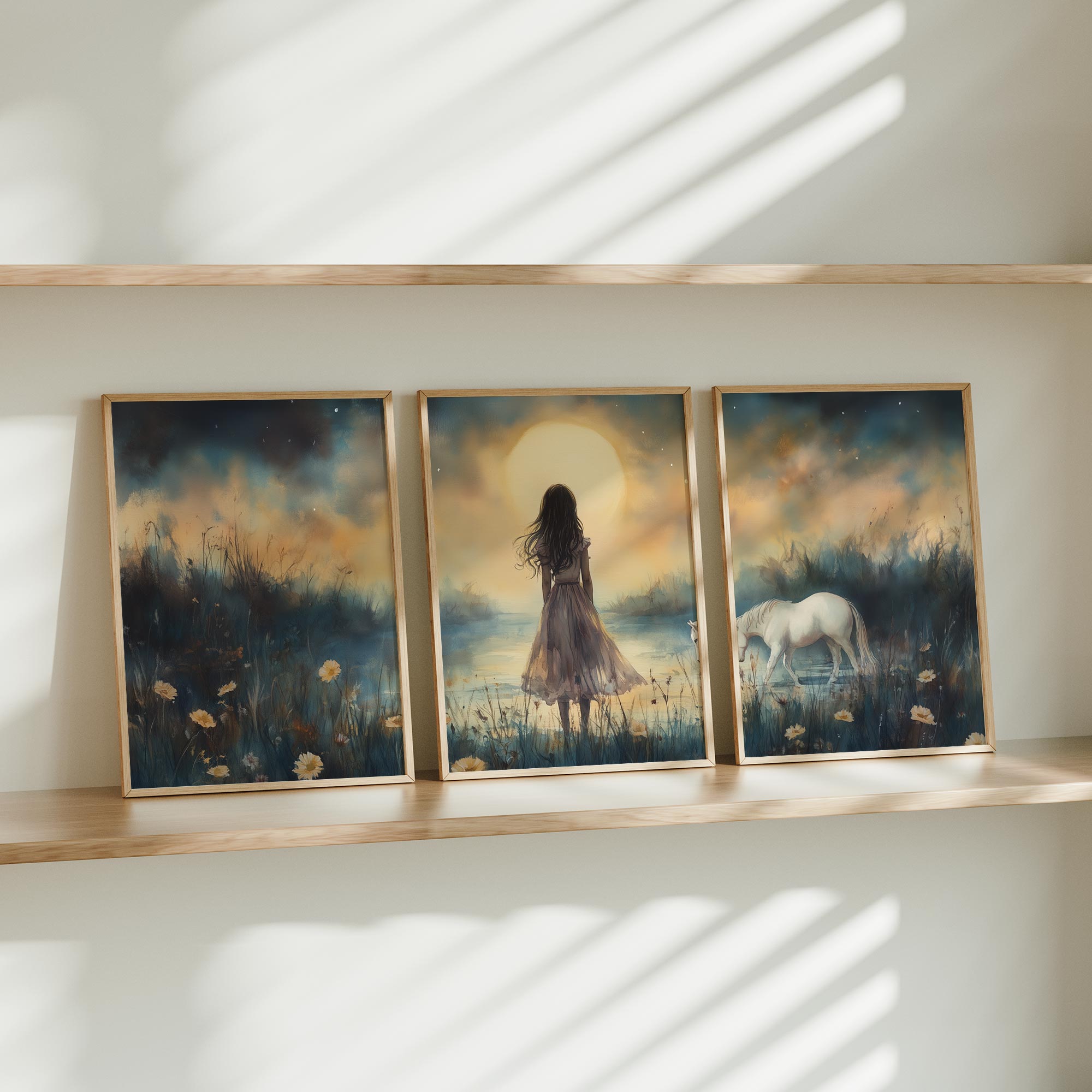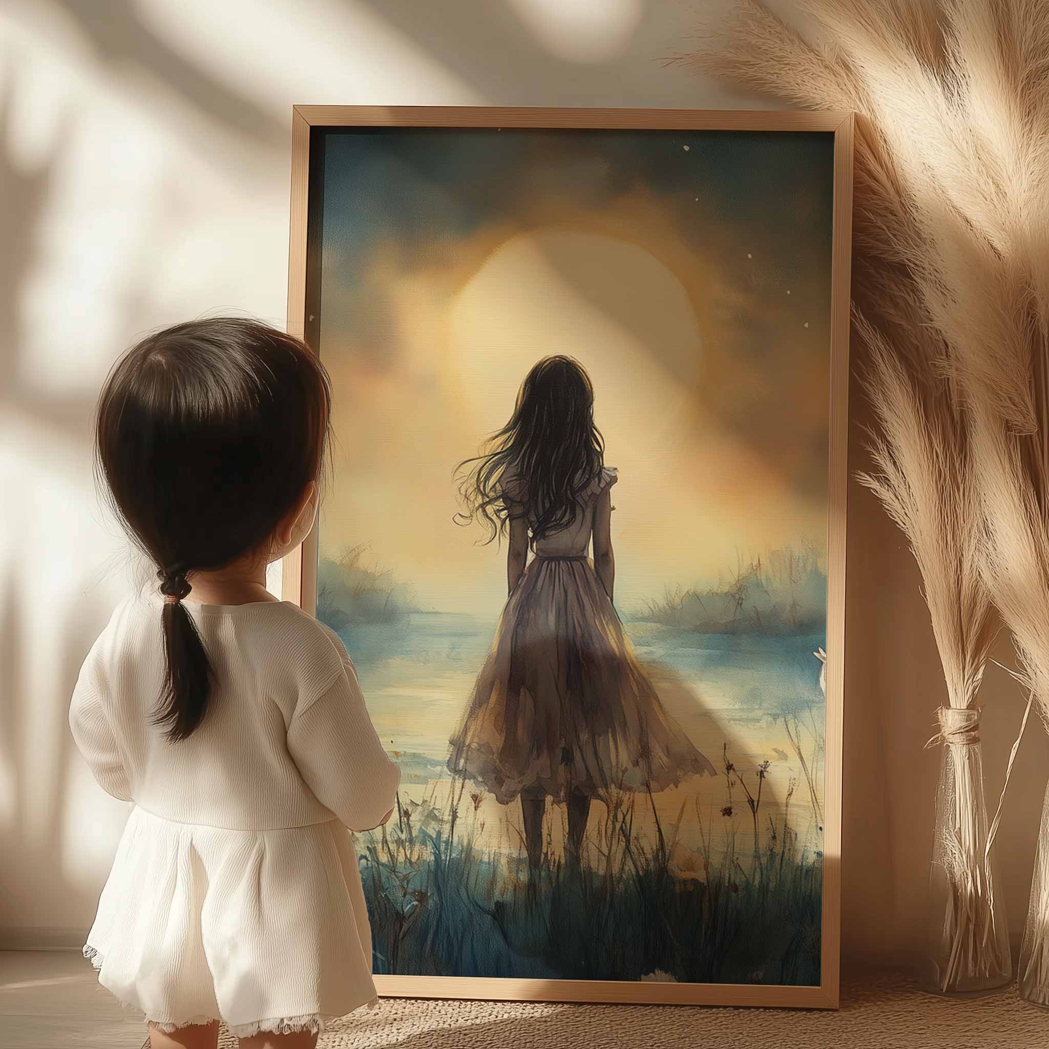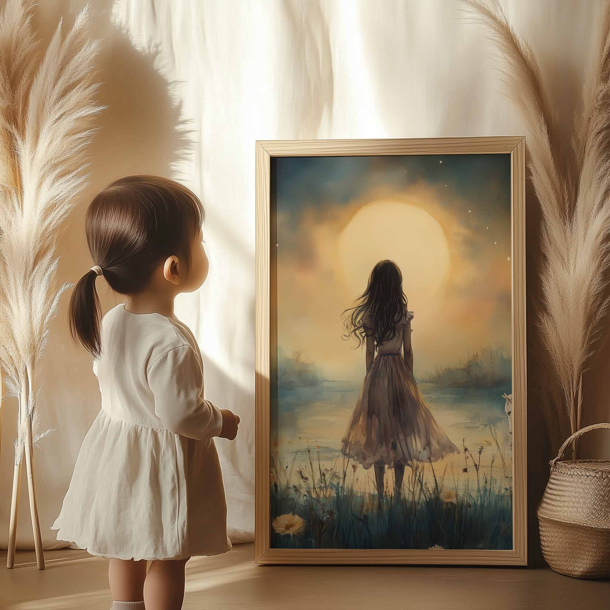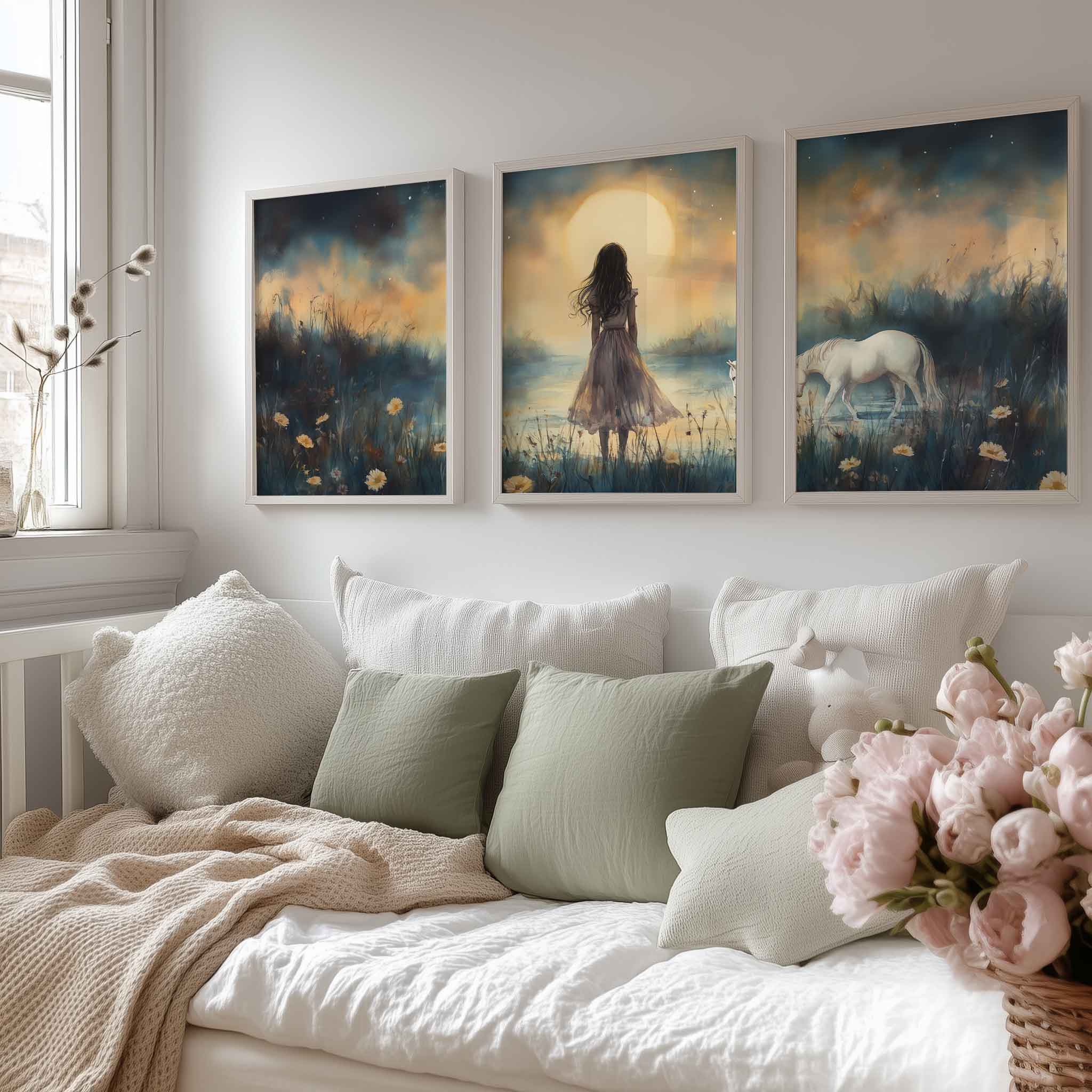 Terug naar collectie Posters Zacht Zonsondergang met Dame en Witte Paard