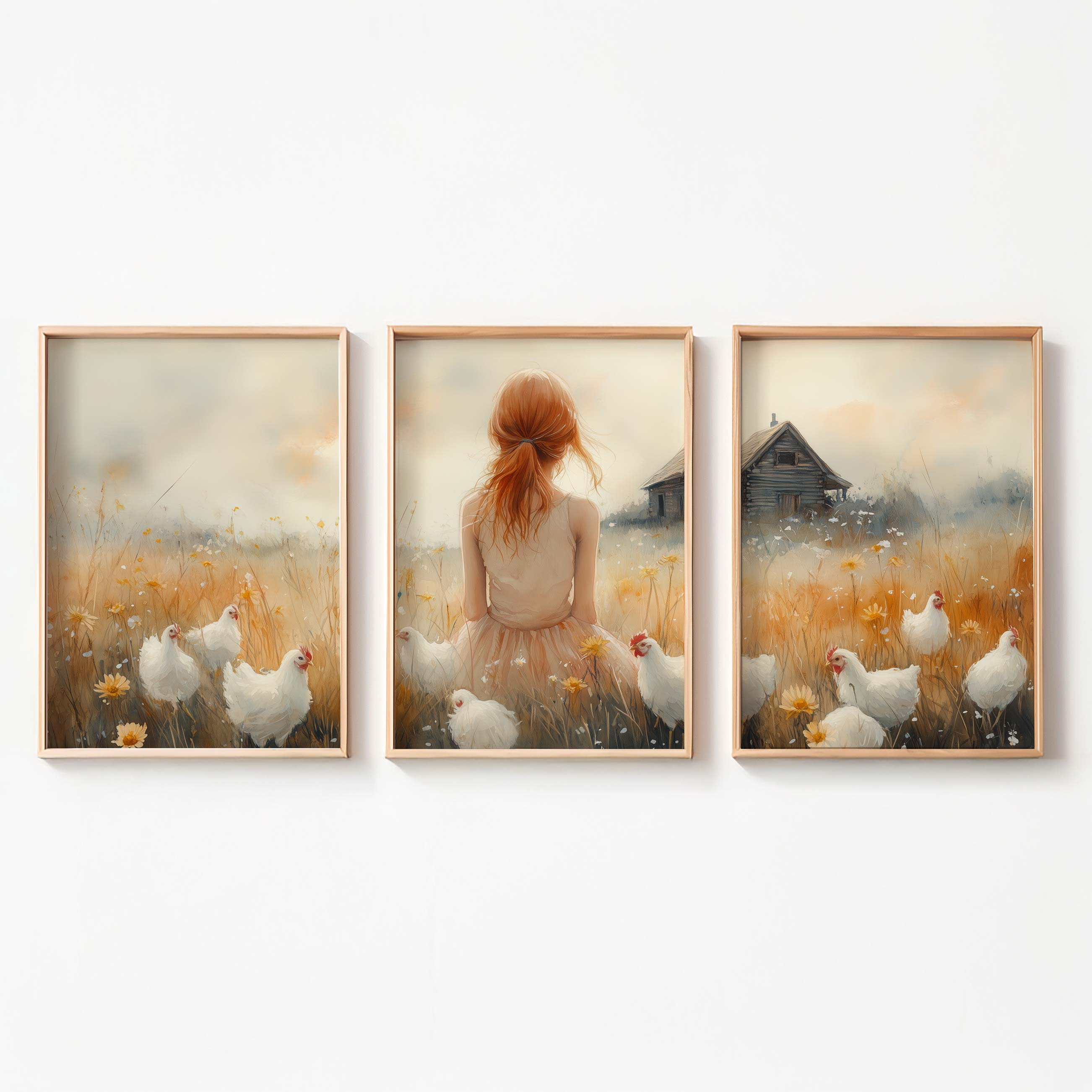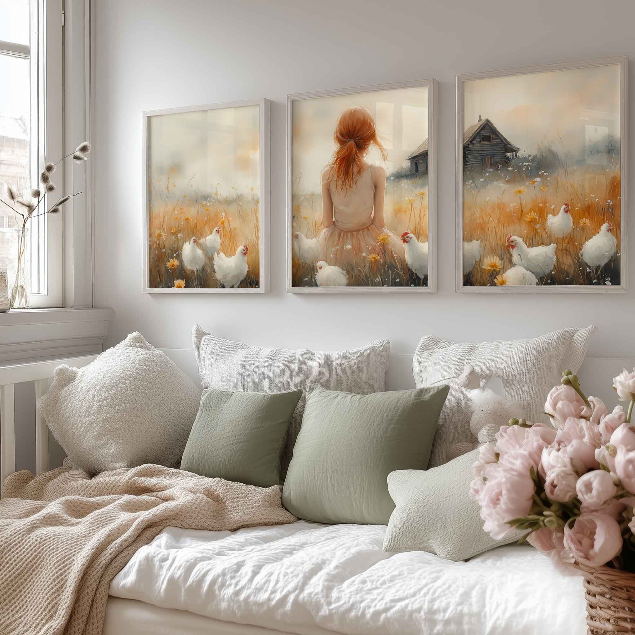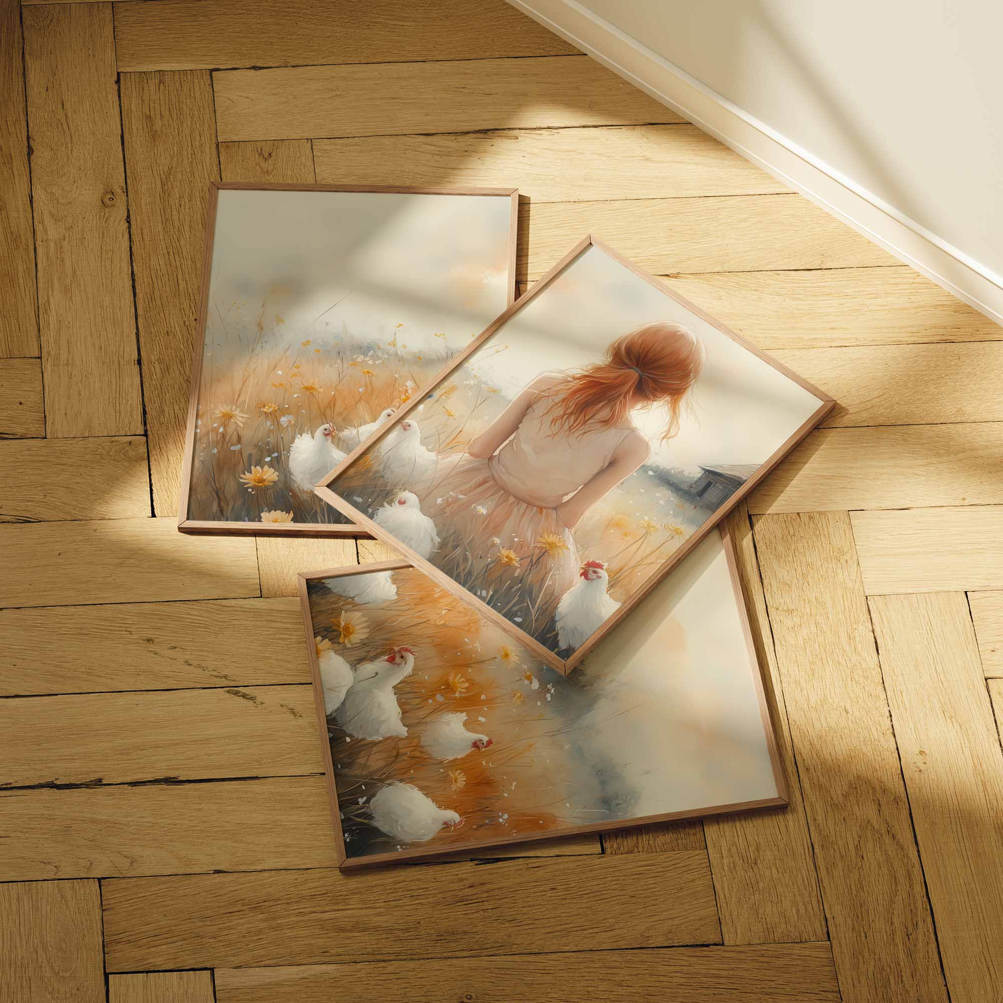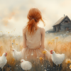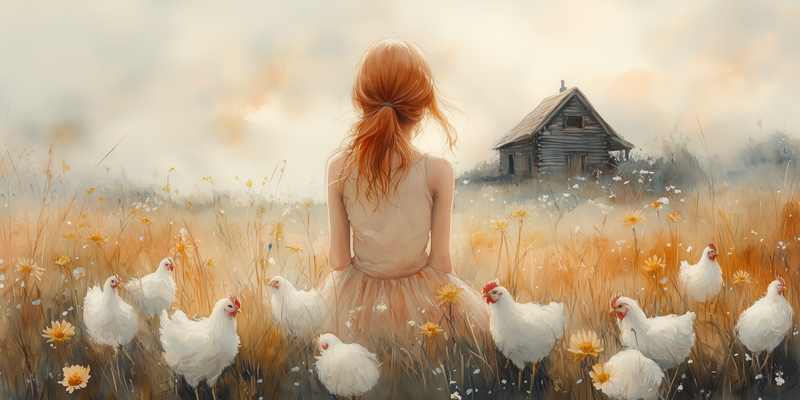 Zachte bloemenvelden met speelse kippen