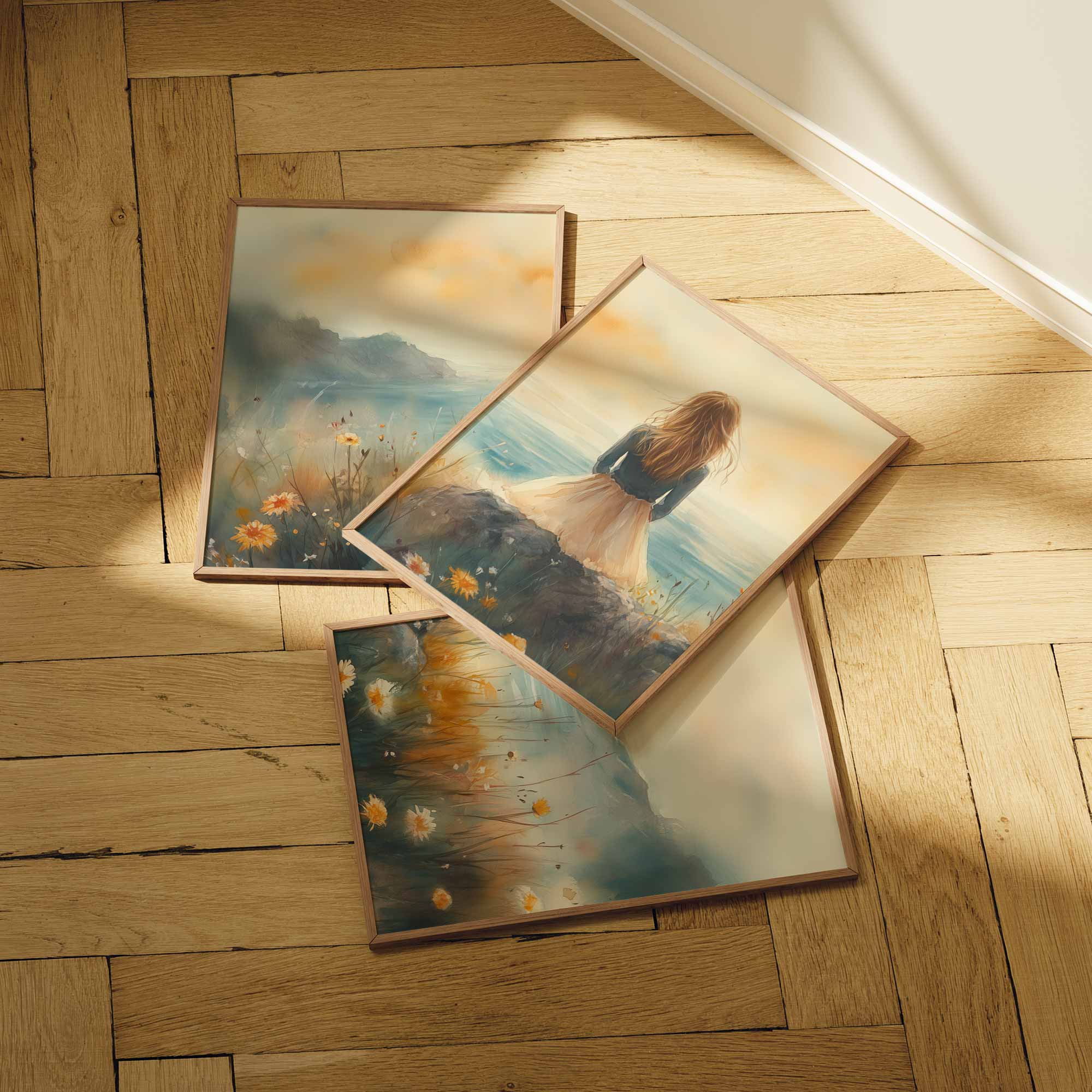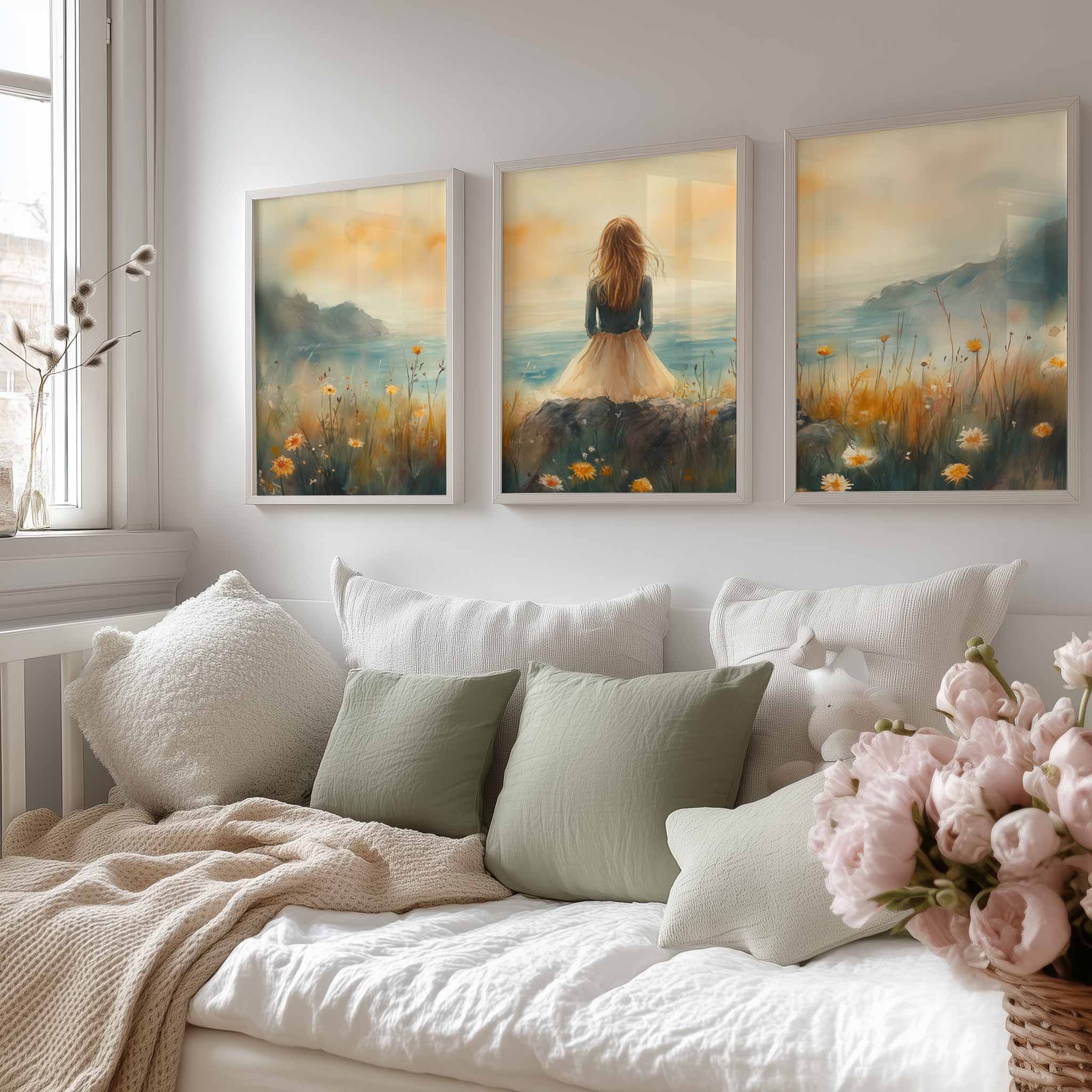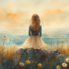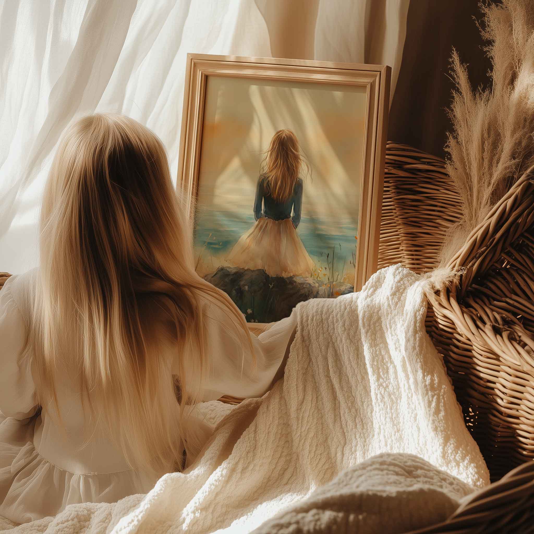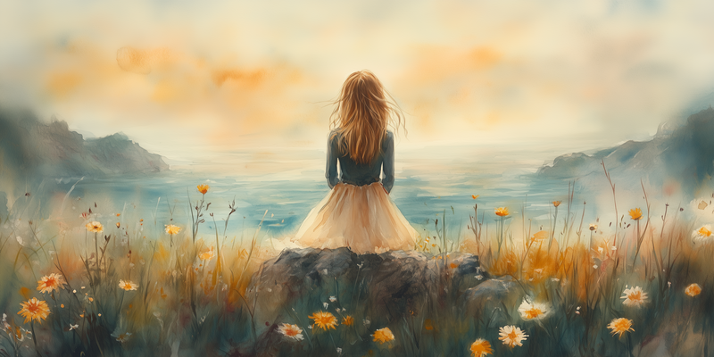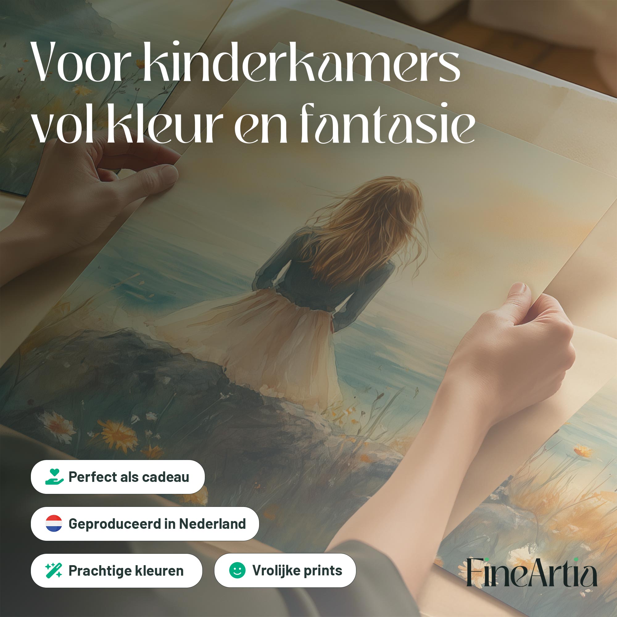 Zachte Dromen aan Zee: Vrouw tussen Bloemen en Golven