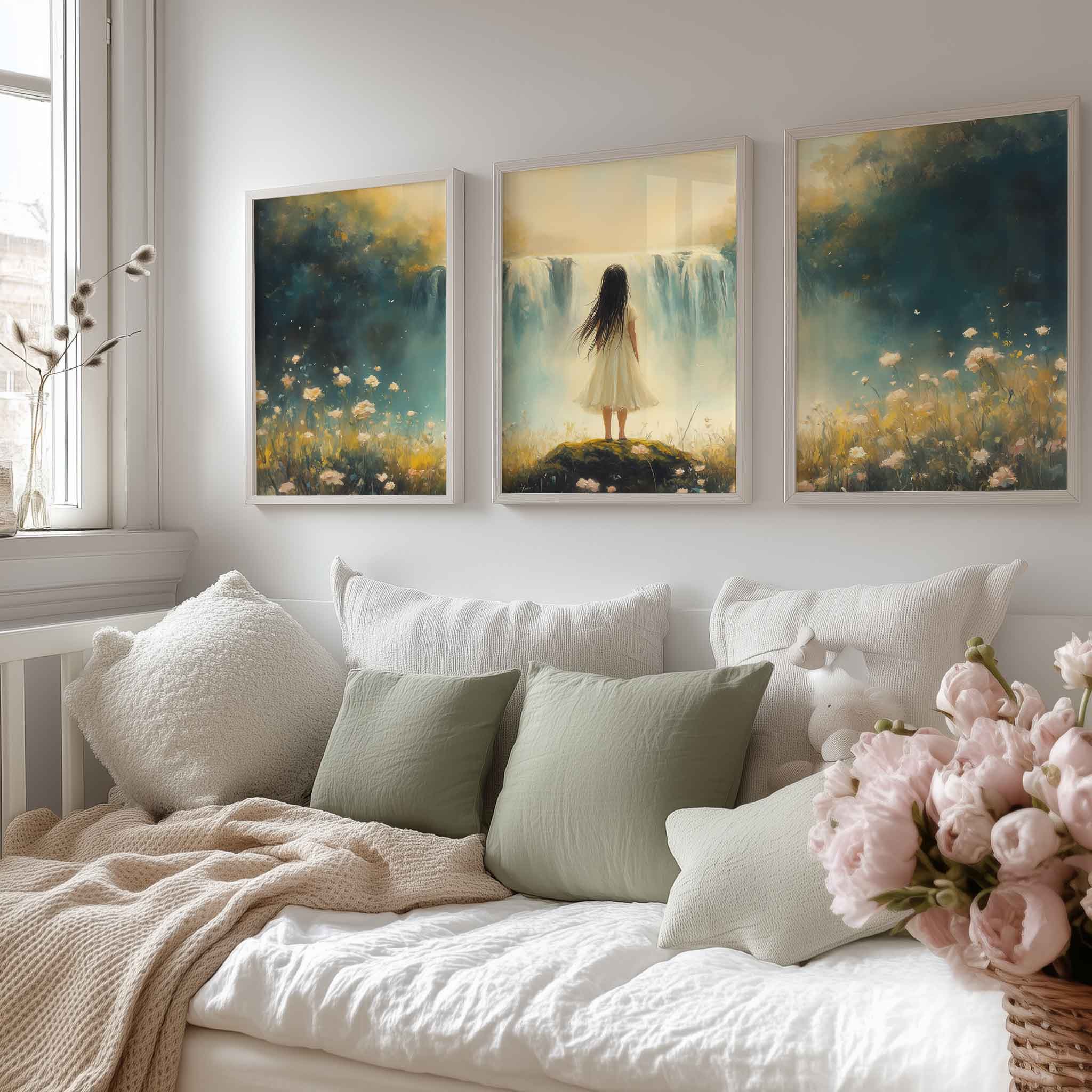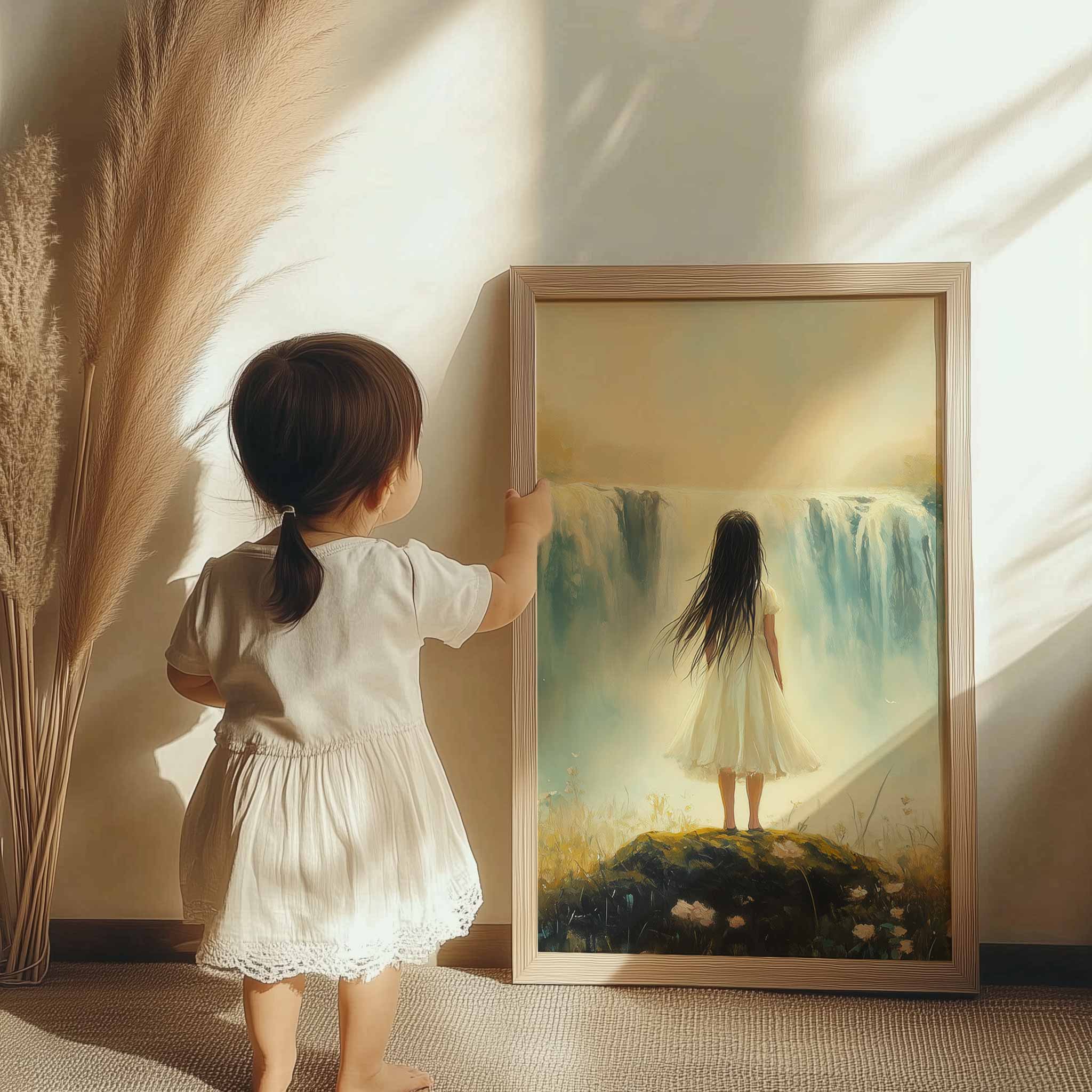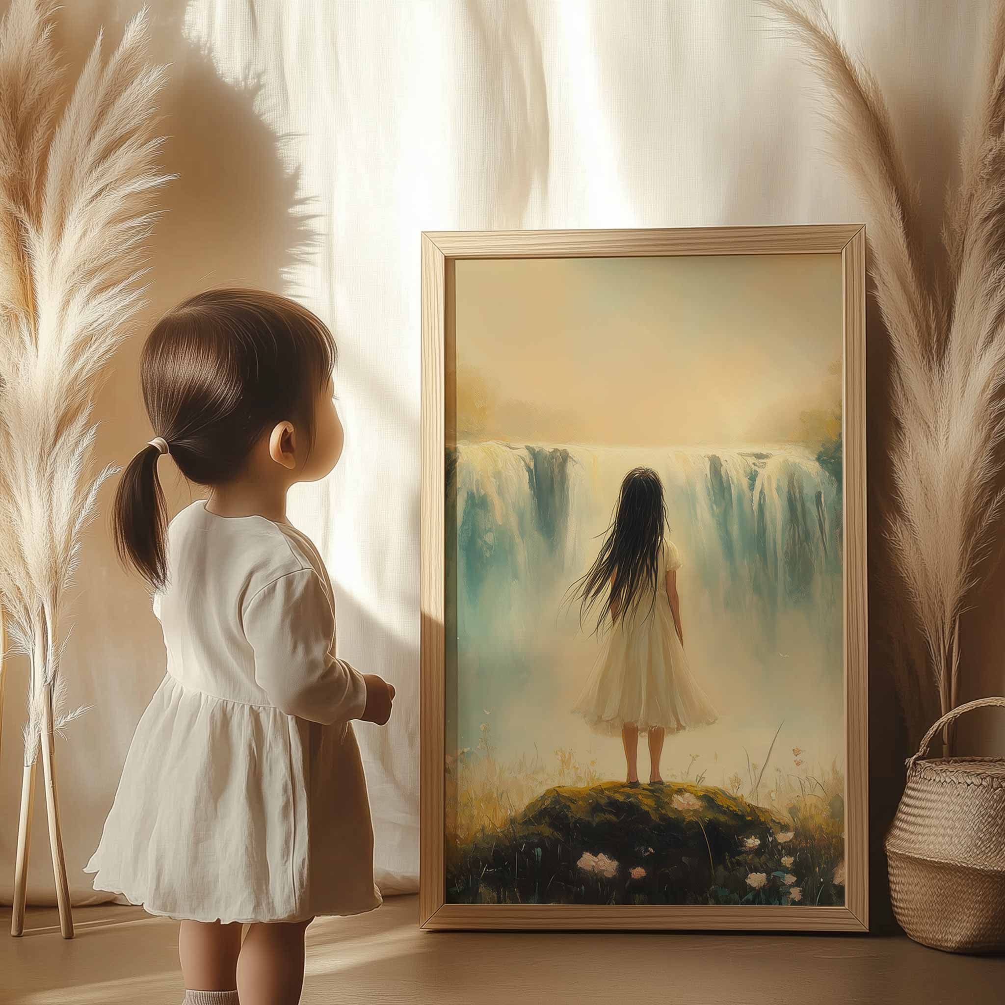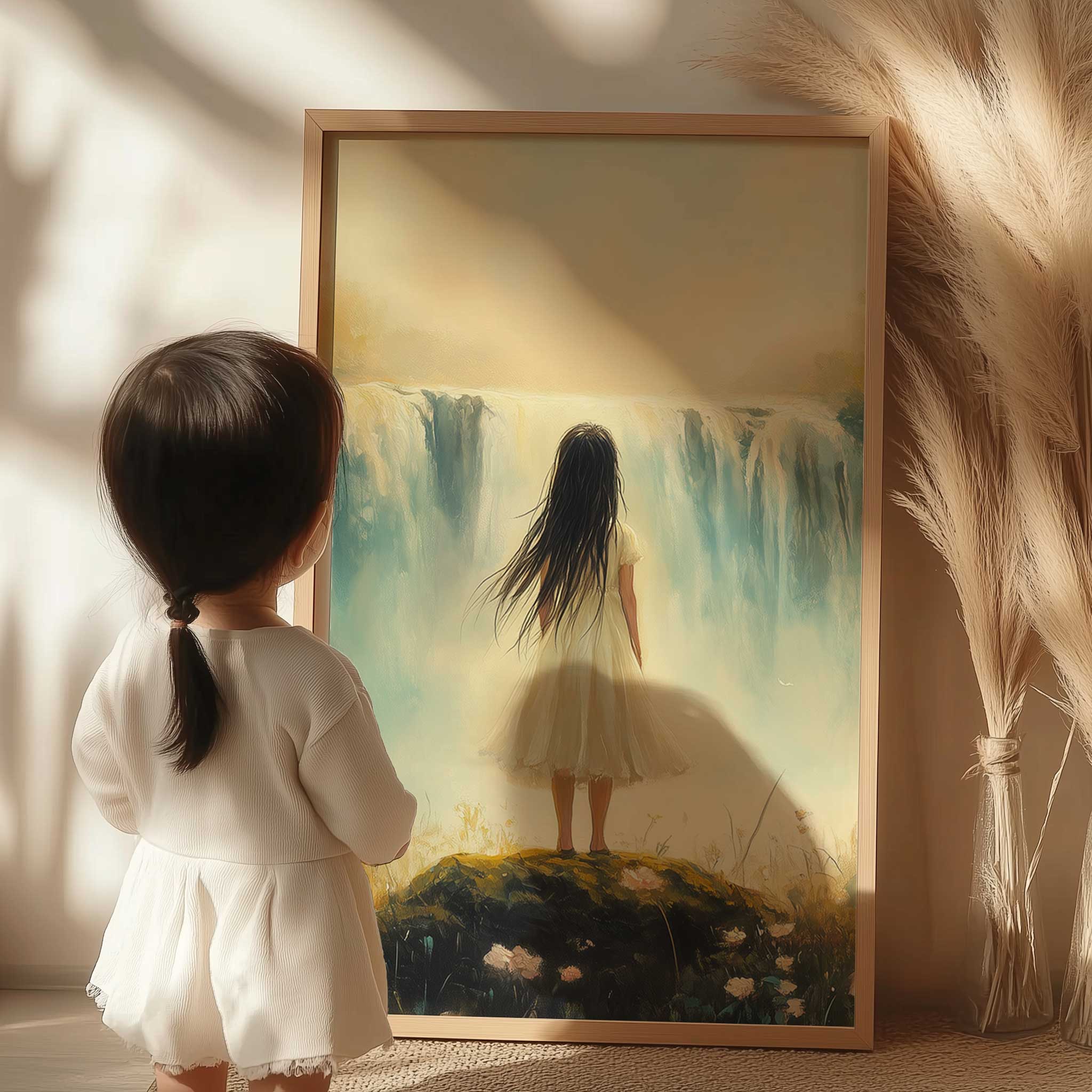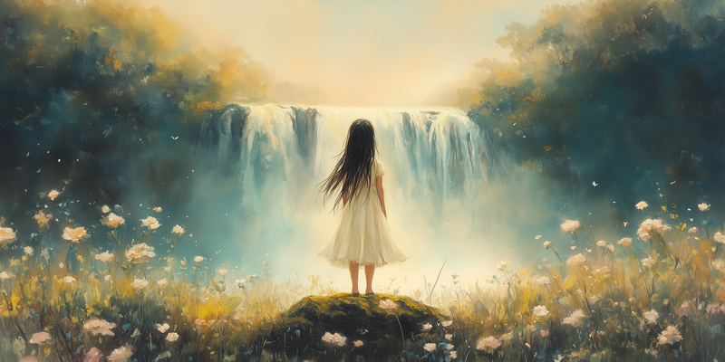 Zachte Dromen: Meisje bij Waterval in Bloemenveld