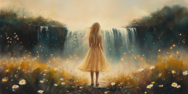 Zachte Dromen: Vrouw bij Waterval en Bloemenveld