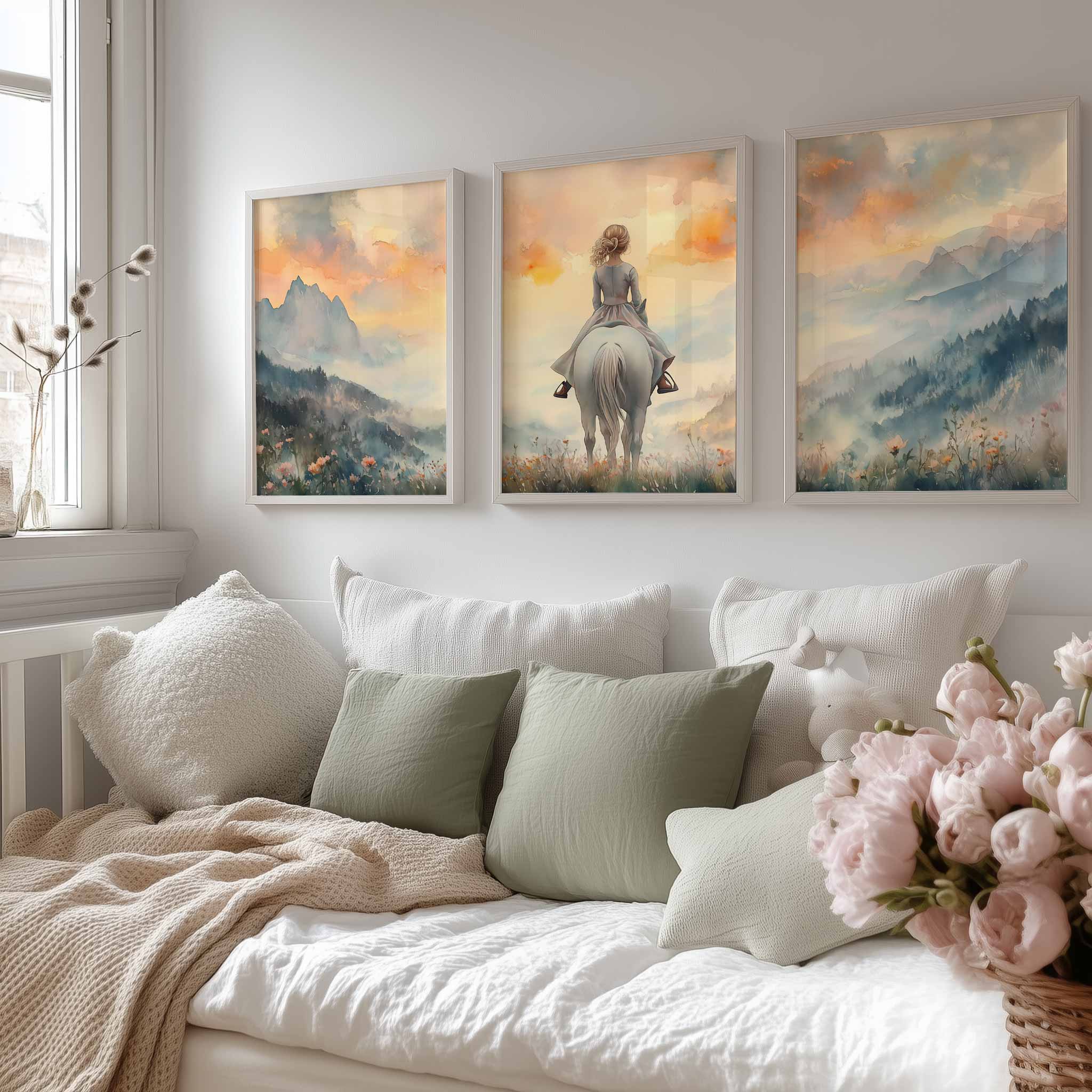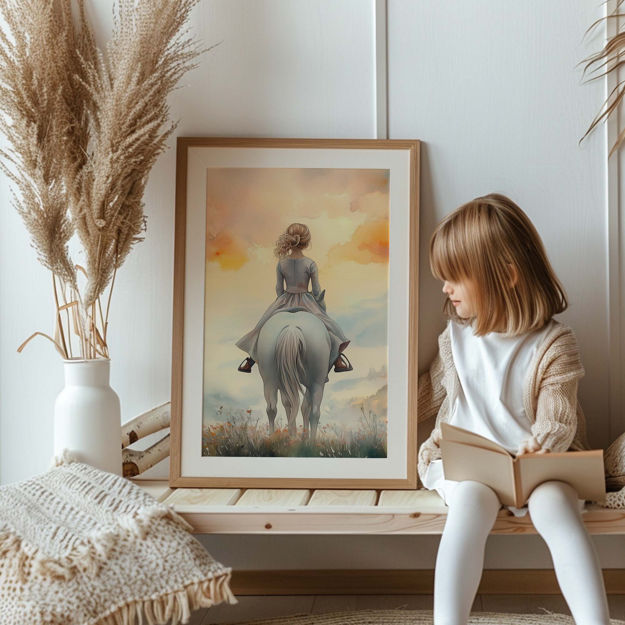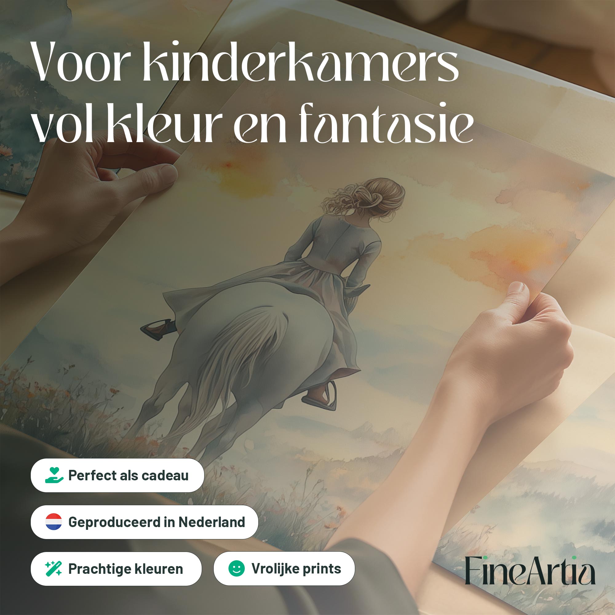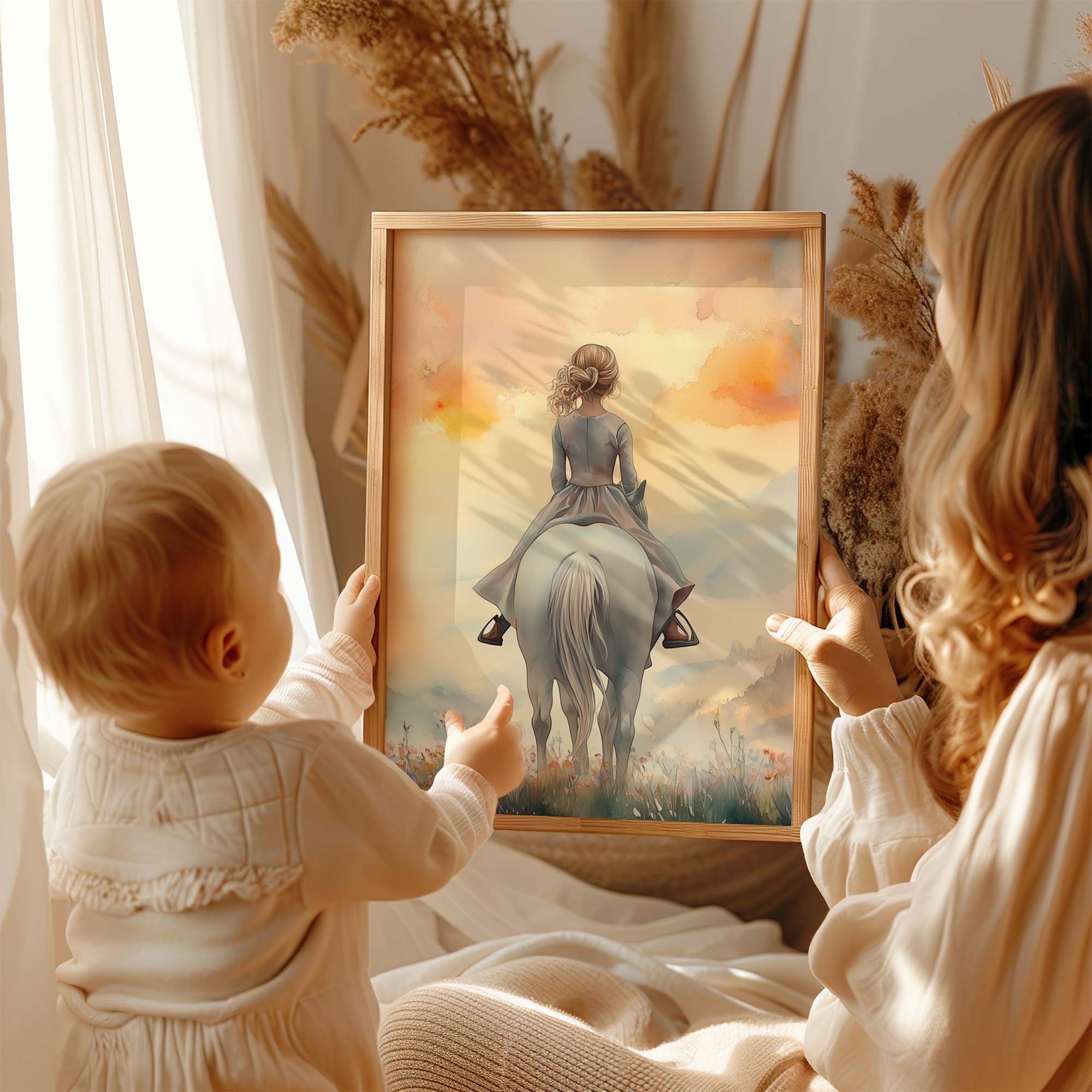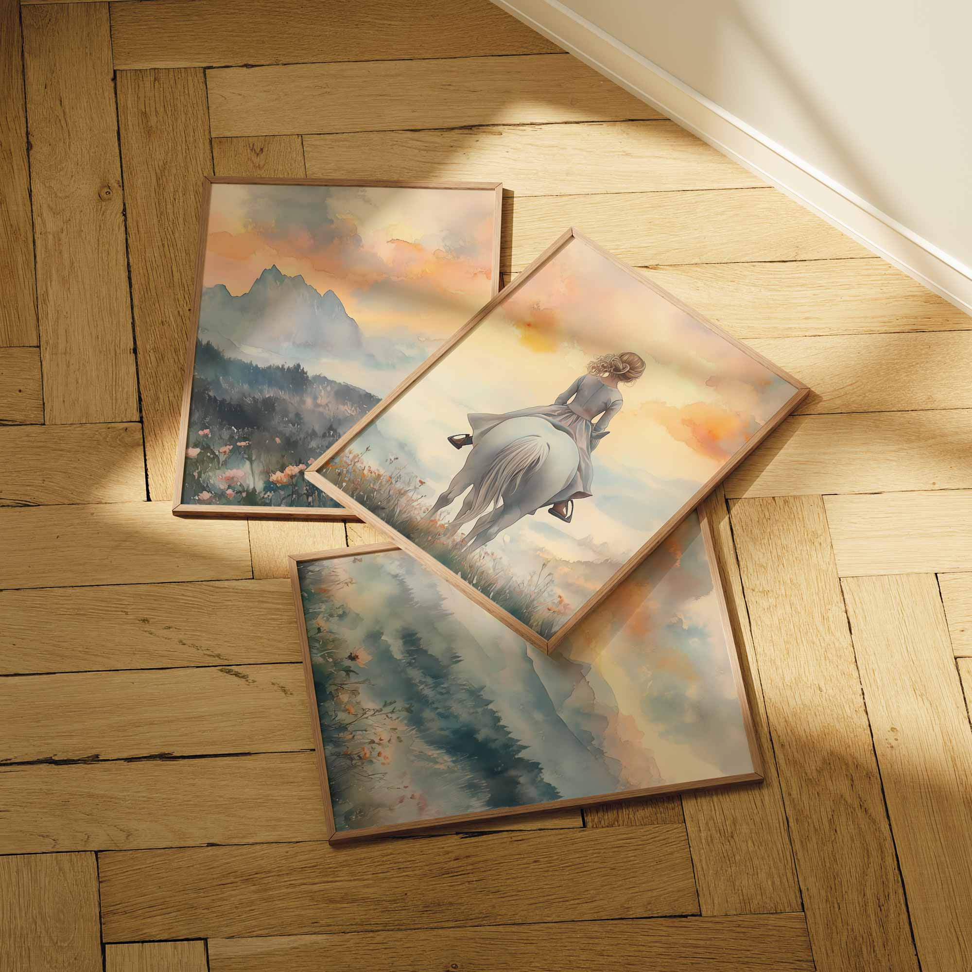 Terug naar collectie Posters Zachte dromen: Vrouw te paard in betoverend landschap