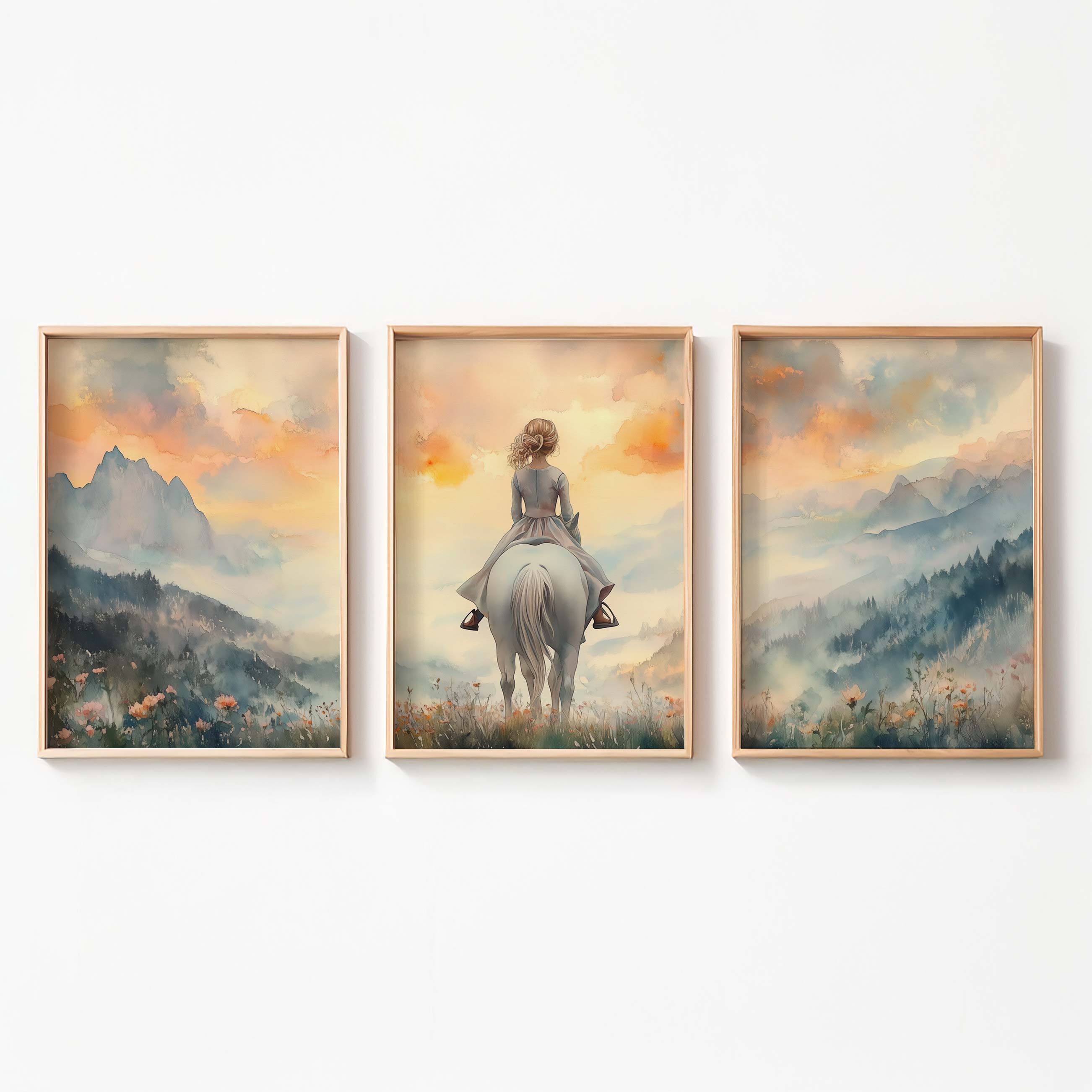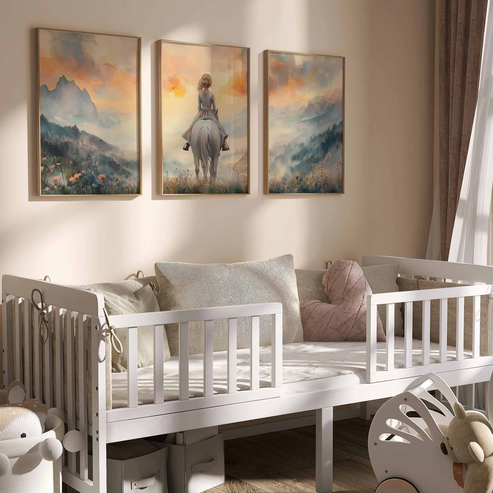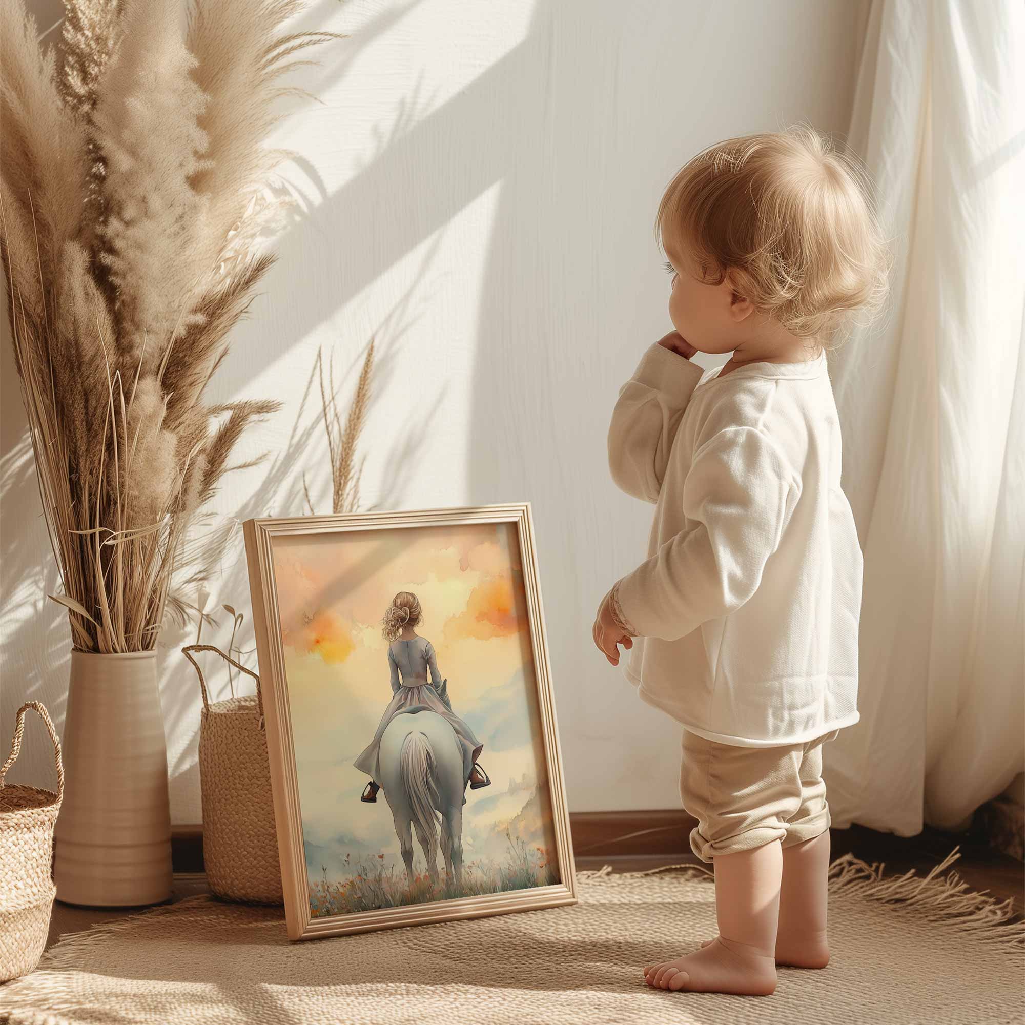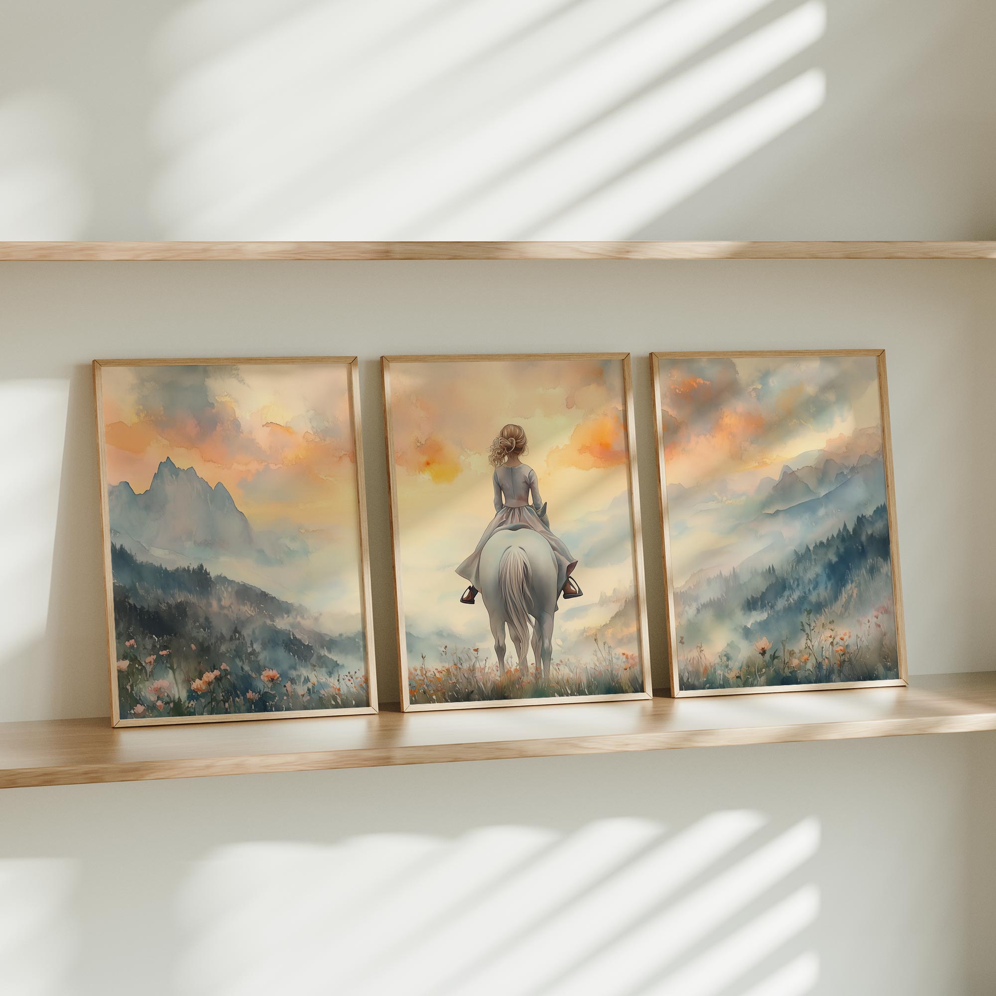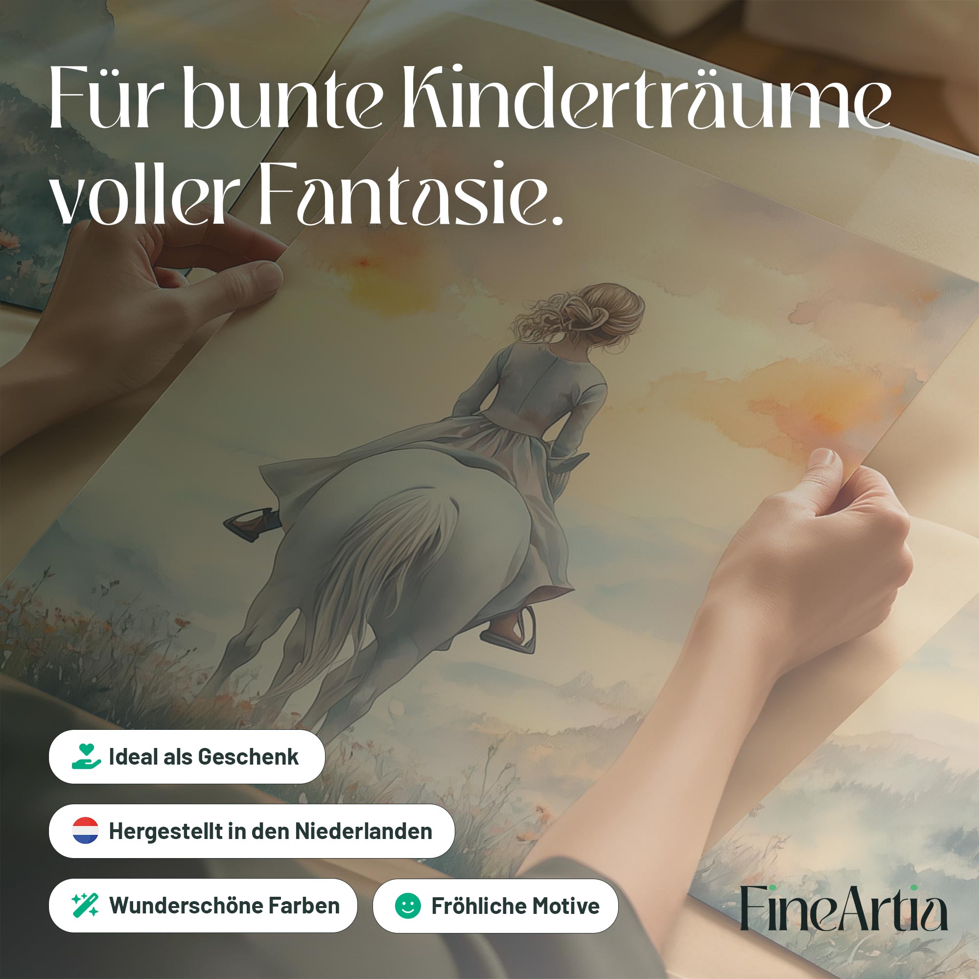 Terug naar collectie Posters Zachte dromen: Vrouw te paard in betoverend landschap