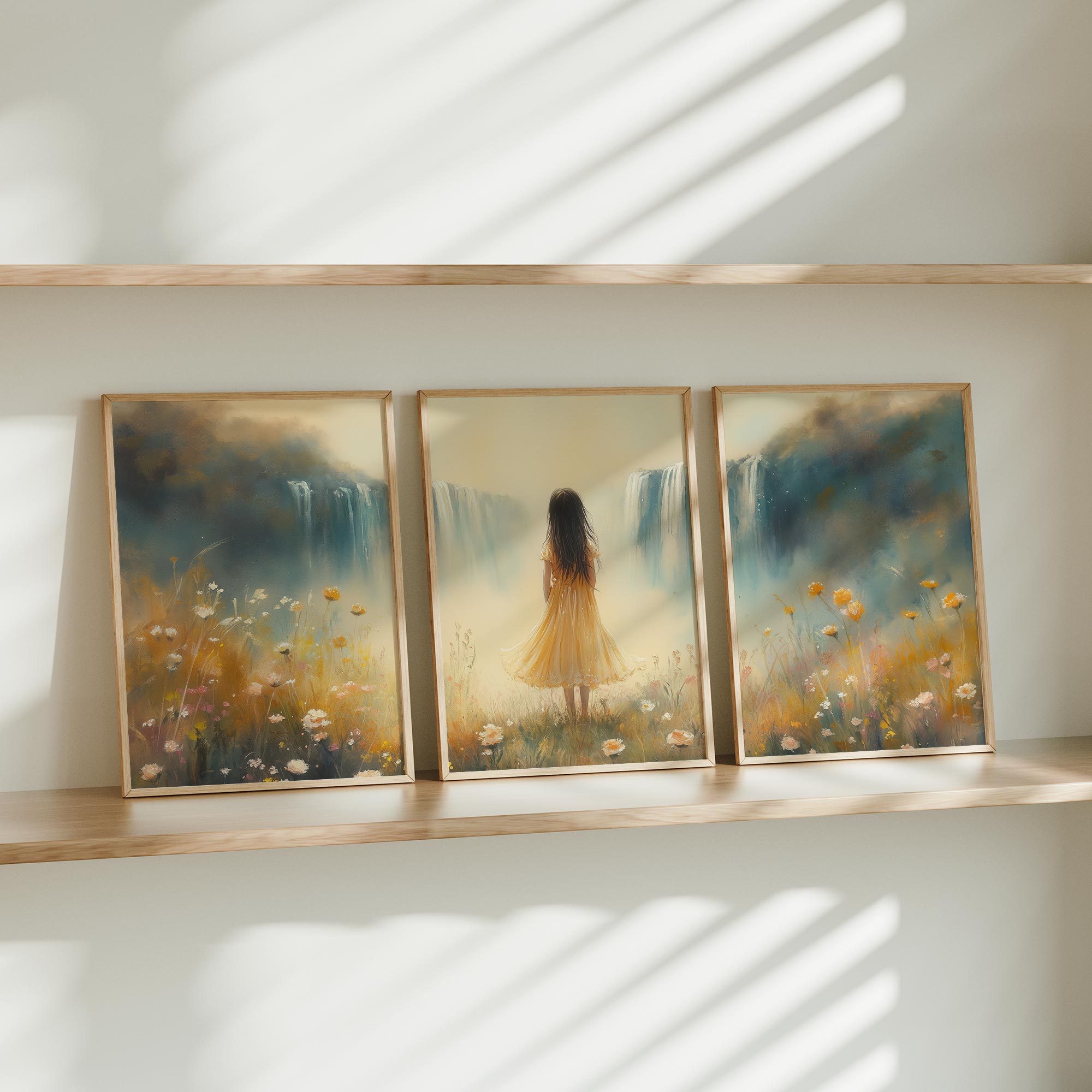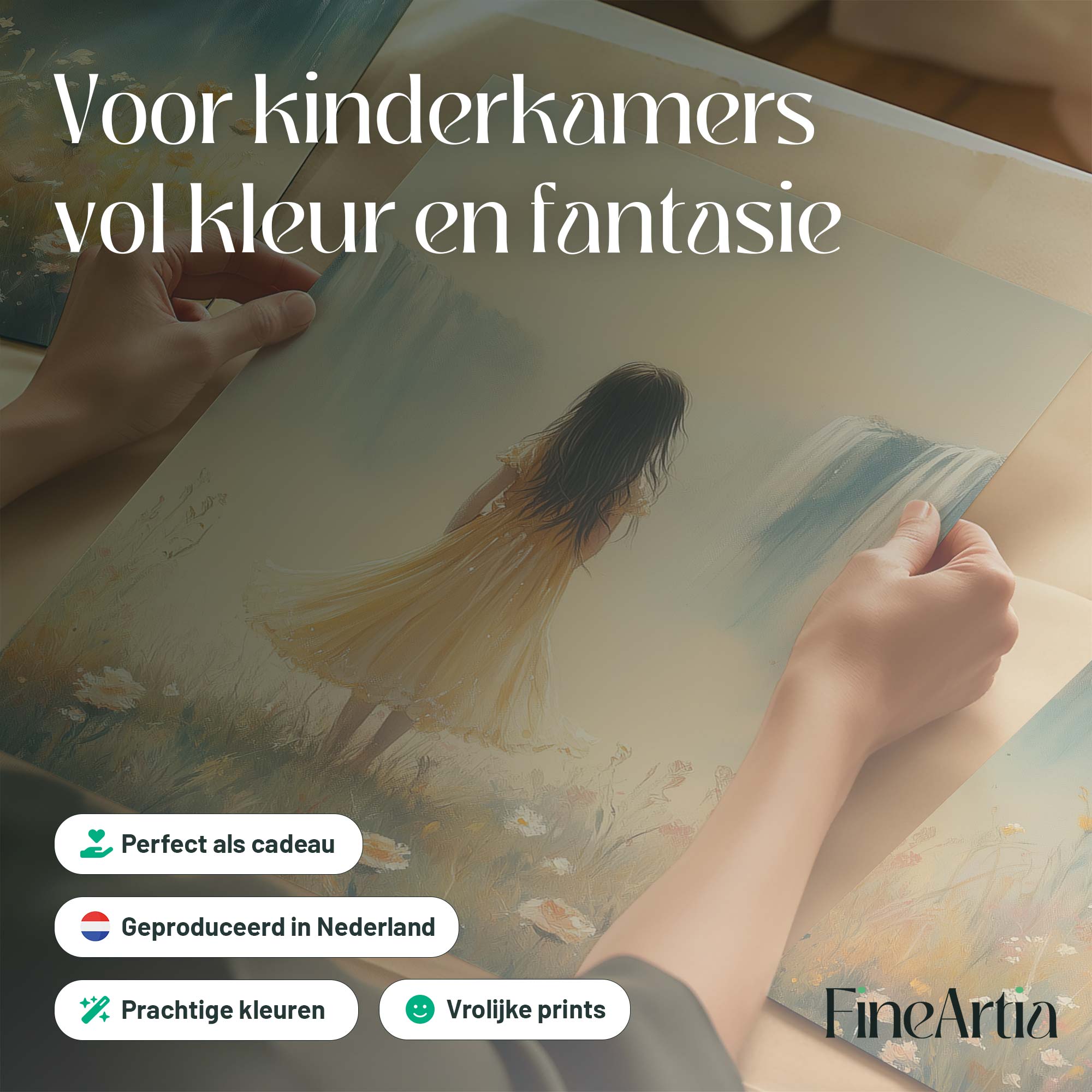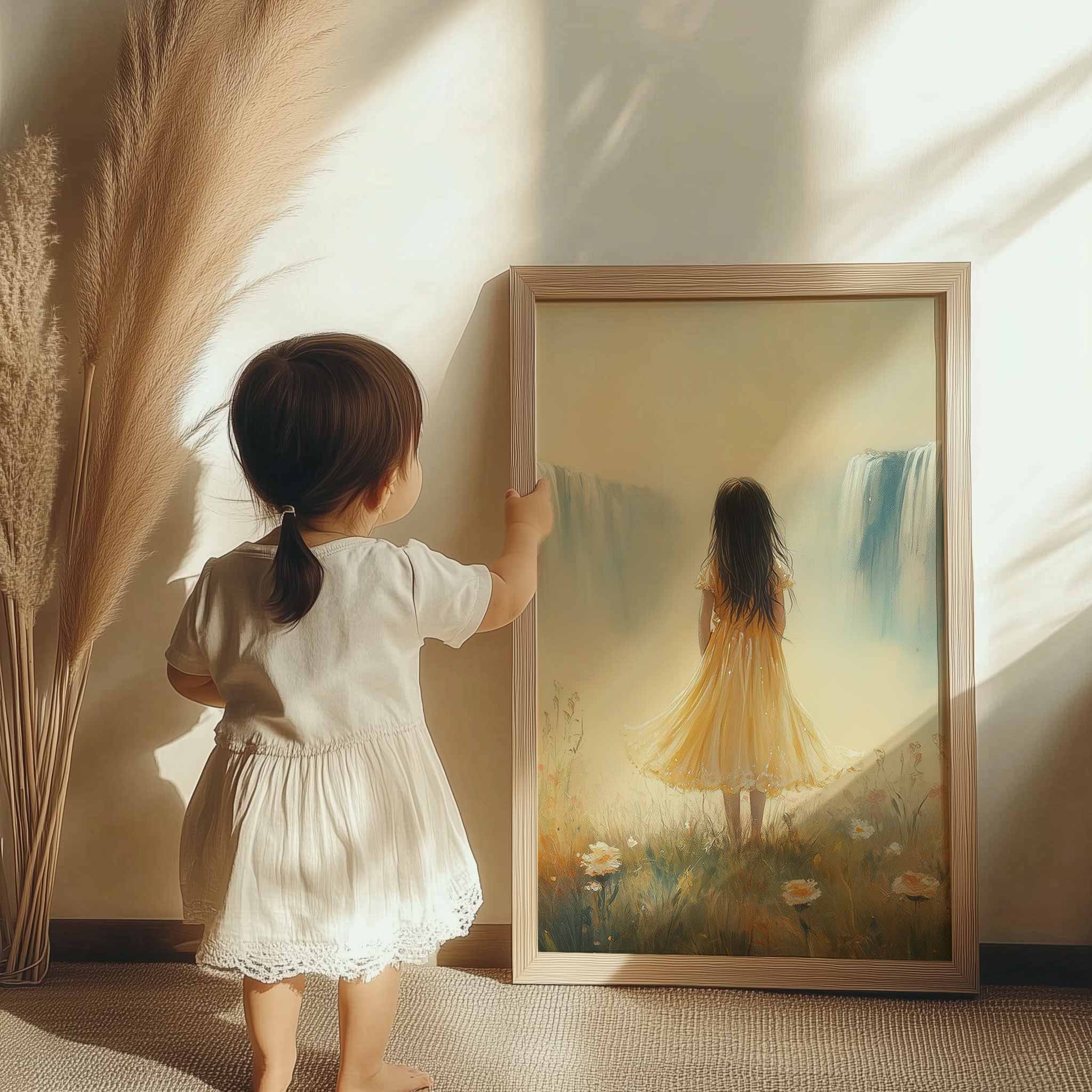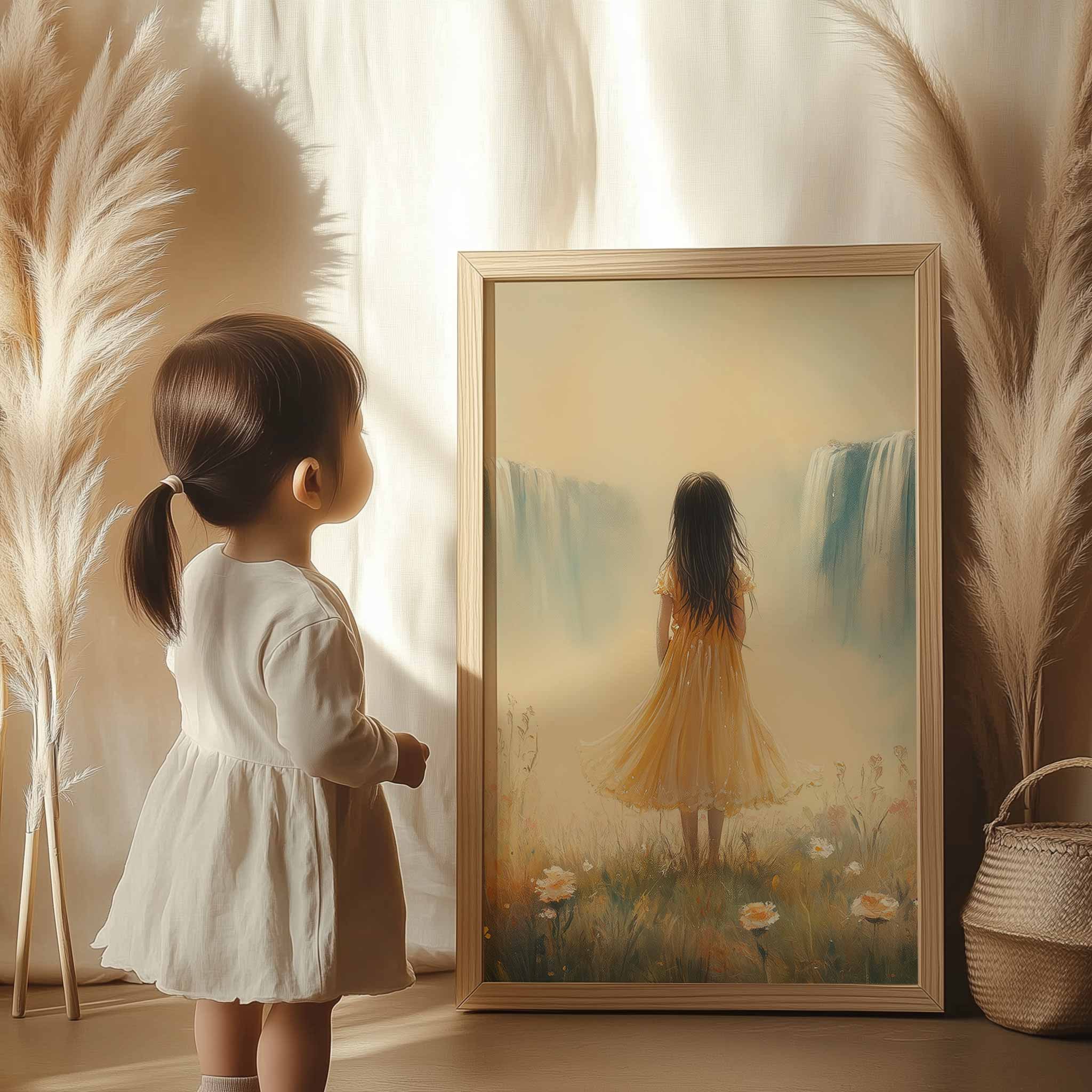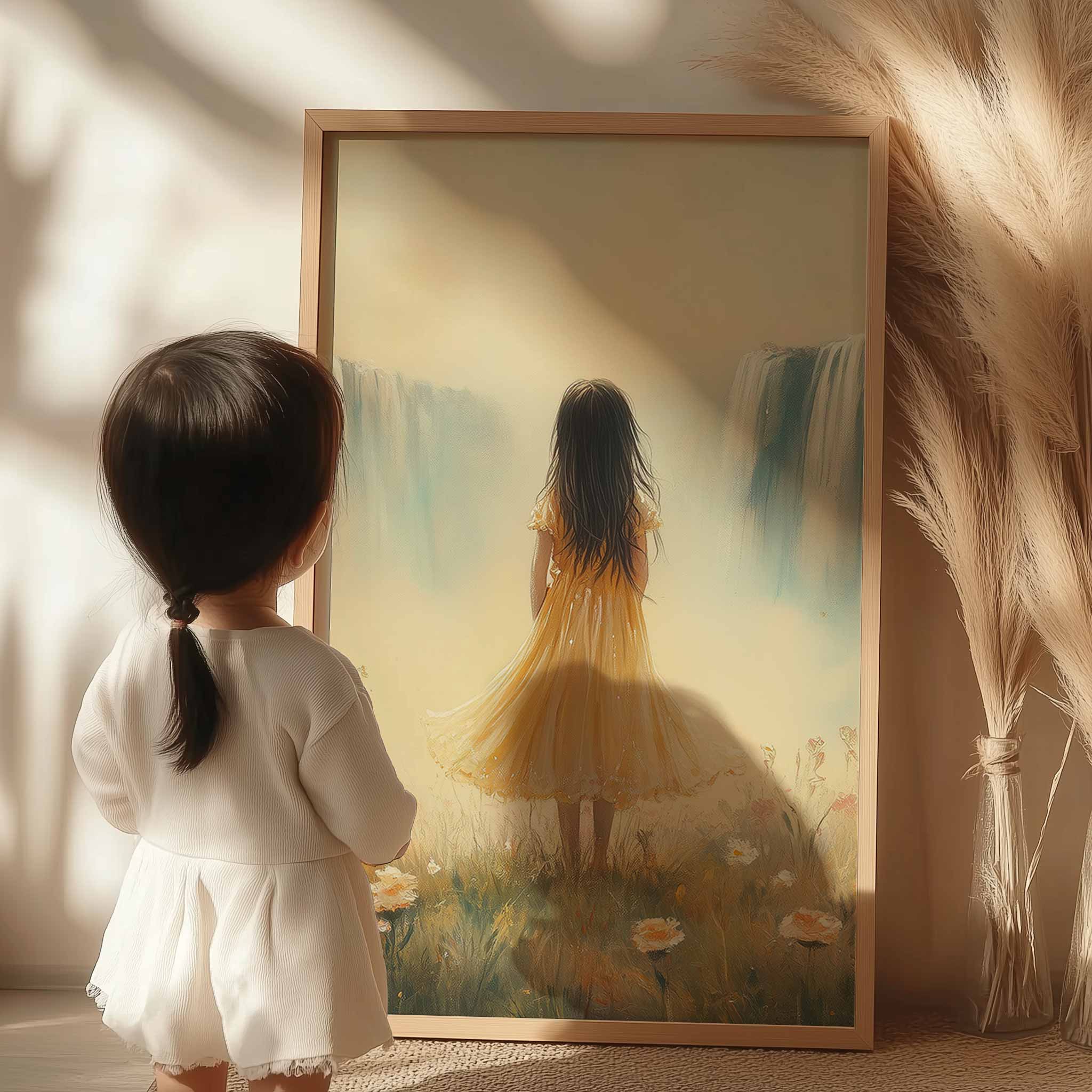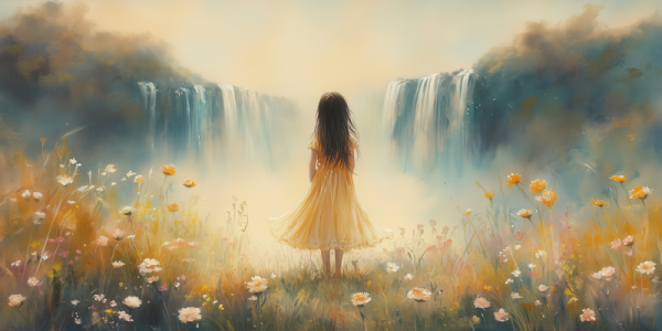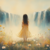 Zachtgeel Meisje bij Betoverende Waterval en Bloemenveld