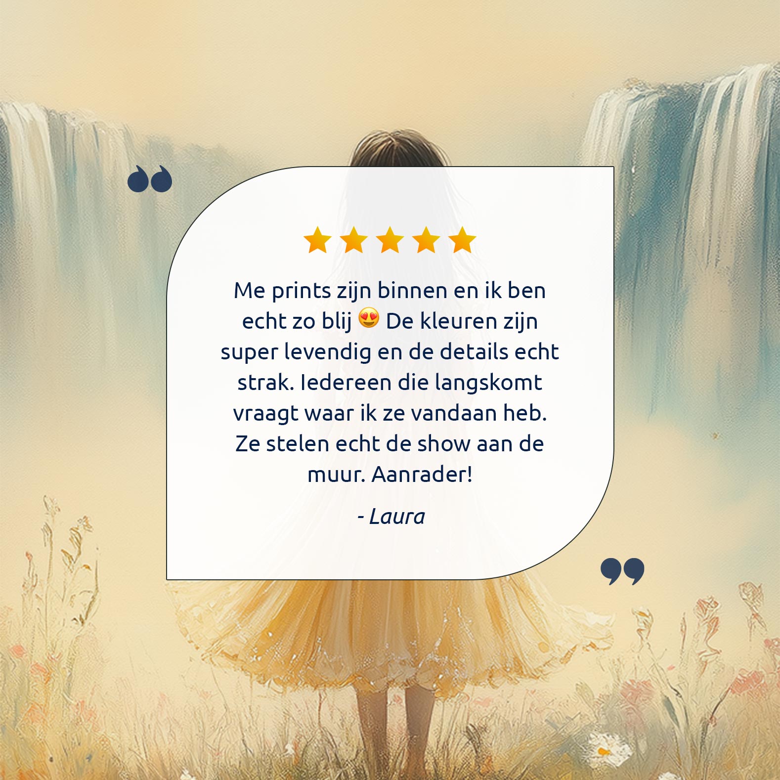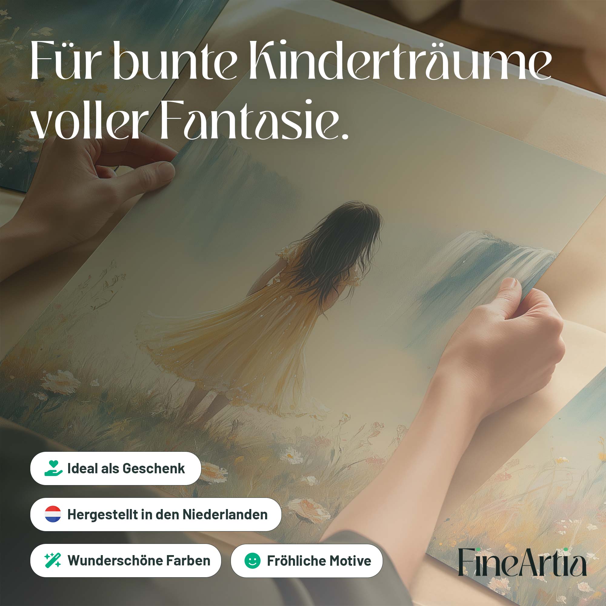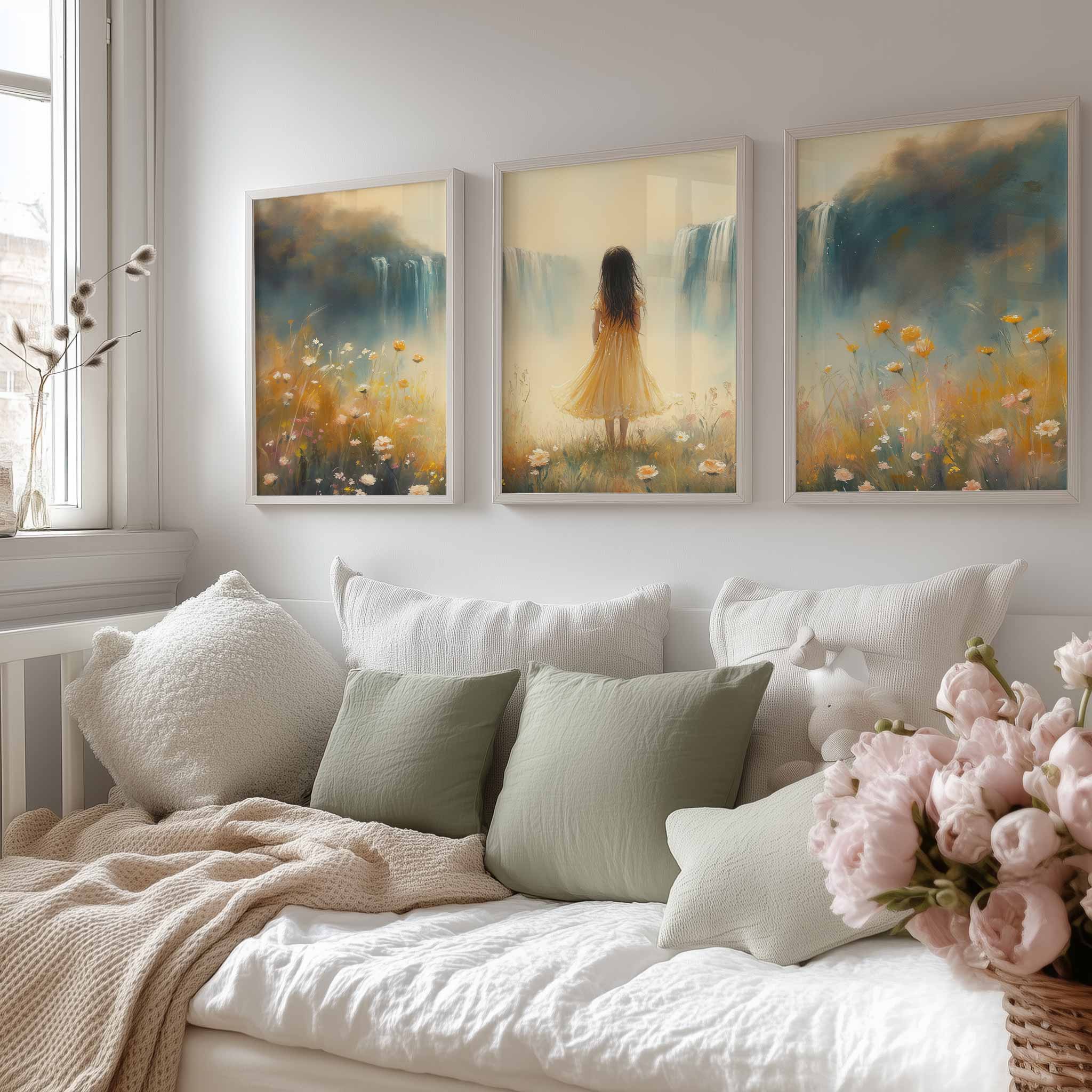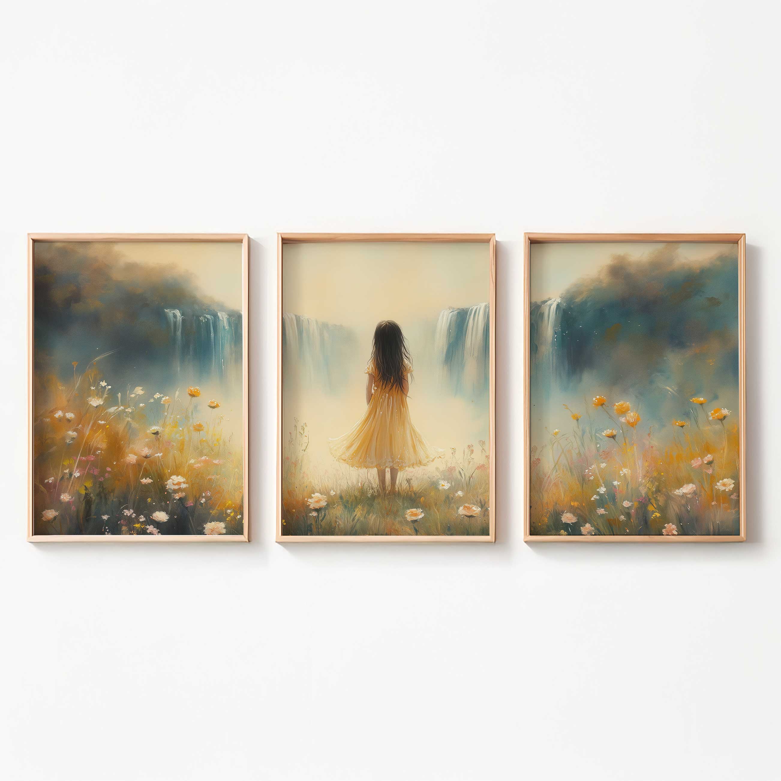 Zachtgeel Meisje bij Betoverende Waterval en Bloemenveld