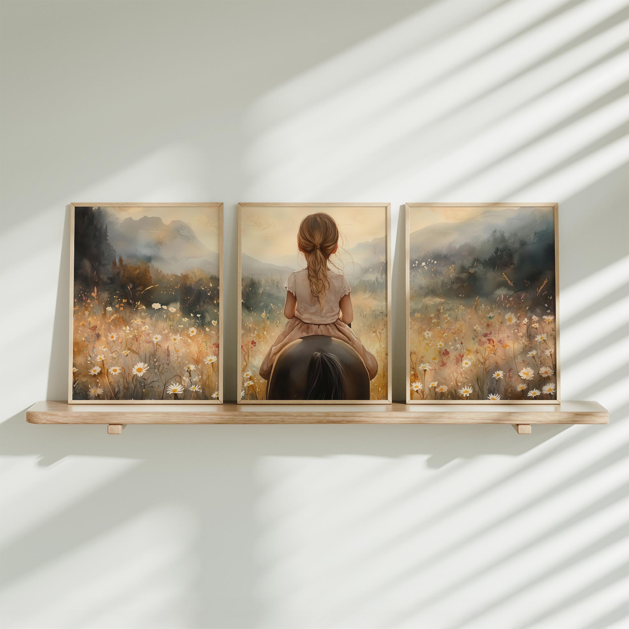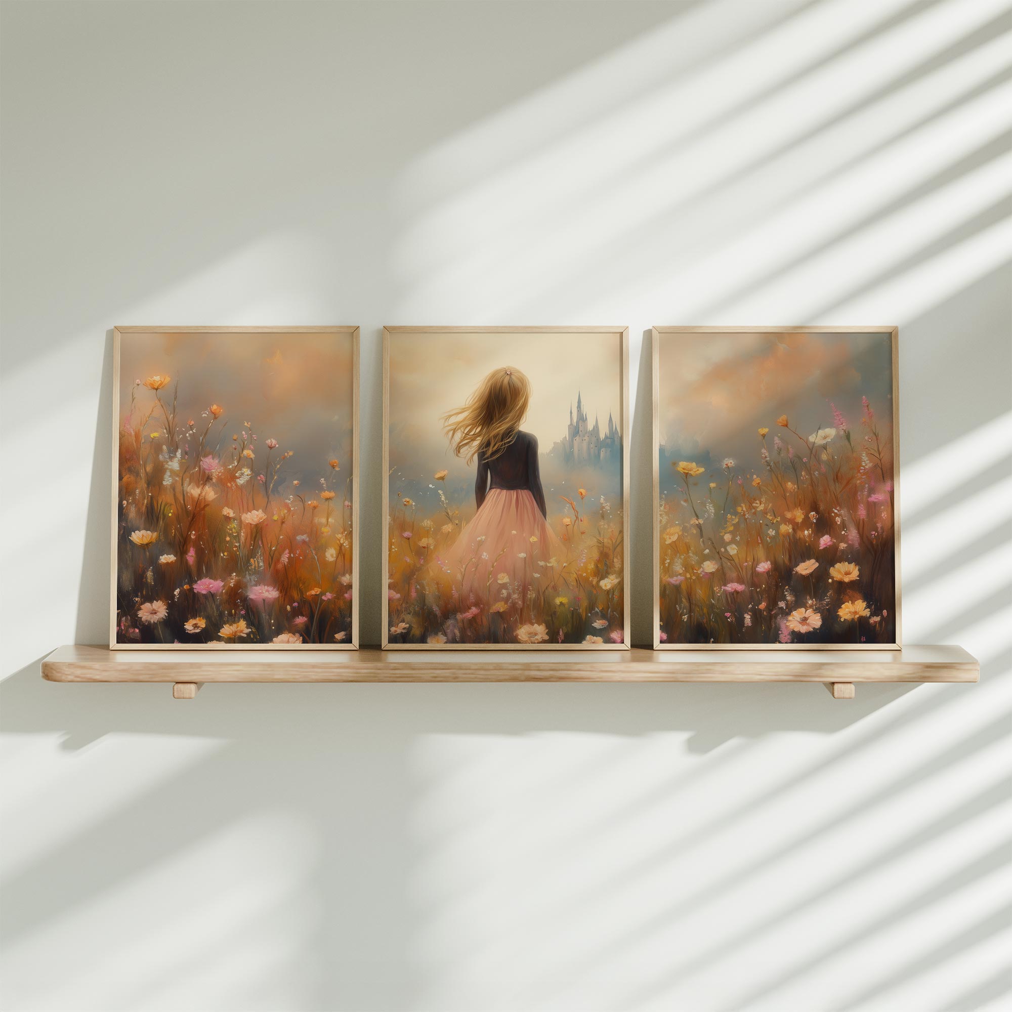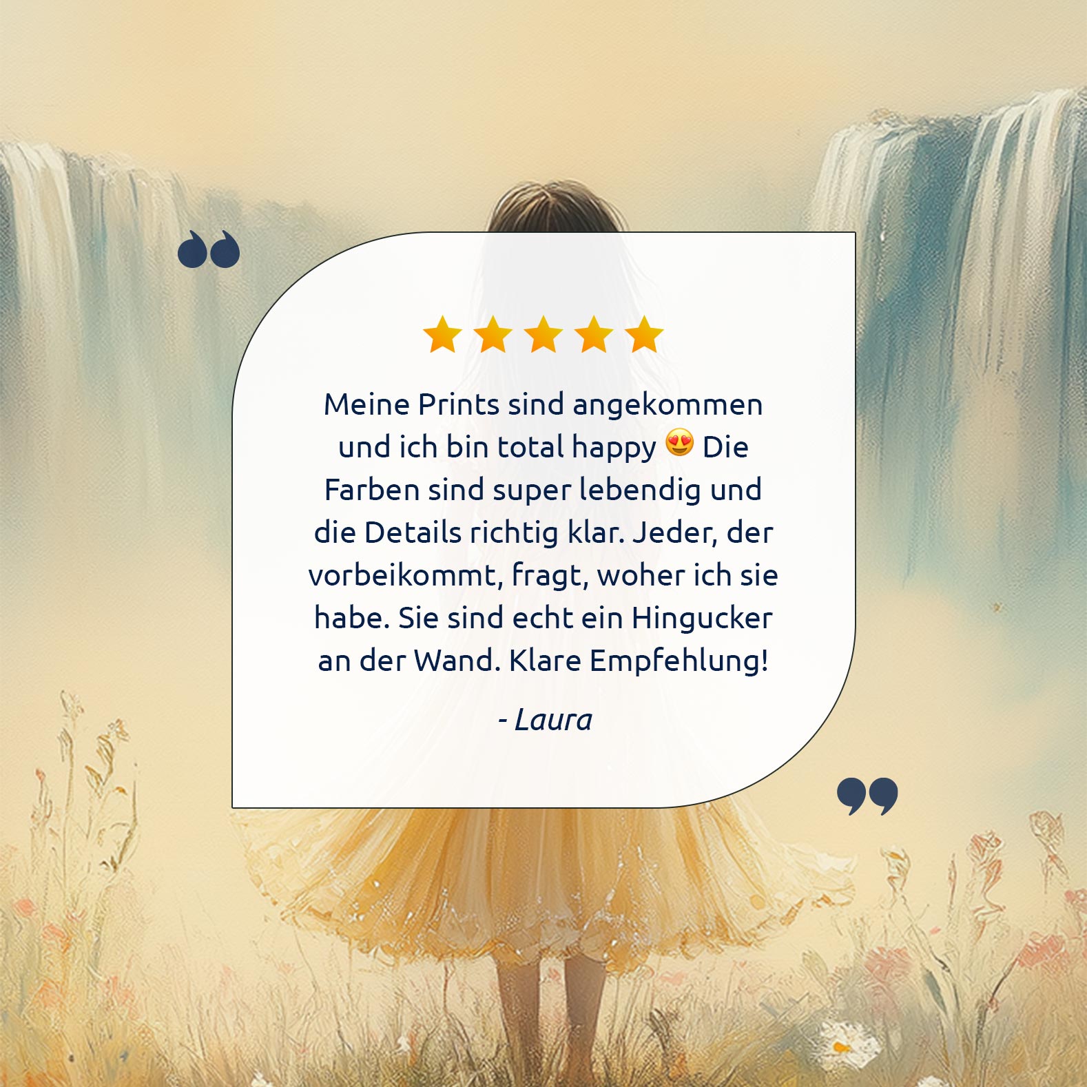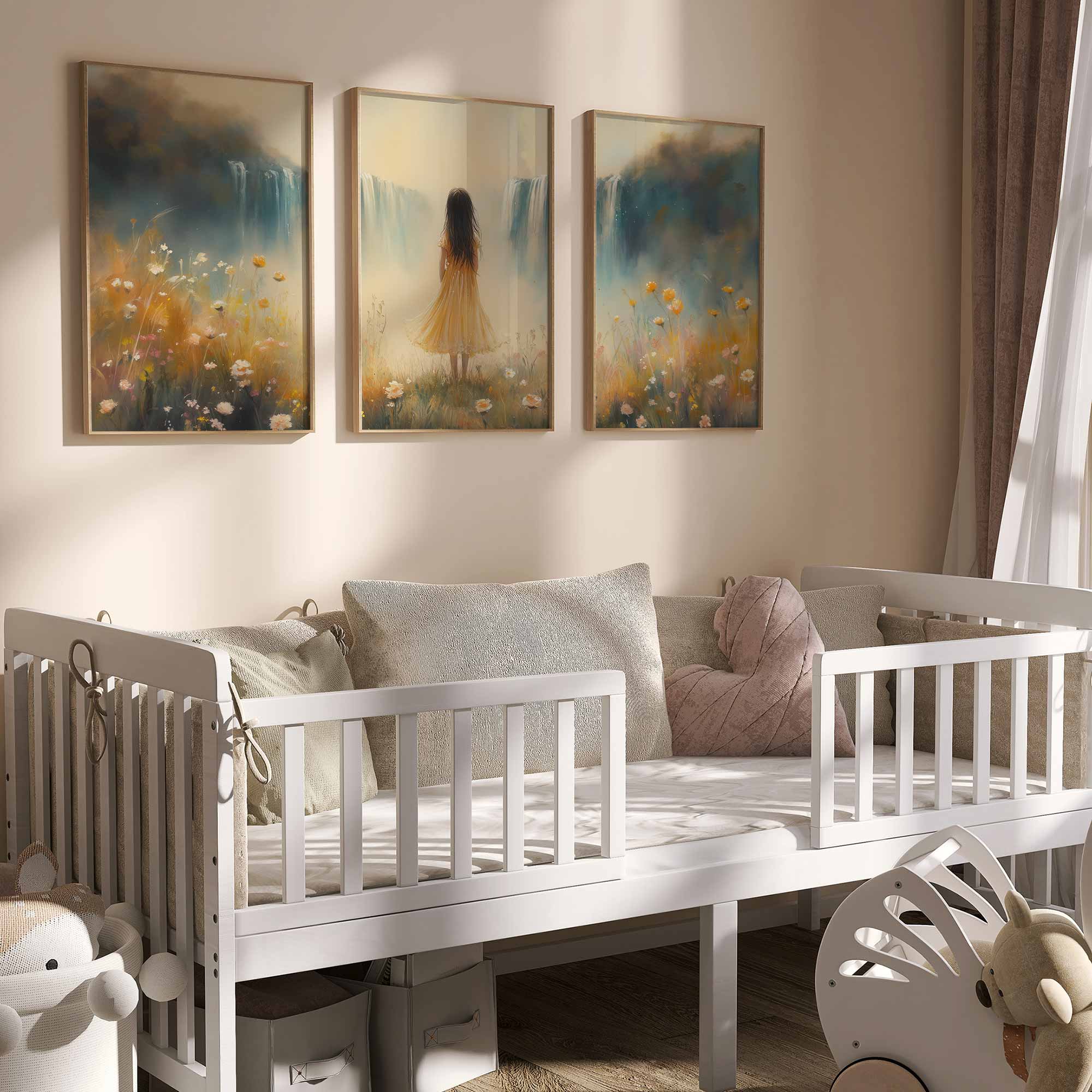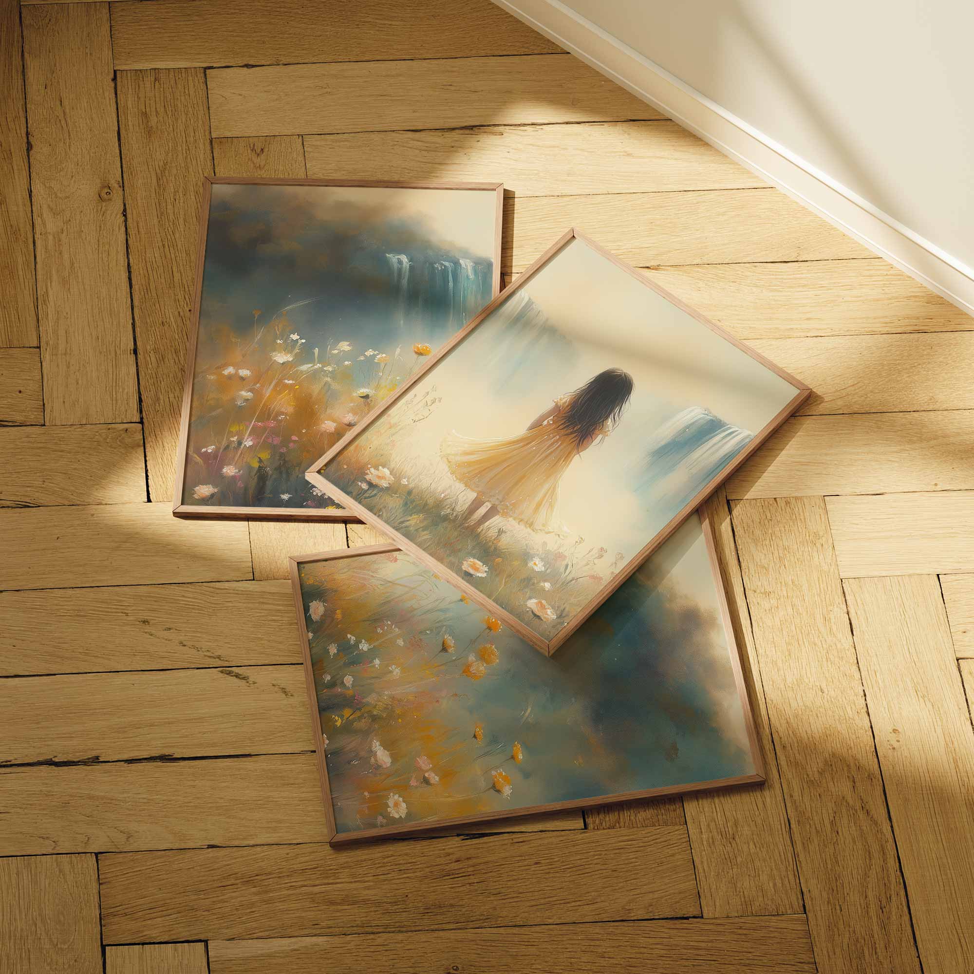 Zachtgeel Meisje bij Betoverende Waterval en Bloemenveld