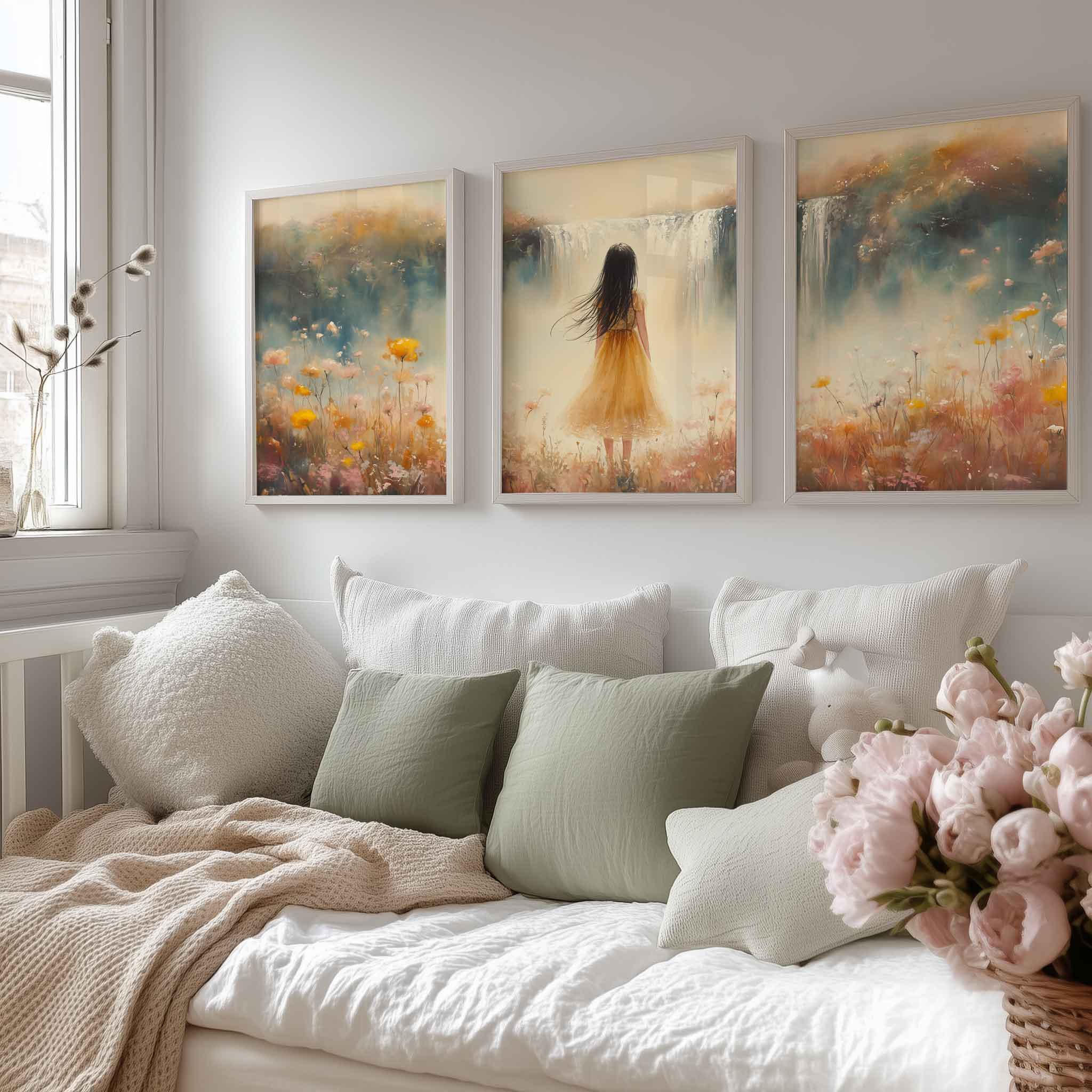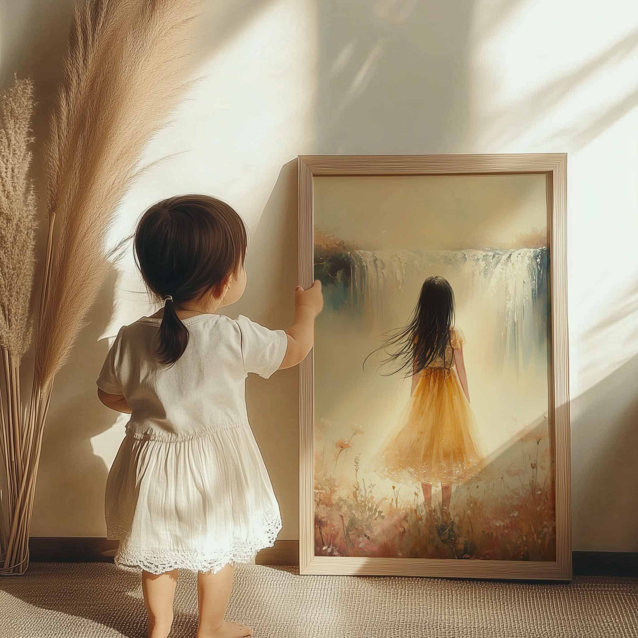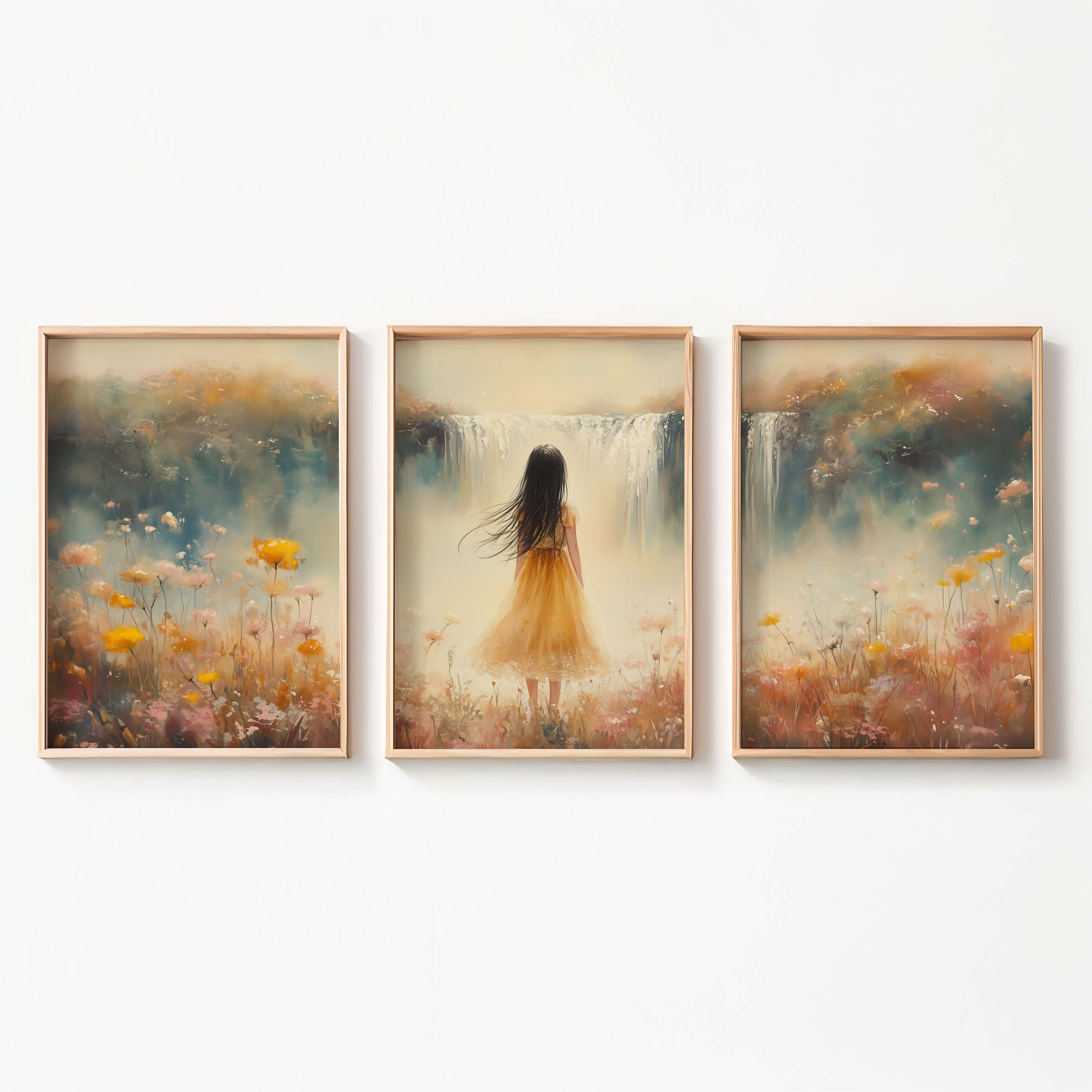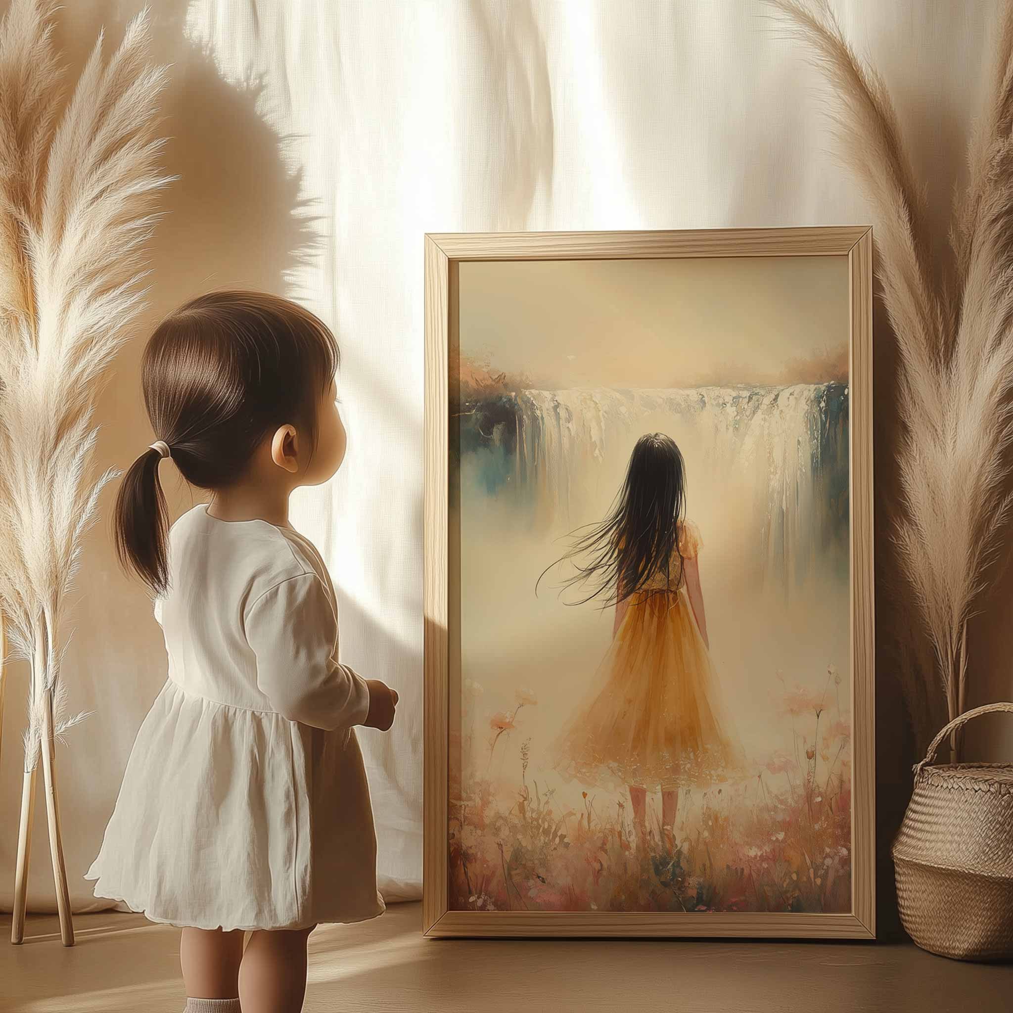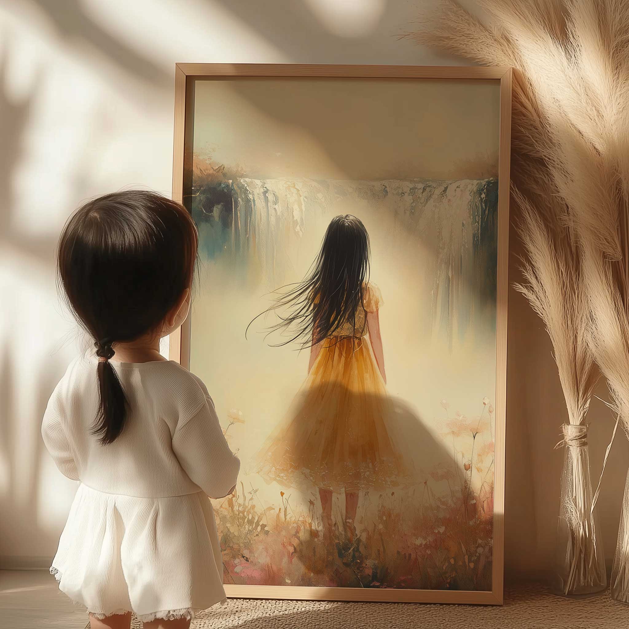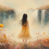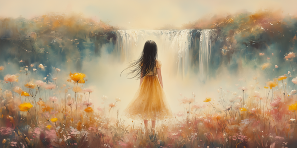 Zachtgele jurk in dromerig bloemenveld bij waterval