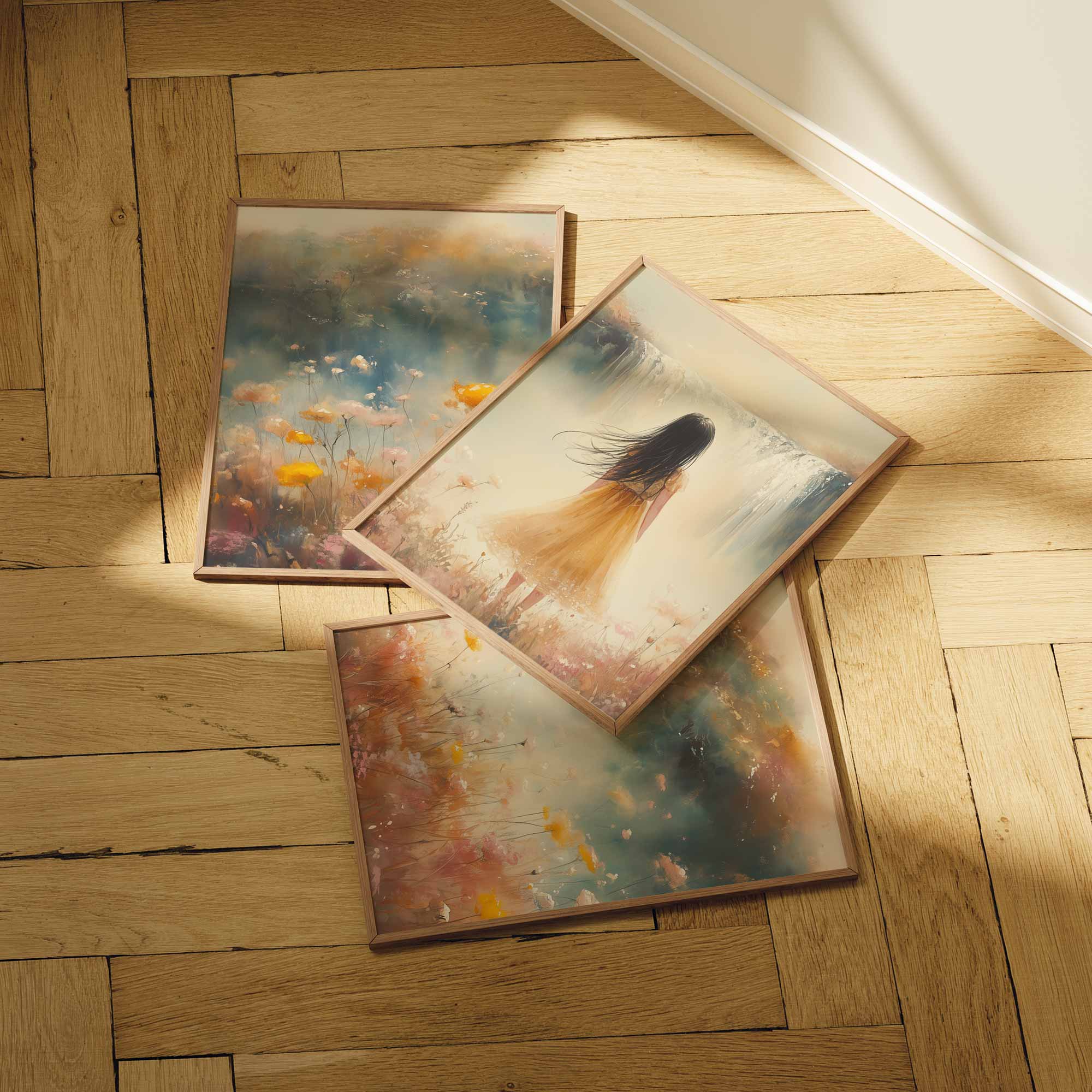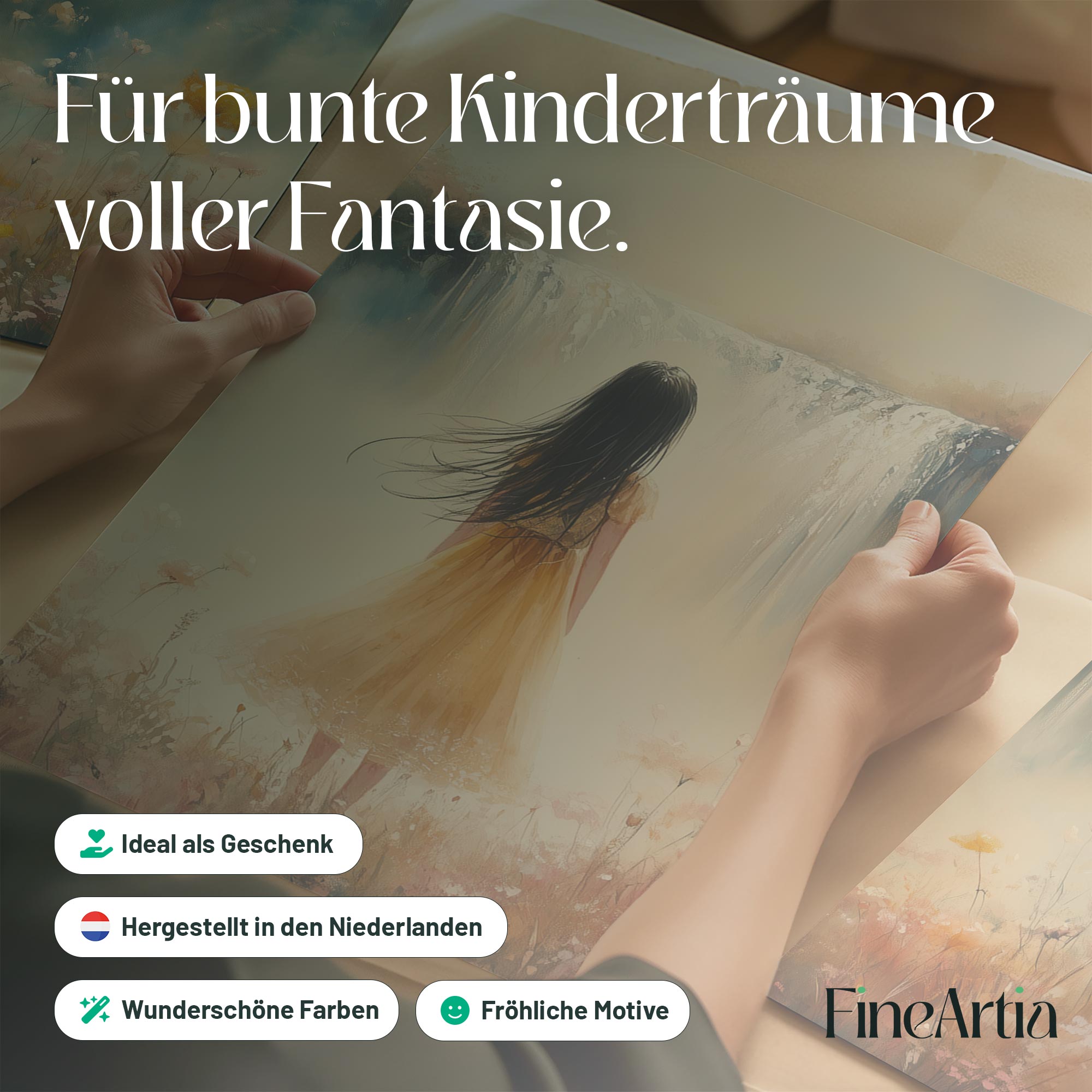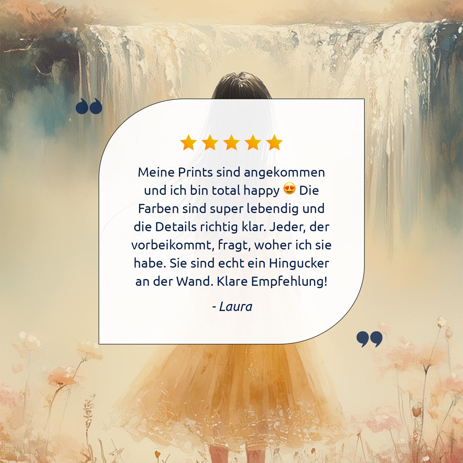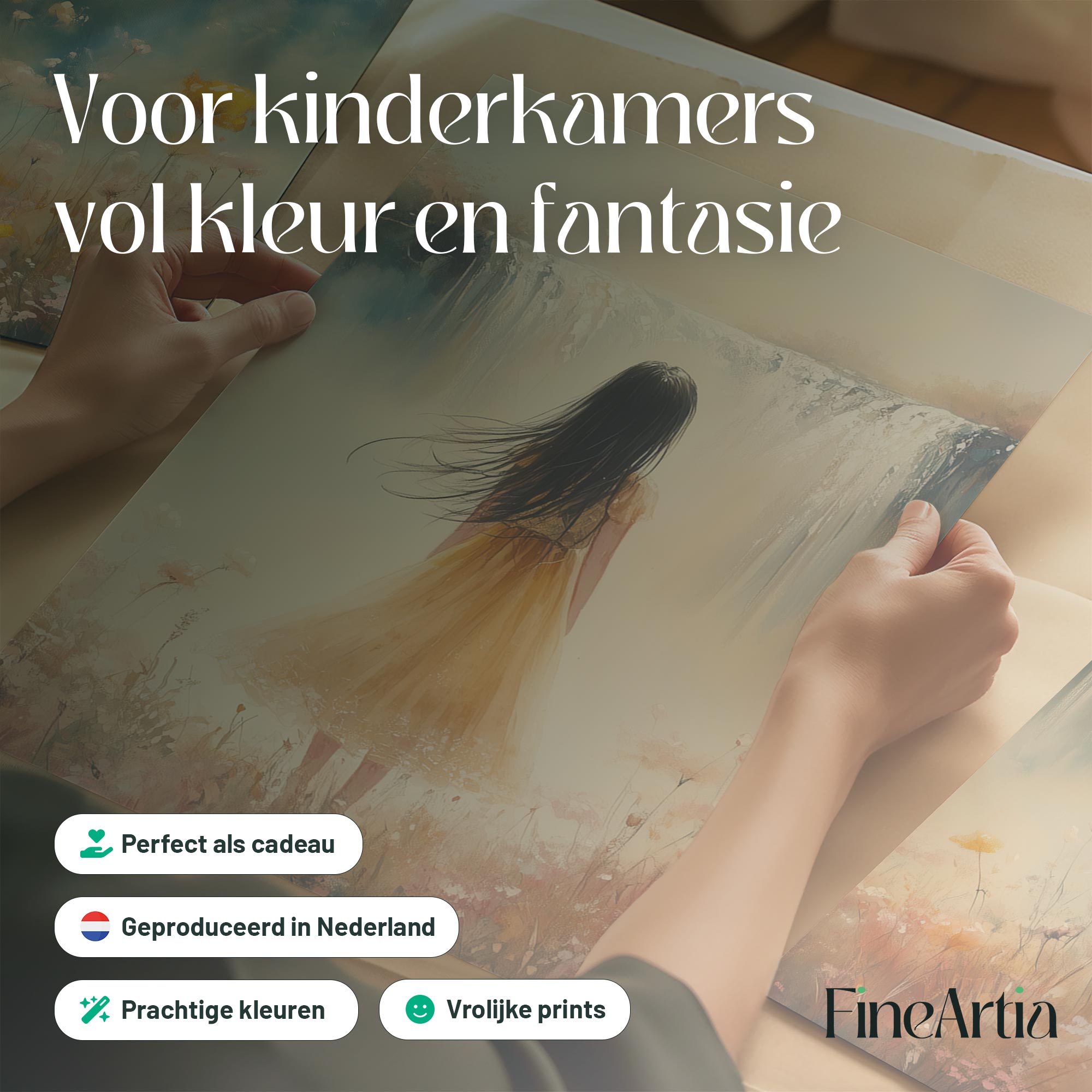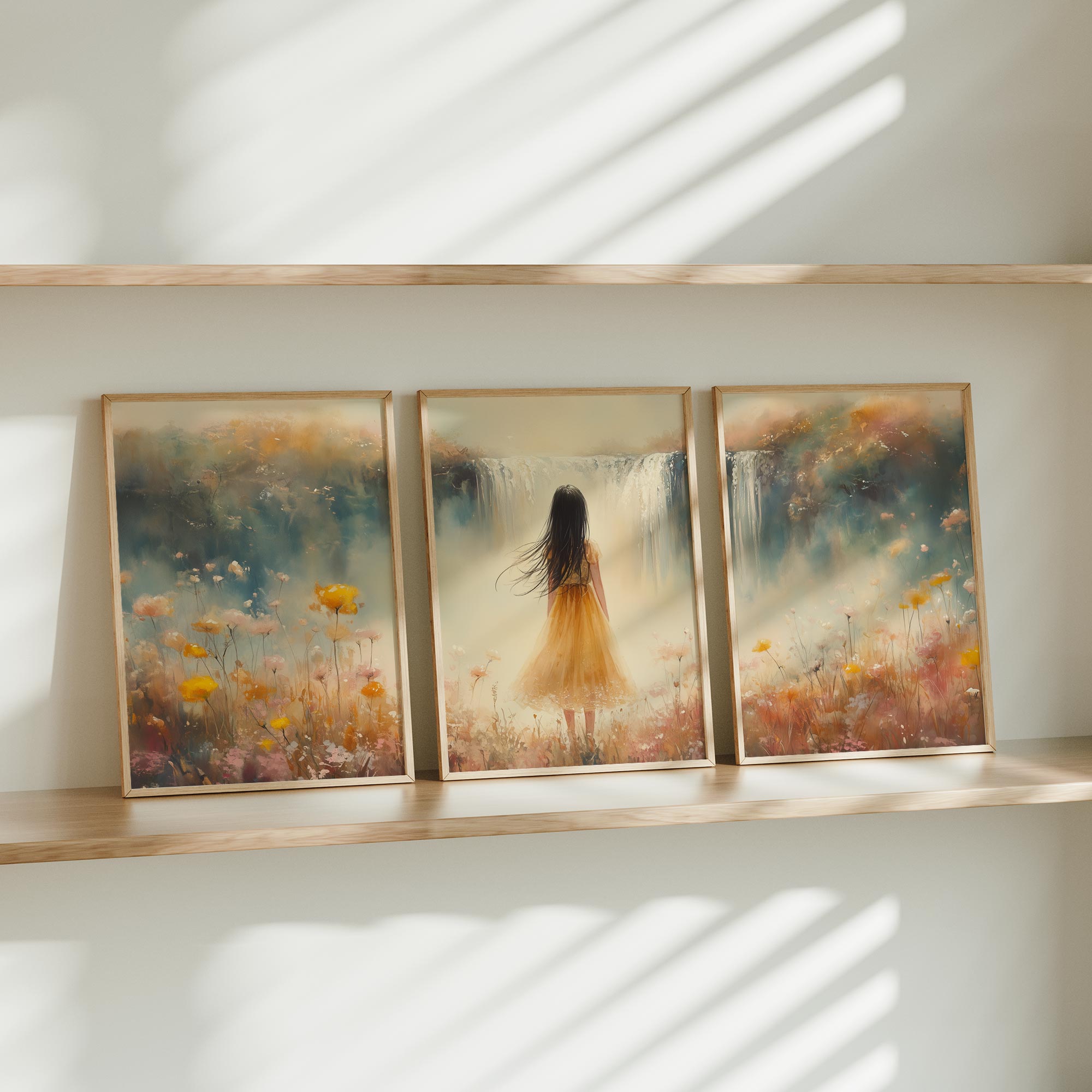 Zachtgele jurk in dromerig bloemenveld bij waterval