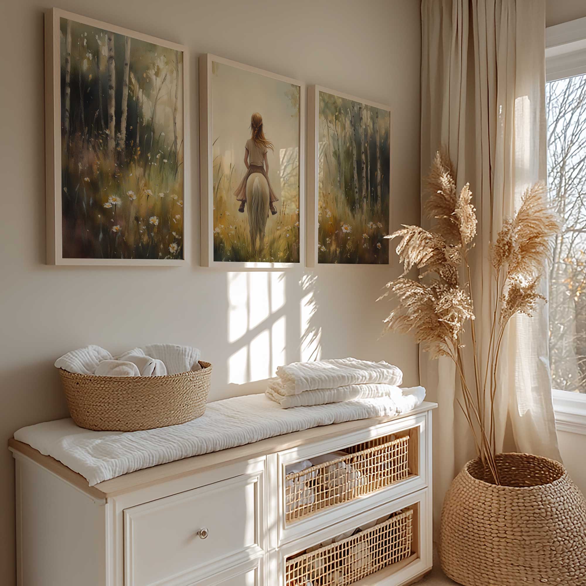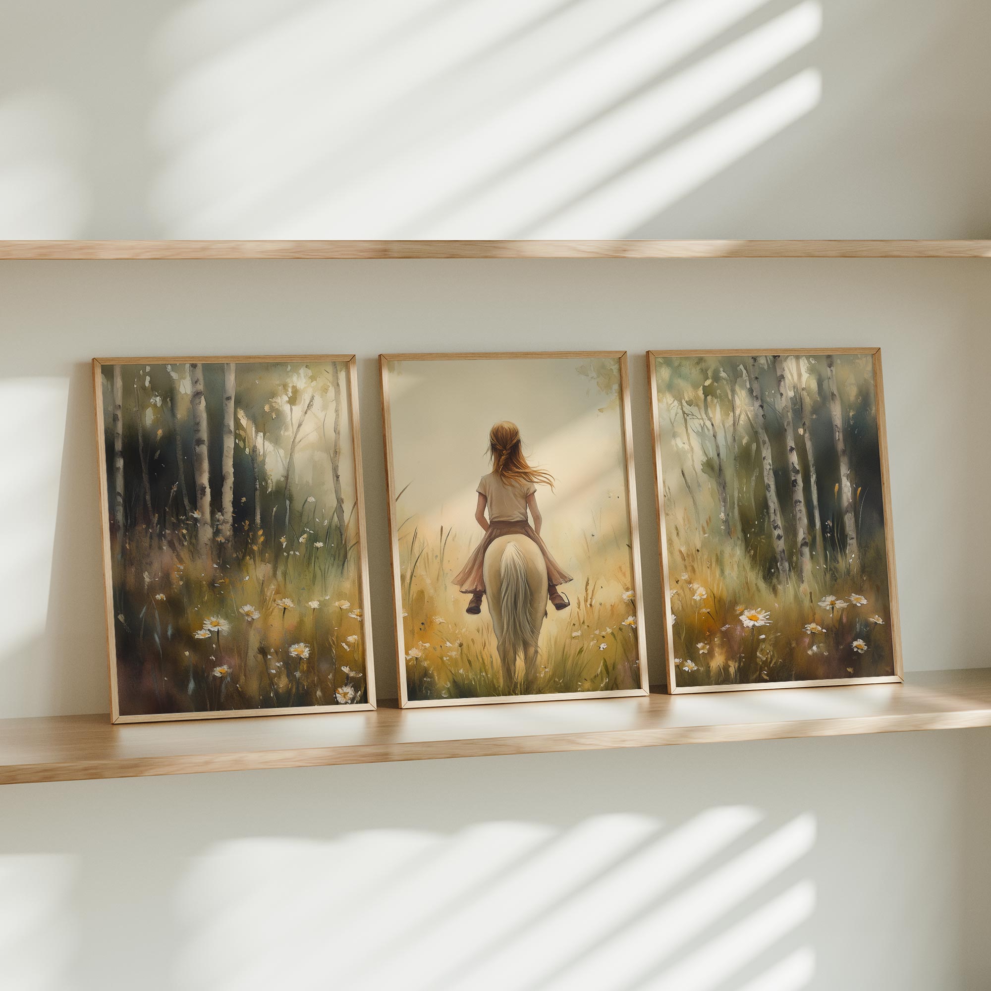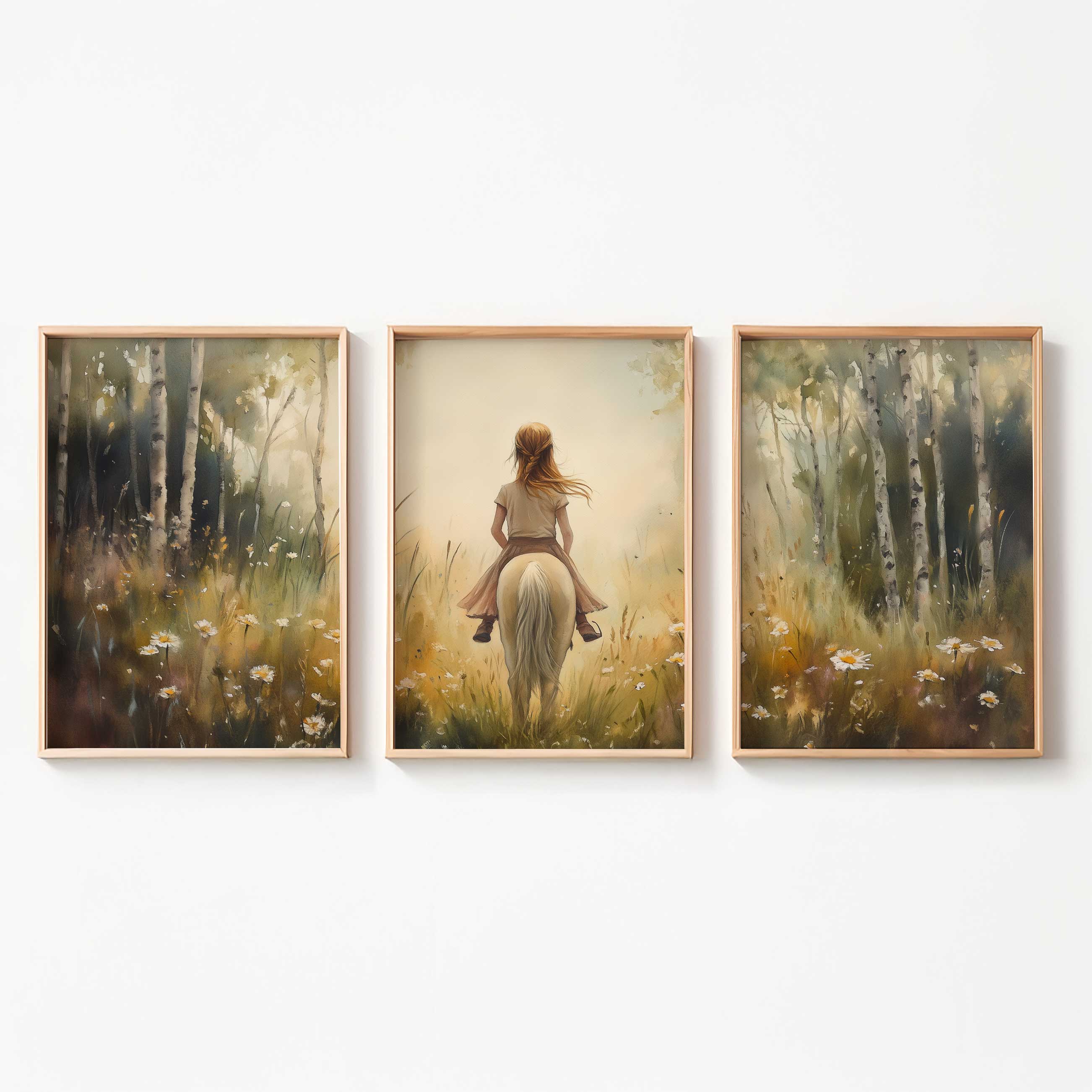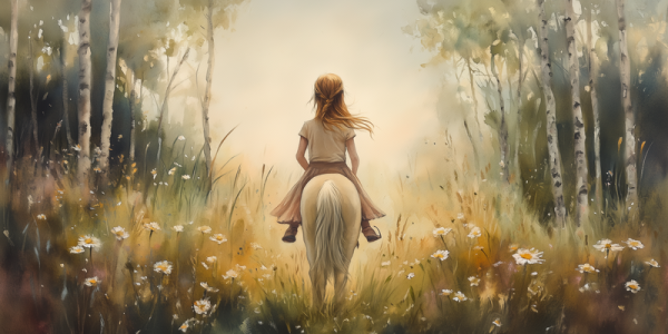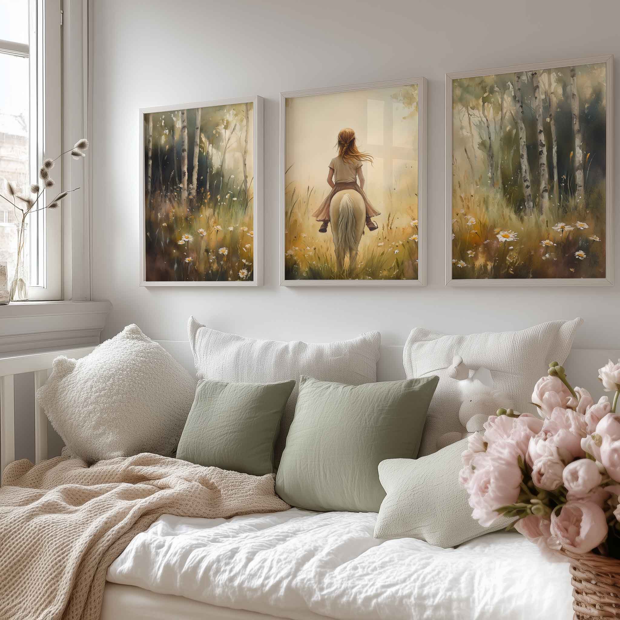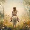 Terug naar collectie Posters Zachtgroene Droom: Vrouw te Paard in Bloemenveld