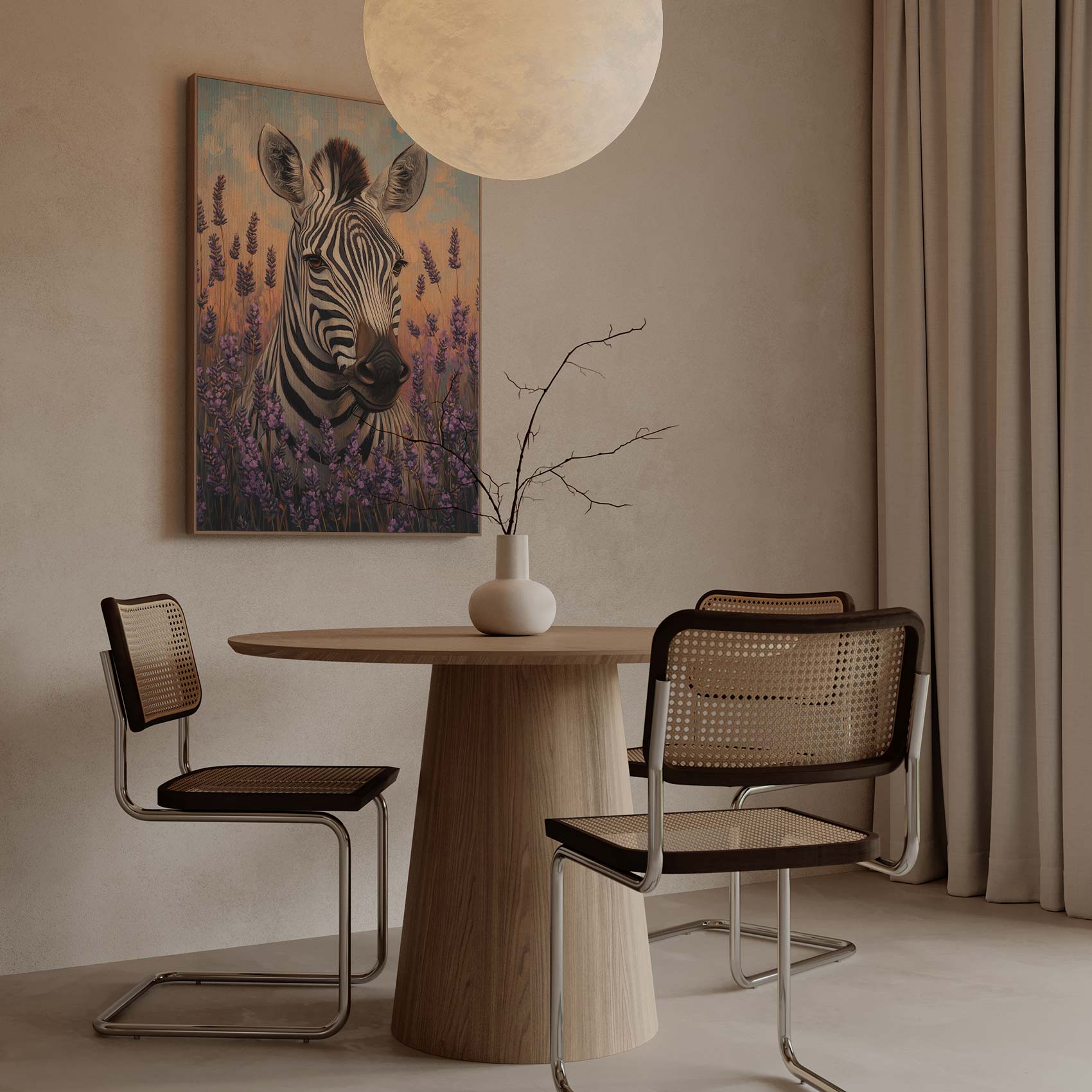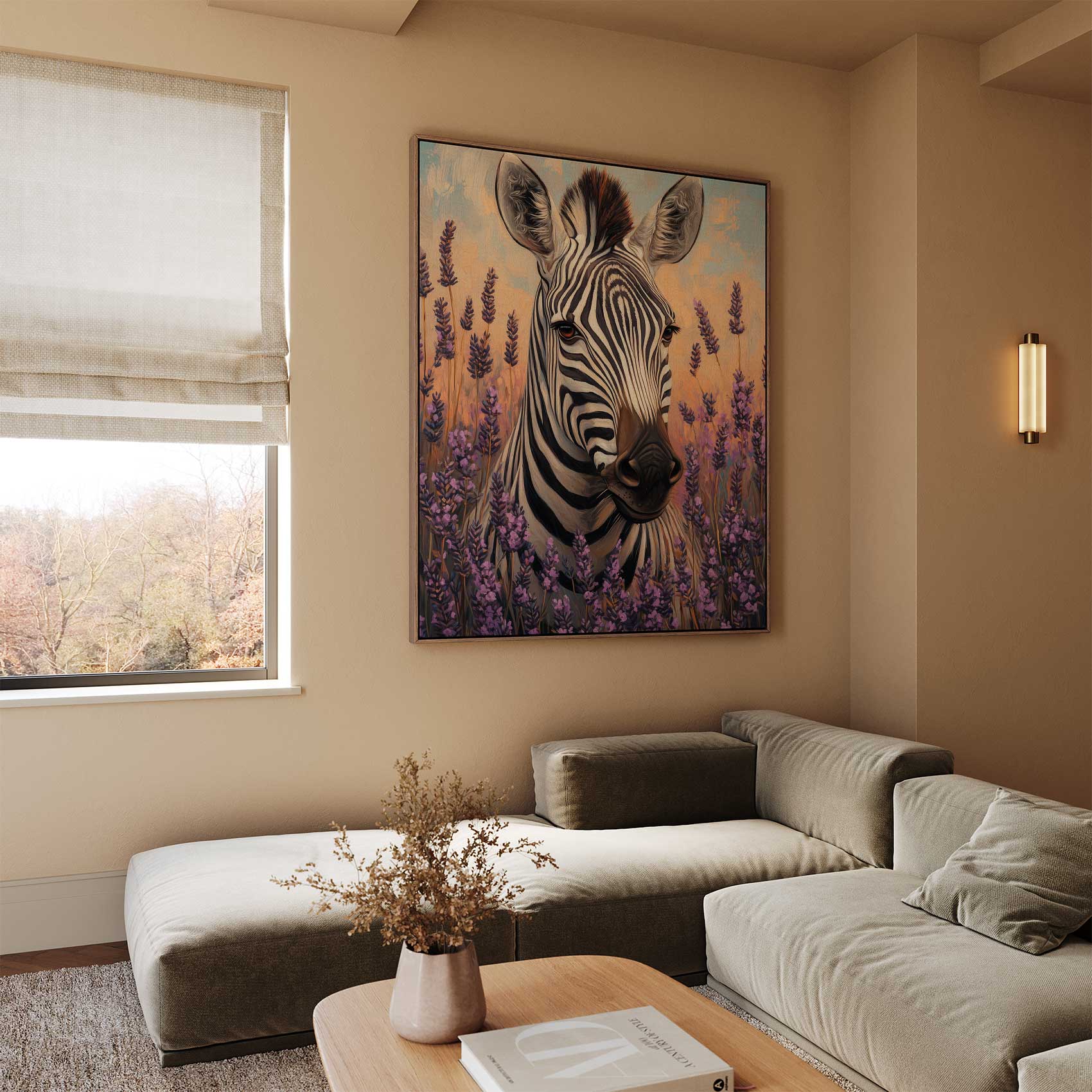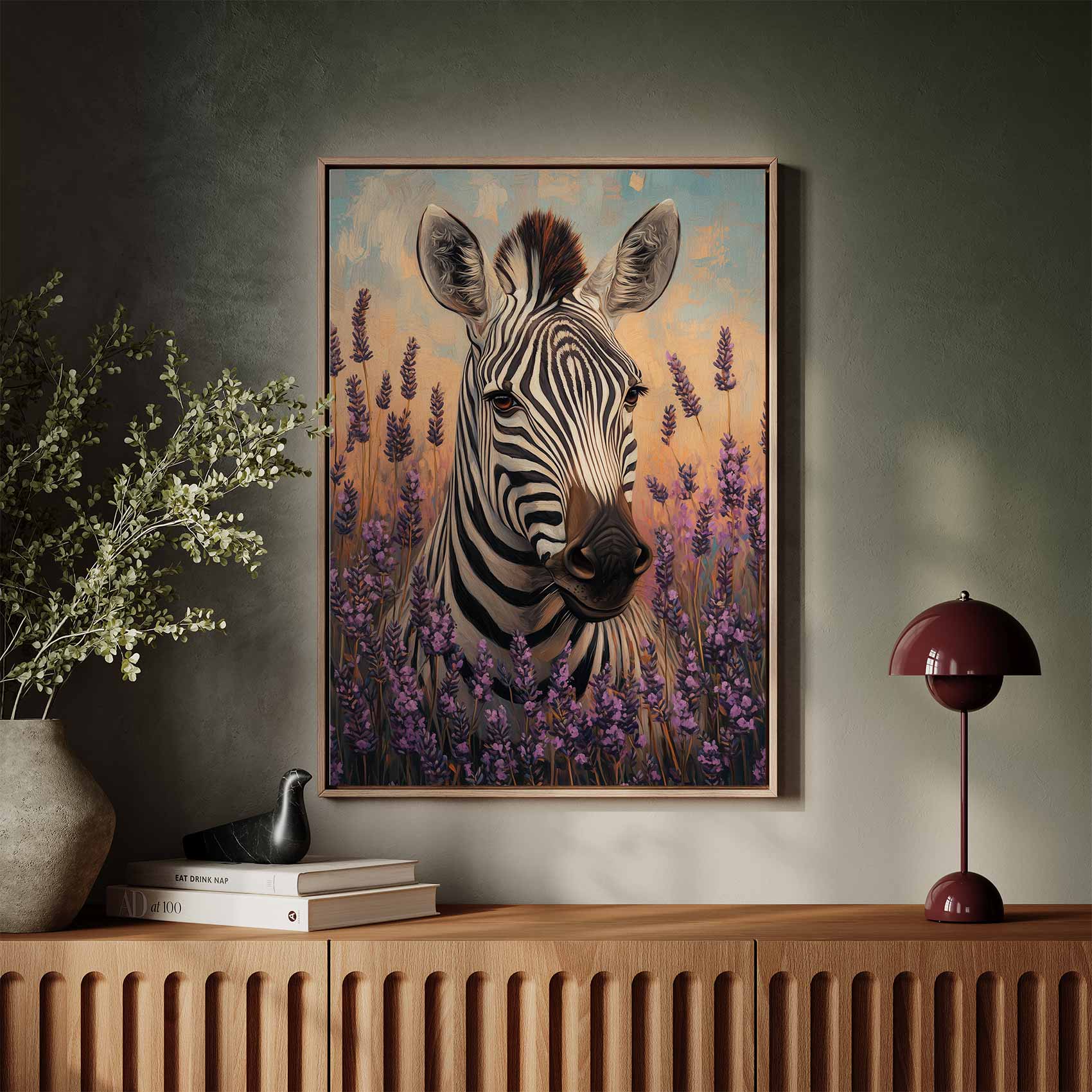 Terug naar collectie Canvas Zebra tussen paarse lavendel