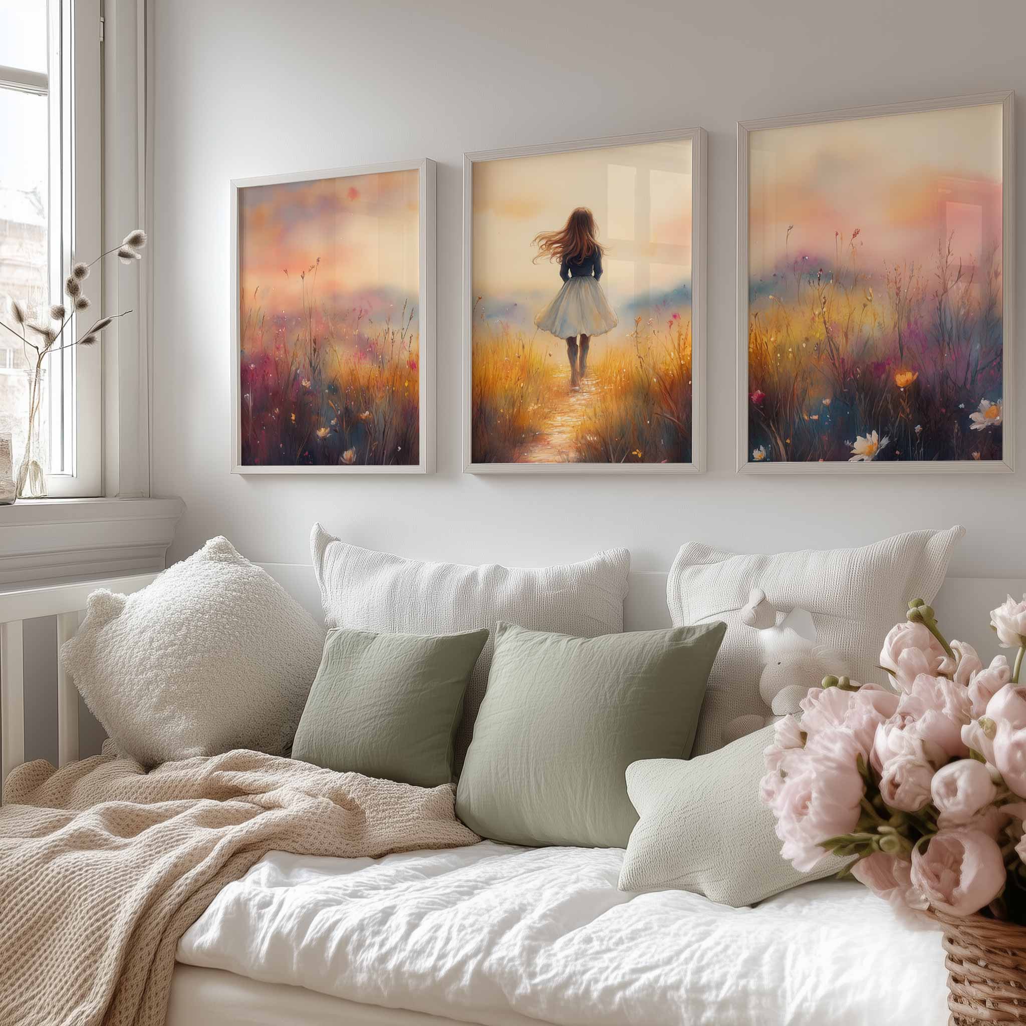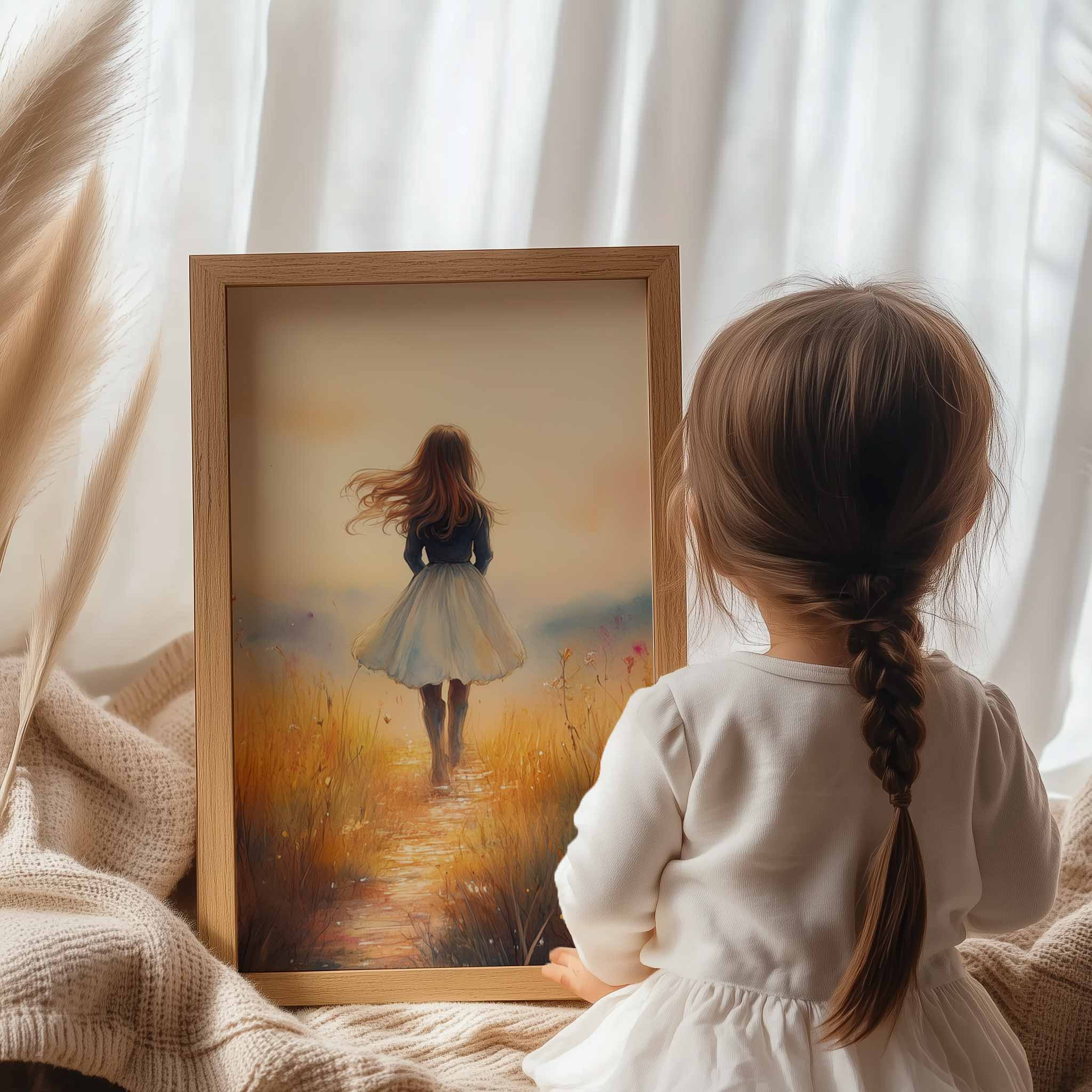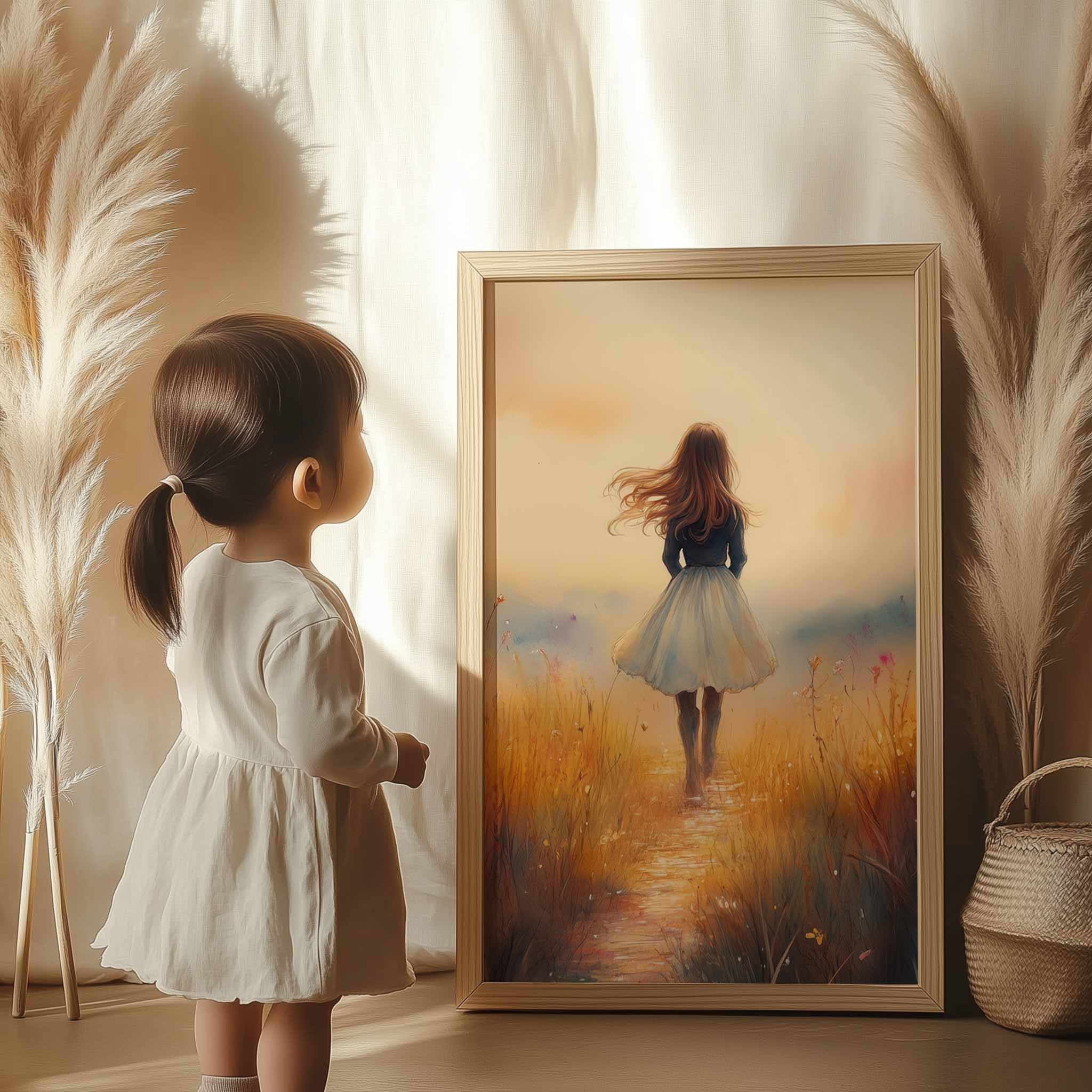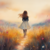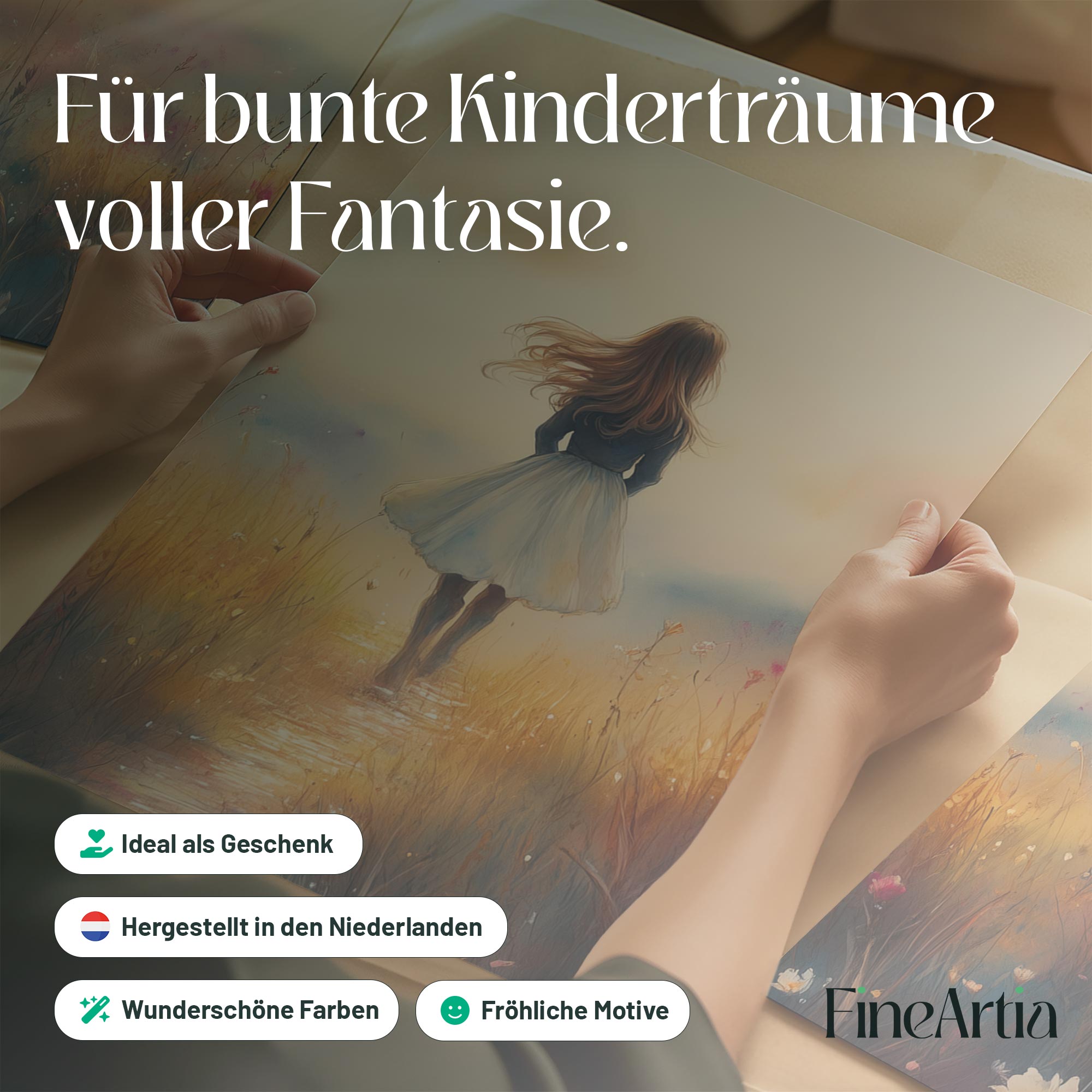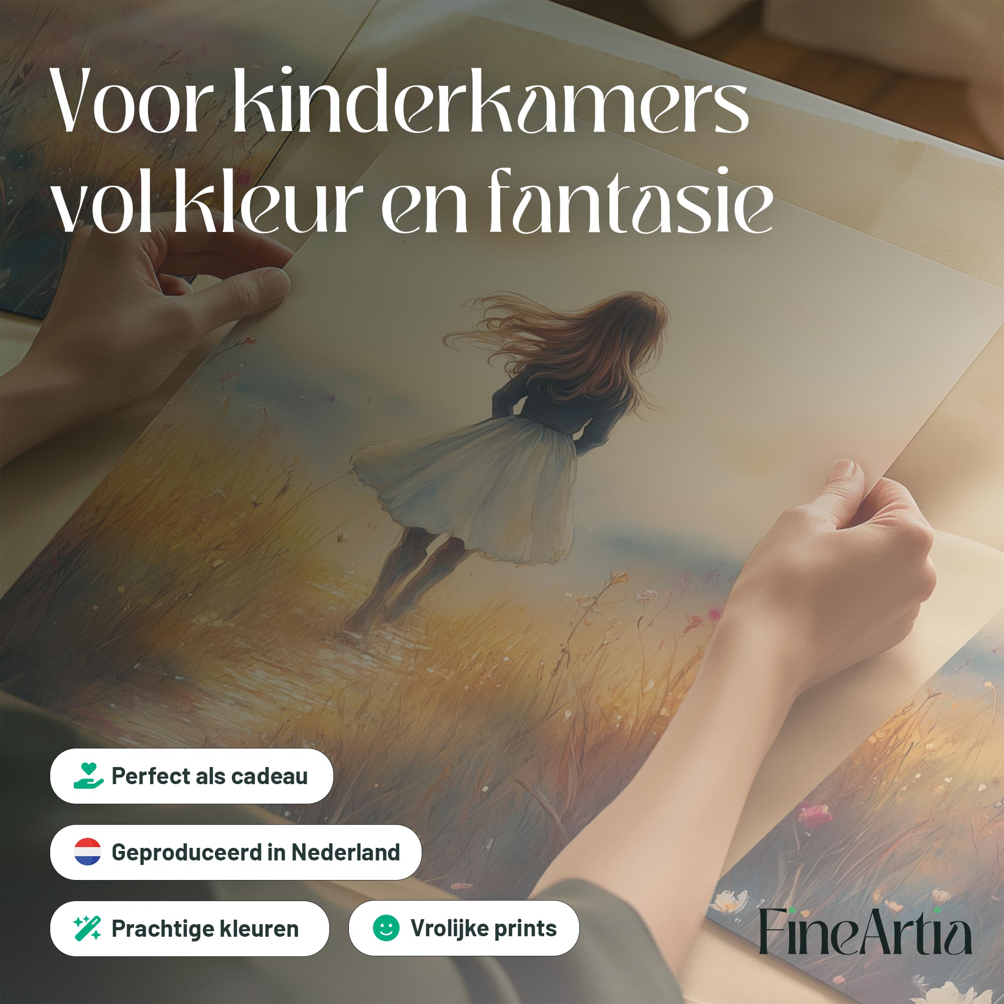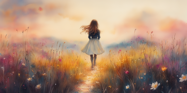 Zonnig bloemenveld met dromerig meisje in wit jurkje