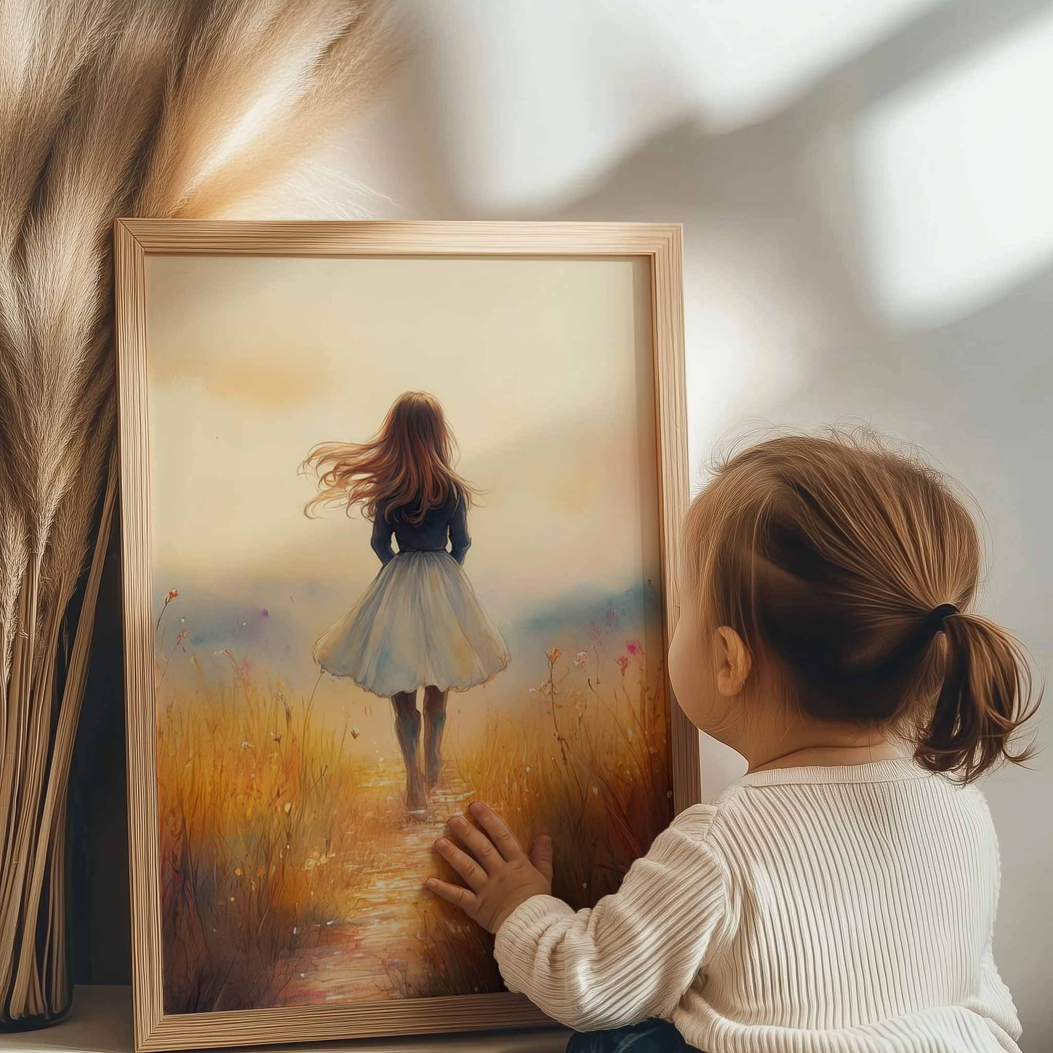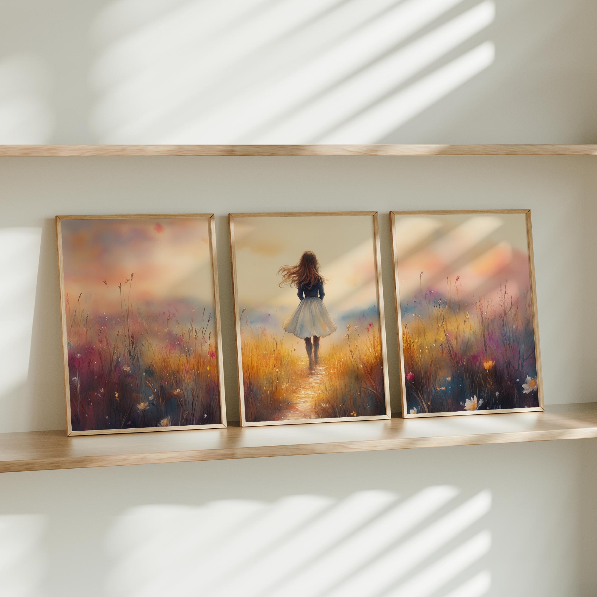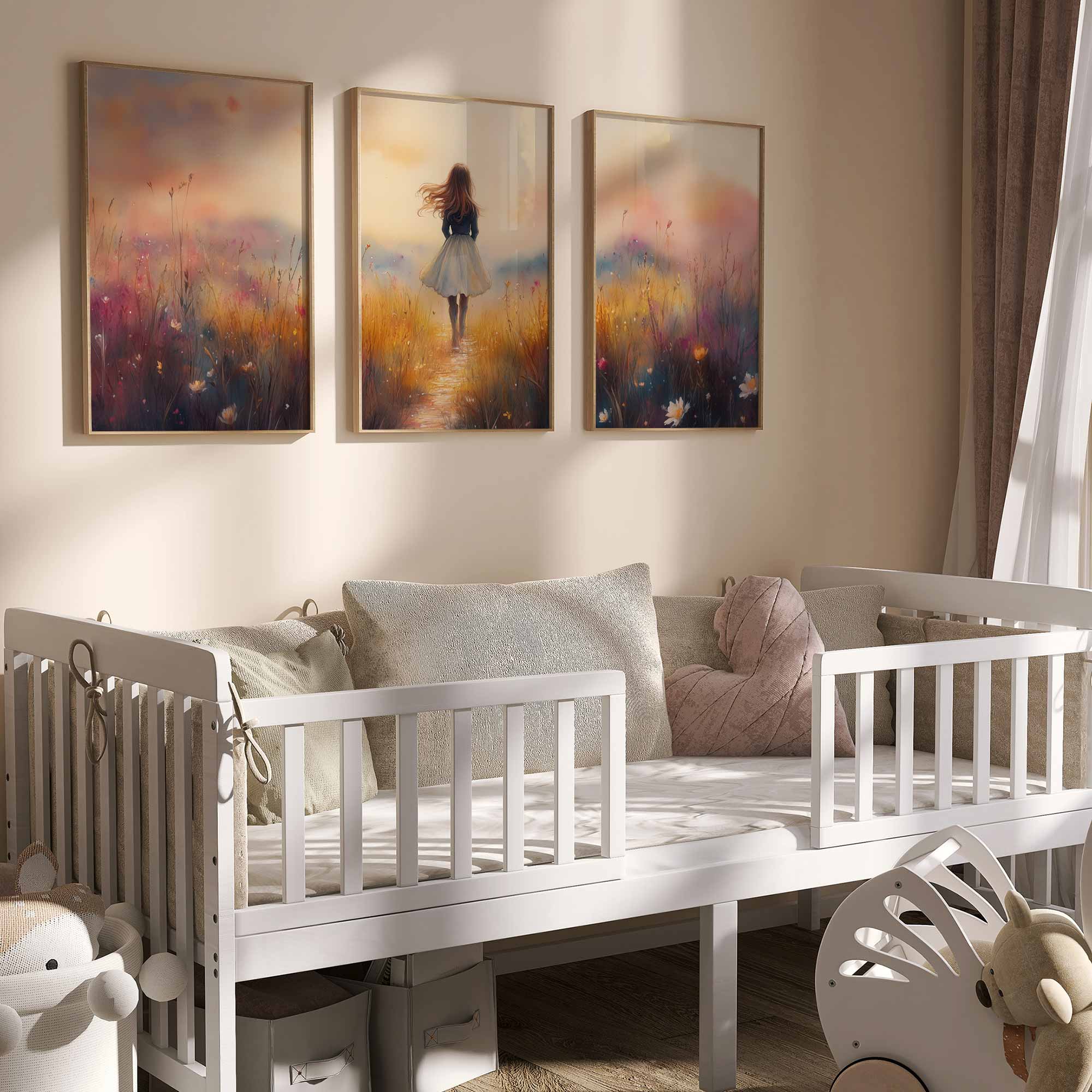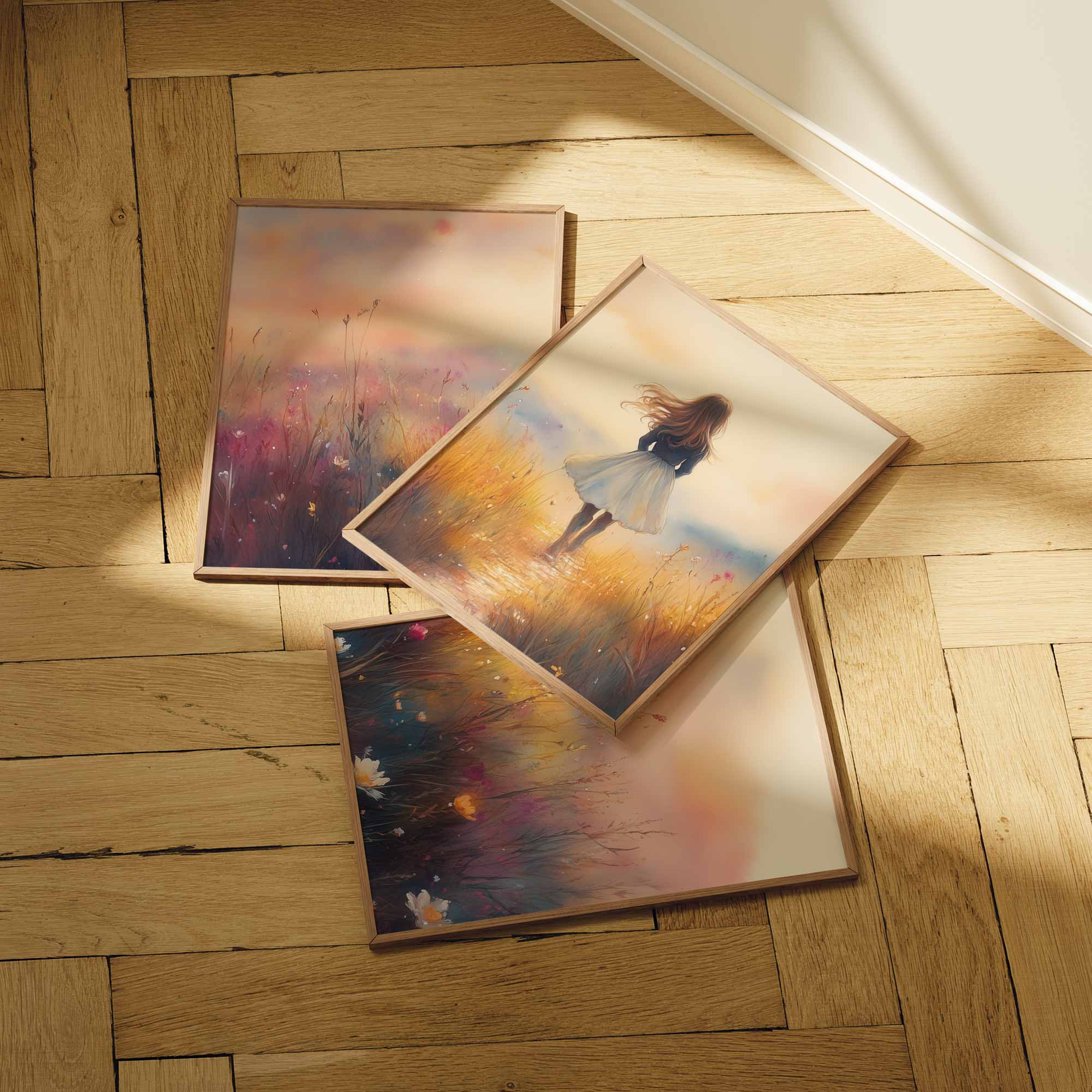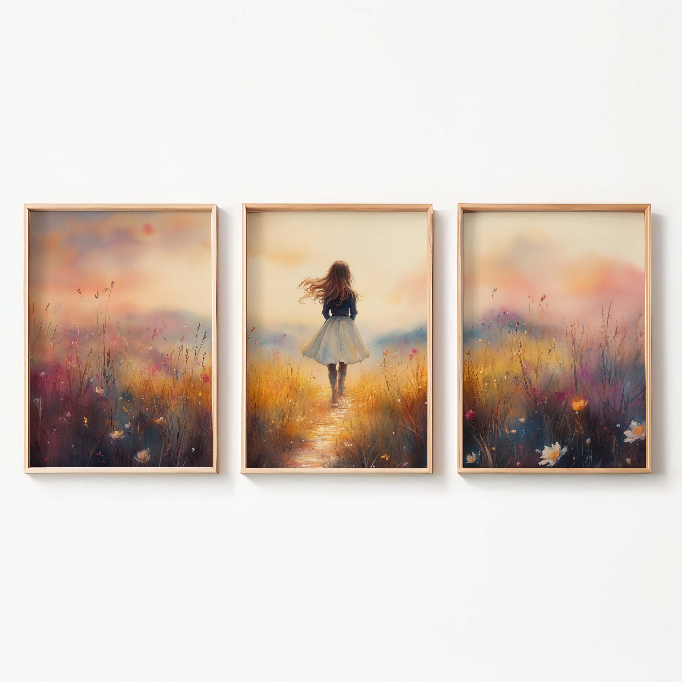 Zonnig bloemenveld met dromerig meisje in wit jurkje
