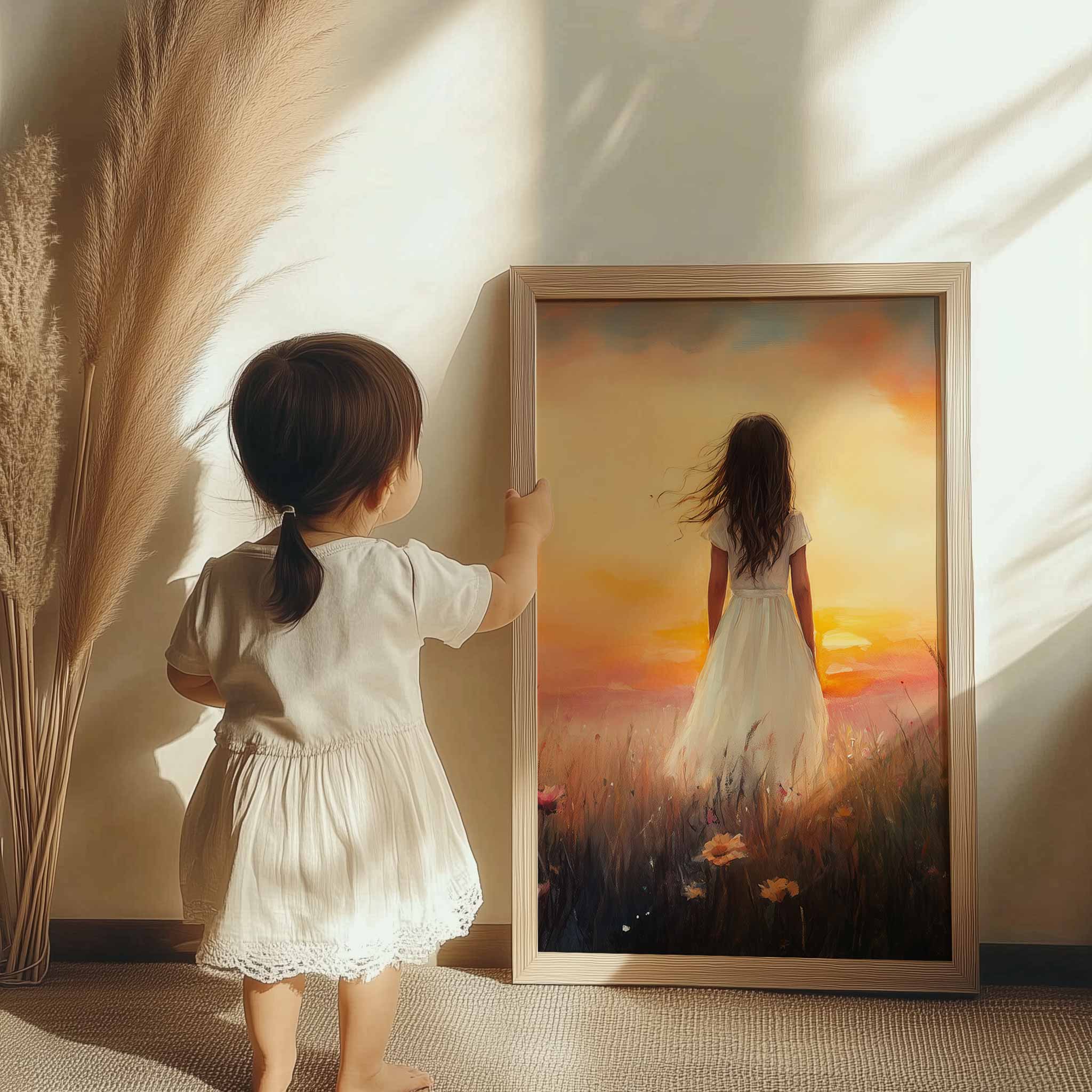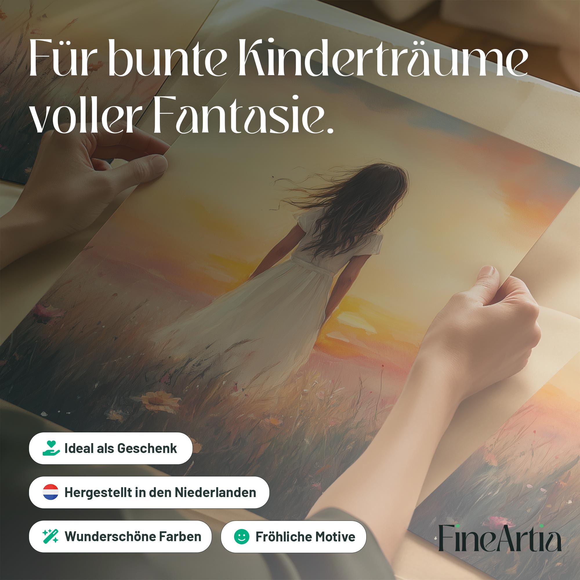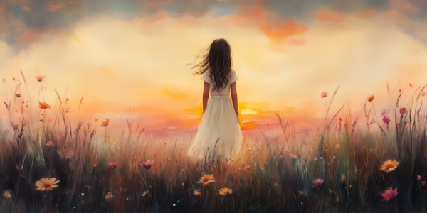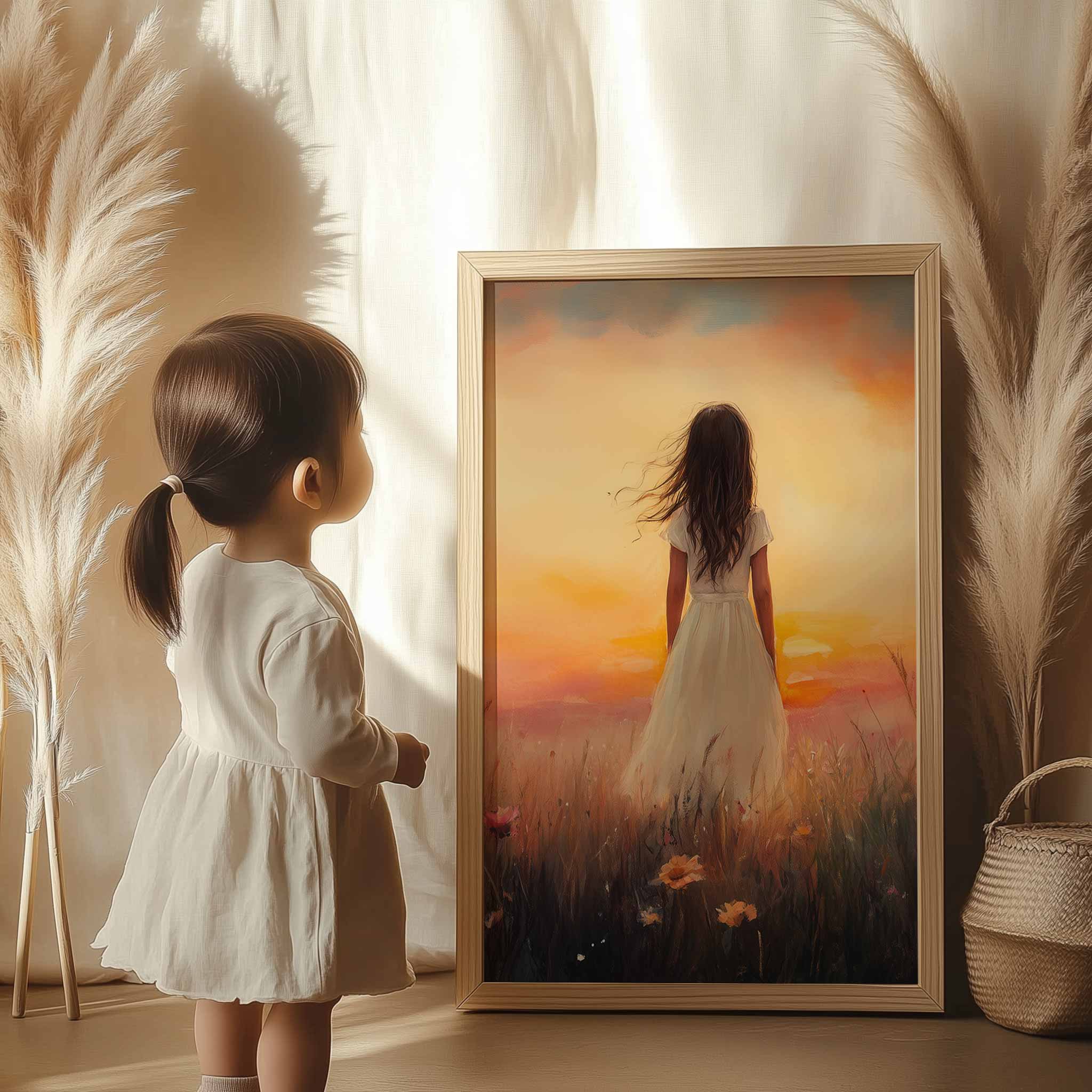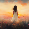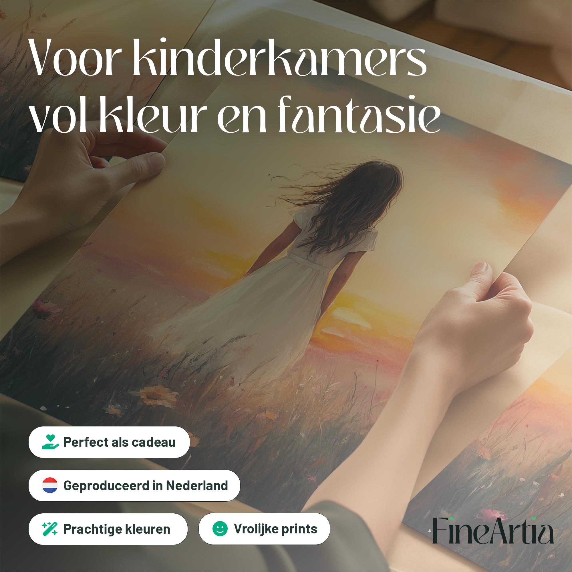 Zonnig Bloemenveld met Meisje in Witte Jurk