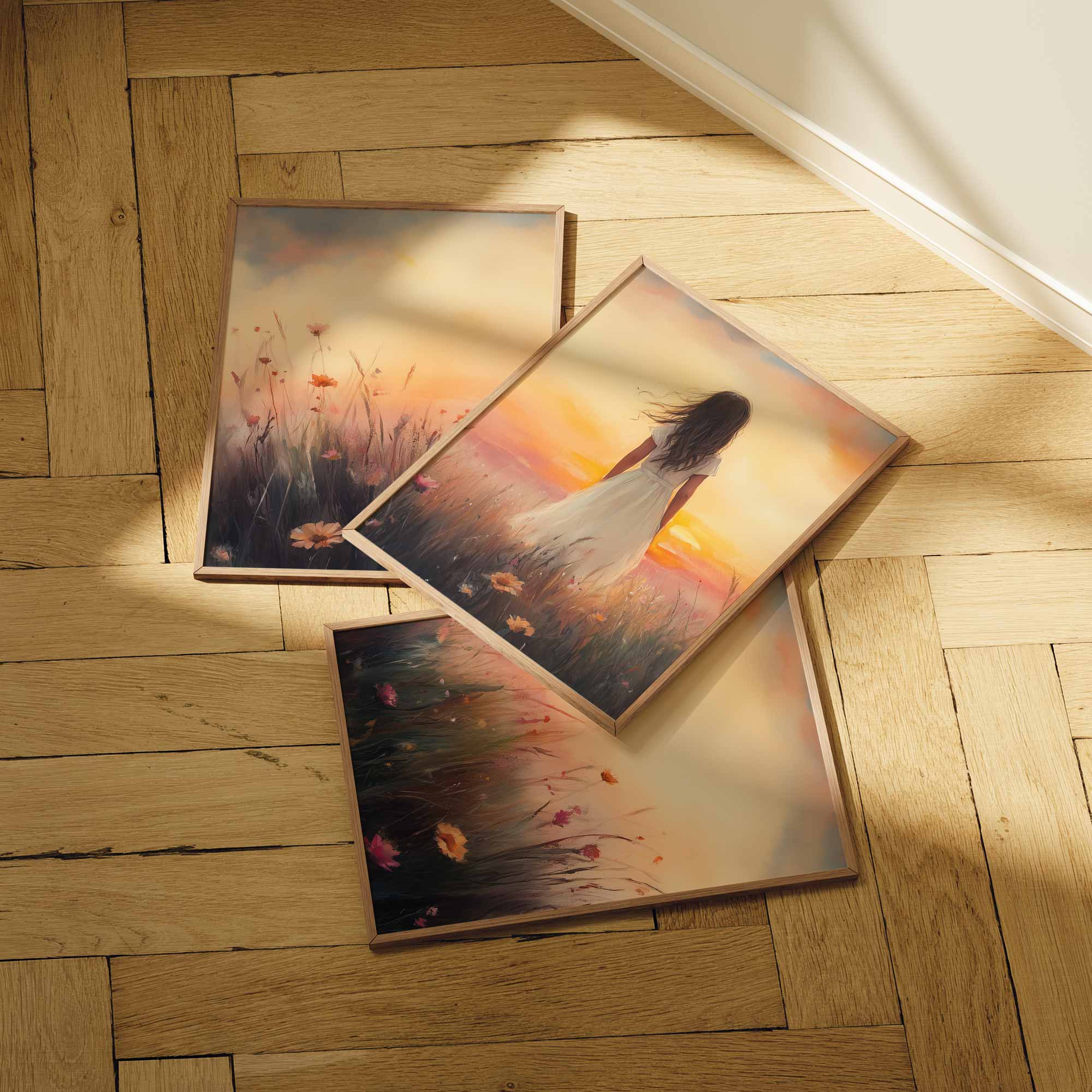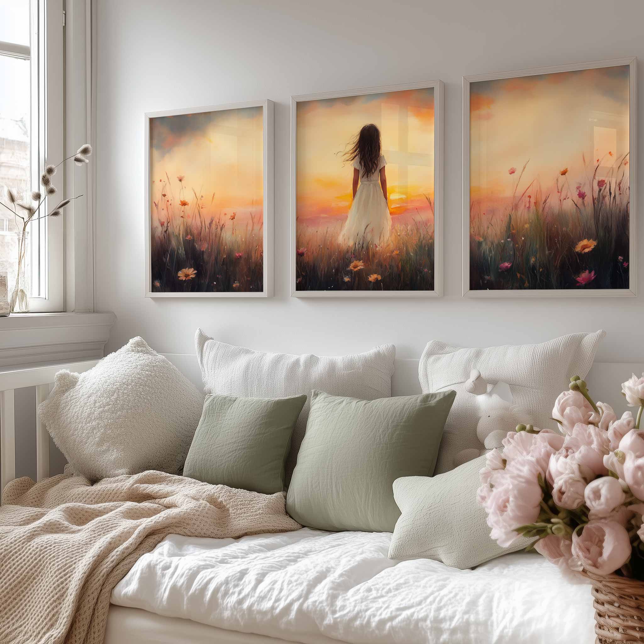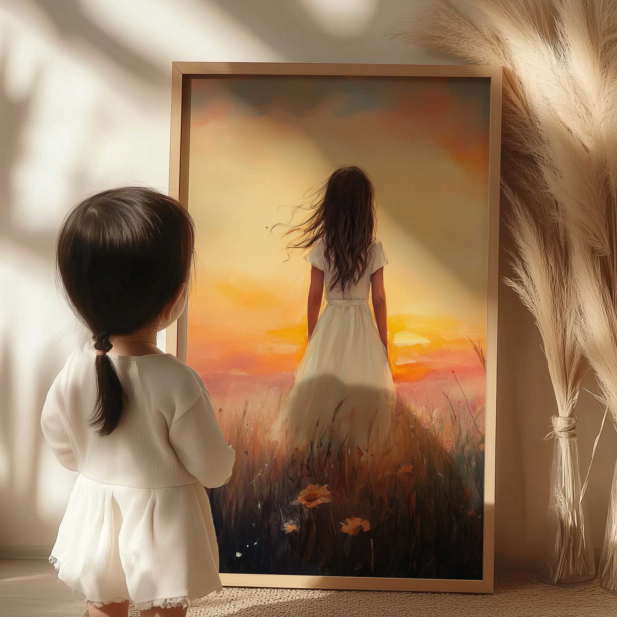 Zonnig Bloemenveld met Meisje in Witte Jurk