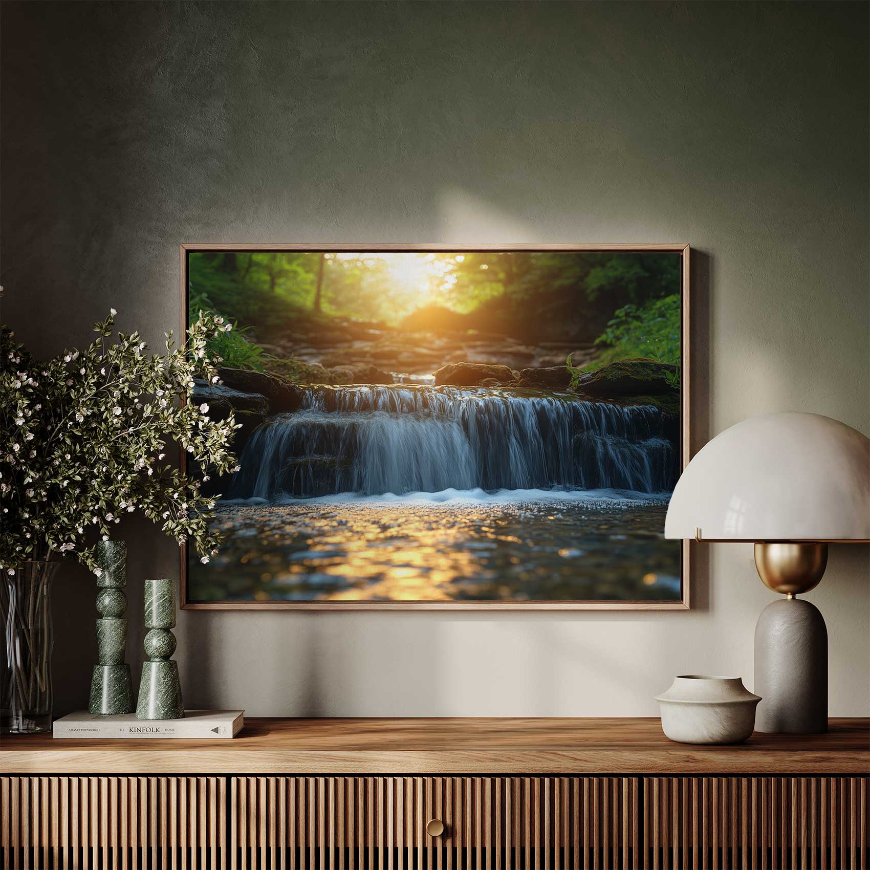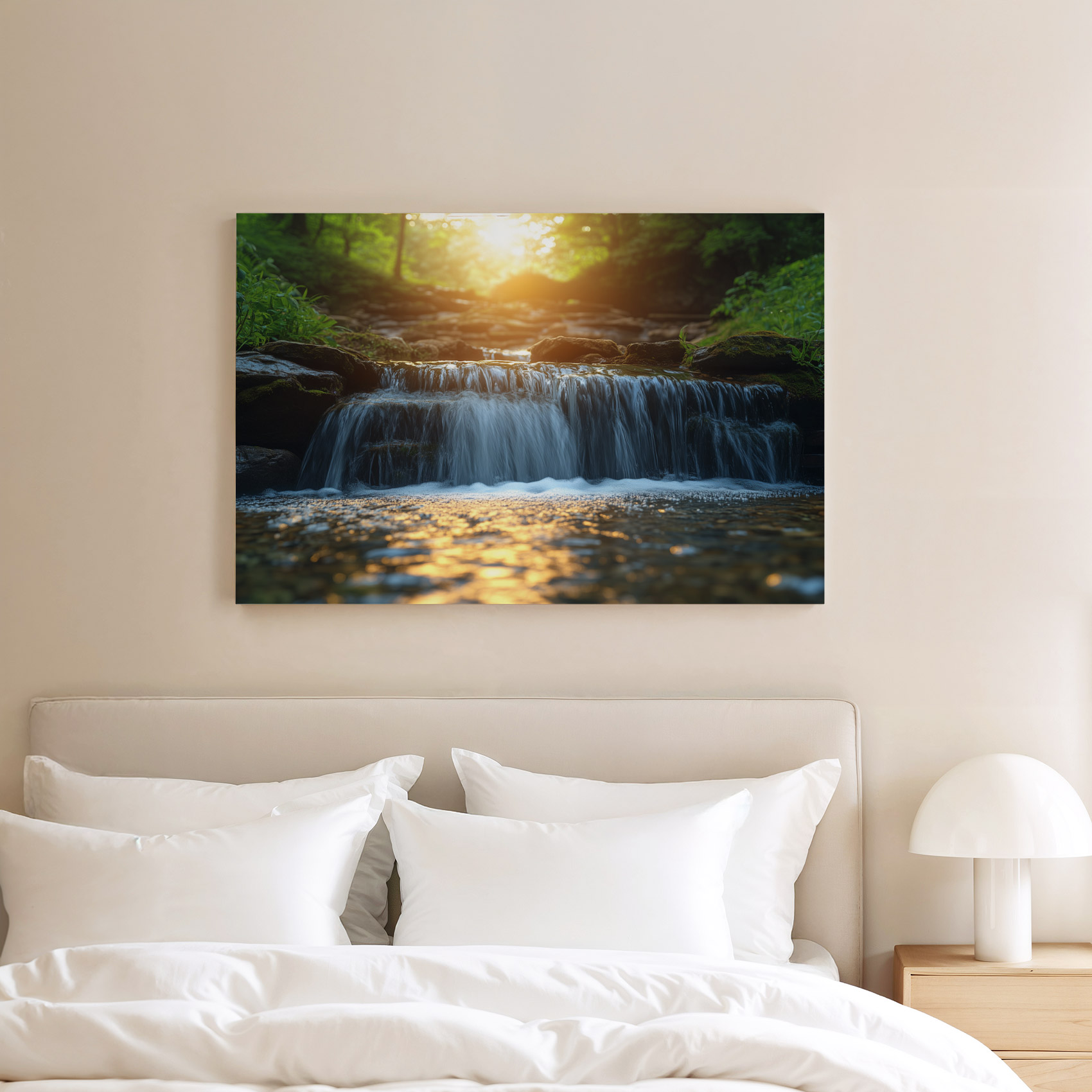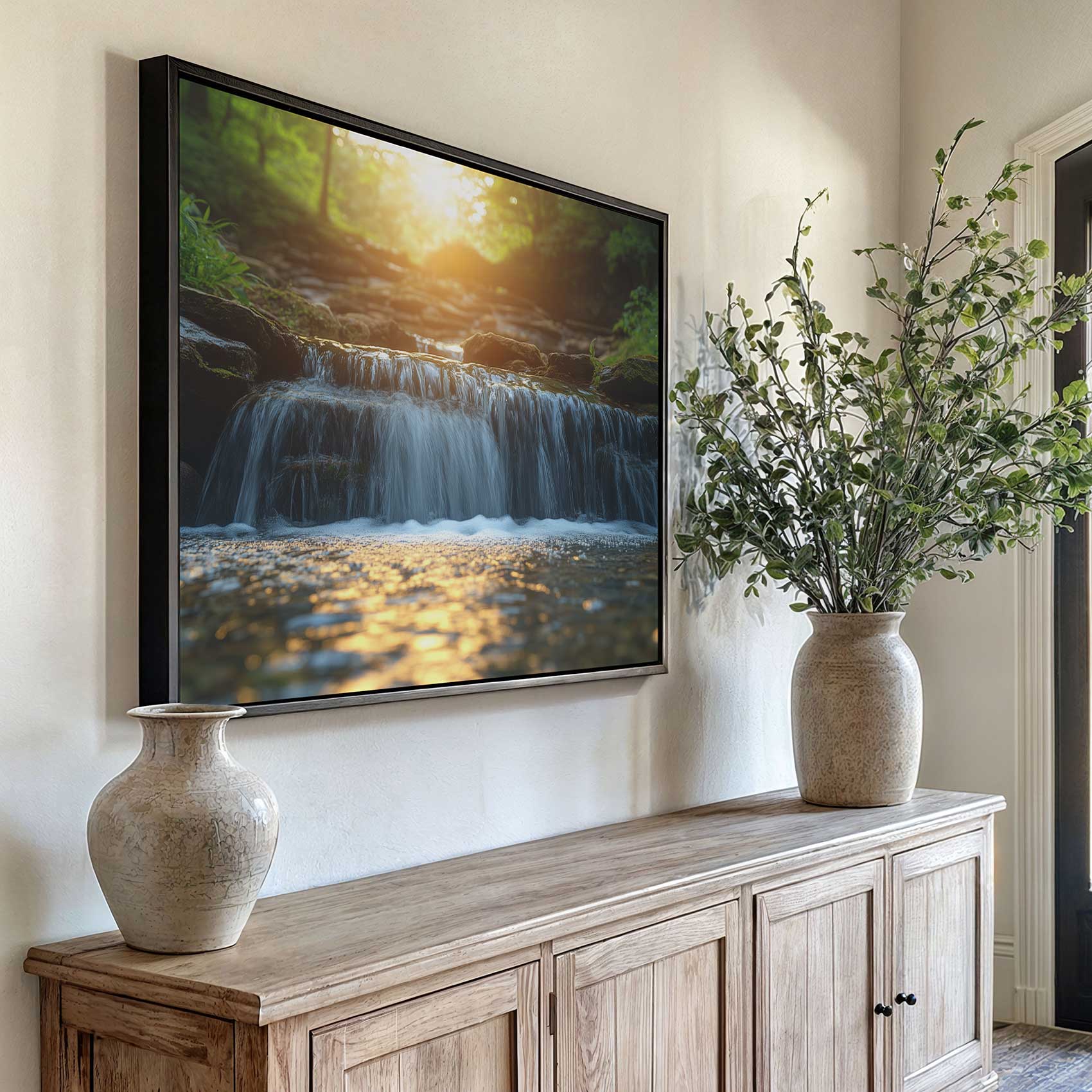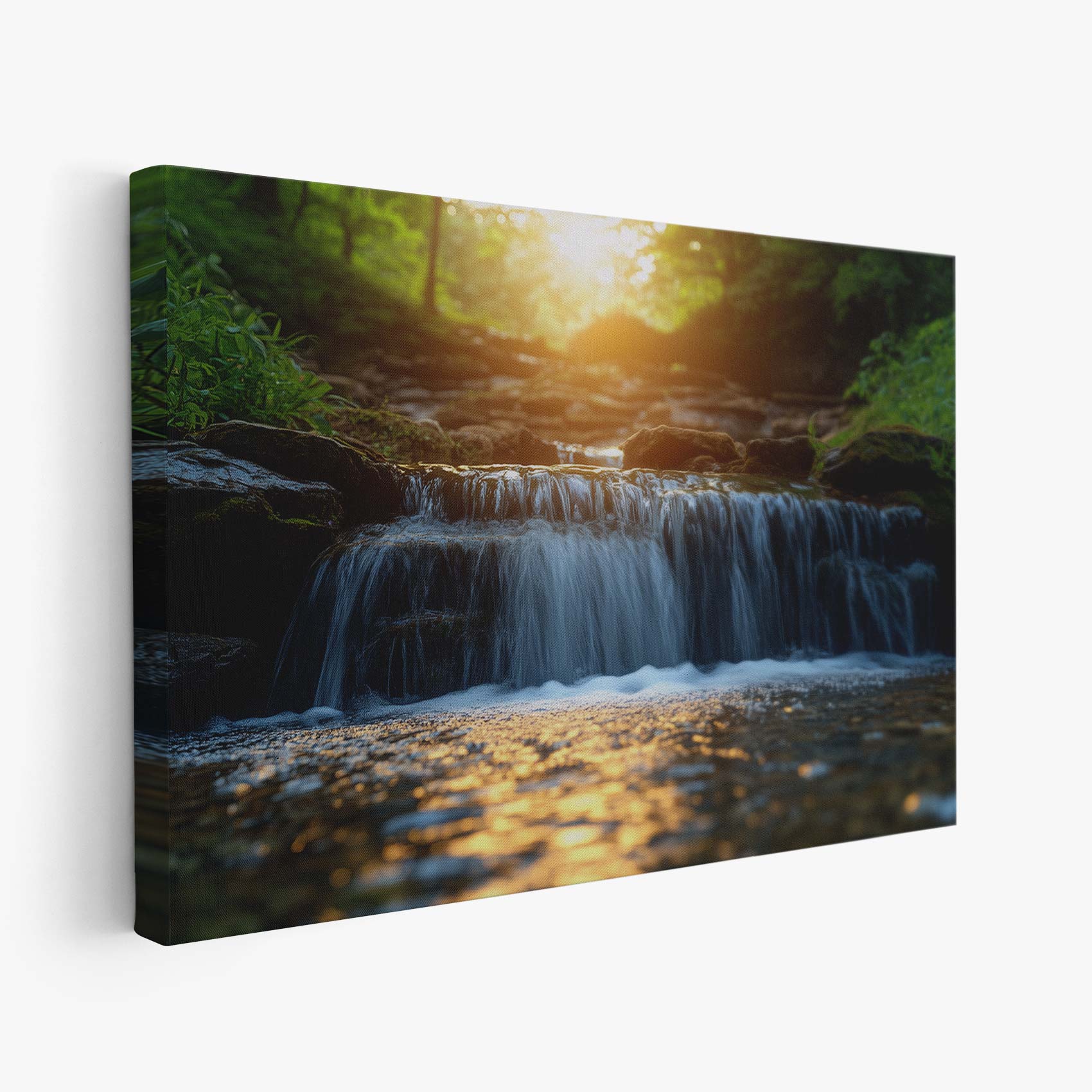 Zonnig boswaterval tafereel