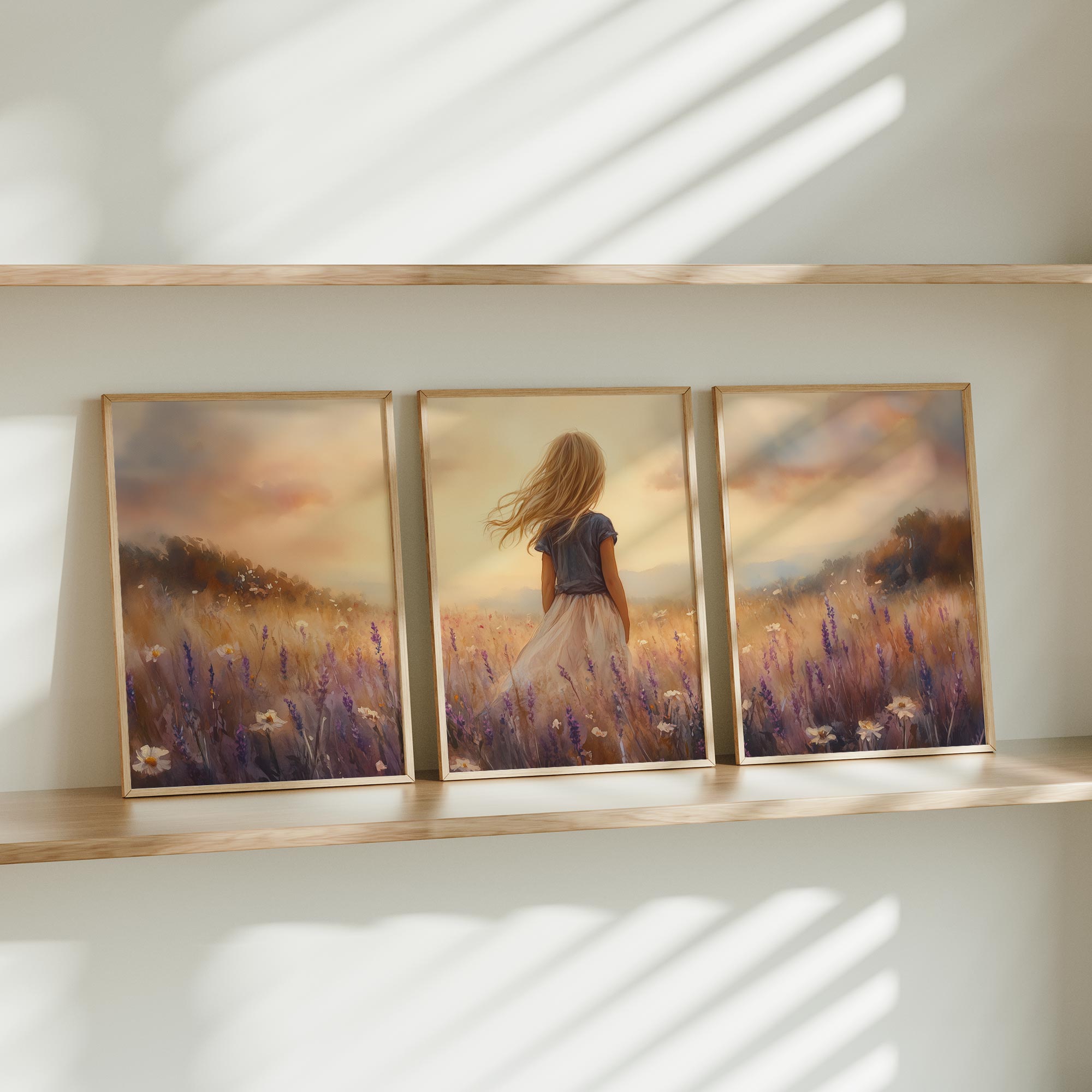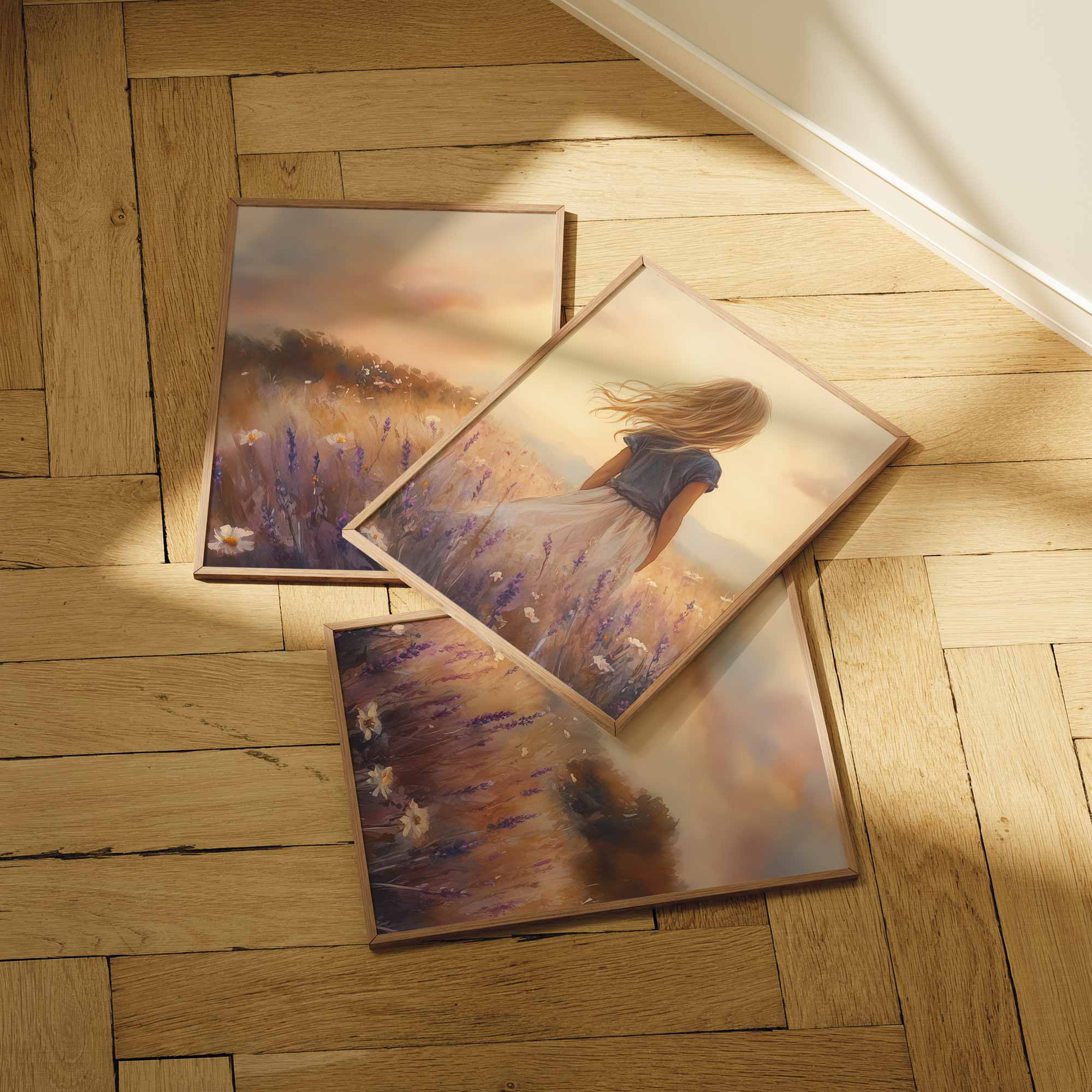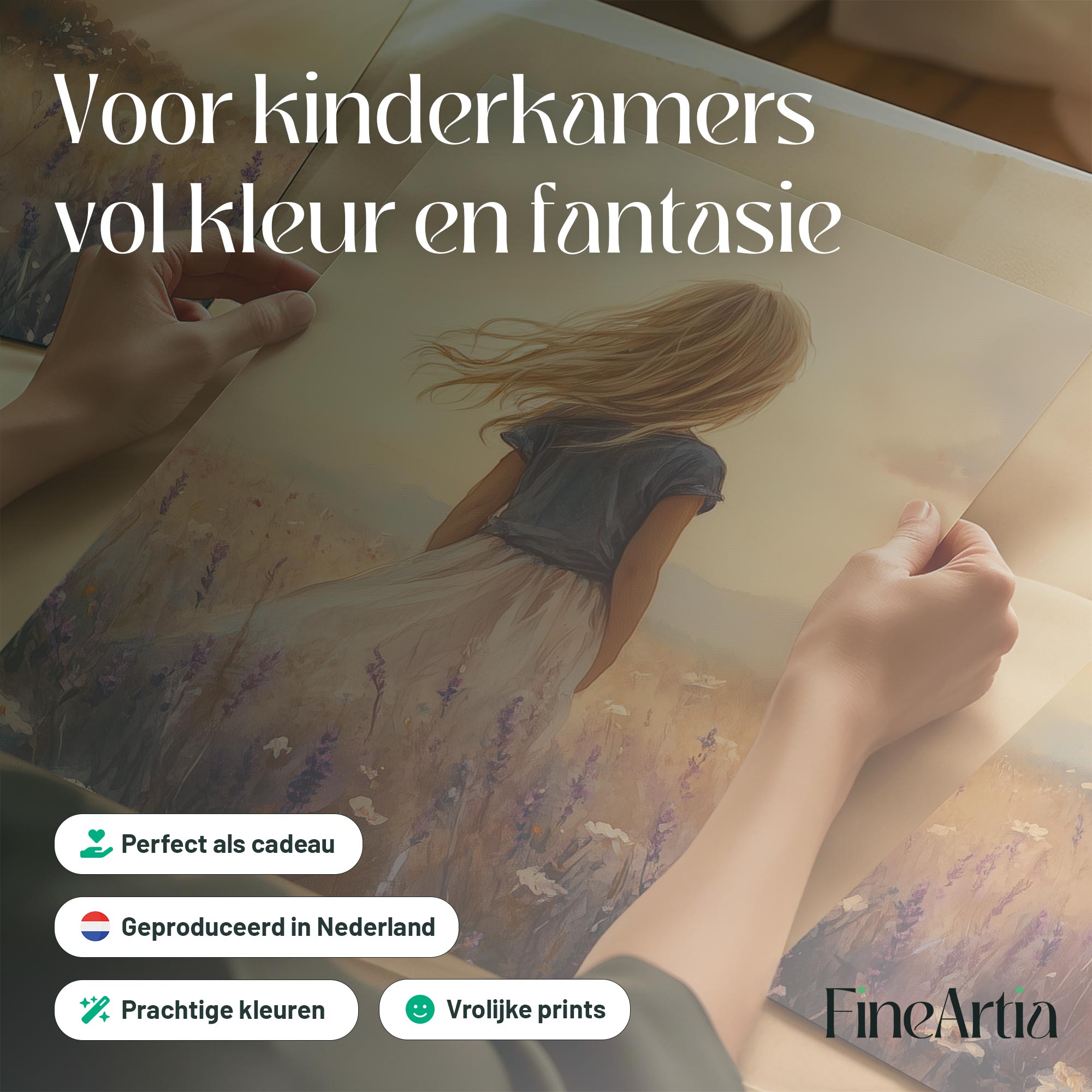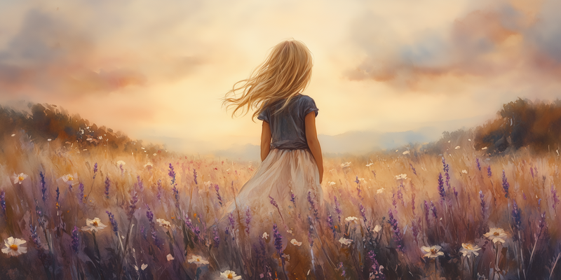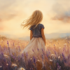 Zonnig Meisje in Bloemenveld met Zonsondergang