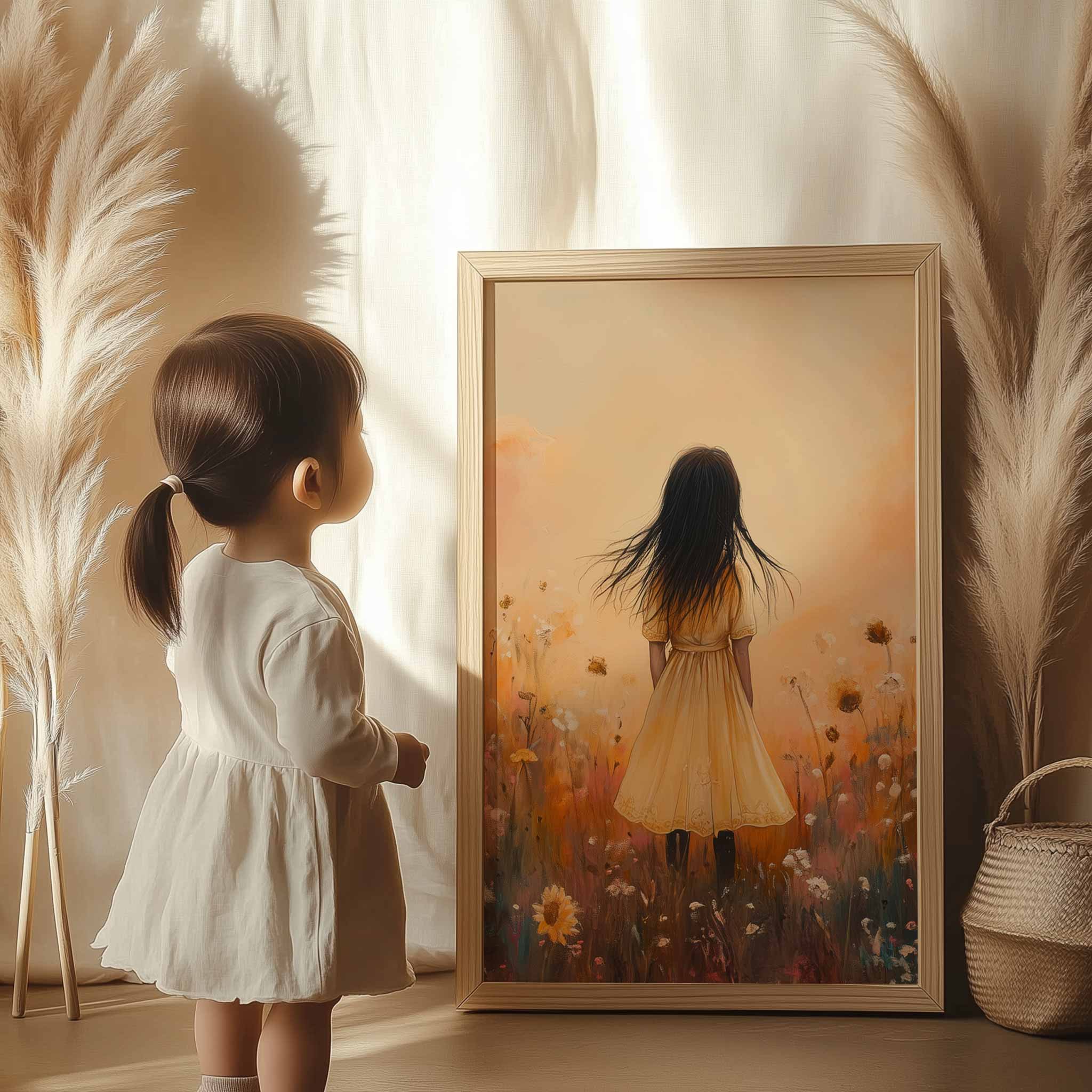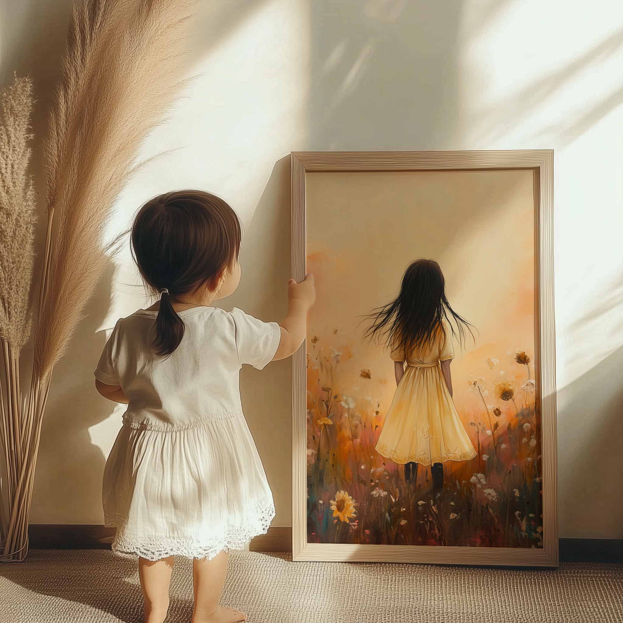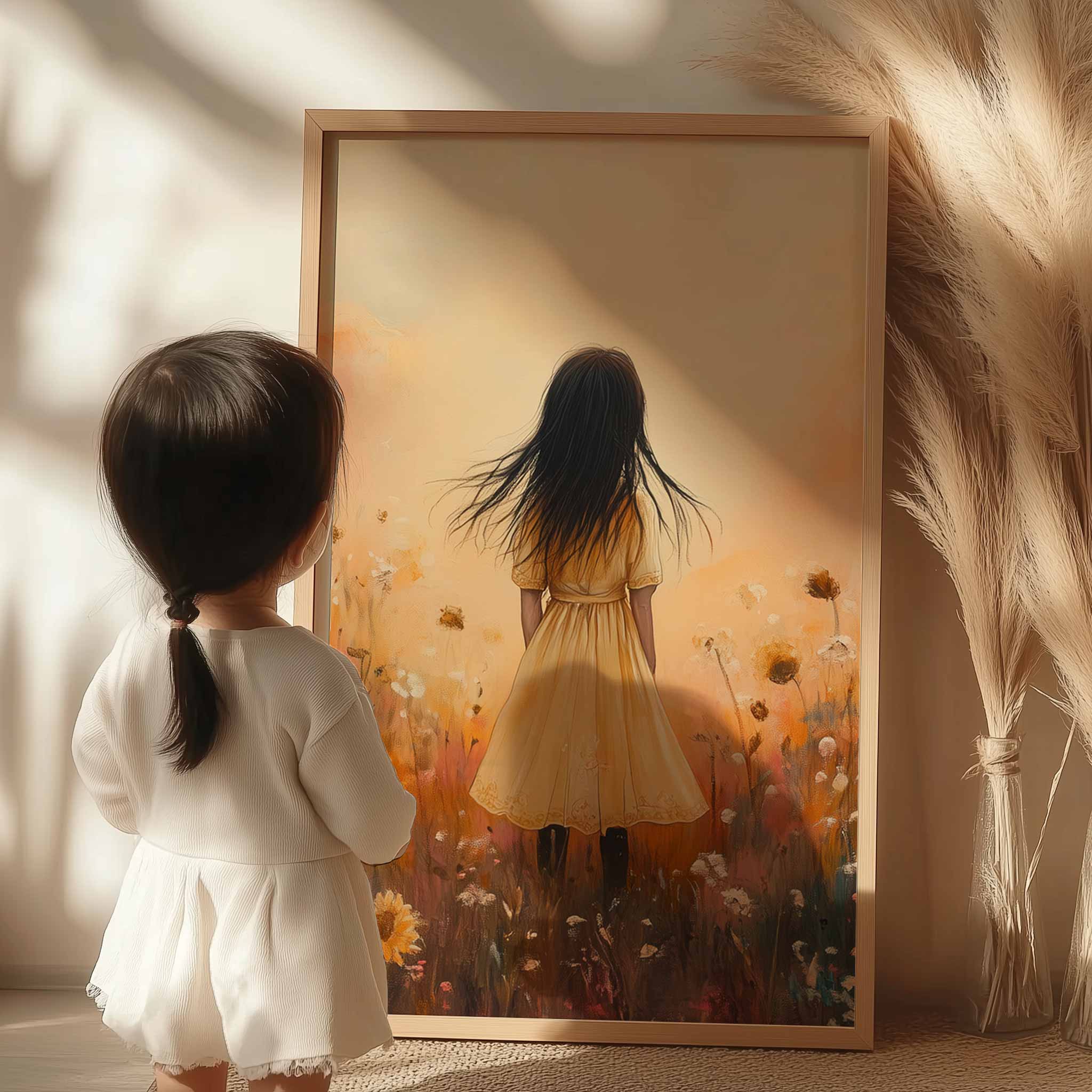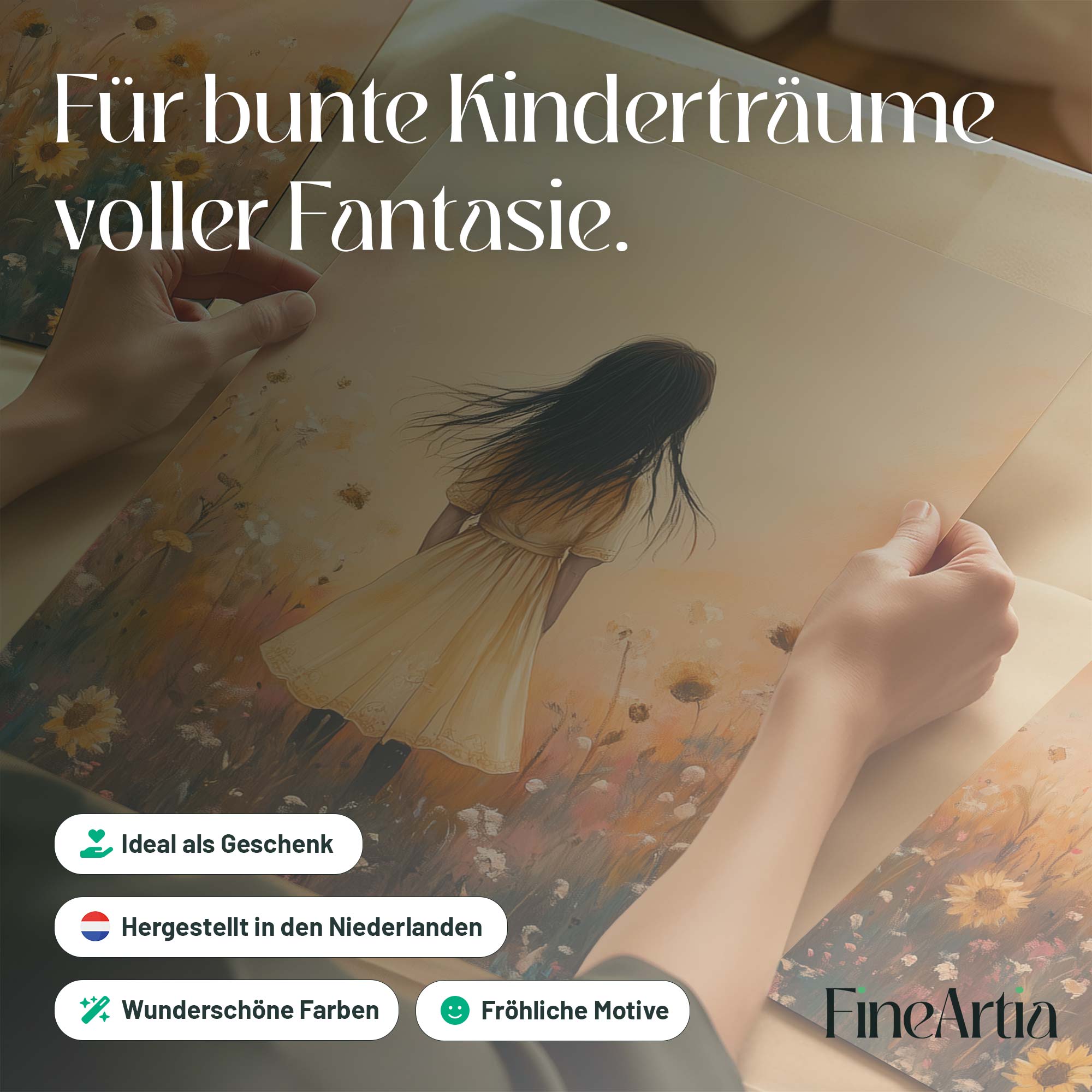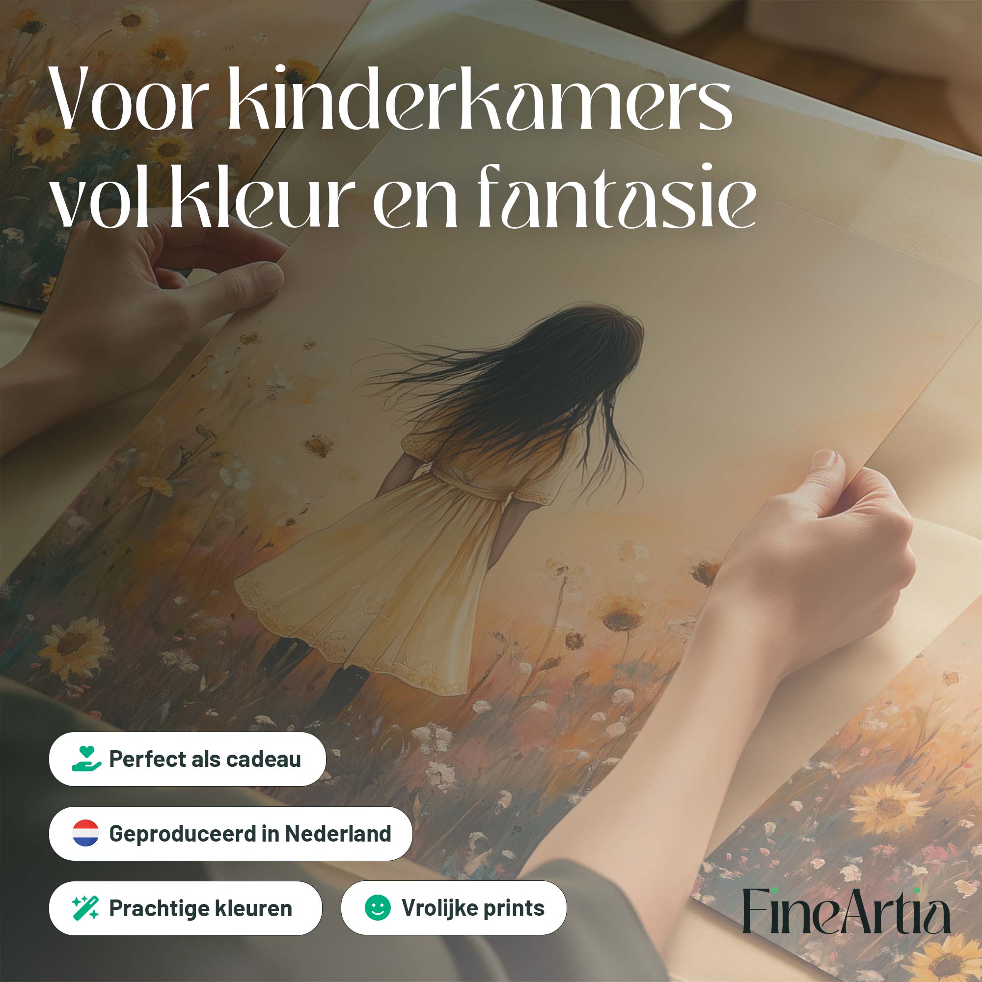Zonnig Meisje in Bloemenveld – Vrolijke Kinderdecoratie