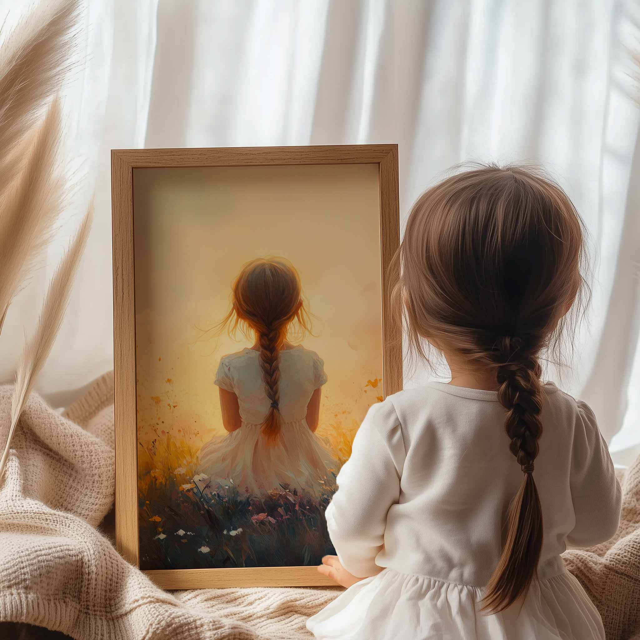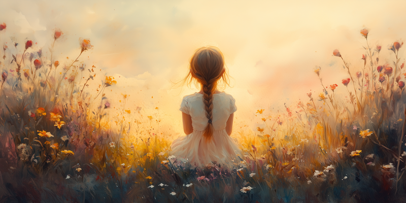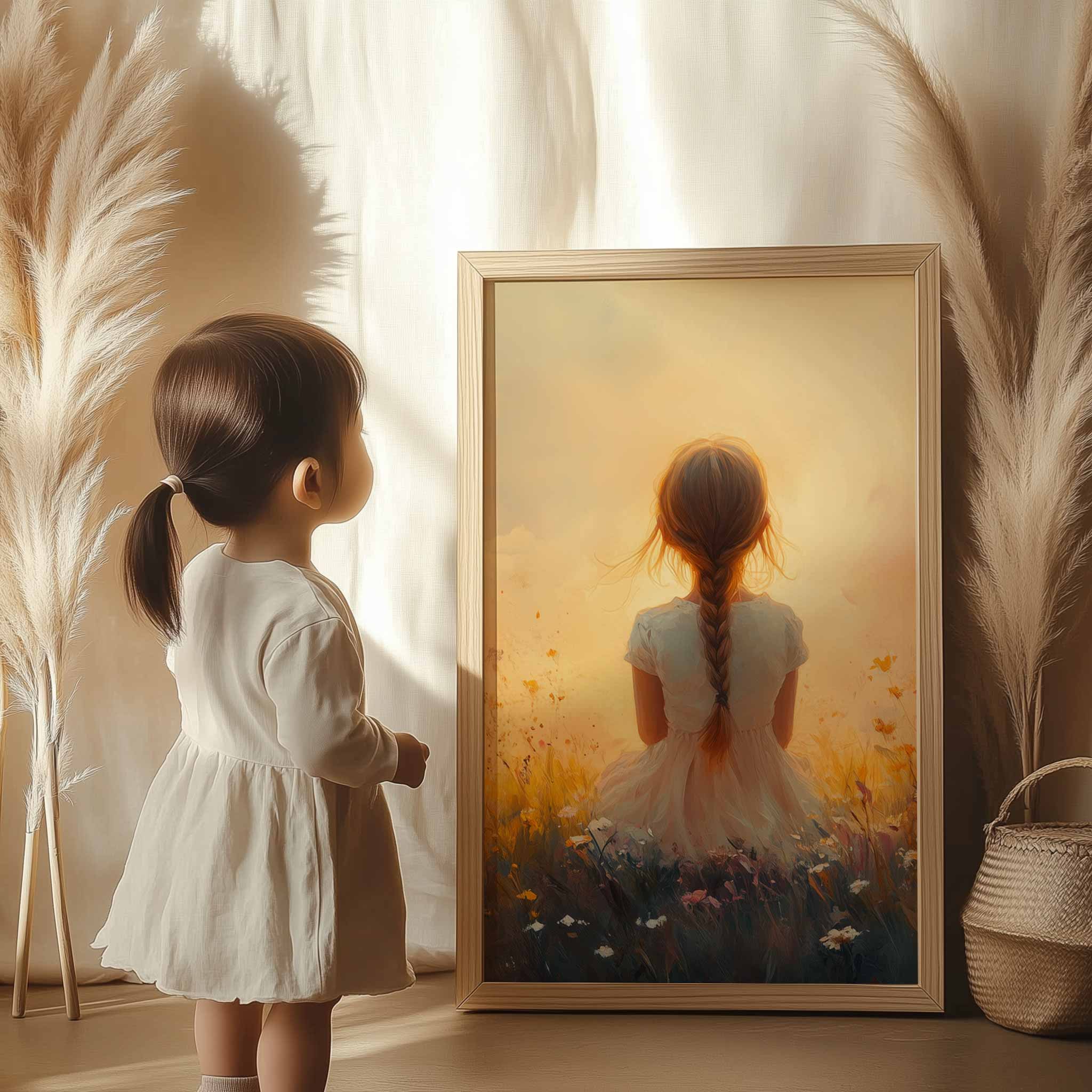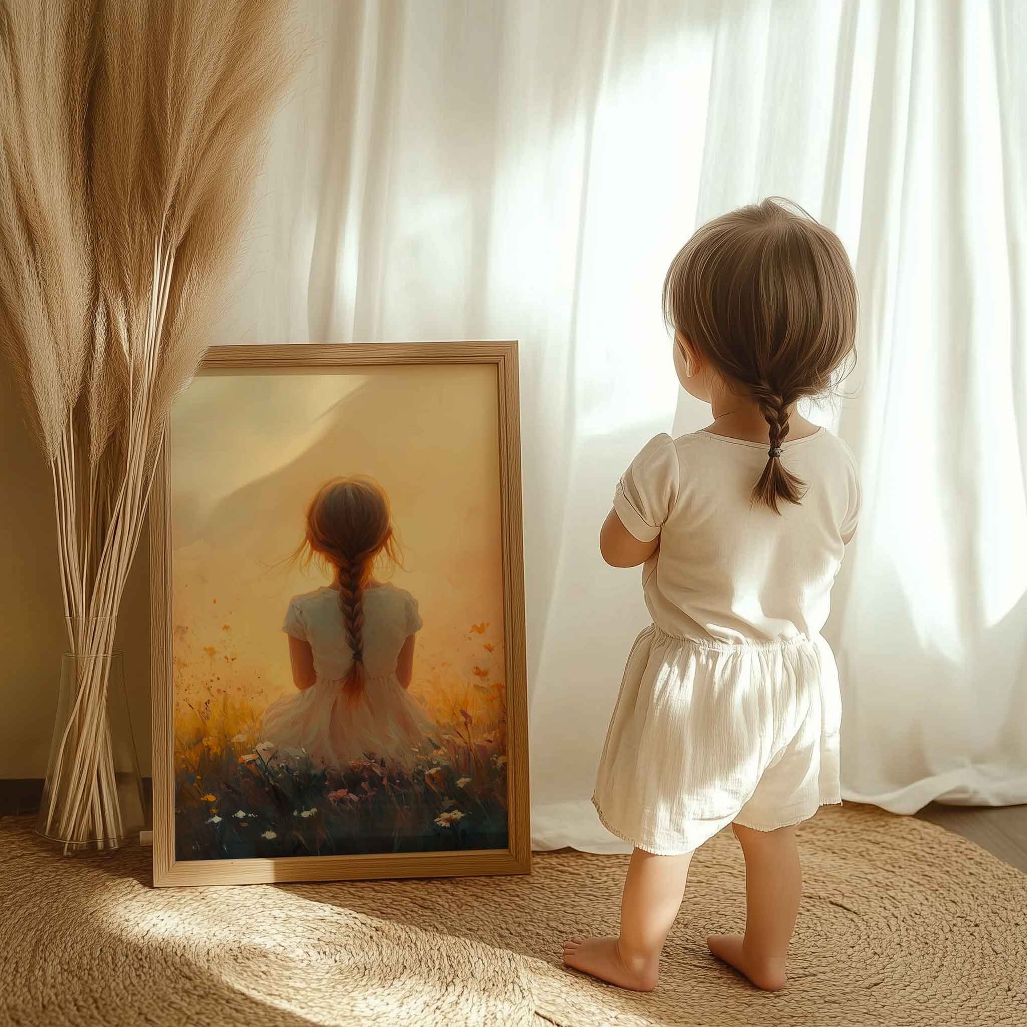Terug naar collectie Posters Zonnig Meisje in Bloemenveld – Vrolijke Witte Jurk