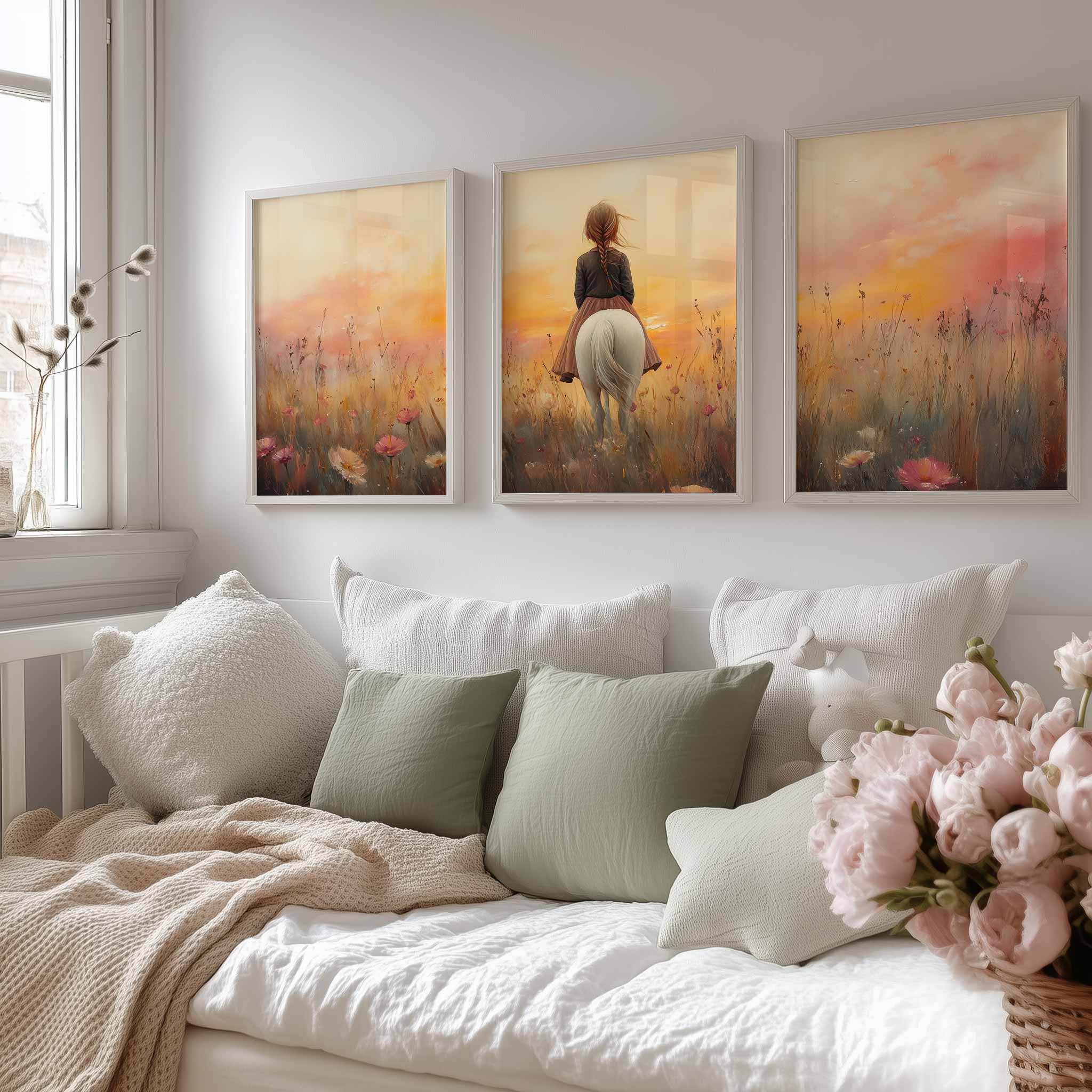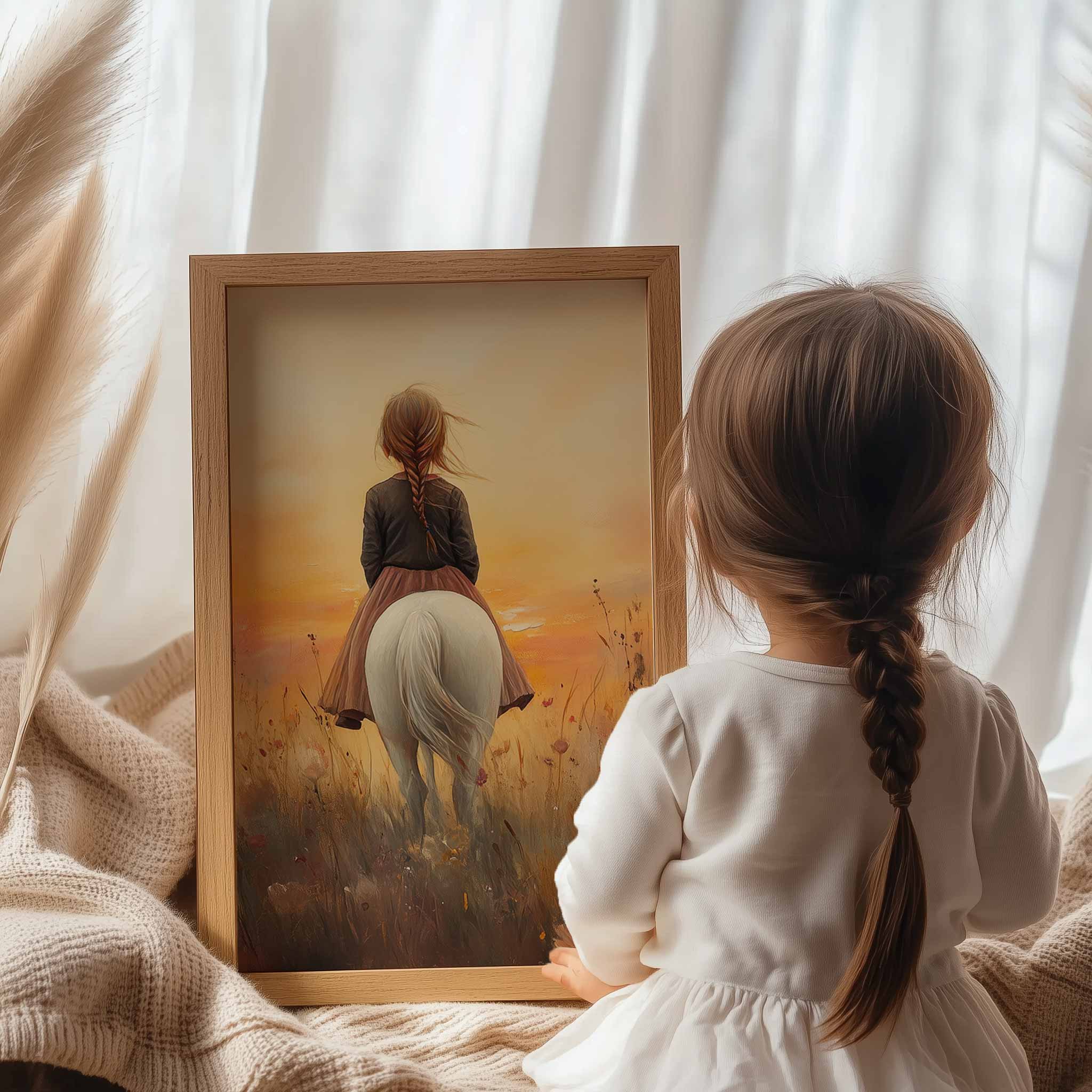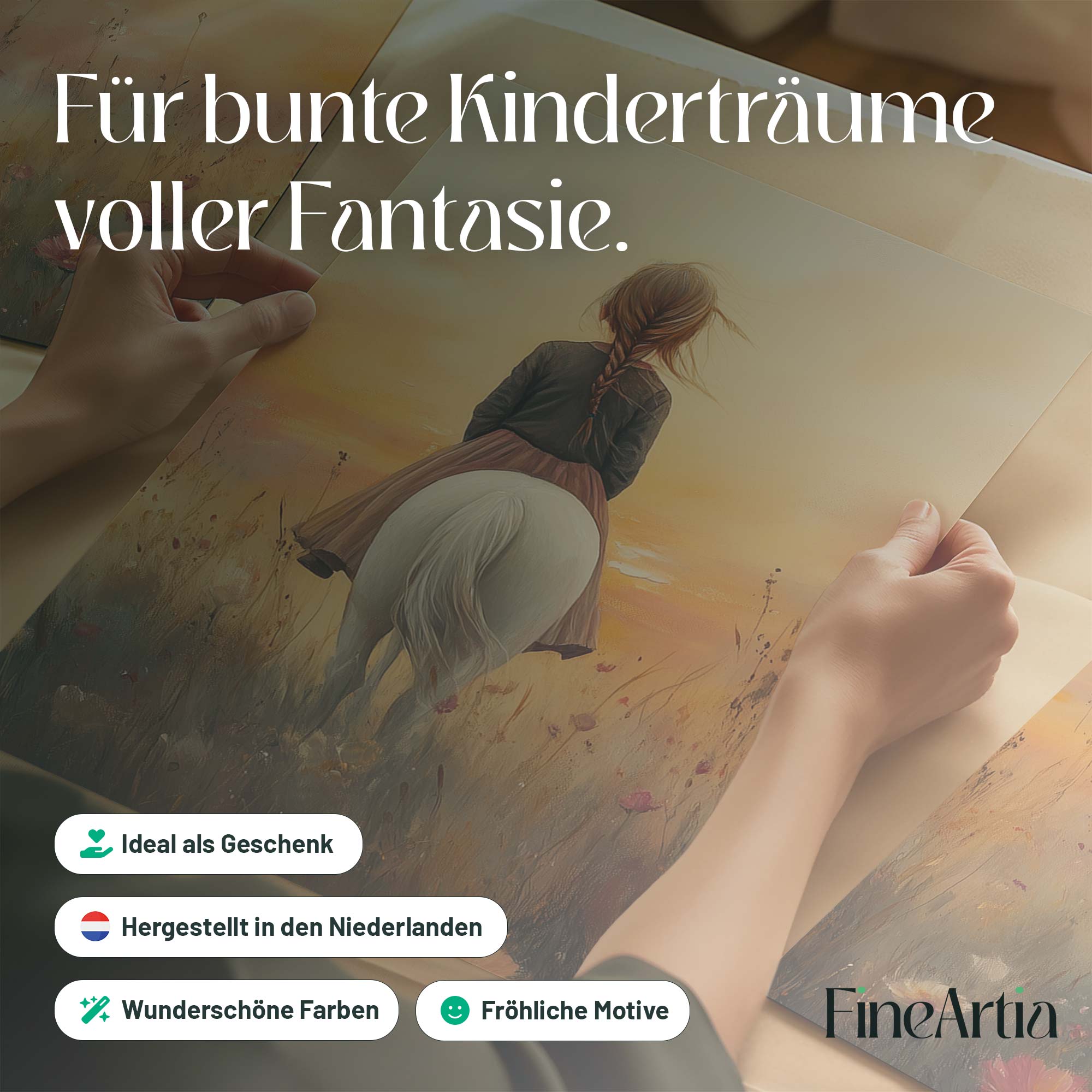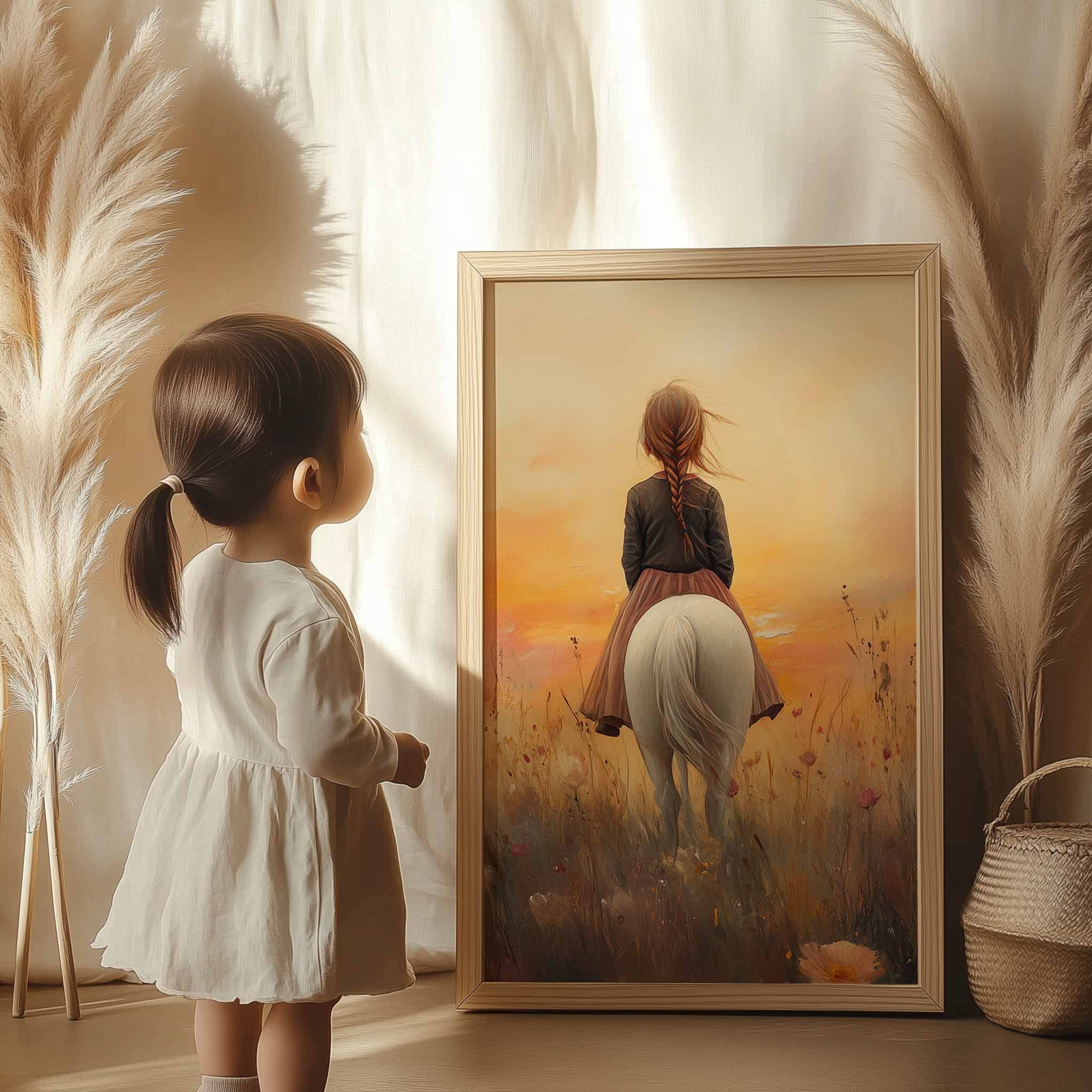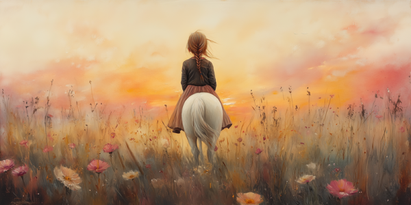 Zonnig Meisje op Witte Paard in Bloemenveld