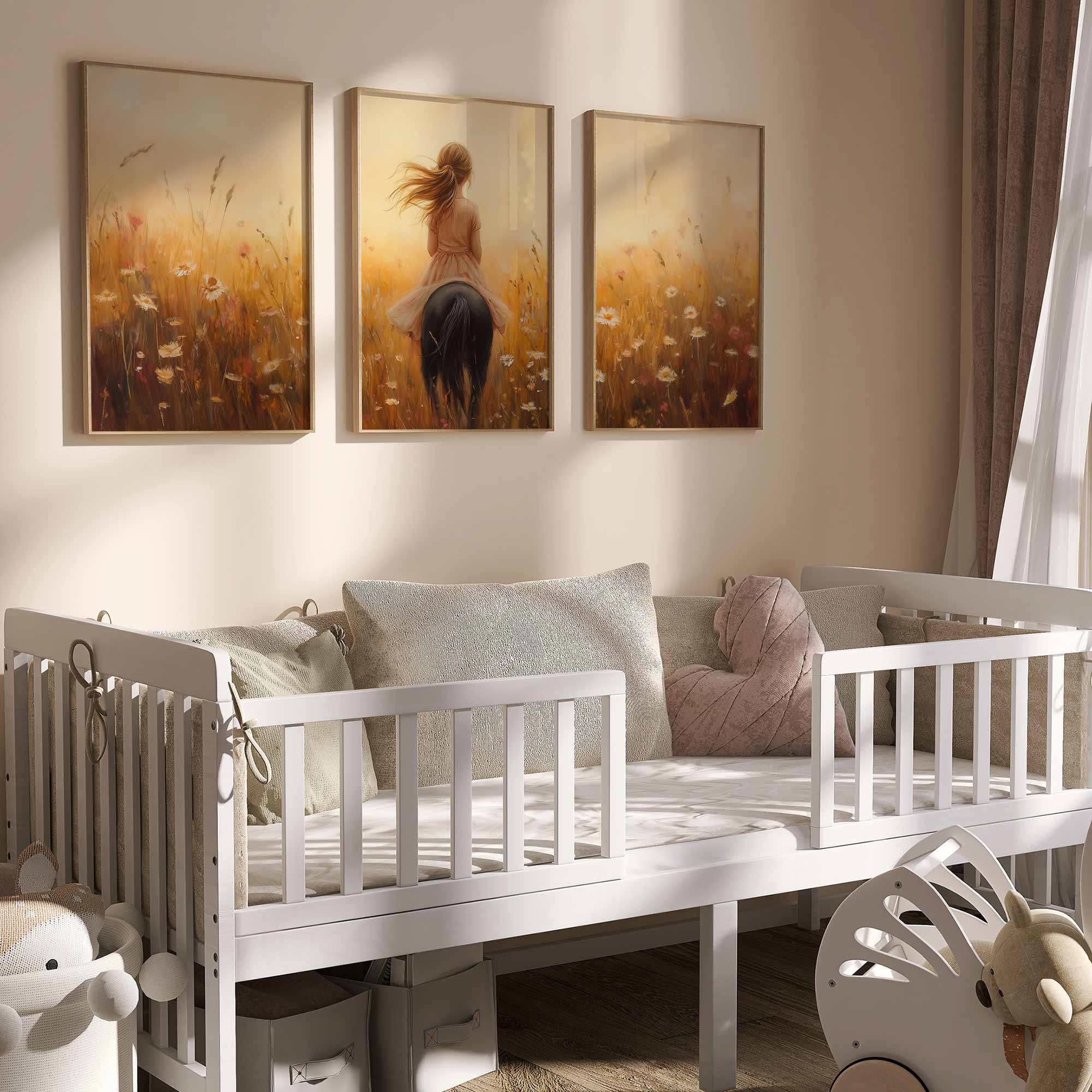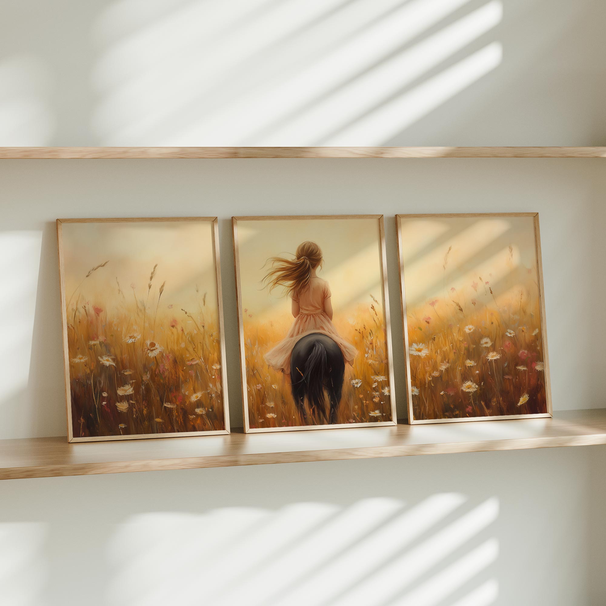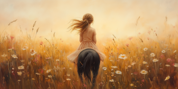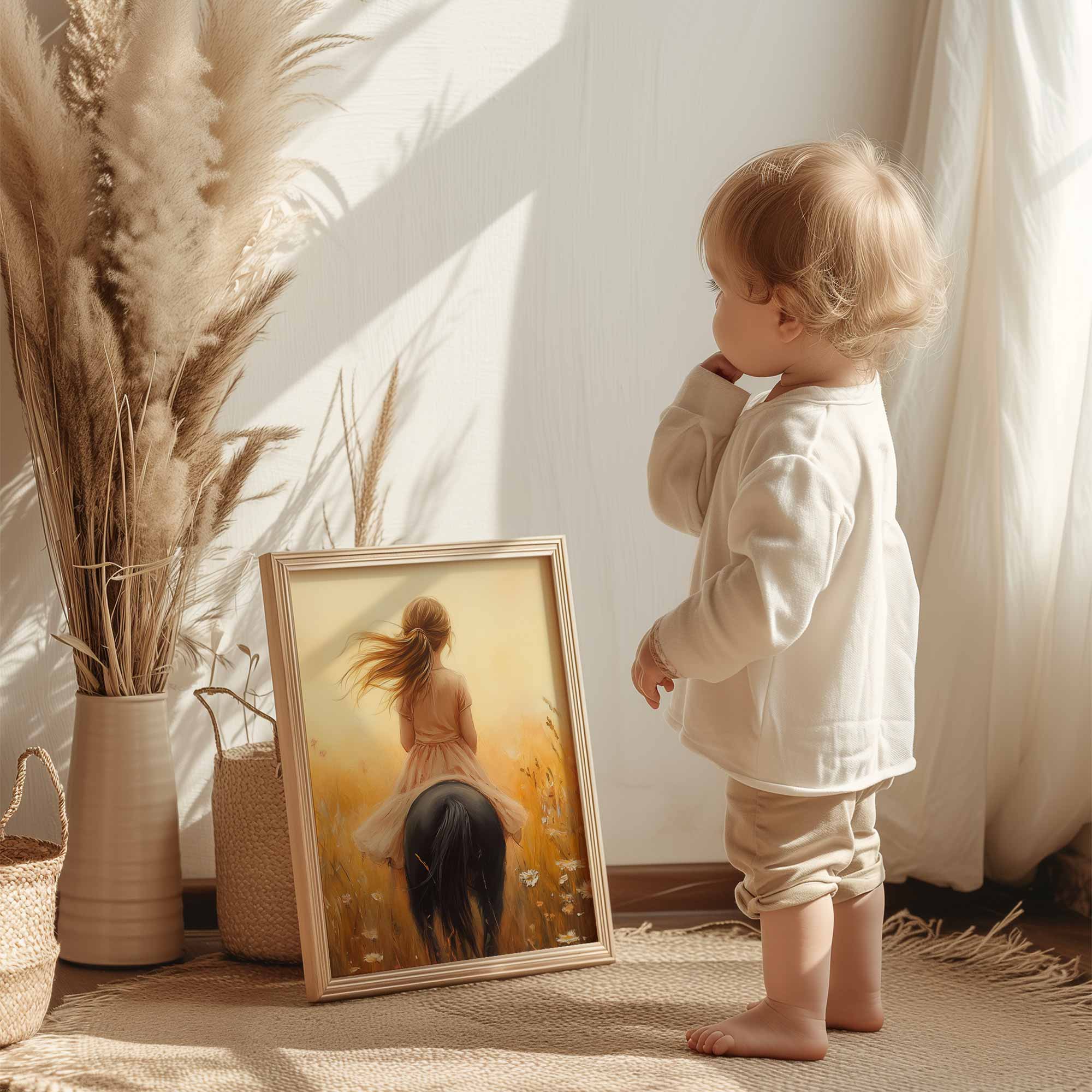 Terug naar collectie Posters Zonnig Paardrijavontuur in Bloemenveld