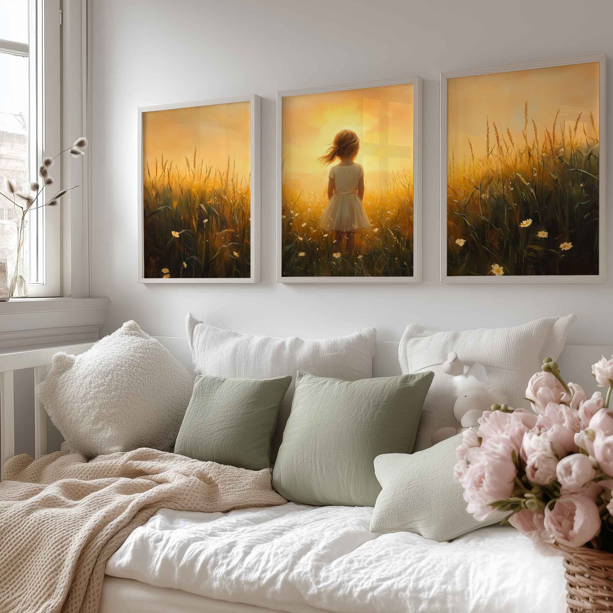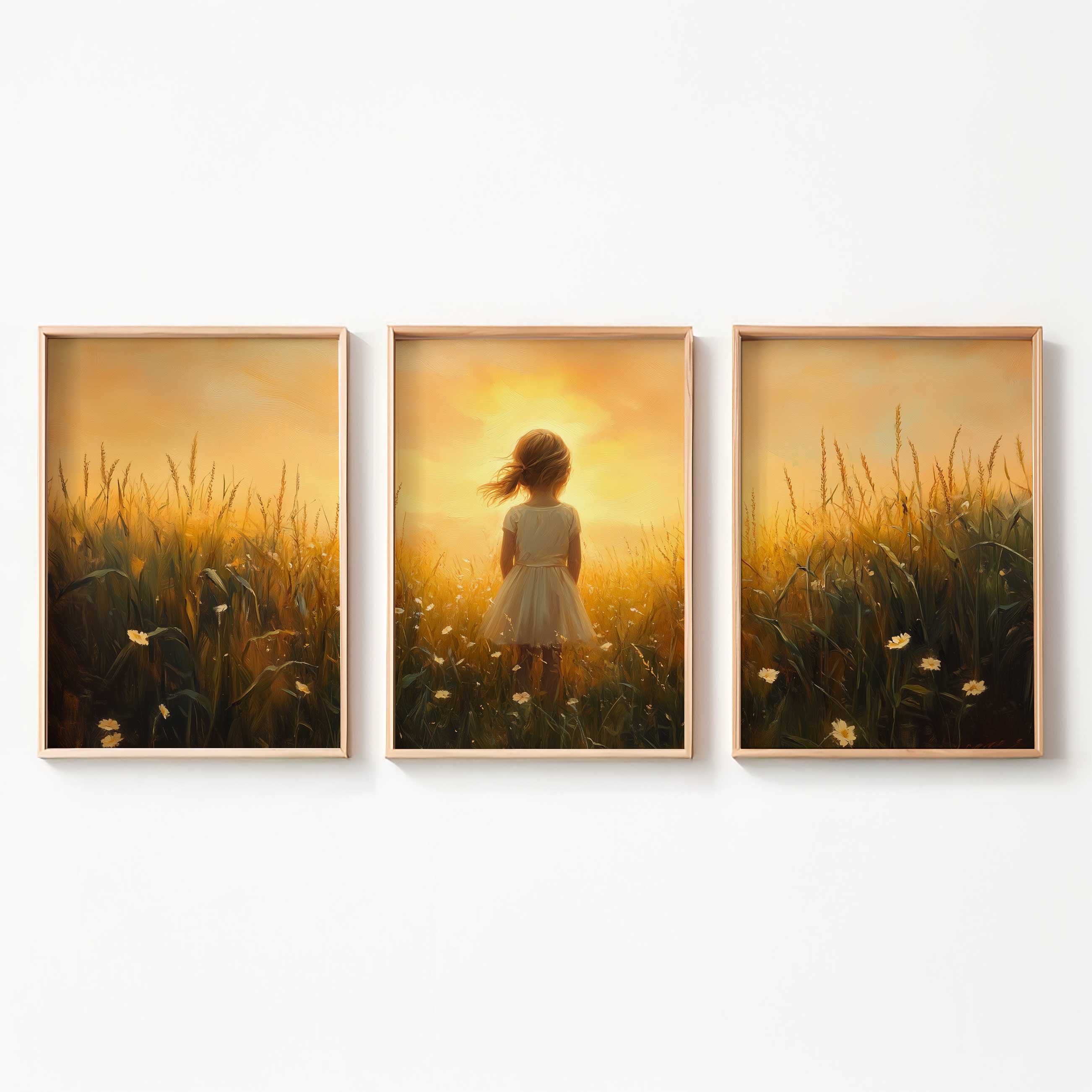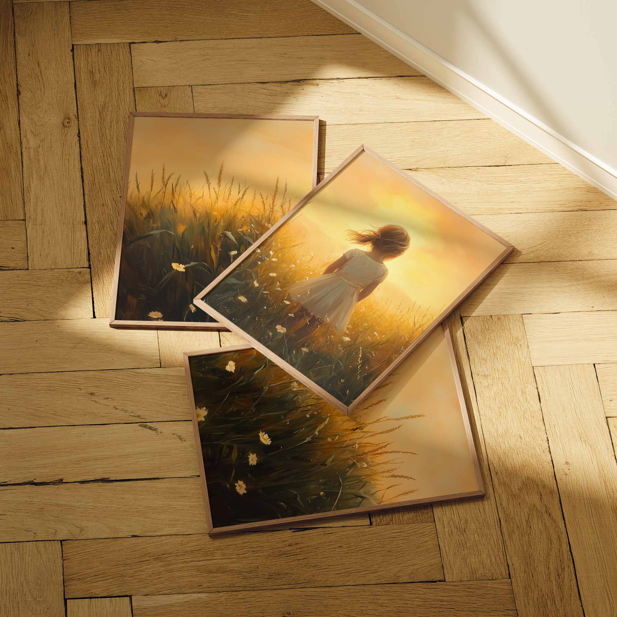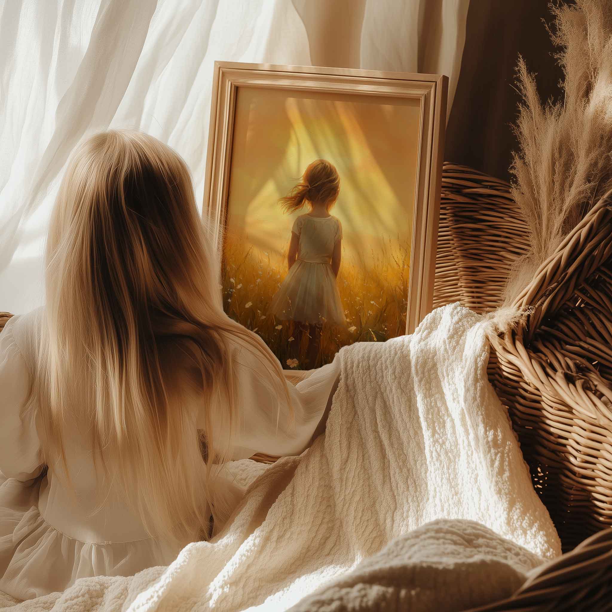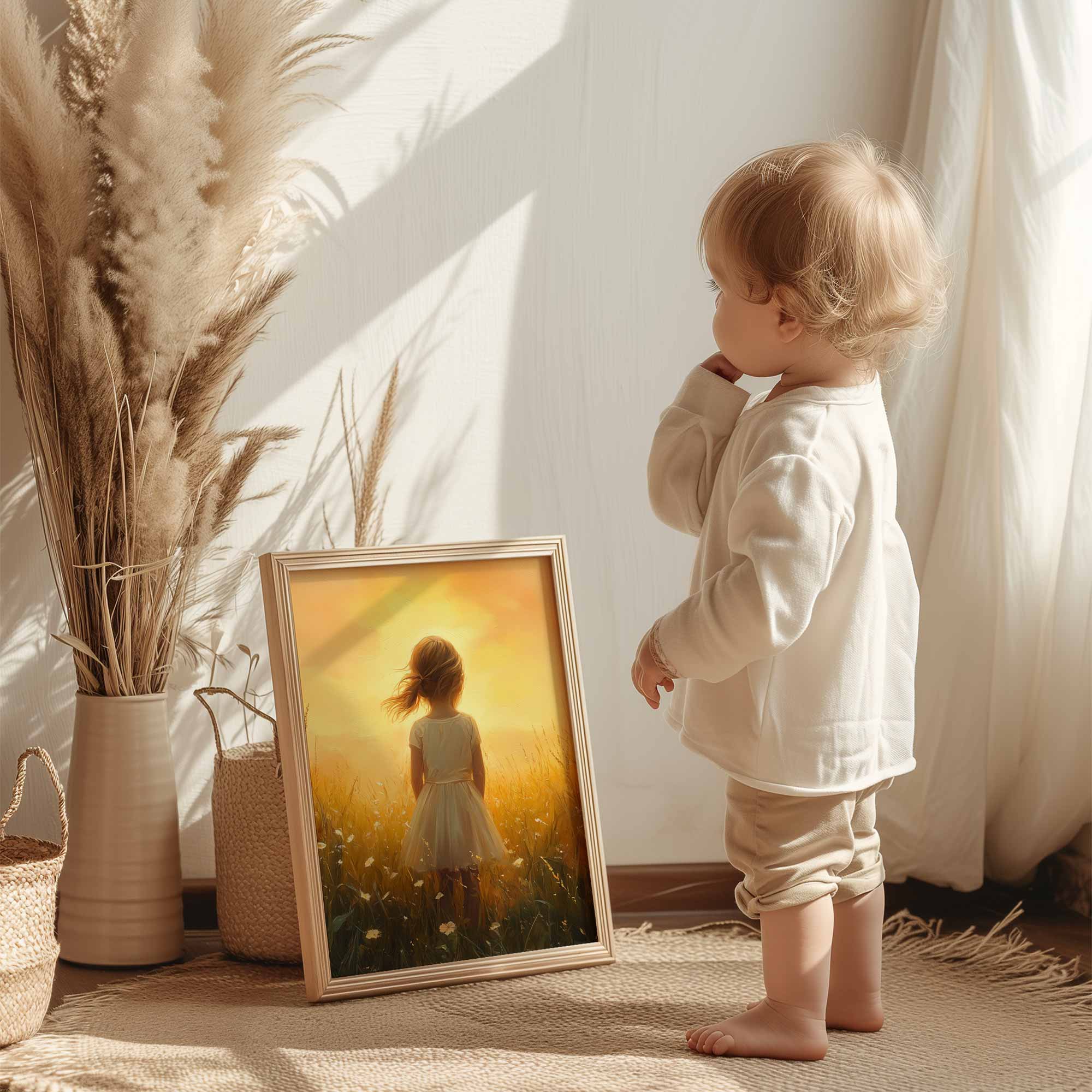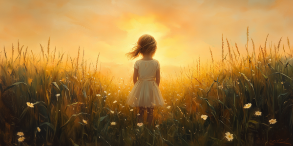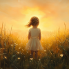 Zonnige Zomerweide met Meisje in Witte Jurk
