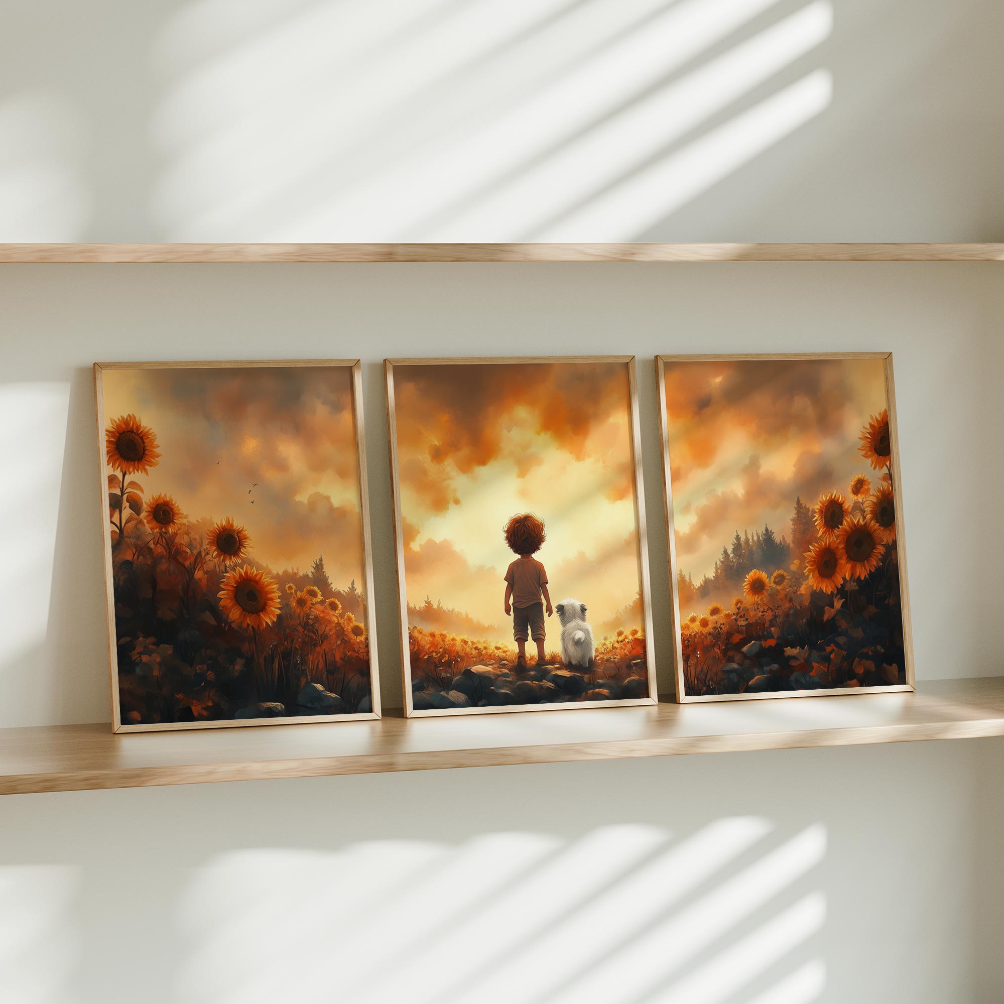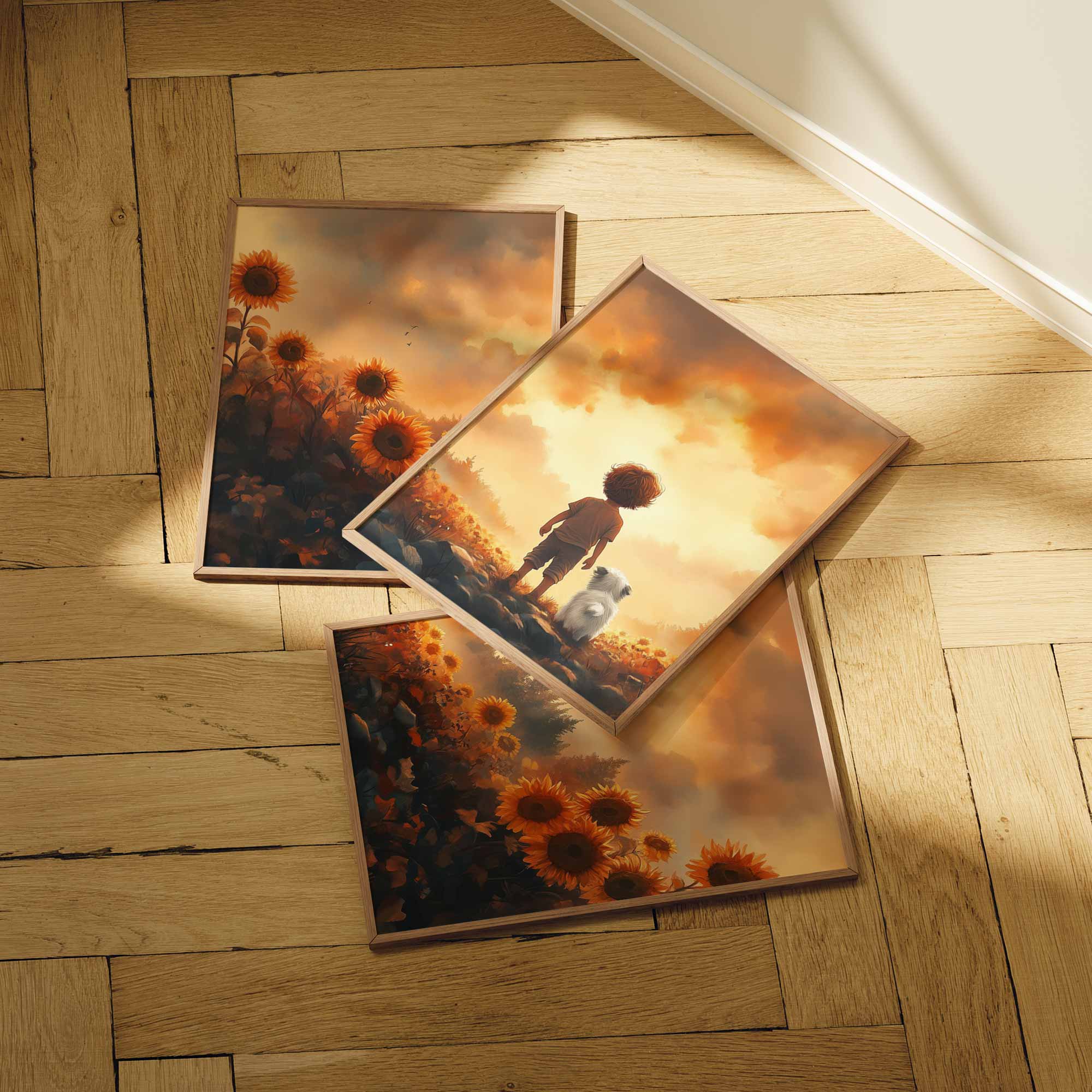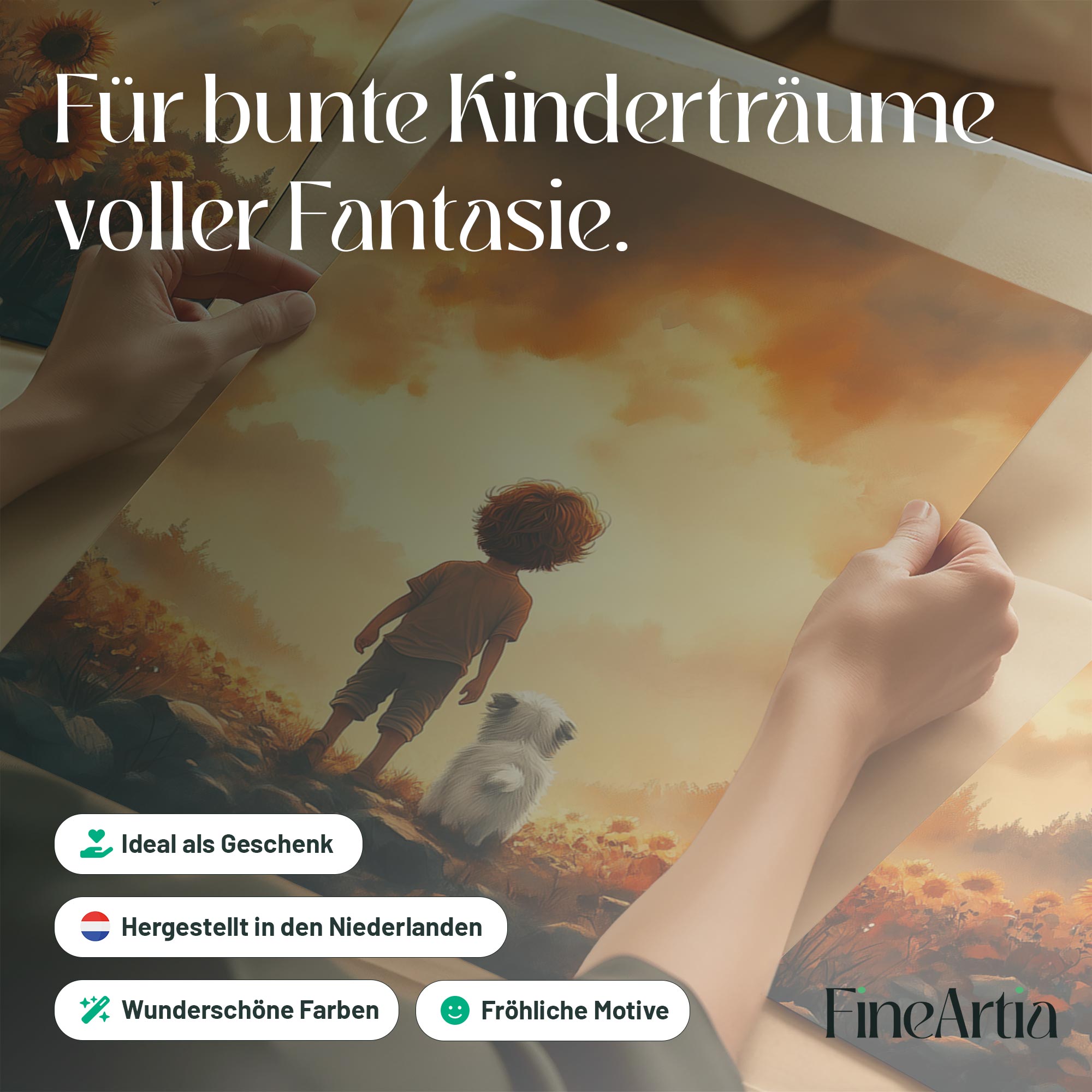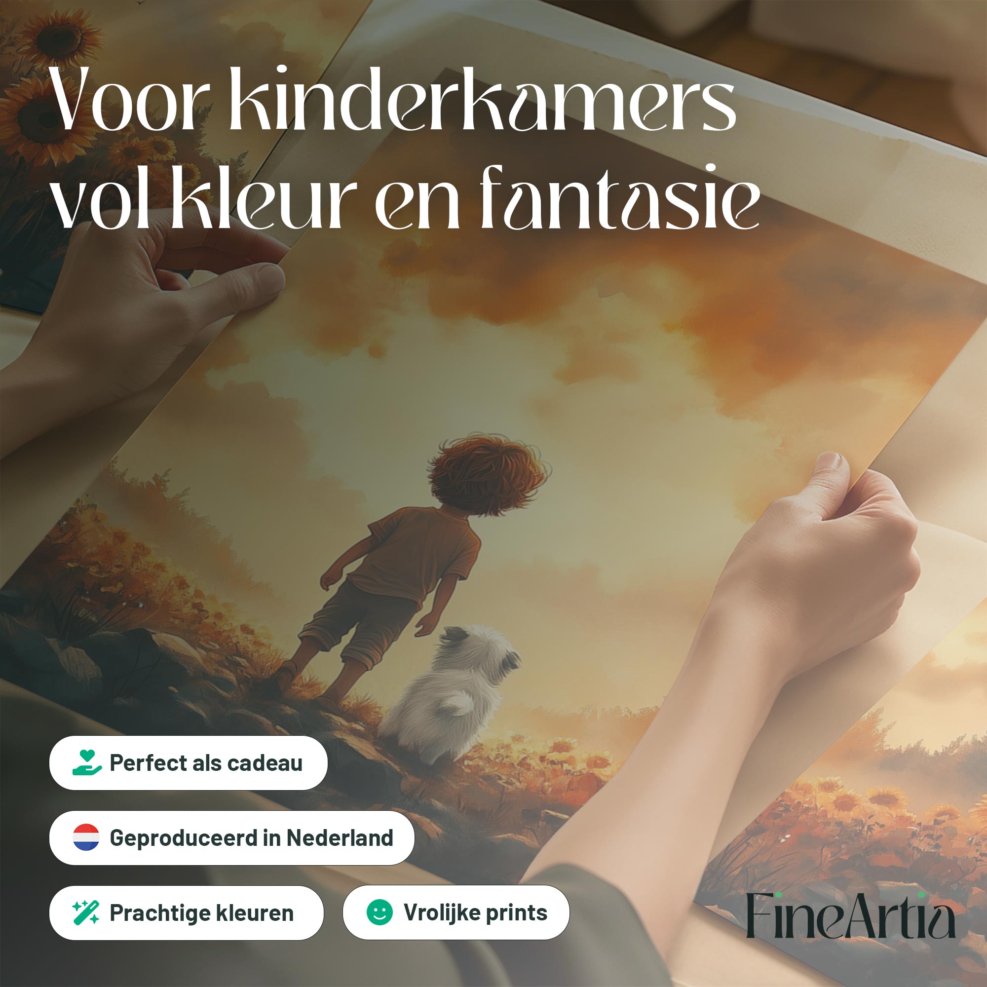 Terug naar collectie Posters Zonnige Zonnebloemavonturen met Jongen en Hond