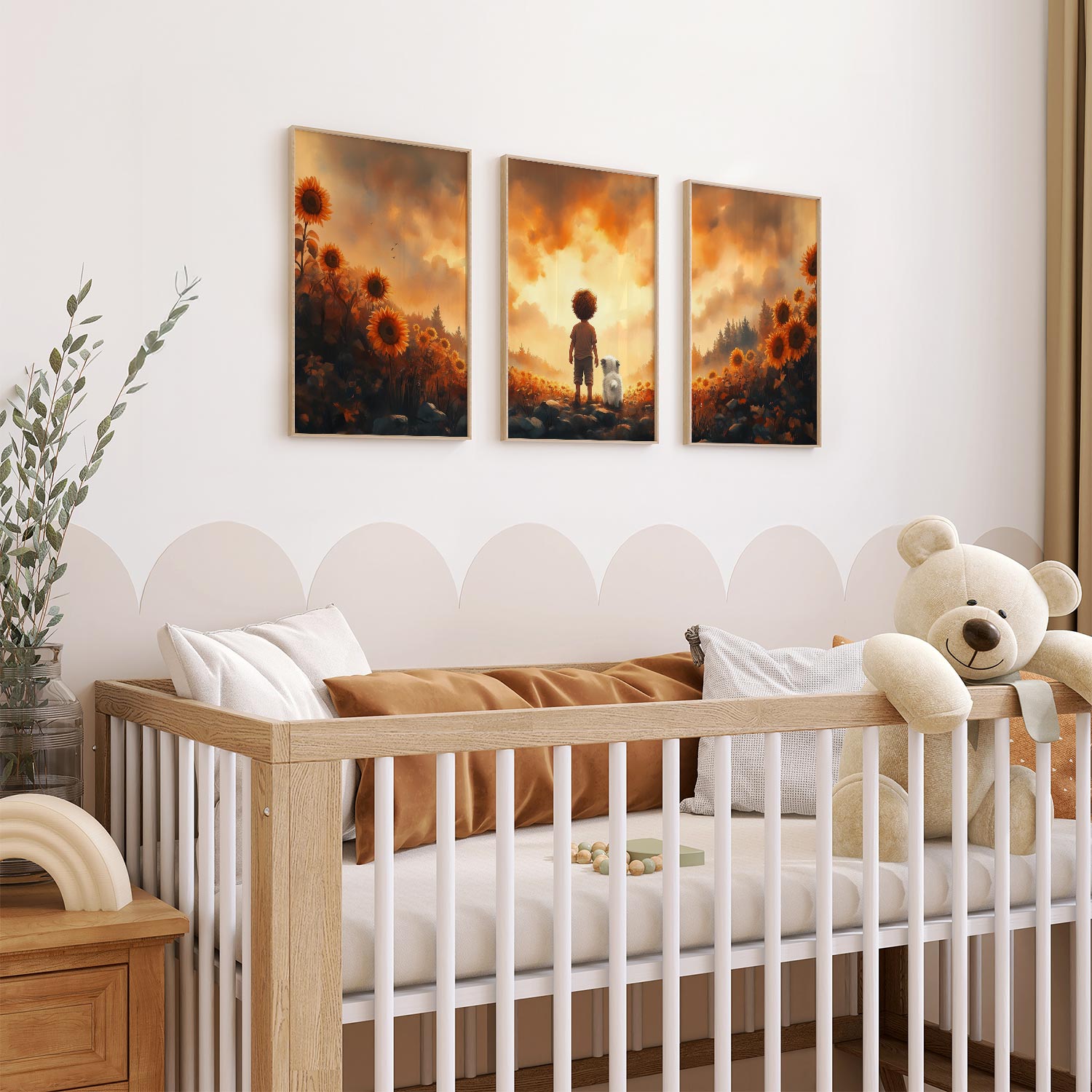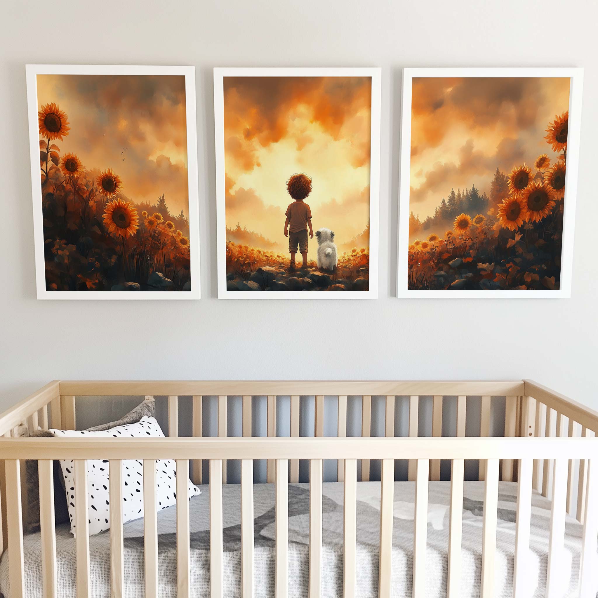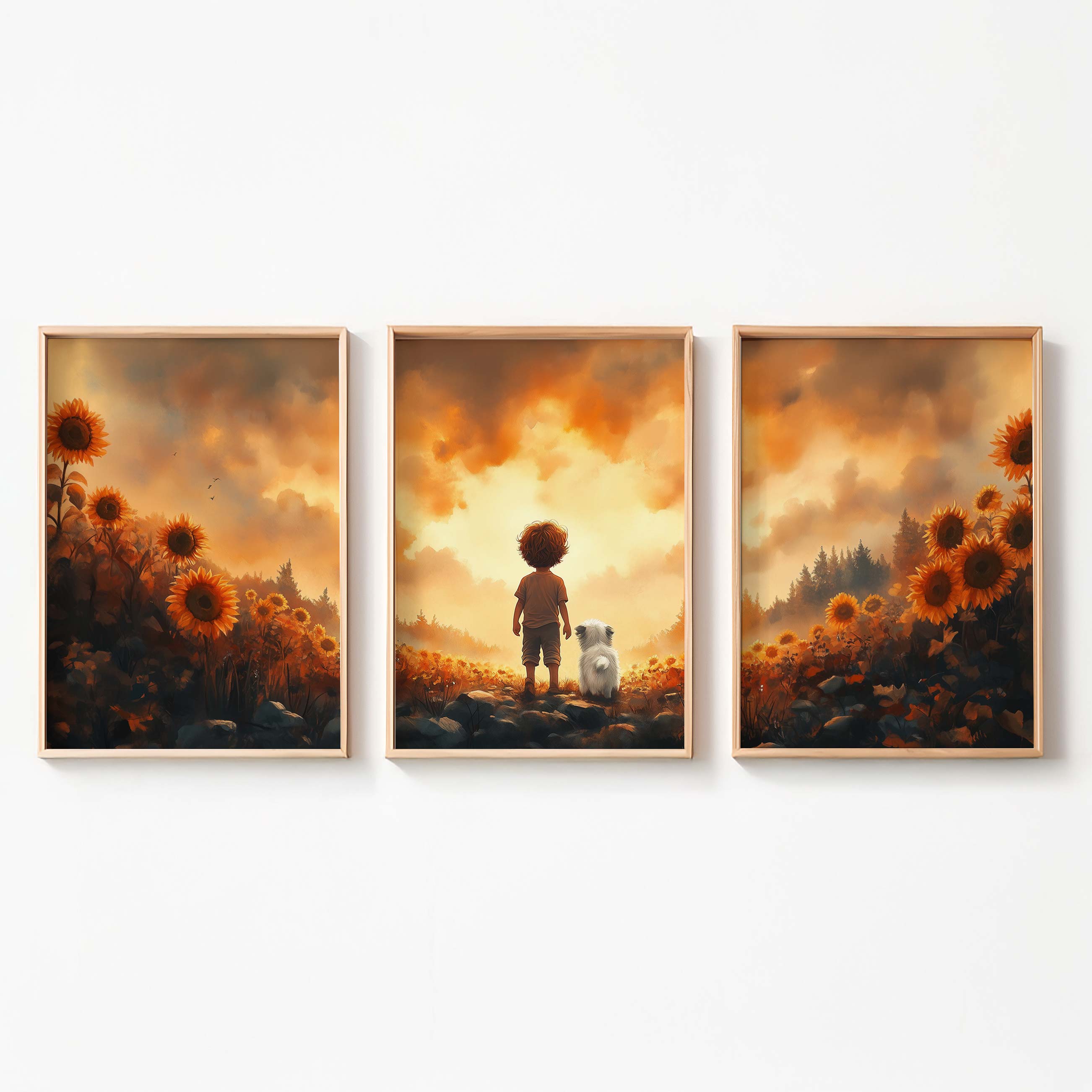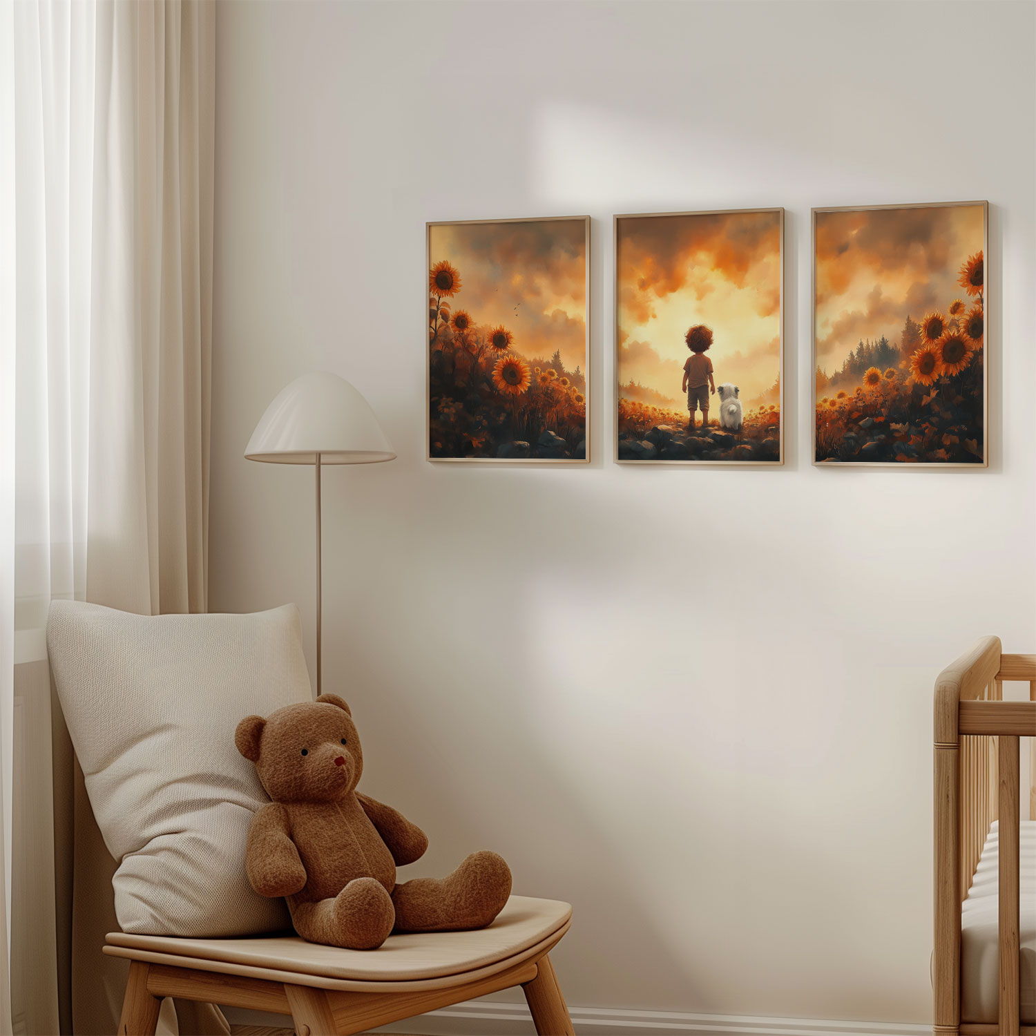 Terug naar collectie Posters Zonnige Zonnebloemavonturen met Jongen en Hond