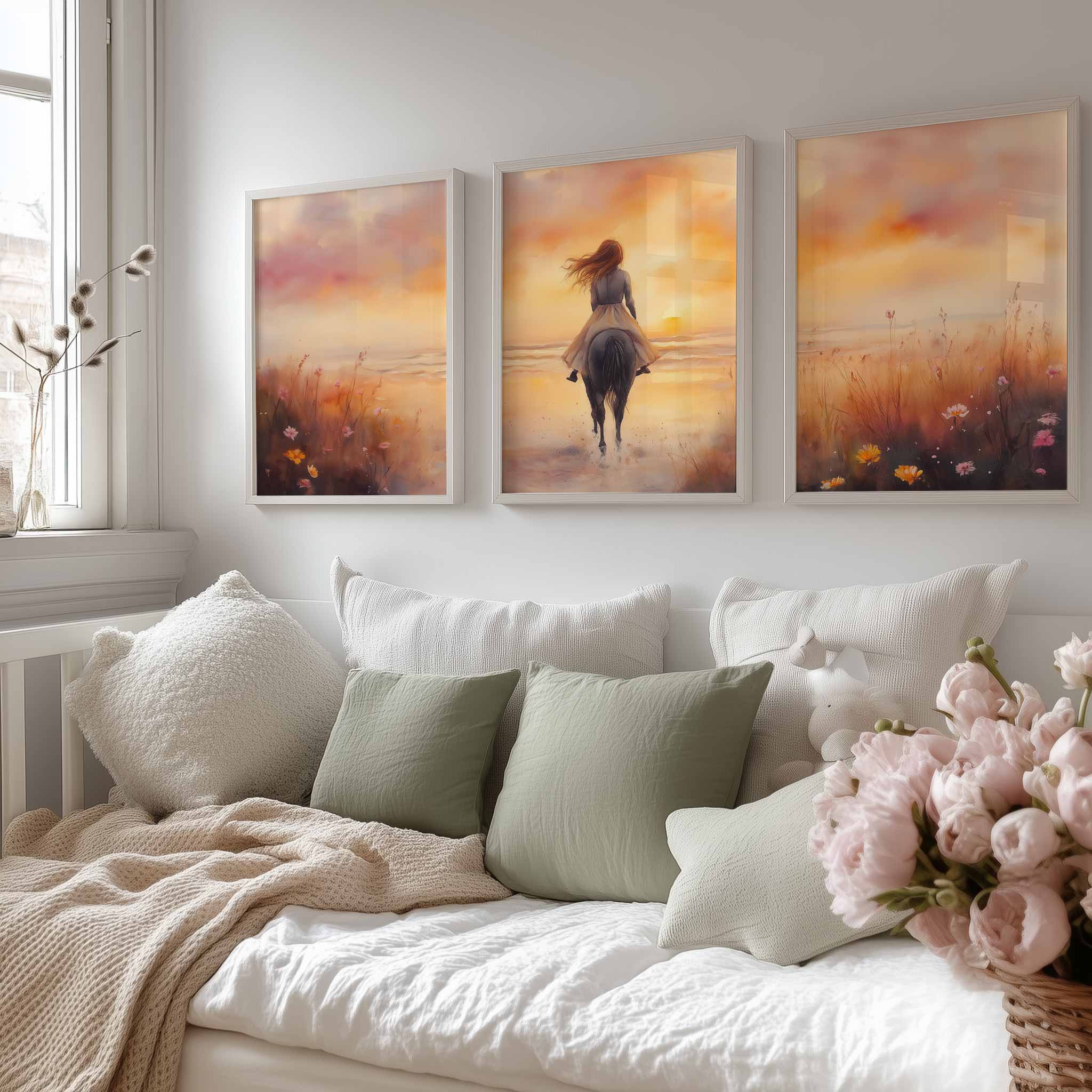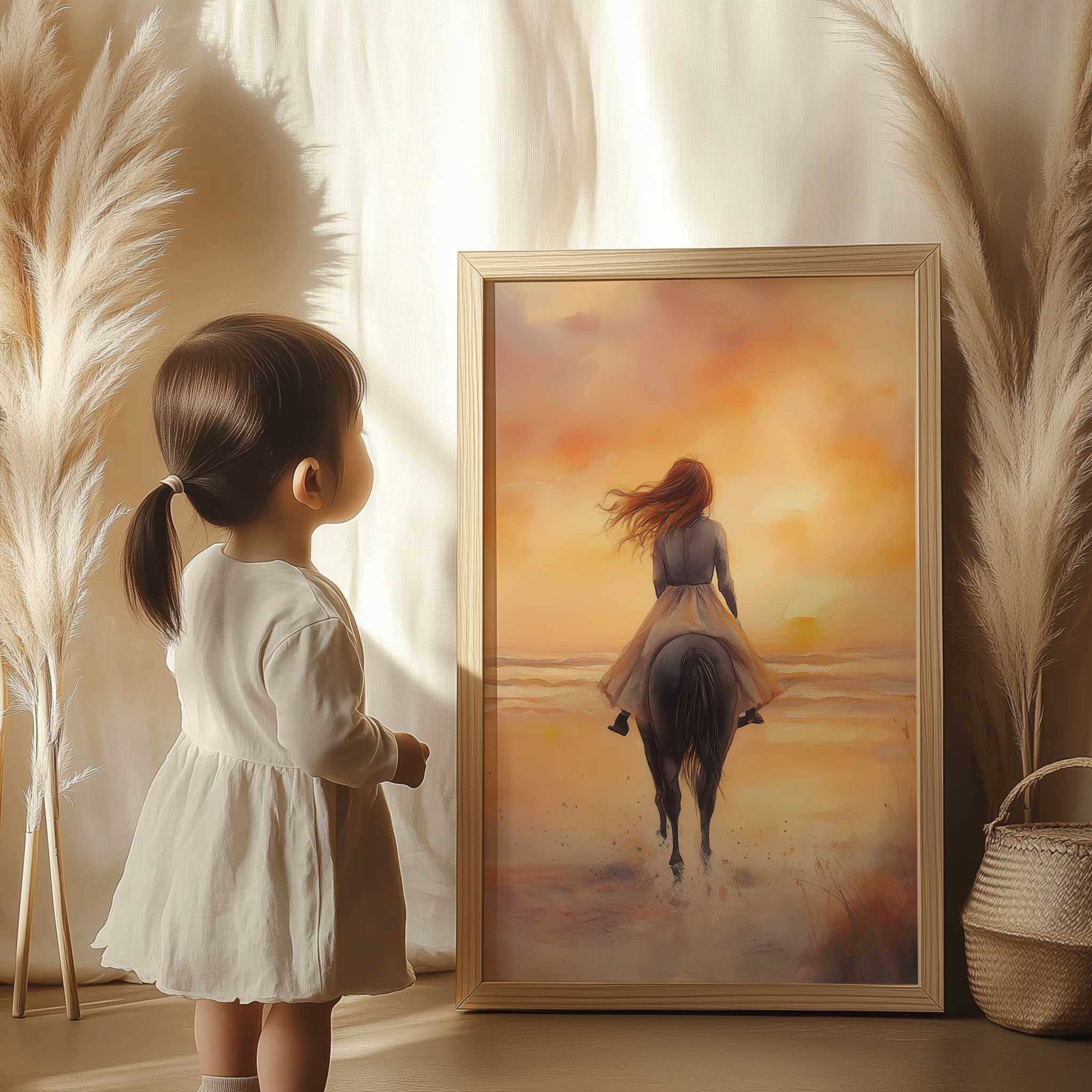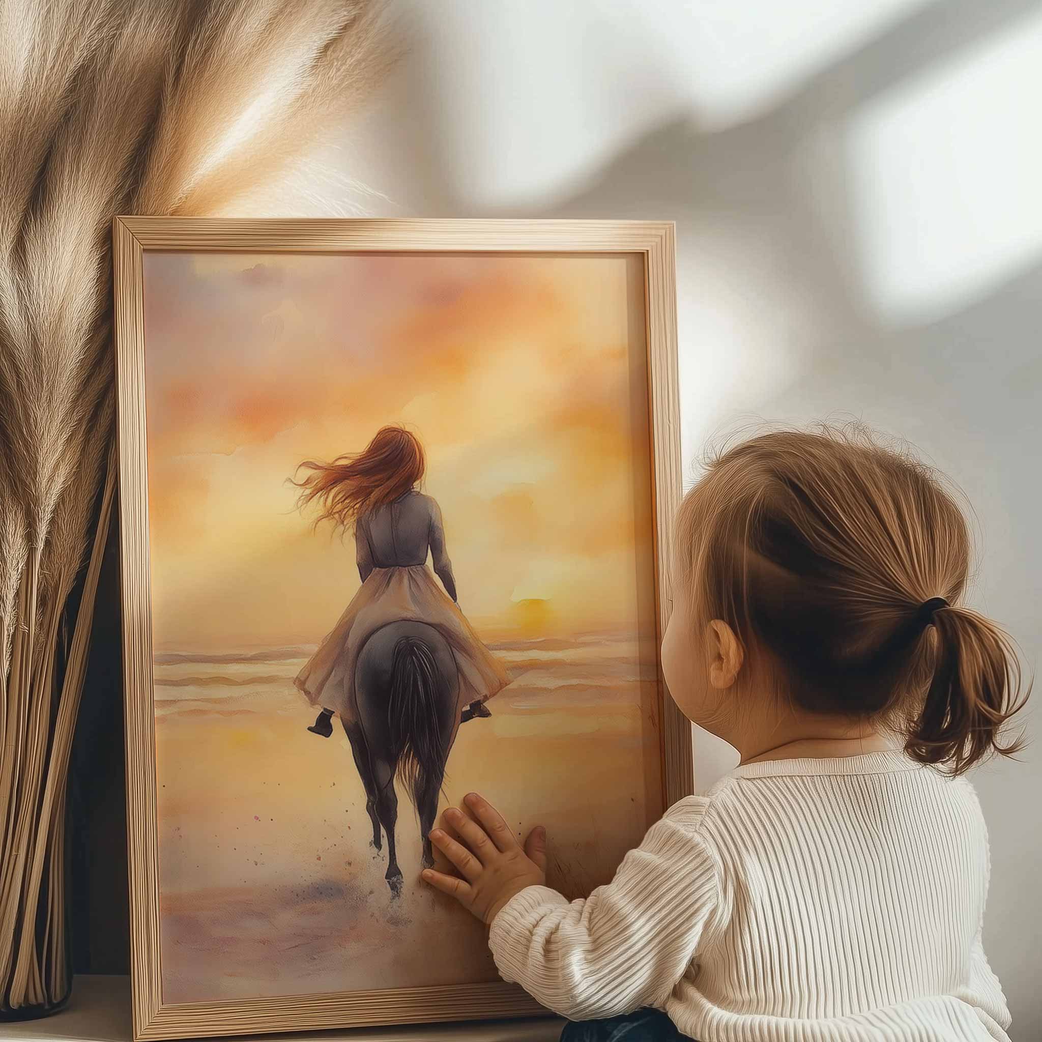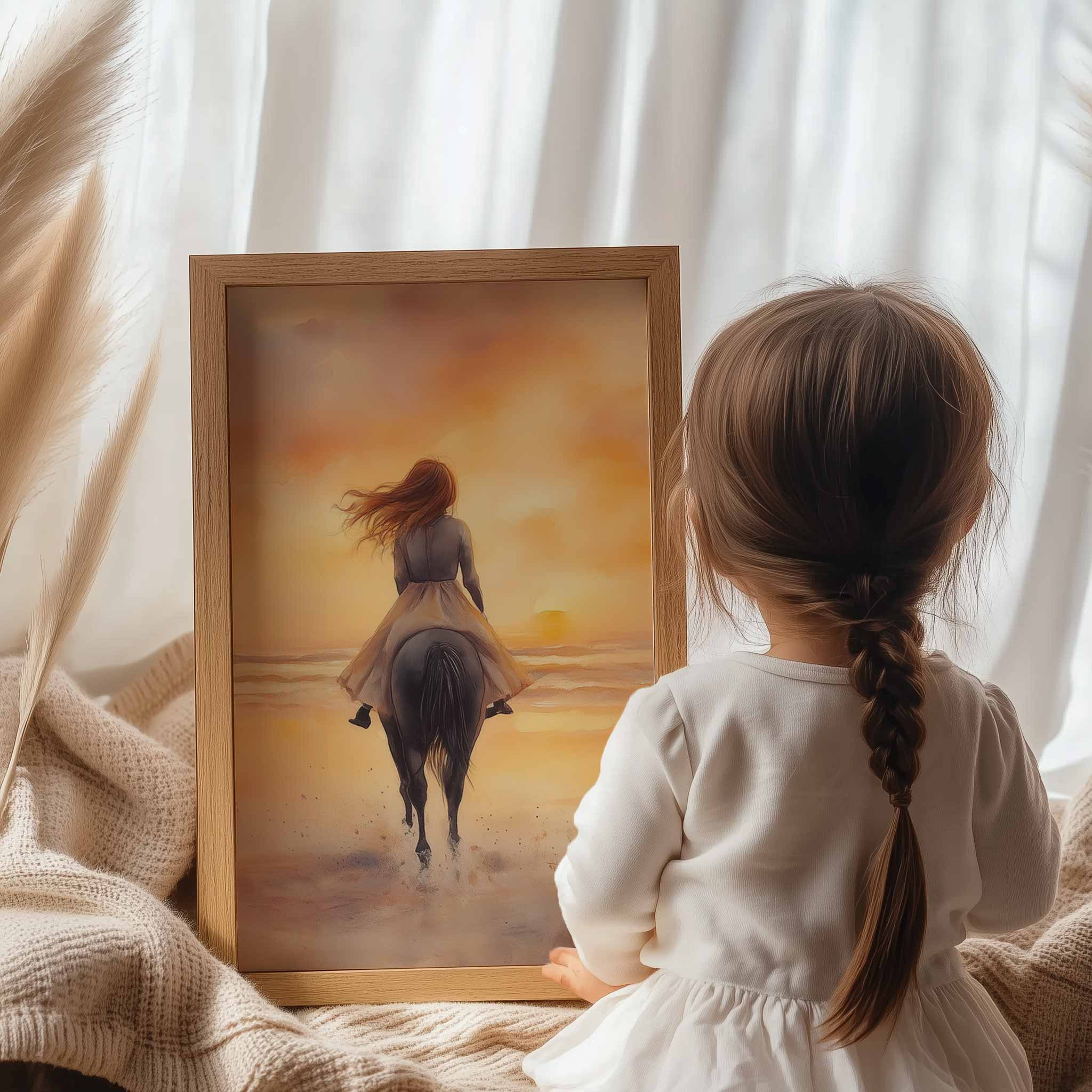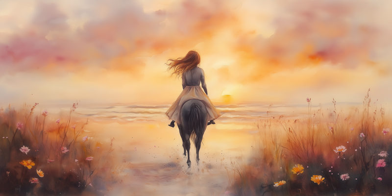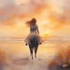Zonsondergang op het strand met paard en droommeisje